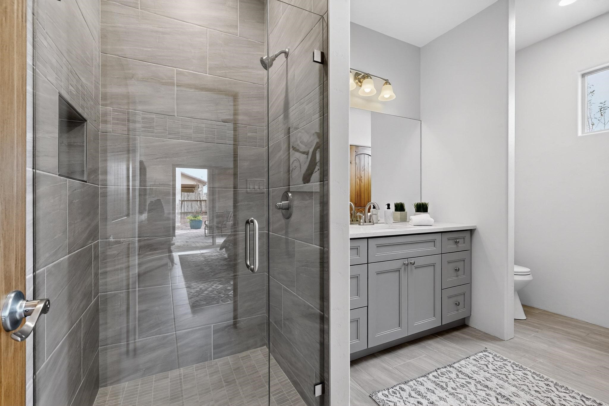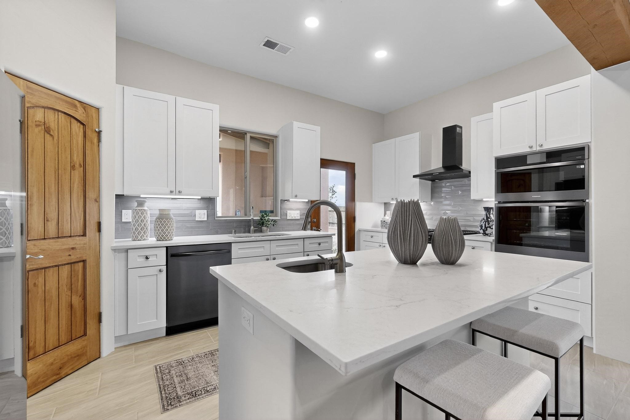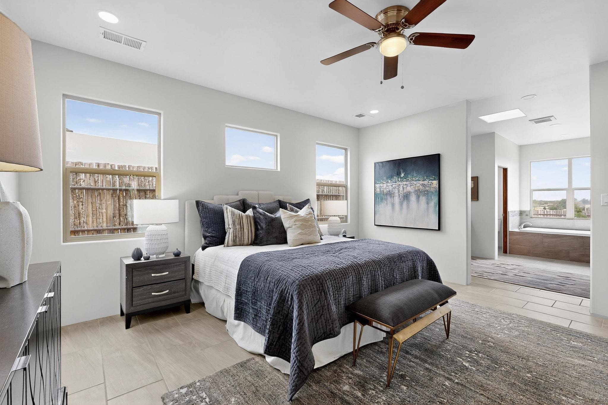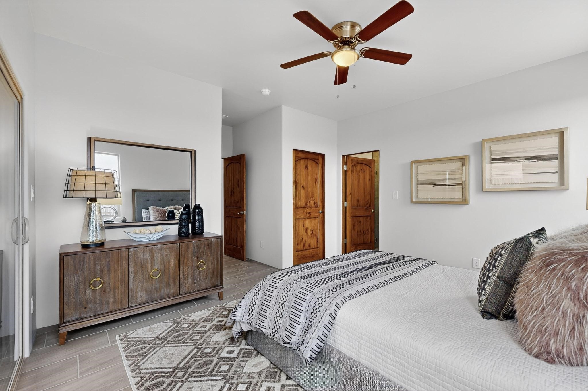 Enjoy breathtaking 180-degree scenic views from this distinctive Santiago Plan with 2239 sq. ft. Located in the La Pradera Subdivision. The property backs up to open space. This residence features three bedrooms and three and a half bathrooms. Each bedroom includes its own ensuite bath. There are three fireplaces throughout the home.Arrive through an impressive 8-foot-tall entry door, stepping into a foyer highlighted by a 13-foot boveda ceiling. To the left, a powder room and an adjacent closet provide convenience, while to the right, a versatile study or bedroom features a cozy gas-fired kiva fireplace. The spacious living room is distinguished by a 12-foot ceiling, rich brown-stained wood beams with tongue-and-groove trim. Porcelain floor tiles in a Bianco-White wood-like style add elegance throughout the home. The open kitchen is equipped with Shaker-White cabinets. The kitchen and the guest bedroom open out to a covered portal with a gas-fireplace and brick pavers, perfect for entertaining or relaxation. The owner's suite features an expansive walk-in closet of approximately 100 square feet. The luxurious bathroom offers a skylight, a spacious walk-in shower with Euro-style fixtures, and an overhead rain shower head. Designed in a classic Spanish style, the home showcases a pitched roof with clay-concrete tiles, covered portals with substantial wood beams, and brick paver accents. The colored stamped concrete driveway enhances the property's curb appeal. The property also boasts a three-car insulated garage with two storage closets and an epoxy-coated floor.