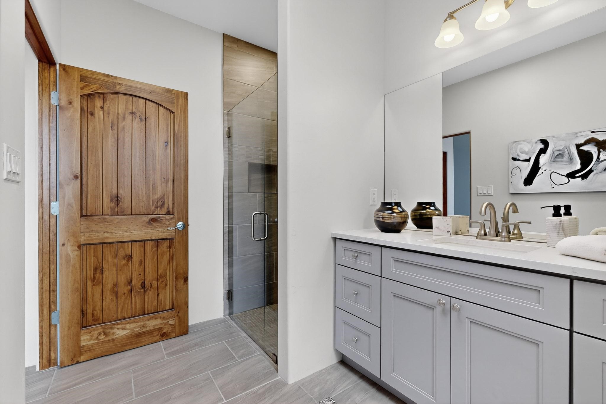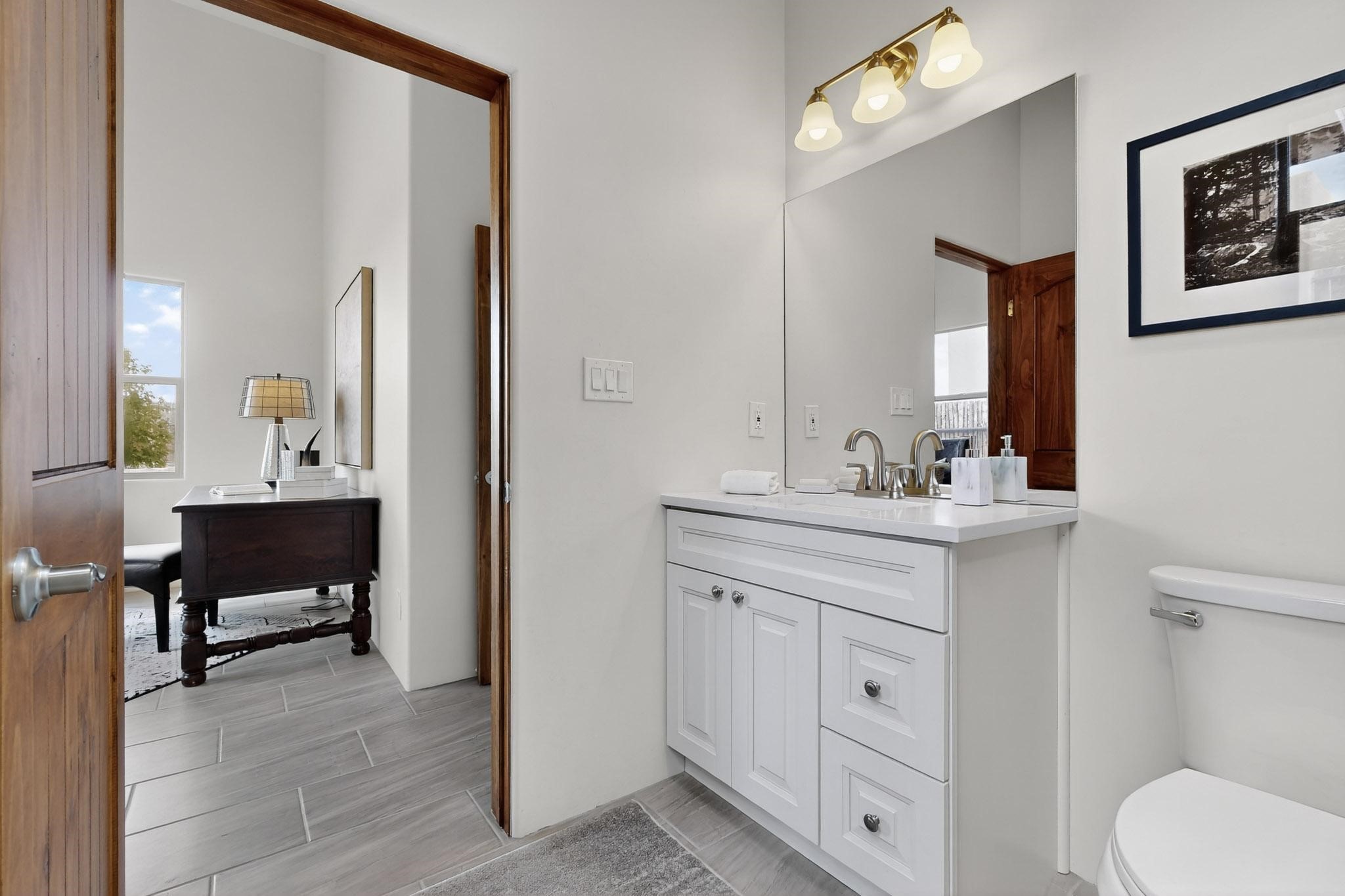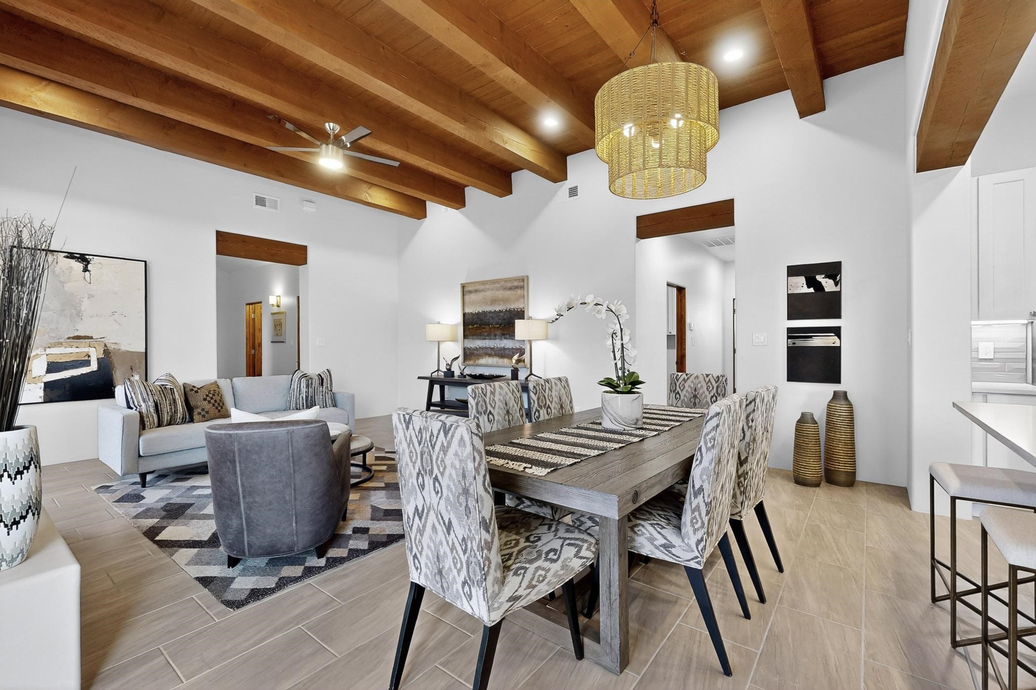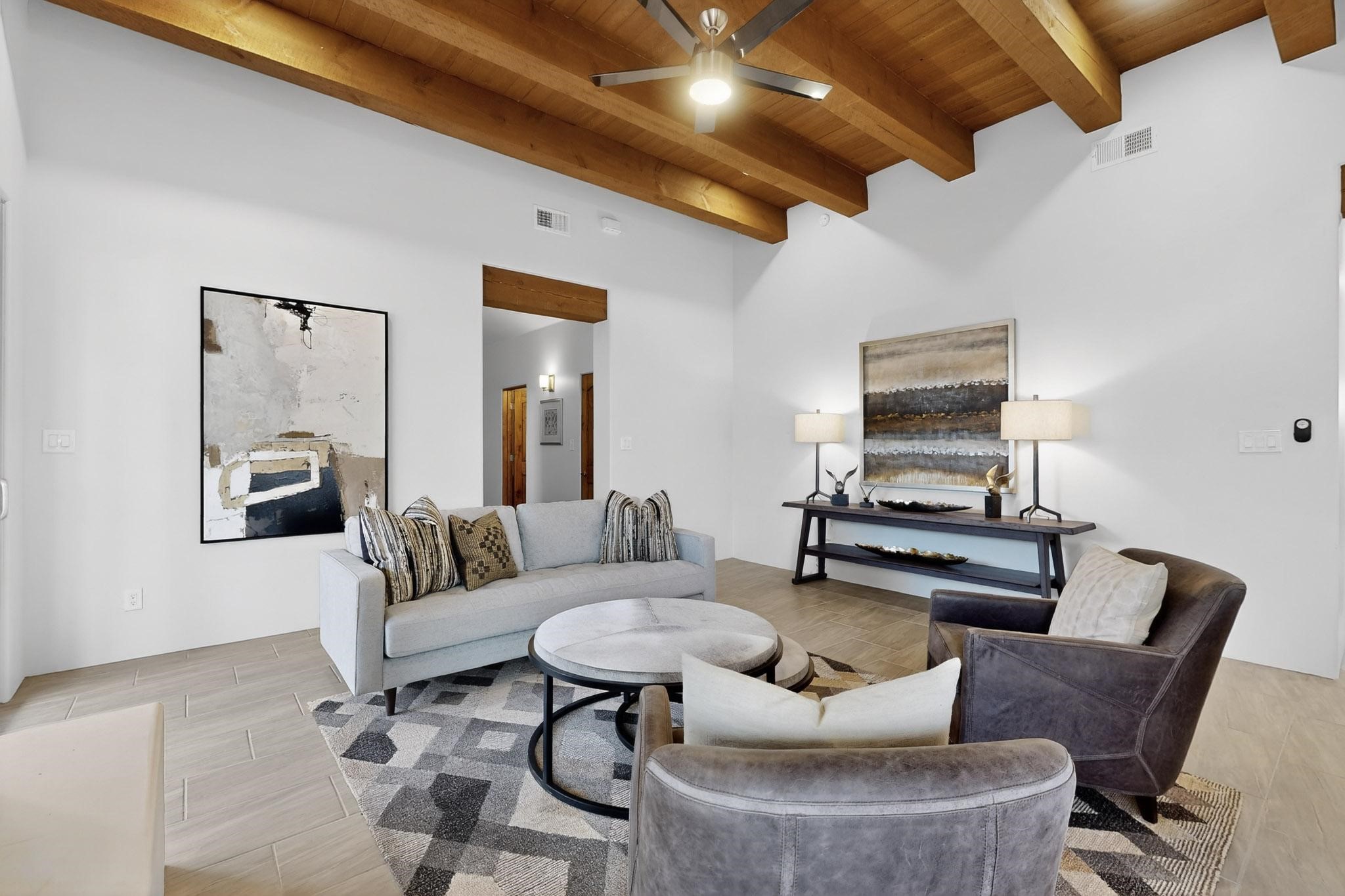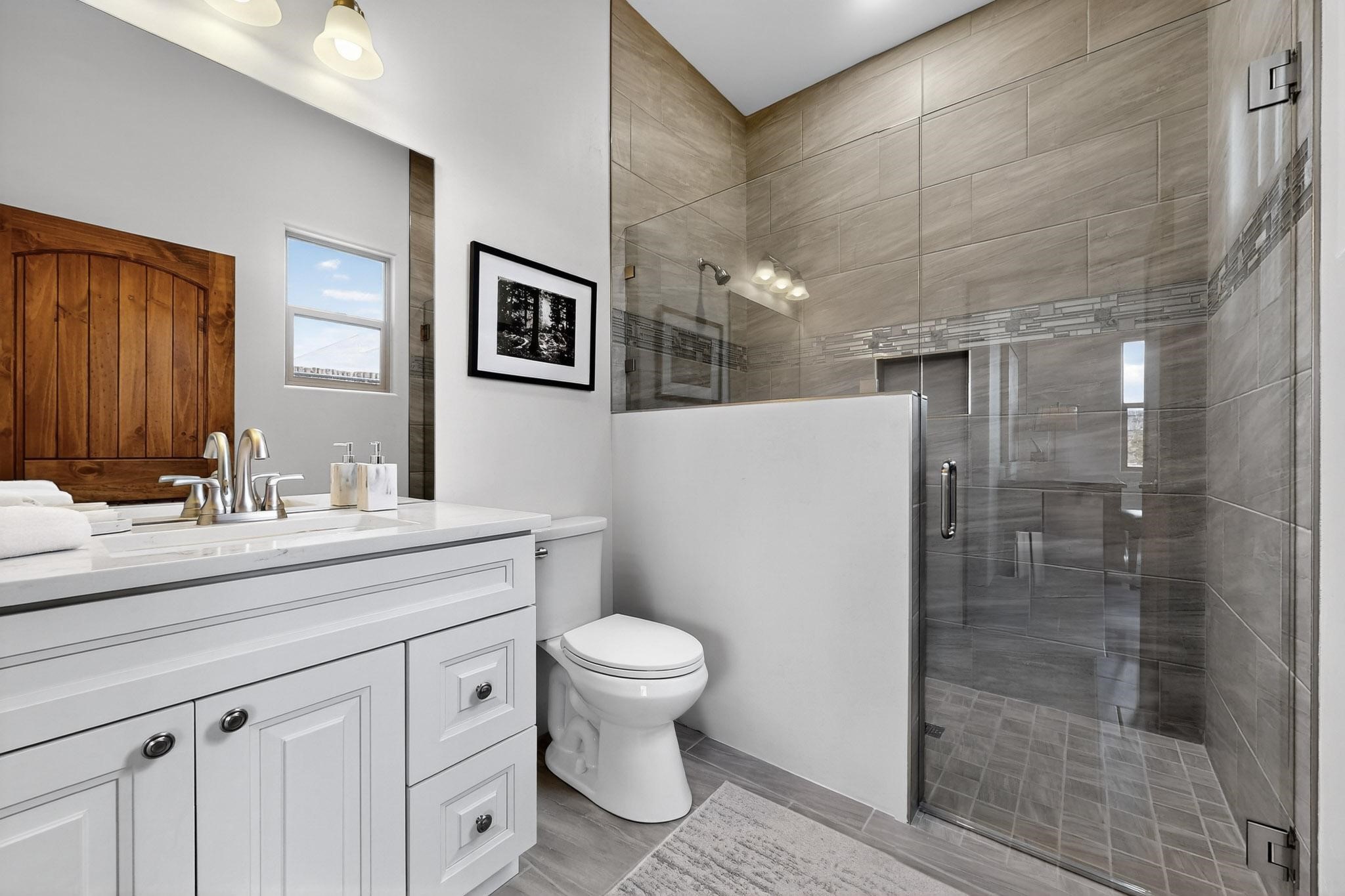 Enjoy breathtaking 180-degree scenic views from this distinctive Santiago Plan with 2239 sq. ft. Located in the La Pradera Subdivision. The property backs up to open space. This residence features three bedrooms and three and a half bathrooms. Each bedroom includes its own ensuite bath. There are three fireplaces throughout the home.Arrive through an impressive 8-foot-tall entry door, stepping into a foyer highlighted by a 13-foot boveda ceiling. To the left, a powder room and an adjacent closet provide convenience, while to the right, a versatile study or bedroom features a cozy gas-fired kiva fireplace. The spacious living room is distinguished by a 12-foot ceiling, rich brown-stained wood beams with tongue-and-groove trim. Porcelain floor tiles in a Bianco-White wood-like style add elegance throughout the home. The open kitchen is equipped with Shaker-White cabinets. The kitchen and the guest bedroom open out to a covered portal with a gas-fireplace and brick pavers, perfect for entertaining or relaxation. The owner's suite features an expansive walk-in closet of approximately 100 square feet. The luxurious bathroom offers a skylight, a spacious walk-in shower with Euro-style fixtures, and an overhead rain shower head. Designed in a classic Spanish style, the home showcases a pitched roof with clay-concrete tiles, covered portals with substantial wood beams, and brick paver accents. The colored stamped concrete driveway enhances the property's curb appeal. The property also boasts a three-car insulated garage with two storage closets and an epoxy-coated floor.