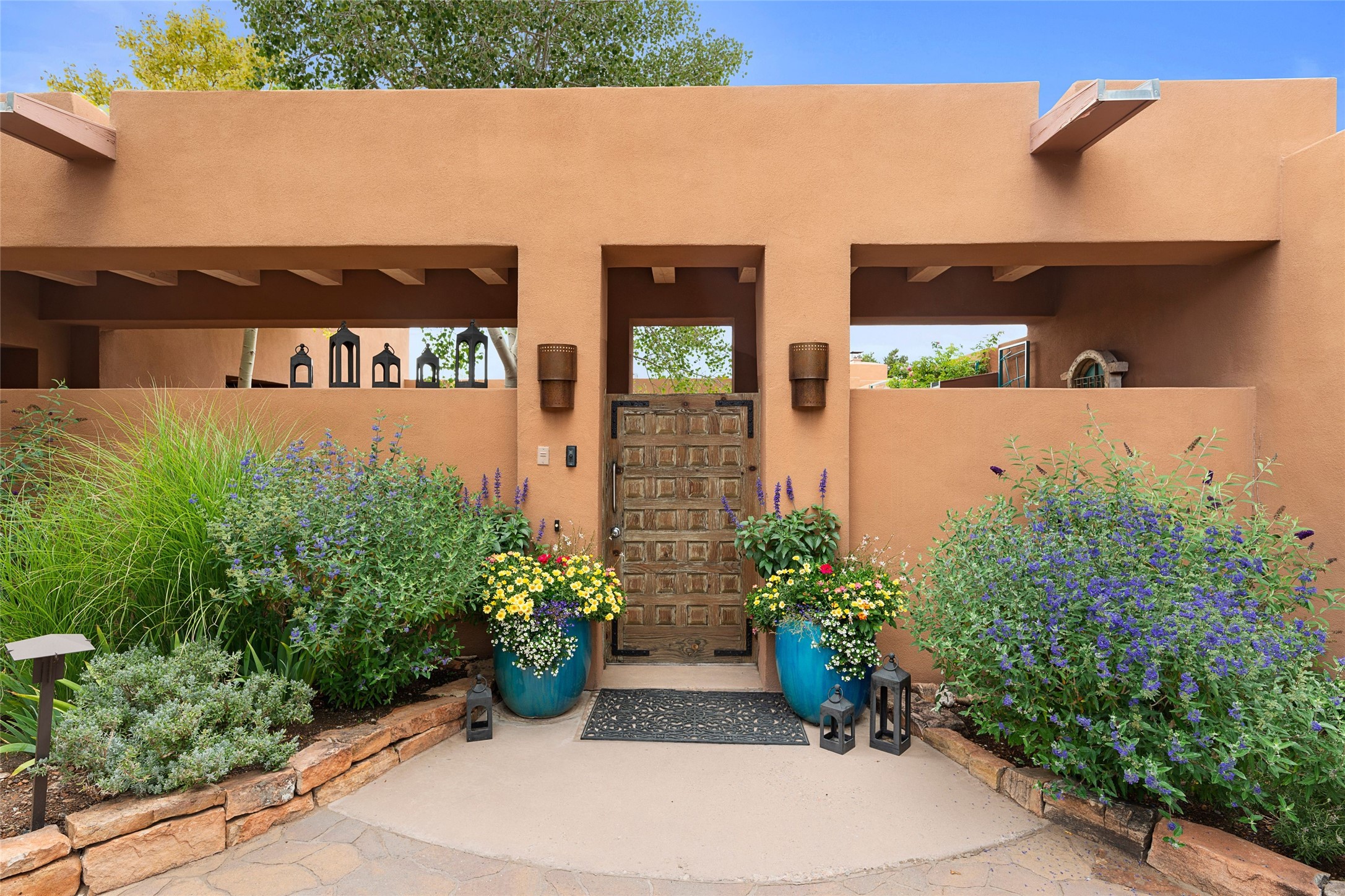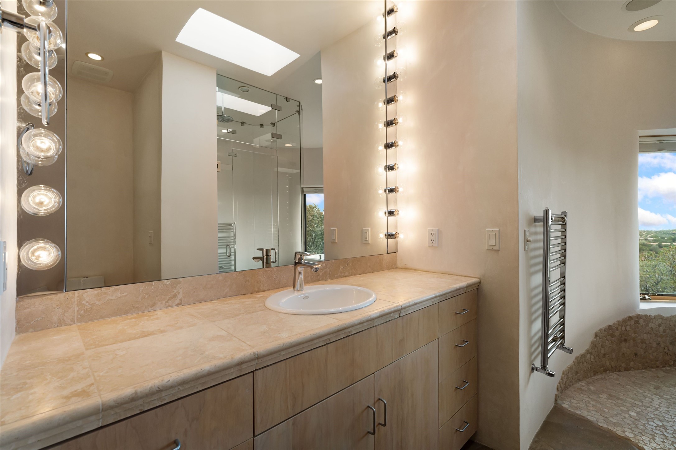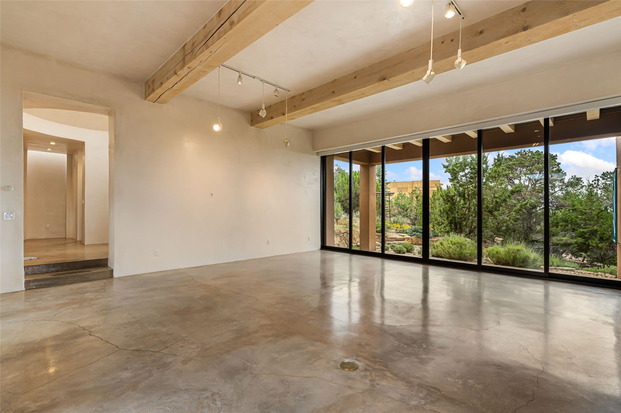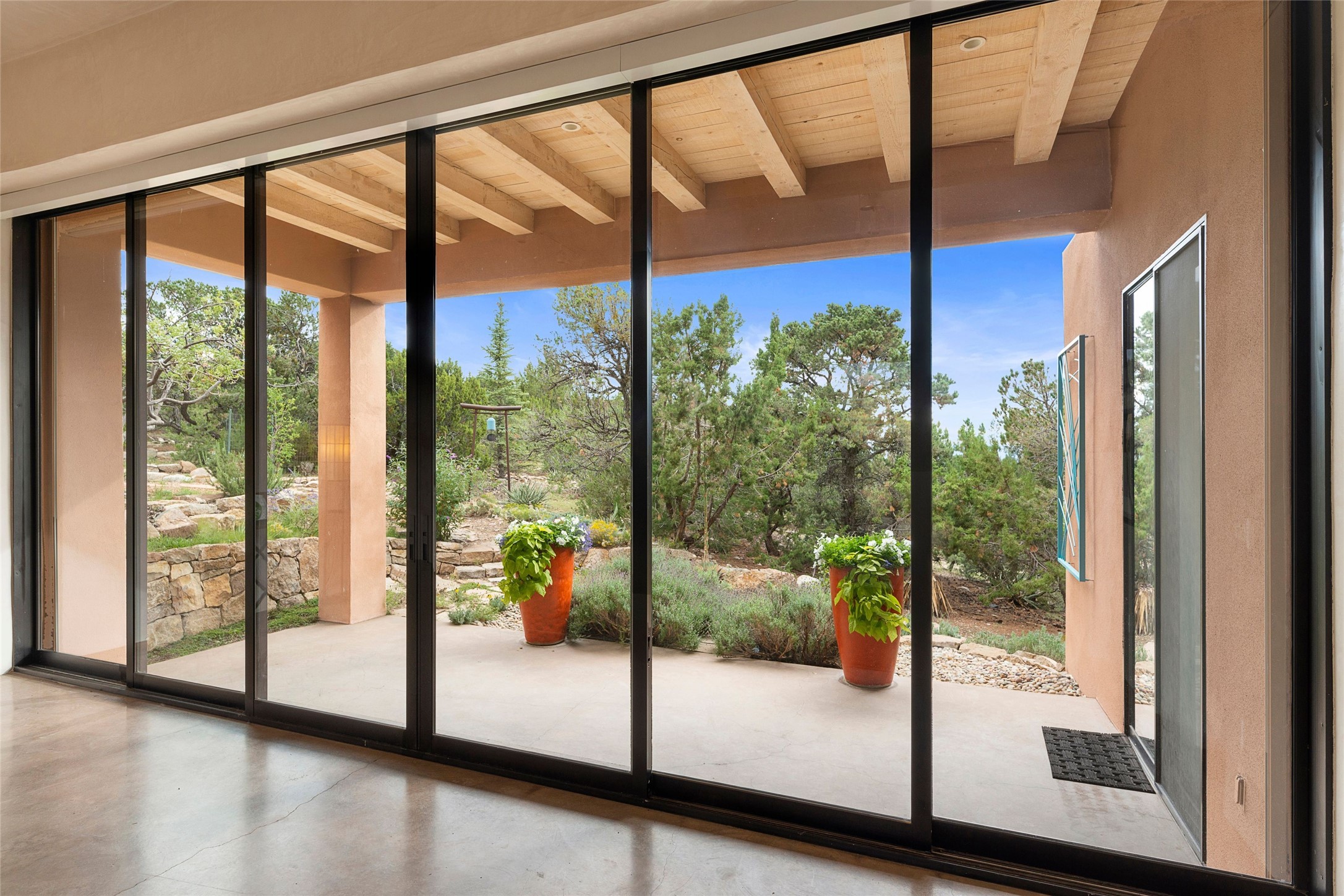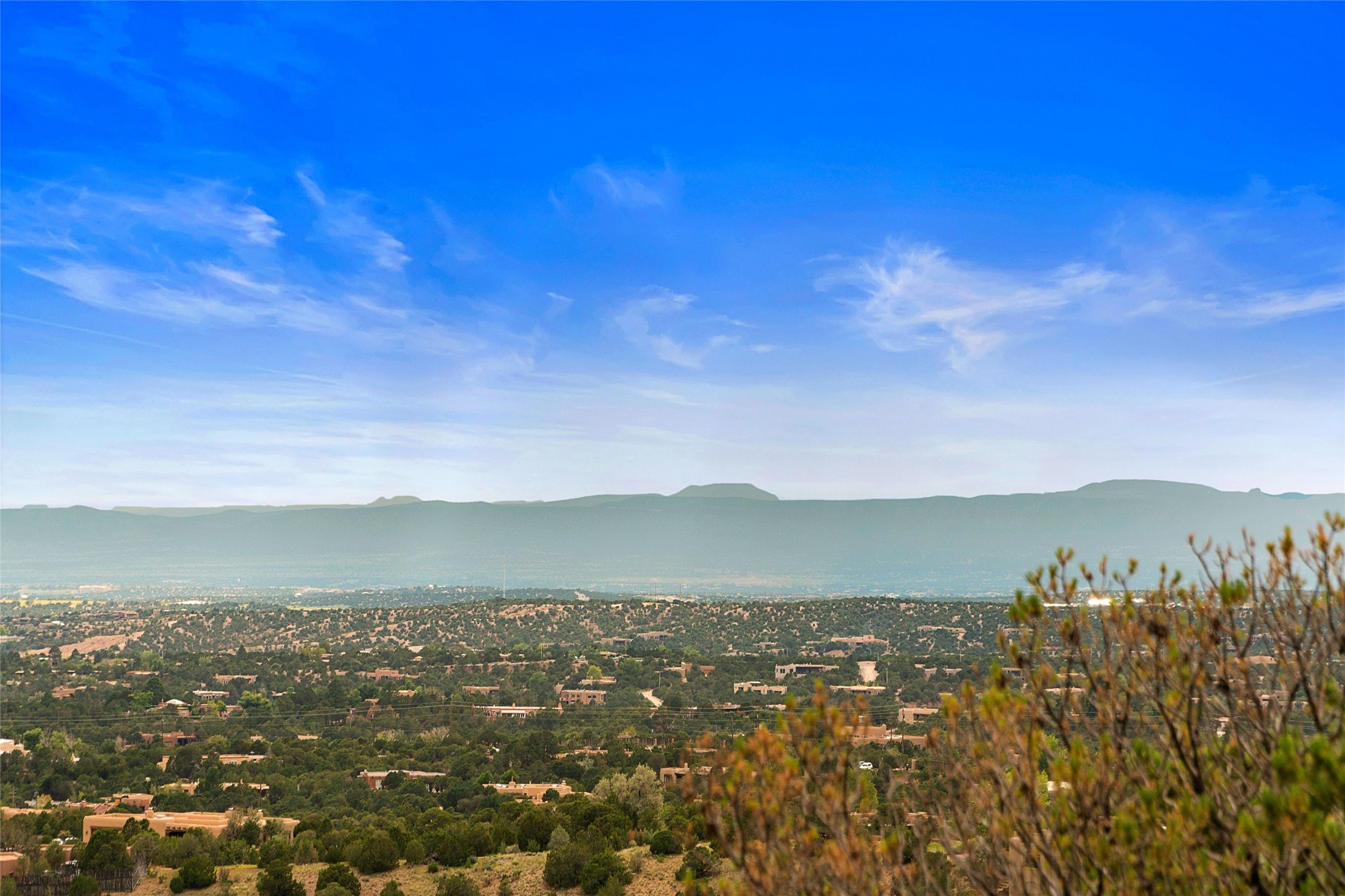 This distinctive Fred-Kline-designed contemporary home in the desirable Sierra de Norte neighborhood was thoughtfully sited to enjoy sweeping views of the Jemez and Sandia Mountains and Santa Fe city lights form its location on 1.29 rugged high-desert acres. A serene central courtyard strewn with aspens, evergreens, thriving perennials, and colorful roses and other flowering plants introduces the pervasive alluring style. Sophisticated and streamlined, the generous interiors begin with an elegant living room featuring soaring beamed ceilings, a Rumford fireplace, and a wall of floor-to ceiling windows admitting wonderful light and outlooks. Beyond are a formal dining room with doors to a portal designed for alfresco outdoor entertaining and a kitchen featuring an island, top-caliber stainless-steel appliances, stunning views, and a comfortable breakfast or sitting area with a fireplace. One of three bedrooms, the primary suite gazes south and west and includes a fireplace in the bedroom and an elegant bath with dual vanities and walk-in closets, a glass-enclosed shower, and a soaking tub with a picturesque view. Each of the two guest bedrooms-well separated for quiet privacy- is accompanied by an en suite bath; one benefits from a kitchenette, a kiva fireplace, and easy access to a relaxing sauna room. On the eastern side of the home is an office with a wraparound built-in desk as well as abundant cabinets, drawers, and bookshelves. Other highlights include walls and lighting ideal for displaying an art collection, a built-in grilling area and an outdoor fireplace on one of the portales, an oversized two car-garage, a versatile studio or workshop with an overhead door, and a large lower-level area ideal for storage, a recreation room, or additional work space. This singular offering is a rare opportunity not to be missed by the eager, discerning buyer.