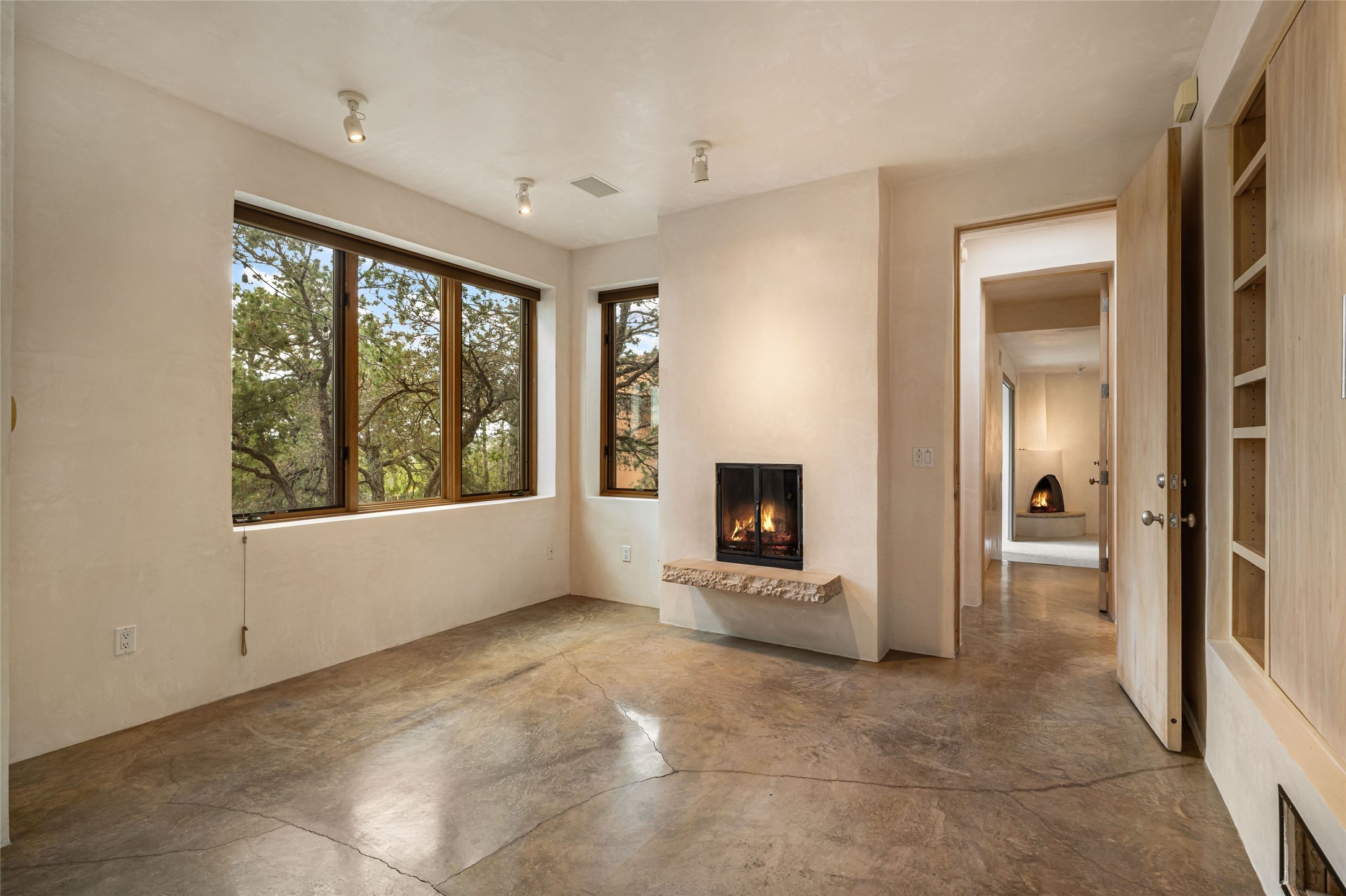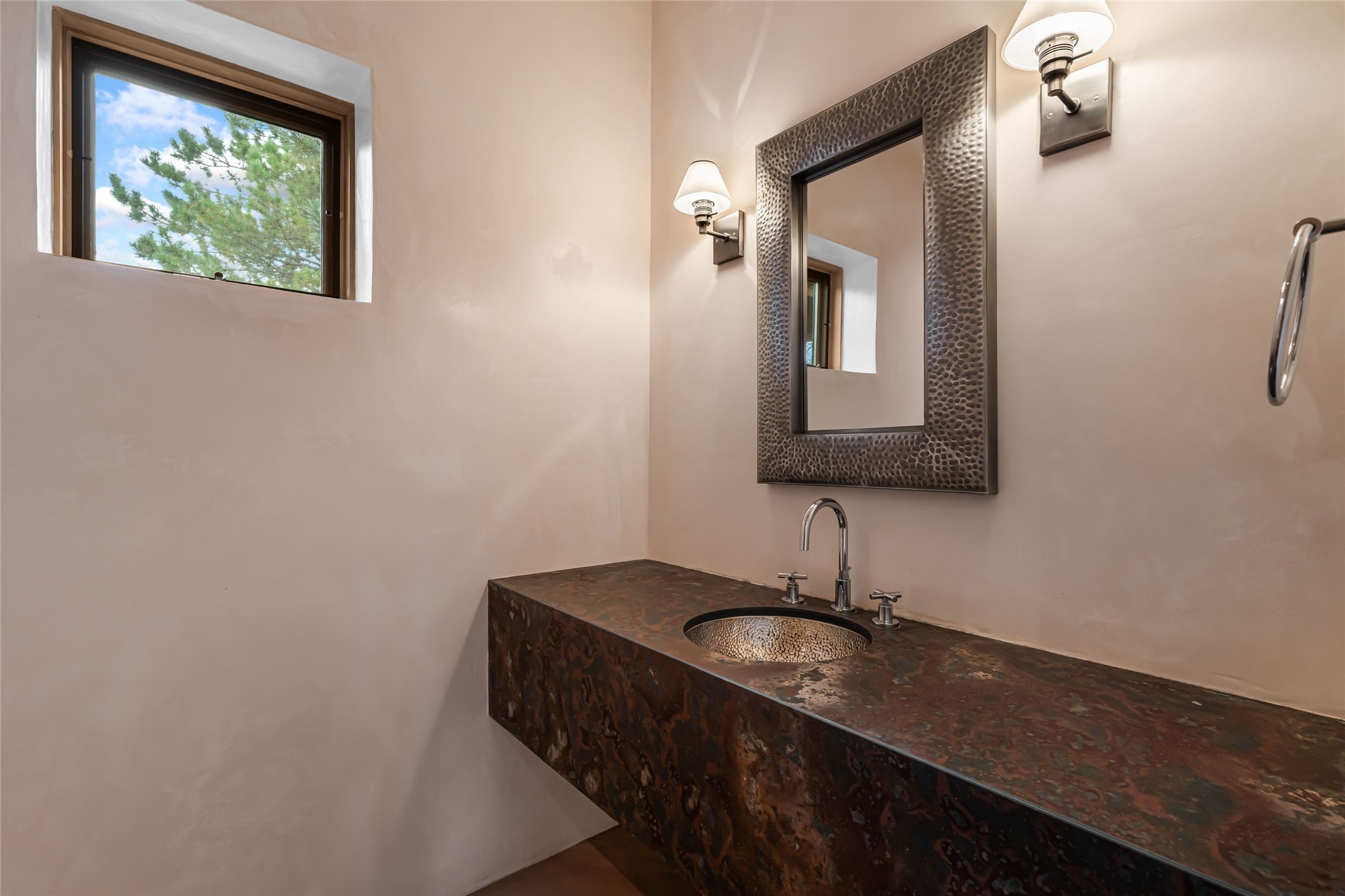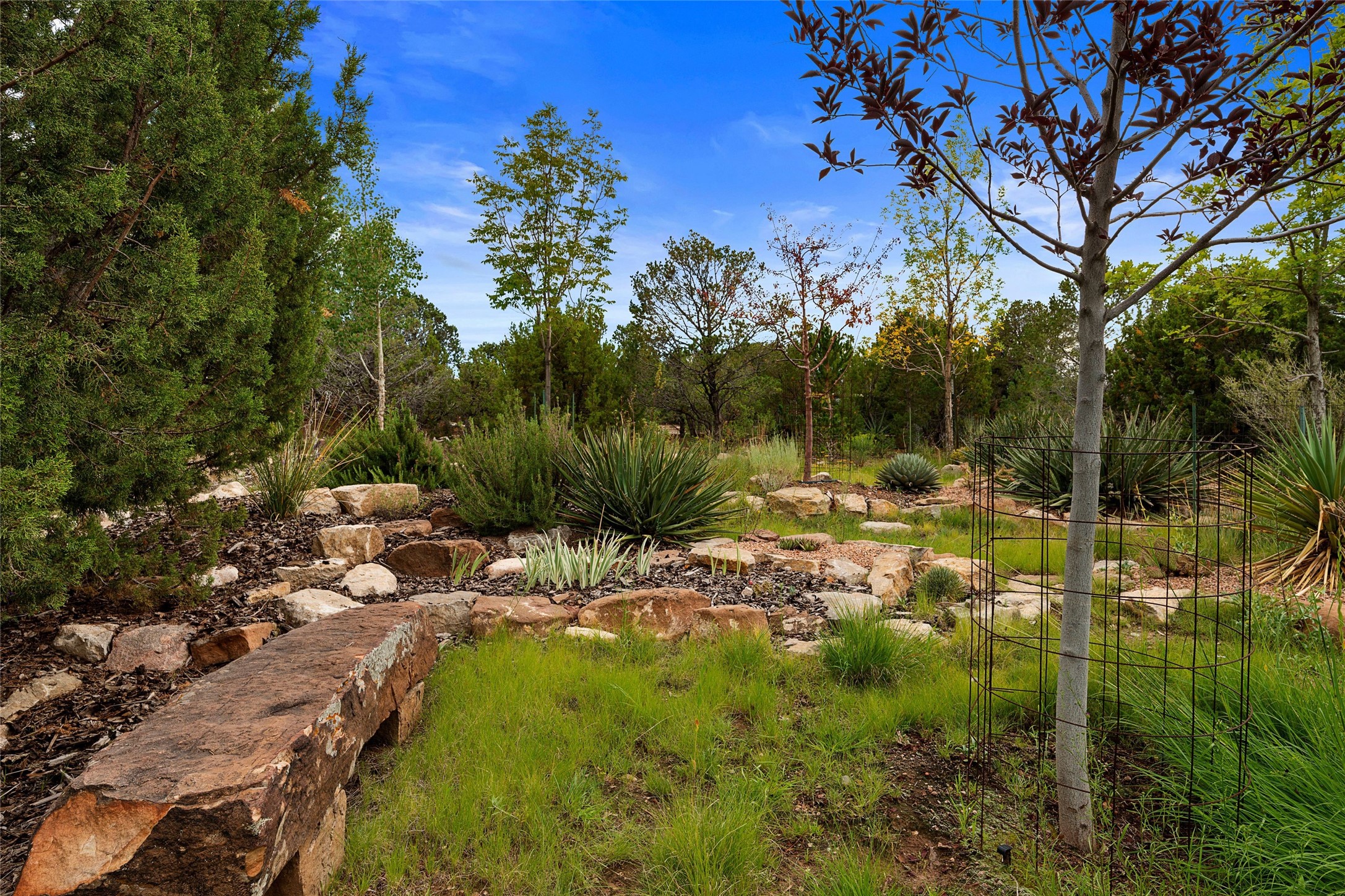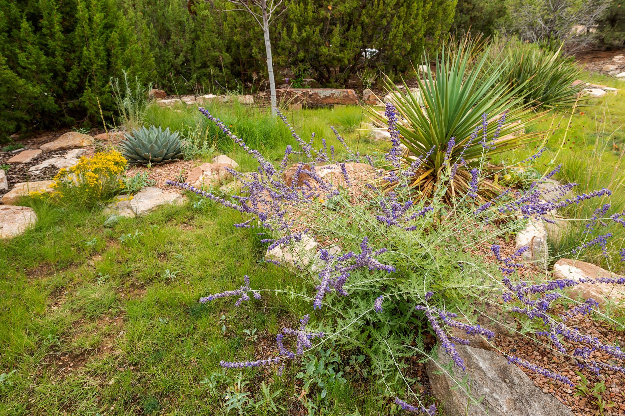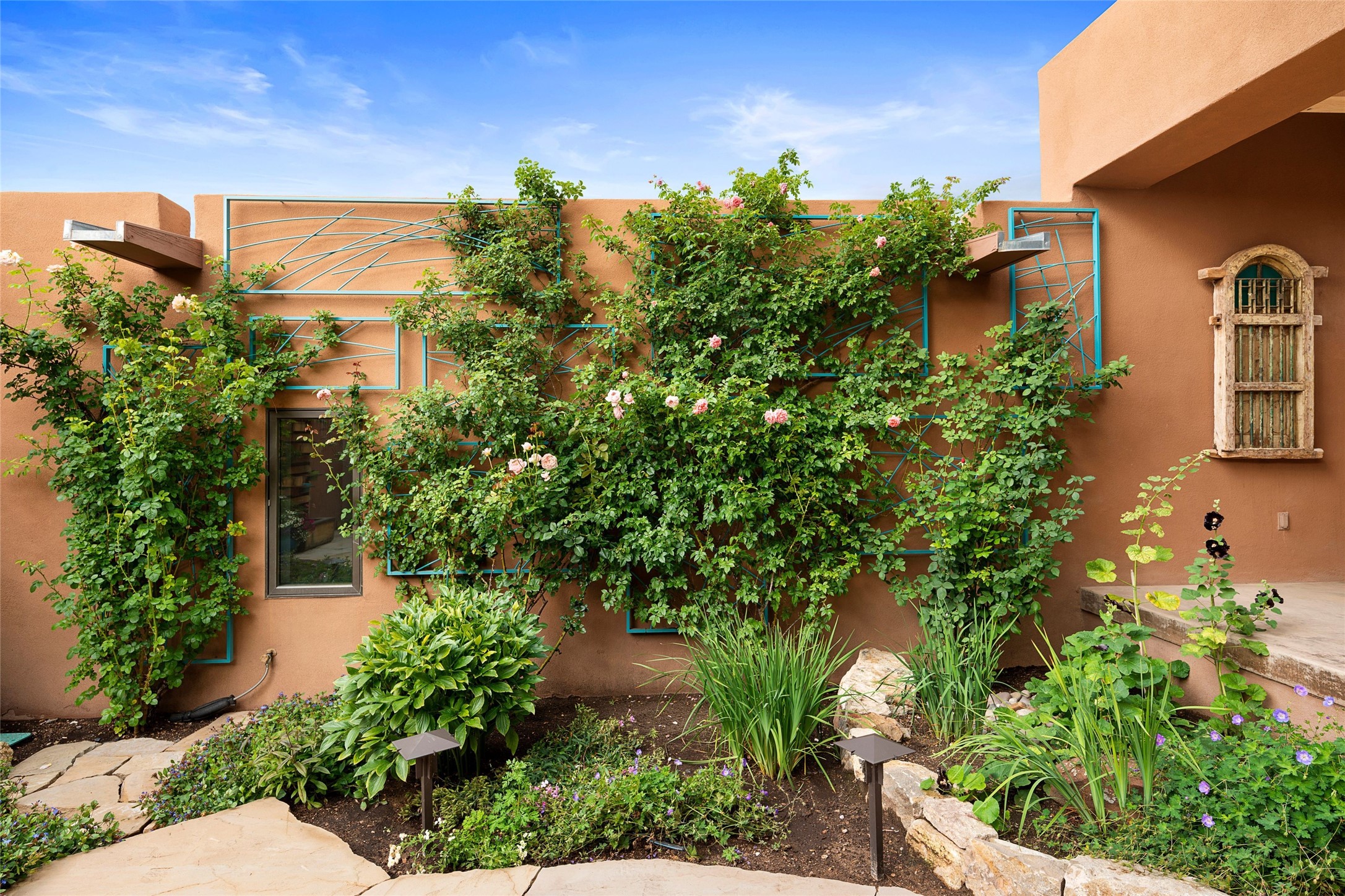 This distinctive Fred-Kline-designed contemporary home in the desirable Sierra de Norte neighborhood was thoughtfully sited to enjoy sweeping views of the Jemez and Sandia Mountains and Santa Fe city lights form its location on 1.29 rugged high-desert acres. A serene central courtyard strewn with aspens, evergreens, thriving perennials, and colorful roses and other flowering plants introduces the pervasive alluring style. Sophisticated and streamlined, the generous interiors begin with an elegant living room featuring soaring beamed ceilings, a Rumford fireplace, and a wall of floor-to ceiling windows admitting wonderful light and outlooks. Beyond are a formal dining room with doors to a portal designed for alfresco outdoor entertaining and a kitchen featuring an island, top-caliber stainless-steel appliances, stunning views, and a comfortable breakfast or sitting area with a fireplace. One of three bedrooms, the primary suite gazes south and west and includes a fireplace in the bedroom and an elegant bath with dual vanities and walk-in closets, a glass-enclosed shower, and a soaking tub with a picturesque view. Each of the two guest bedrooms-well separated for quiet privacy- is accompanied by an en suite bath; one benefits from a kitchenette, a kiva fireplace, and easy access to a relaxing sauna room. On the eastern side of the home is an office with a wraparound built-in desk as well as abundant cabinets, drawers, and bookshelves. Other highlights include walls and lighting ideal for displaying an art collection, a built-in grilling area and an outdoor fireplace on one of the portales, an oversized two car-garage, a versatile studio or workshop with an overhead door, and a large lower-level area ideal for storage, a recreation room, or additional work space. This singular offering is a rare opportunity not to be missed by the eager, discerning buyer.