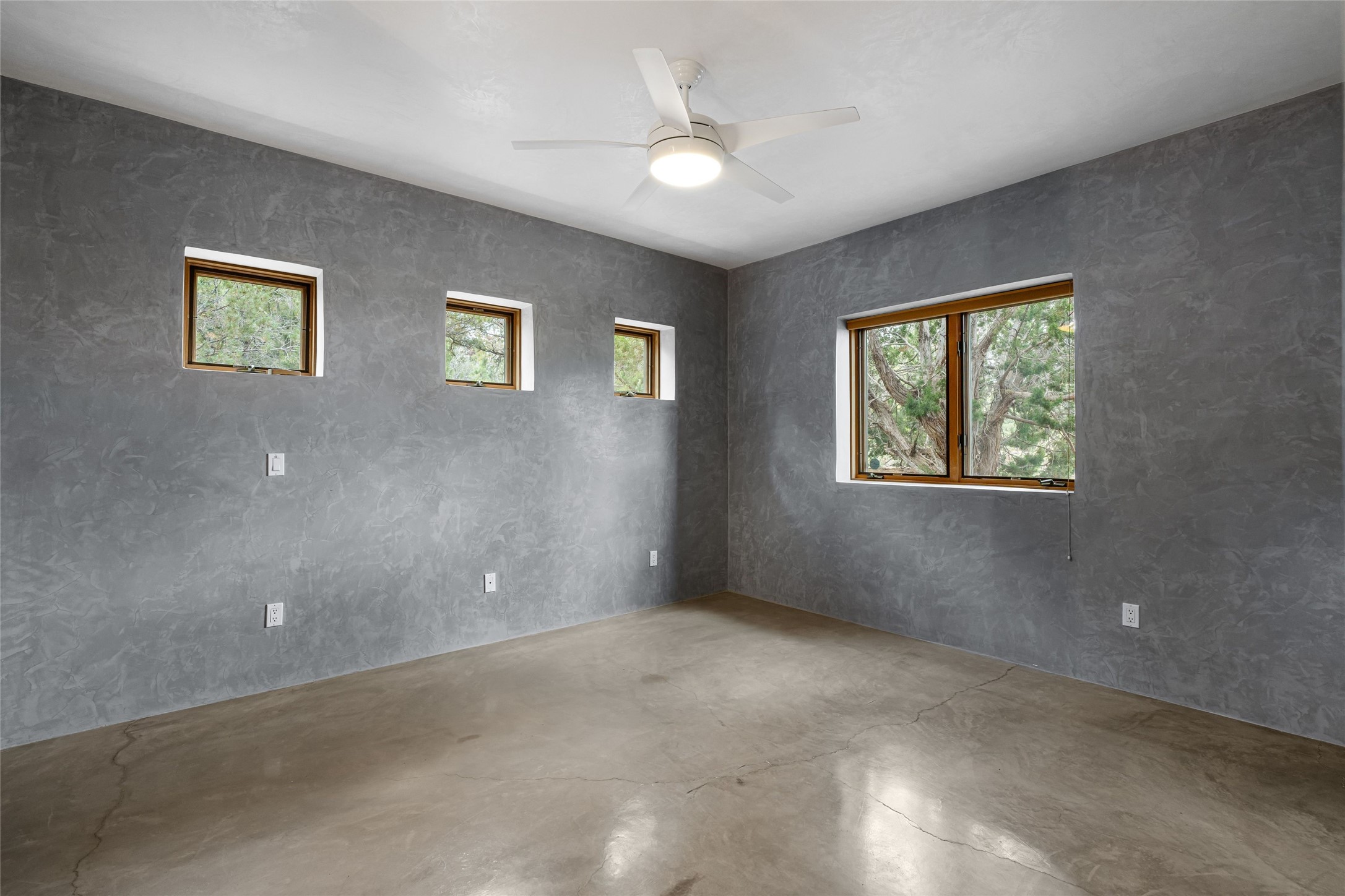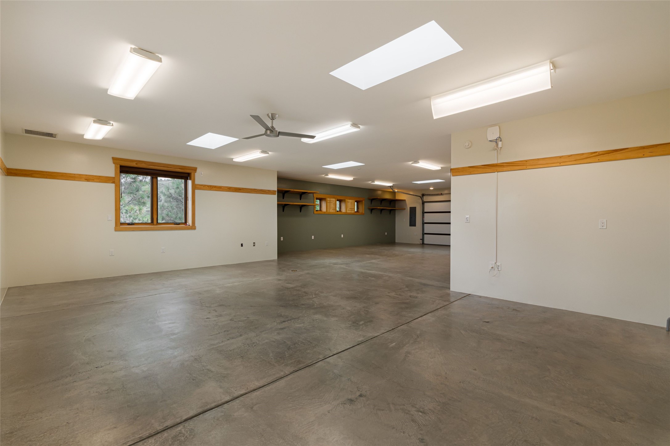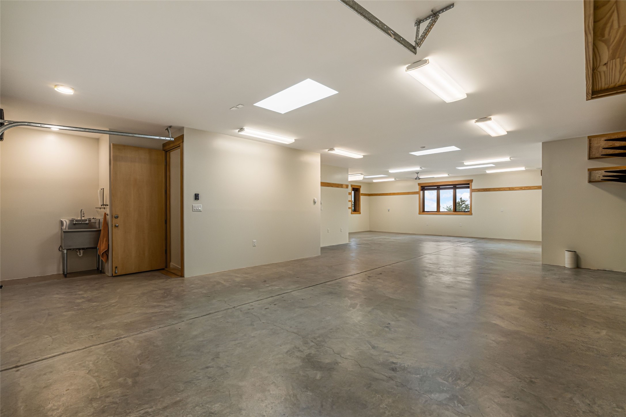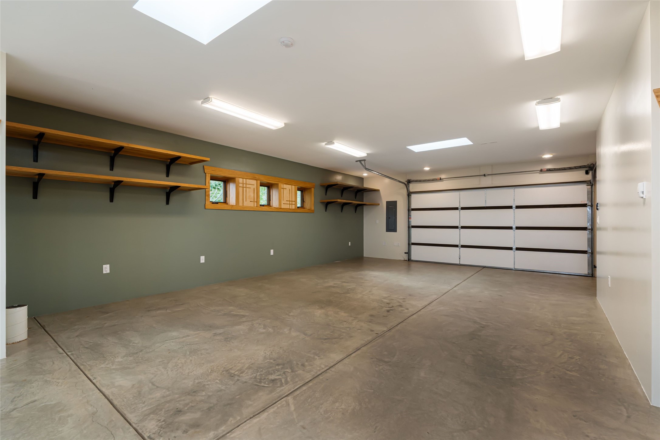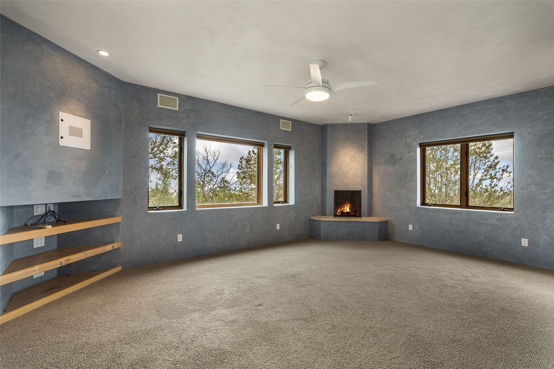 This distinctive Fred-Kline-designed contemporary home in the desirable Sierra de Norte neighborhood was thoughtfully sited to enjoy sweeping views of the Jemez and Sandia Mountains and Santa Fe city lights form its location on 1.29 rugged high-desert acres. A serene central courtyard strewn with aspens, evergreens, thriving perennials, and colorful roses and other flowering plants introduces the pervasive alluring style. Sophisticated and streamlined, the generous interiors begin with an elegant living room featuring soaring beamed ceilings, a Rumford fireplace, and a wall of floor-to ceiling windows admitting wonderful light and outlooks. Beyond are a formal dining room with doors to a portal designed for alfresco outdoor entertaining and a kitchen featuring an island, top-caliber stainless-steel appliances, stunning views, and a comfortable breakfast or sitting area with a fireplace. One of three bedrooms, the primary suite gazes south and west and includes a fireplace in the bedroom and an elegant bath with dual vanities and walk-in closets, a glass-enclosed shower, and a soaking tub with a picturesque view. Each of the two guest bedrooms-well separated for quiet privacy- is accompanied by an en suite bath; one benefits from a kitchenette, a kiva fireplace, and easy access to a relaxing sauna room. On the eastern side of the home is an office with a wraparound built-in desk as well as abundant cabinets, drawers, and bookshelves. Other highlights include walls and lighting ideal for displaying an art collection, a built-in grilling area and an outdoor fireplace on one of the portales, an oversized two car-garage, a versatile studio or workshop with an overhead door, and a large lower-level area ideal for storage, a recreation room, or additional work space. This singular offering is a rare opportunity not to be missed by the eager, discerning buyer.
