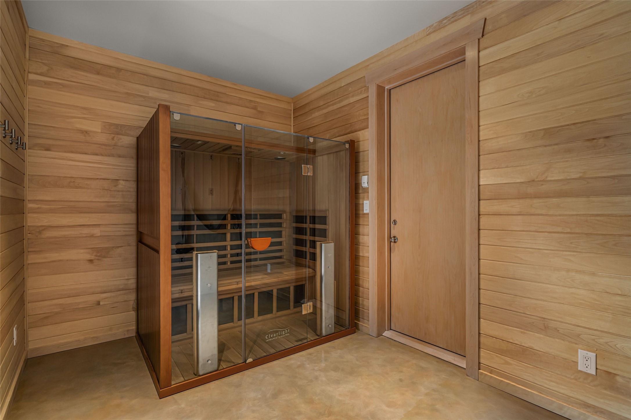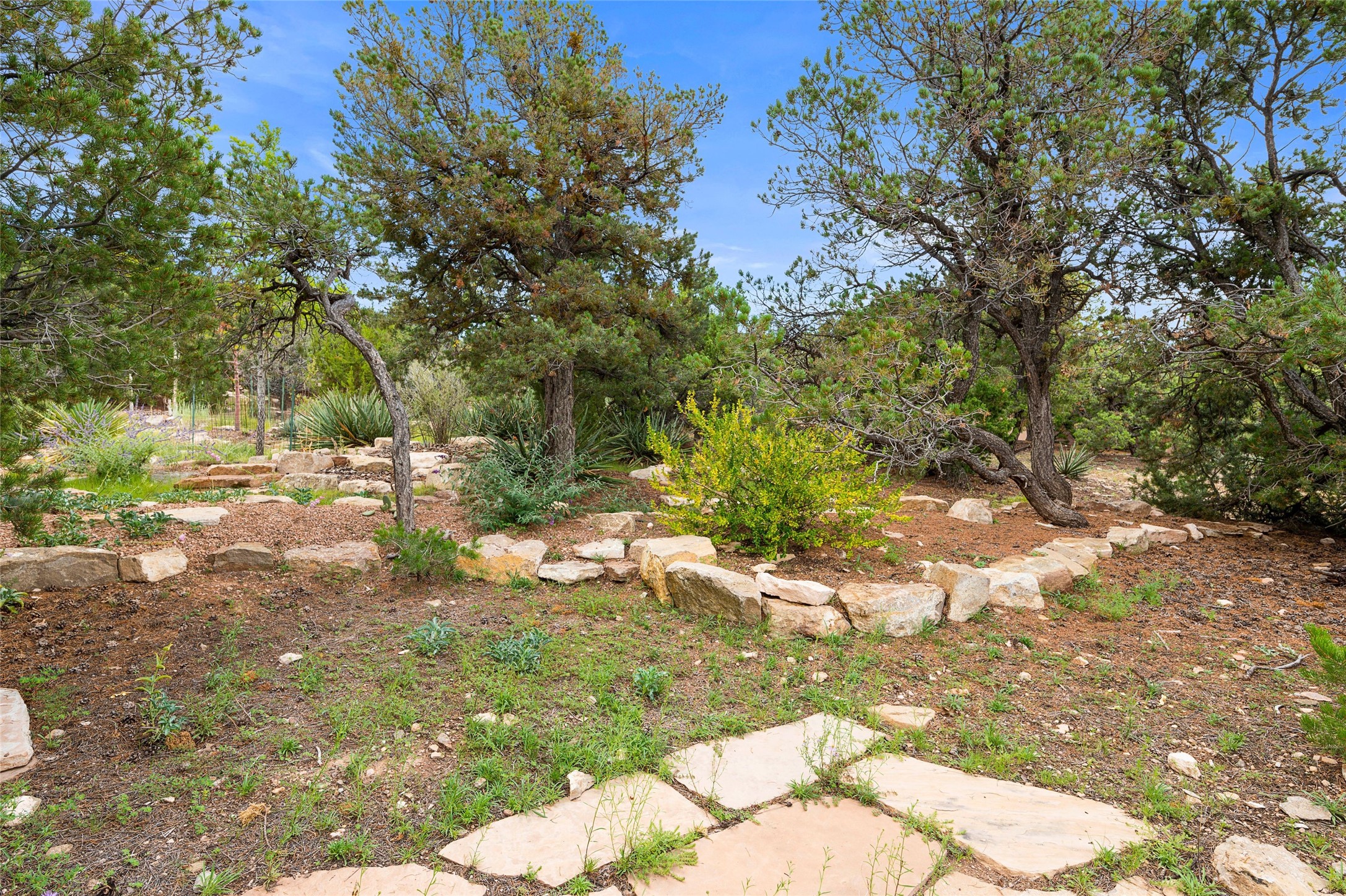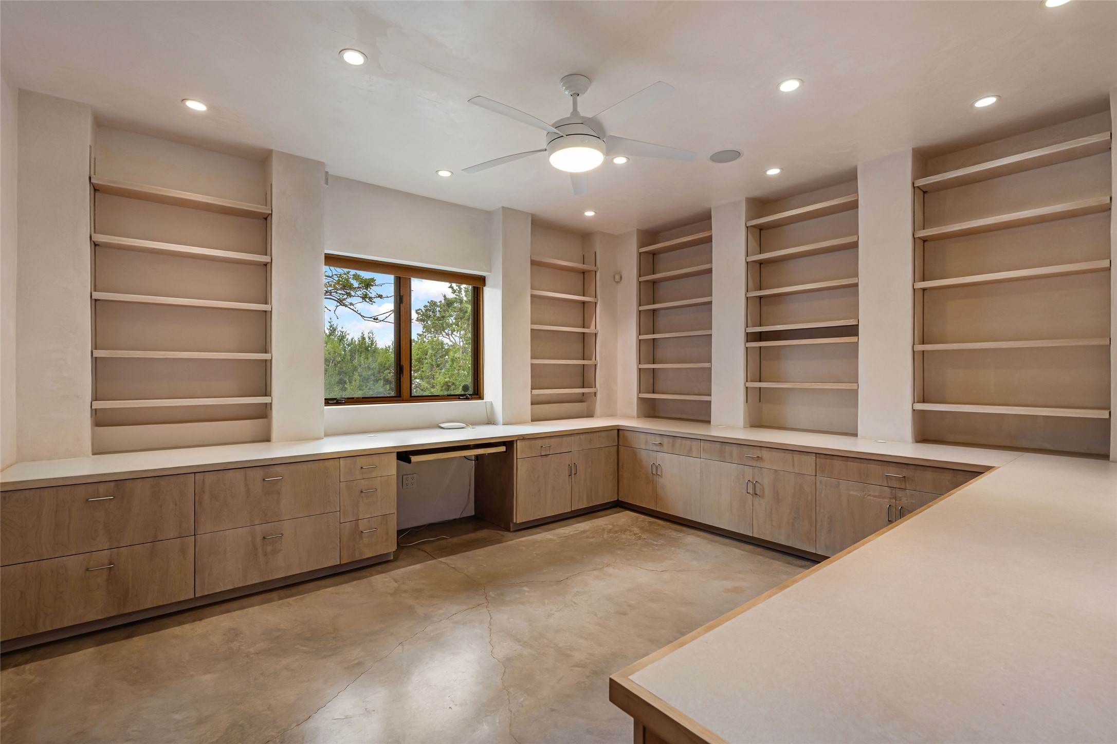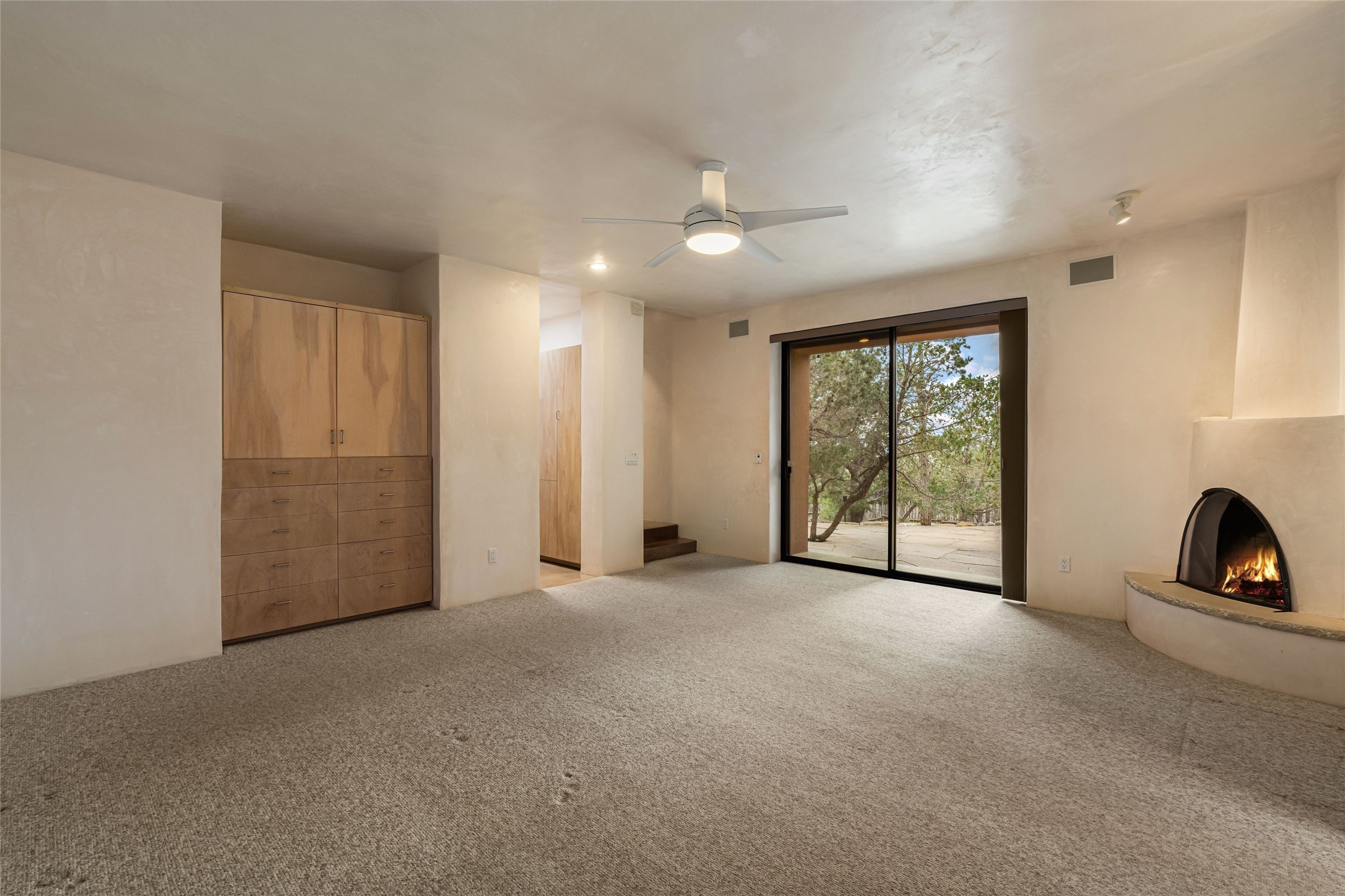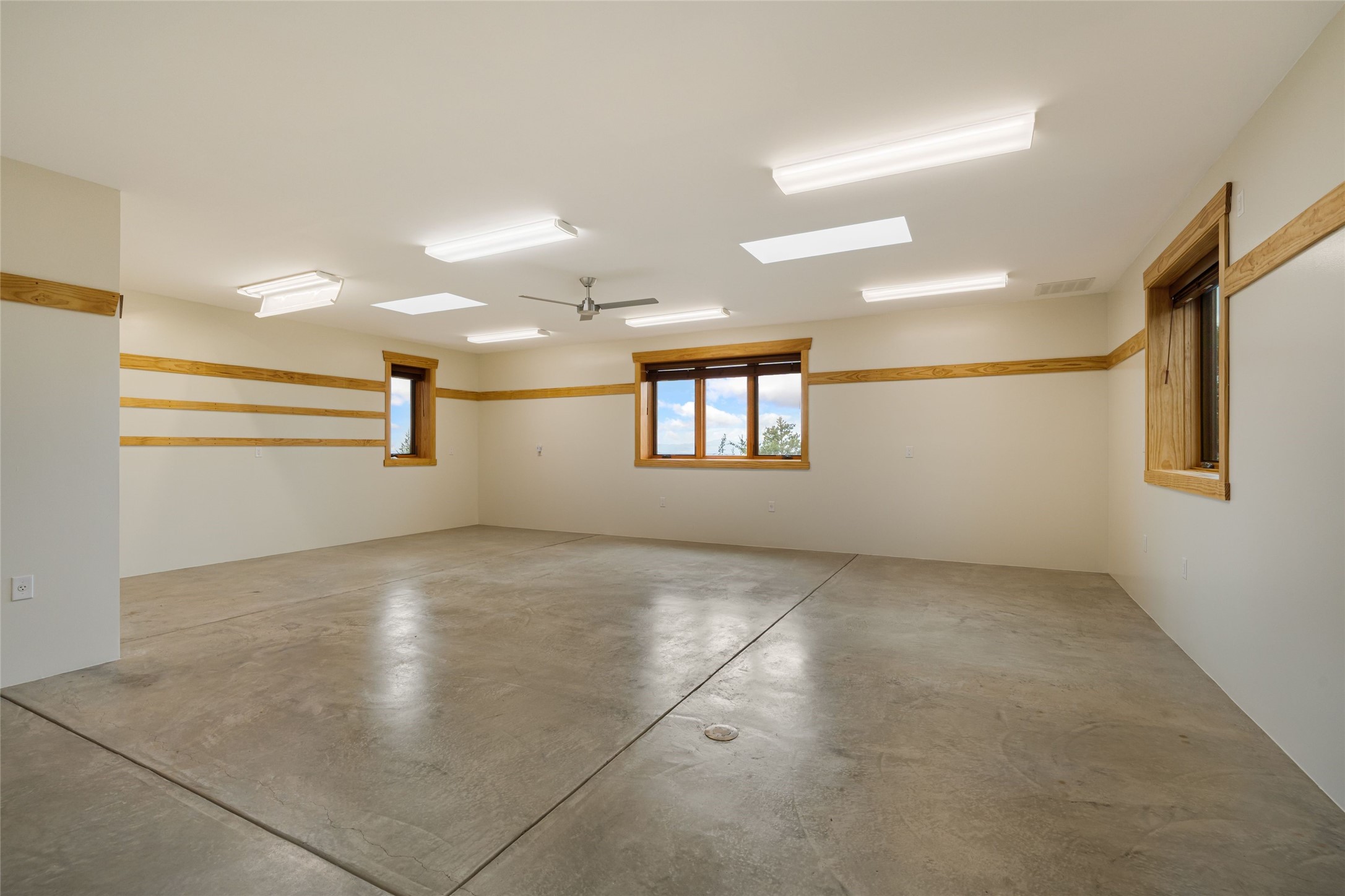 This distinctive Fred-Kline-designed contemporary home in the desirable Sierra de Norte neighborhood was thoughtfully sited to enjoy sweeping views of the Jemez and Sandia Mountains and Santa Fe city lights form its location on 1.29 rugged high-desert acres. A serene central courtyard strewn with aspens, evergreens, thriving perennials, and colorful roses and other flowering plants introduces the pervasive alluring style. Sophisticated and streamlined, the generous interiors begin with an elegant living room featuring soaring beamed ceilings, a Rumford fireplace, and a wall of floor-to ceiling windows admitting wonderful light and outlooks. Beyond are a formal dining room with doors to a portal designed for alfresco outdoor entertaining and a kitchen featuring an island, top-caliber stainless-steel appliances, stunning views, and a comfortable breakfast or sitting area with a fireplace. One of three bedrooms, the primary suite gazes south and west and includes a fireplace in the bedroom and an elegant bath with dual vanities and walk-in closets, a glass-enclosed shower, and a soaking tub with a picturesque view. Each of the two guest bedrooms-well separated for quiet privacy- is accompanied by an en suite bath; one benefits from a kitchenette, a kiva fireplace, and easy access to a relaxing sauna room. On the eastern side of the home is an office with a wraparound built-in desk as well as abundant cabinets, drawers, and bookshelves. Other highlights include walls and lighting ideal for displaying an art collection, a built-in grilling area and an outdoor fireplace on one of the portales, an oversized two car-garage, a versatile studio or workshop with an overhead door, and a large lower-level area ideal for storage, a recreation room, or additional work space. This singular offering is a rare opportunity not to be missed by the eager, discerning buyer.