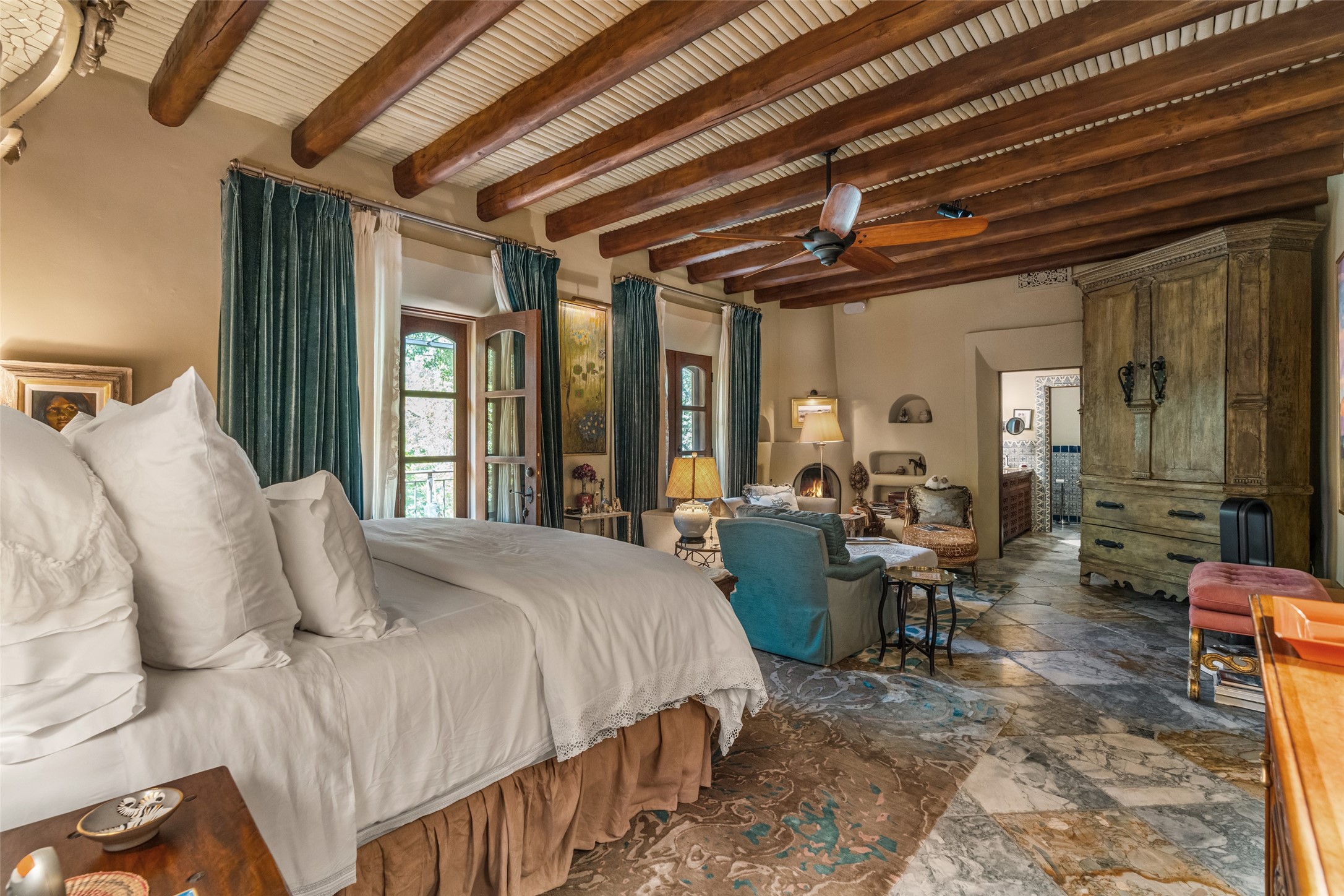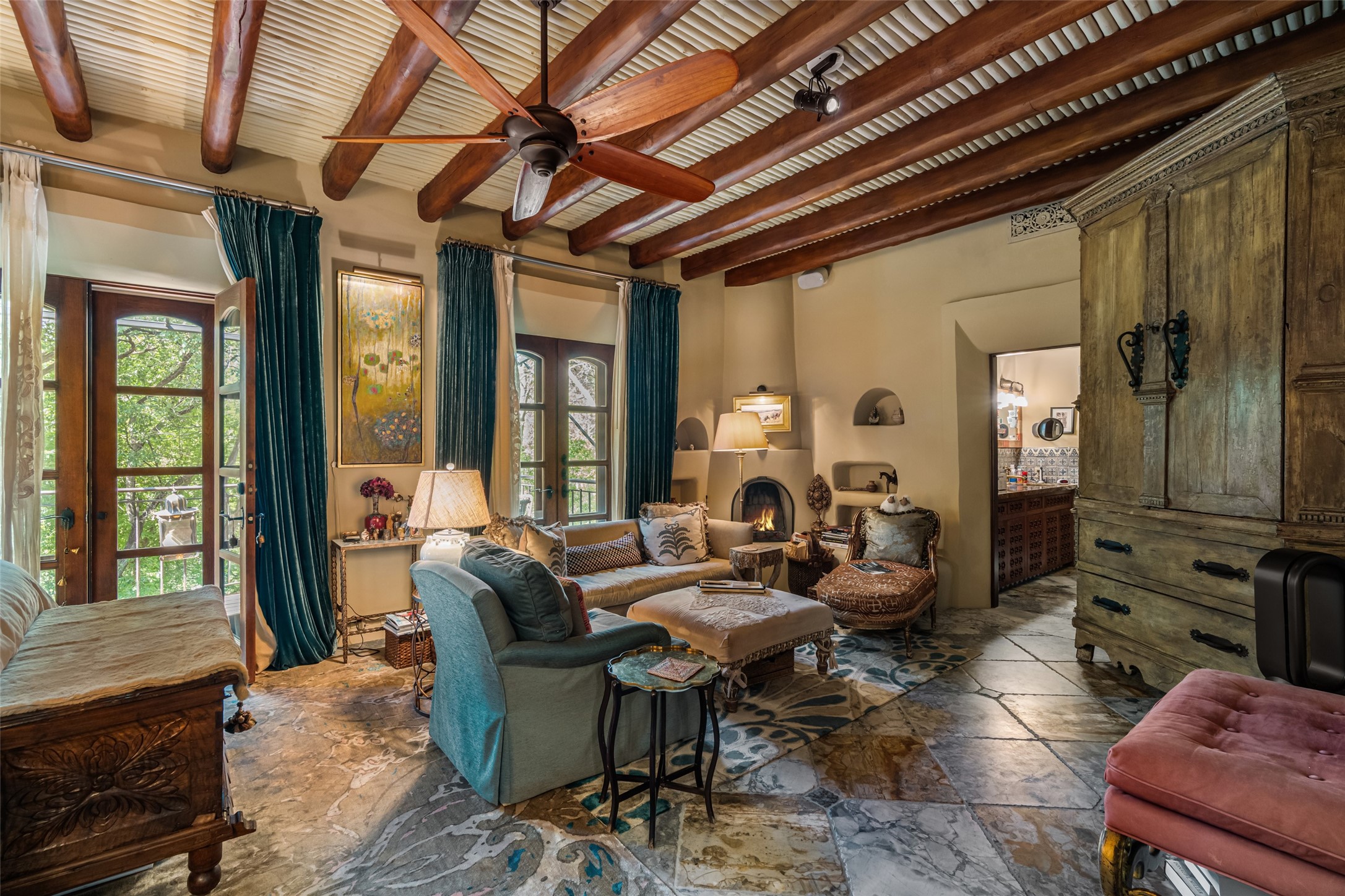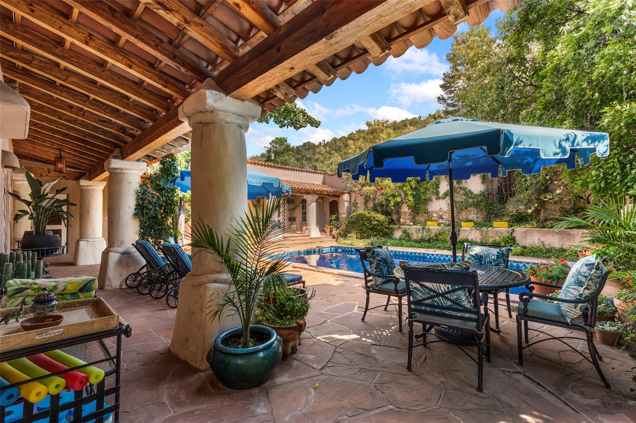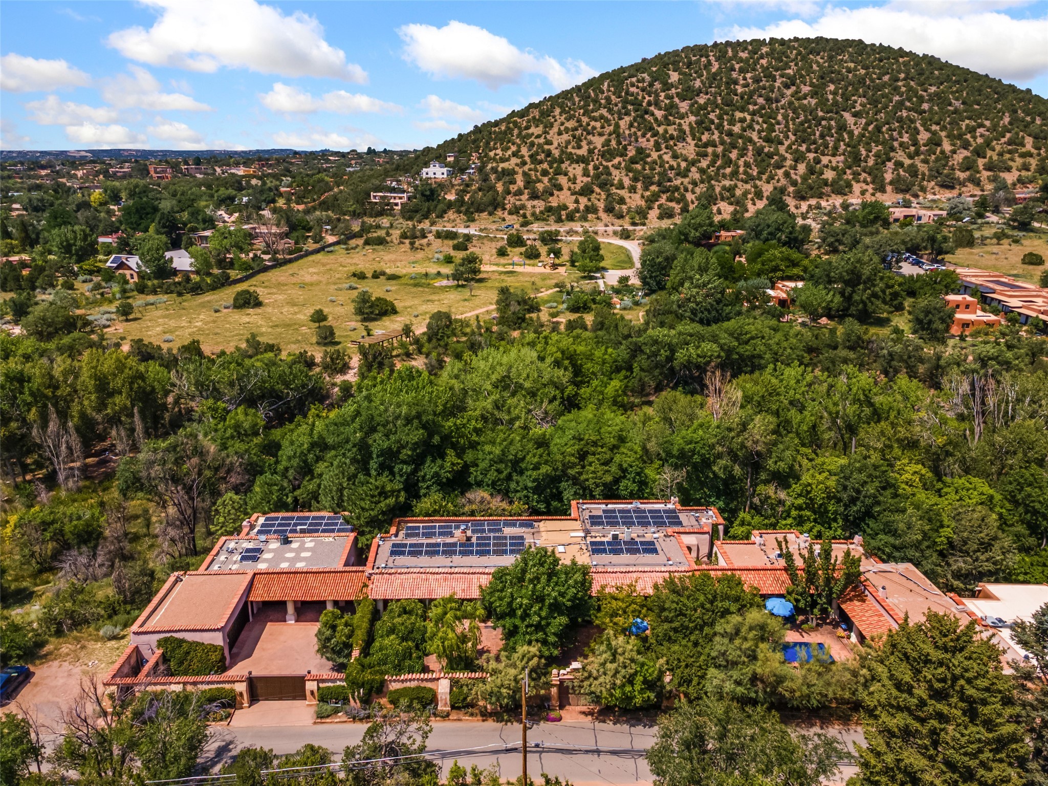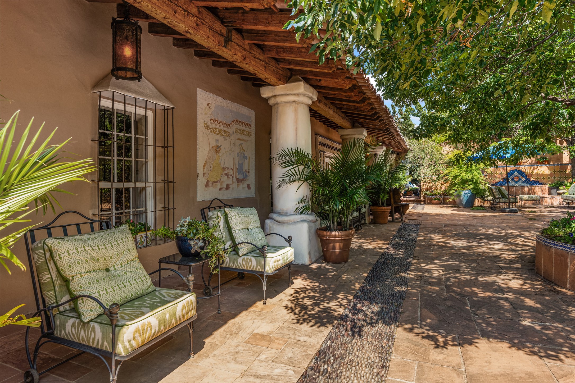 CASON DEL TRIUNFO - THE GIORGIO AND YOLANDA BELLOLI ESTATE - Originally designed and built in 1935, Santa Fe's most beautiful home has been lovingly maintained, expanded, and embellished by subsequent owners. The present-day architectural masterpiece presents an opportunity like no other - unique architecture featuring buttresses and curved terracotta tile roof, magnificent patios, 3 guest casitas, elaborate office and movie theatre, wine cellar, swimming pool and hot tub, 250+ feet of Rio Santa Fe frontage, and magnificent landscaping and outdoor spaces.