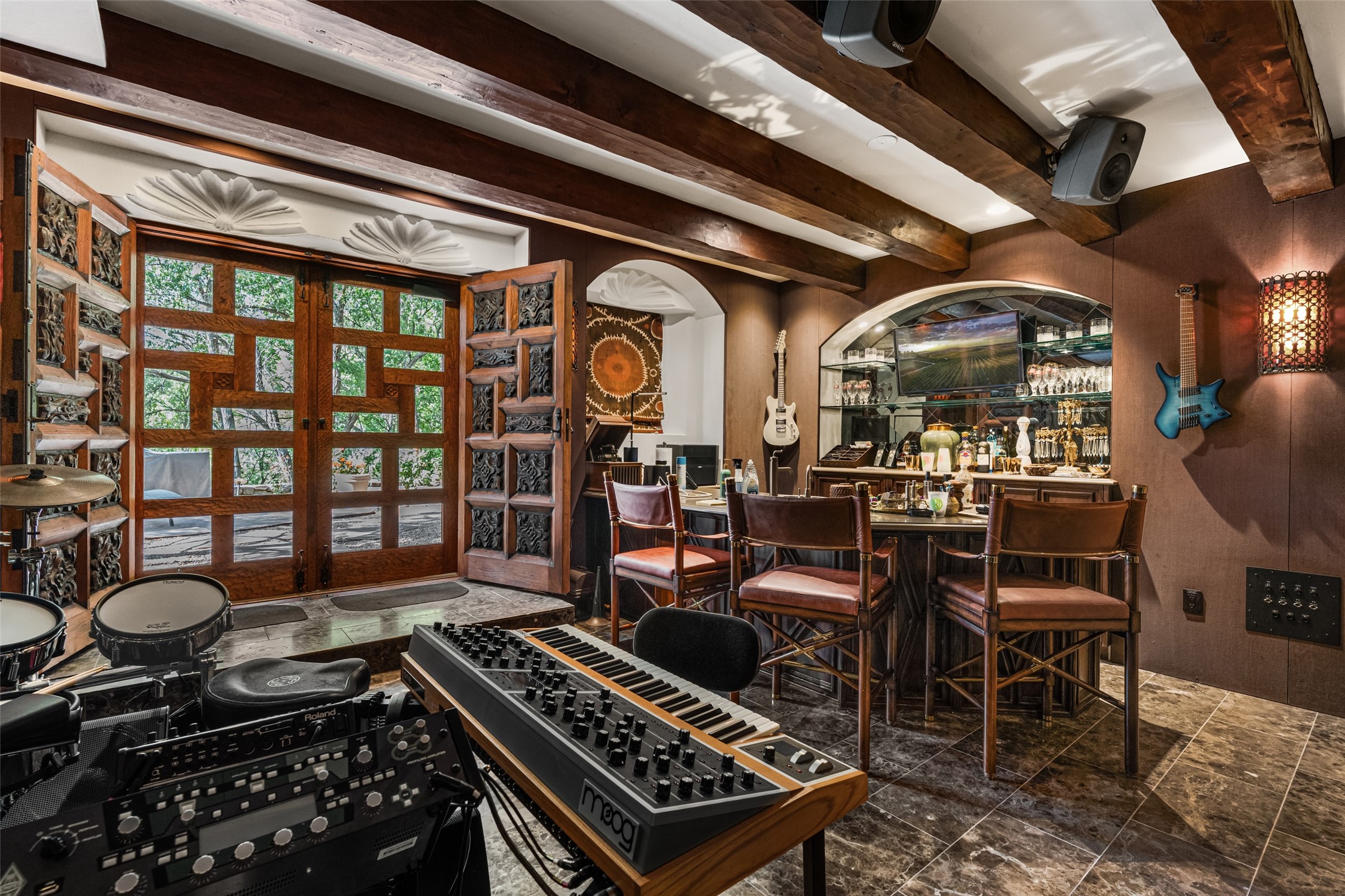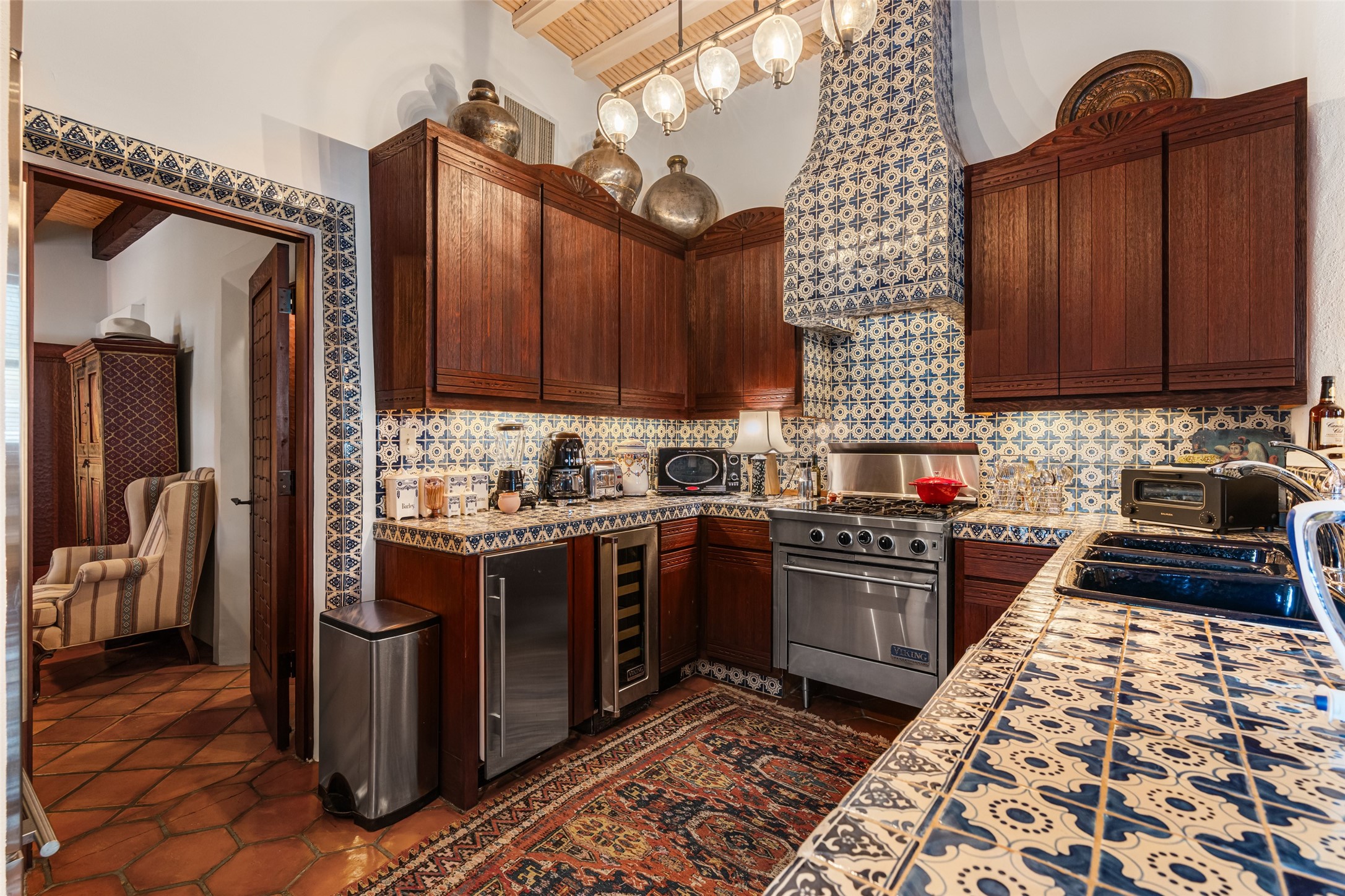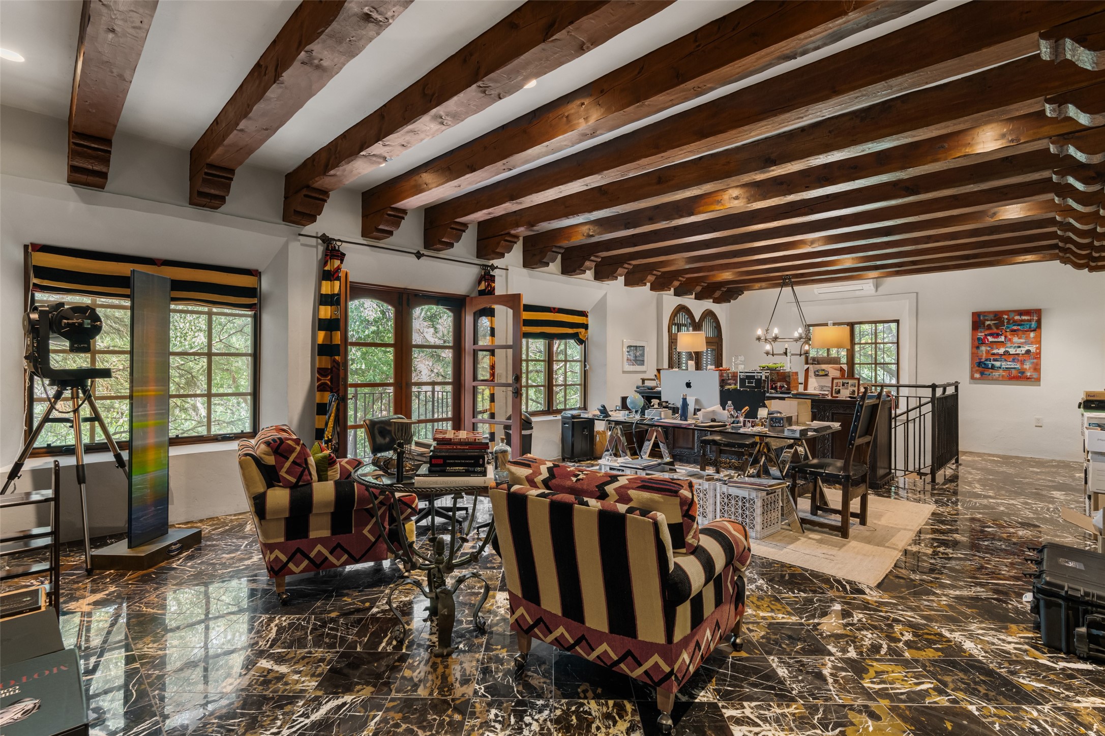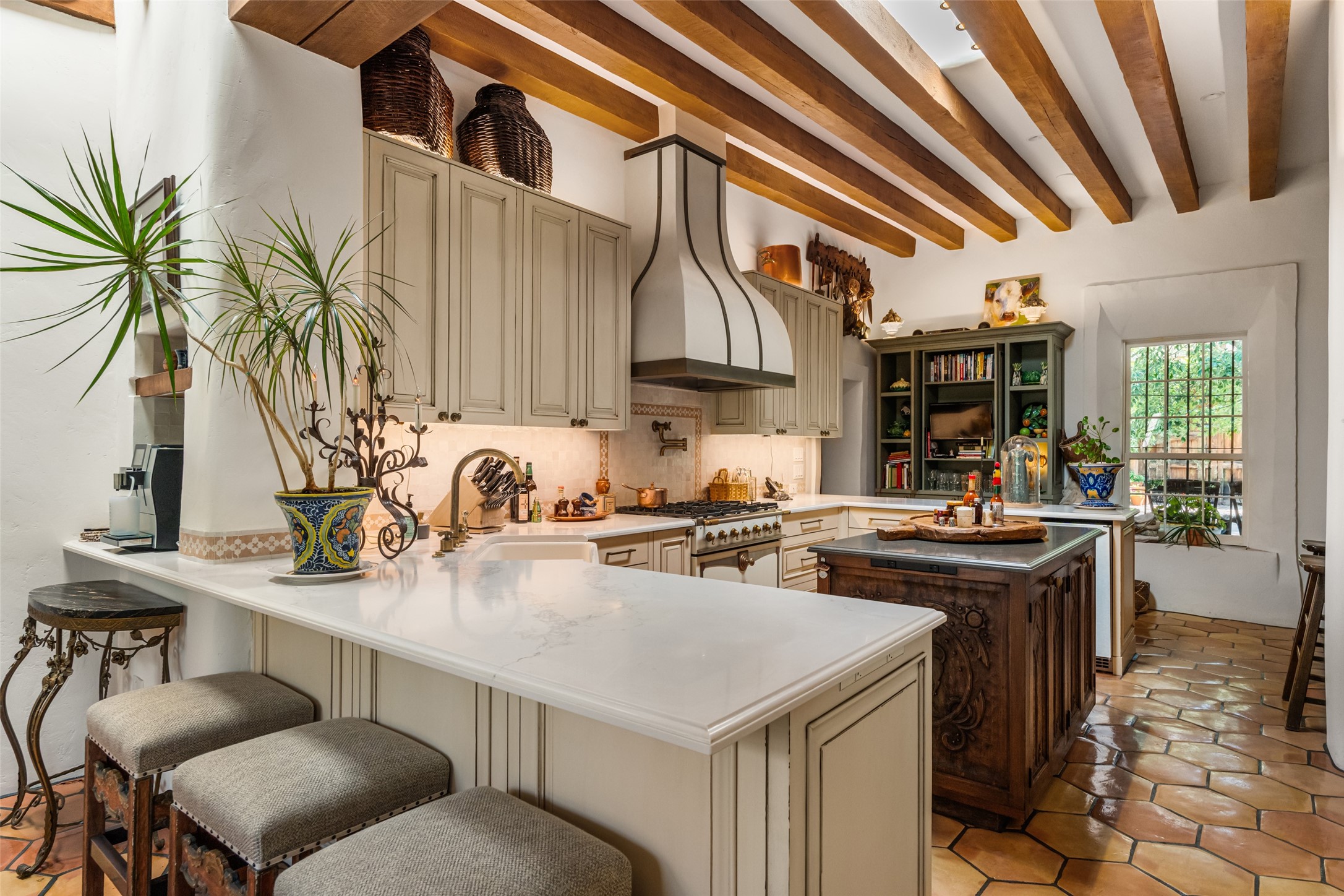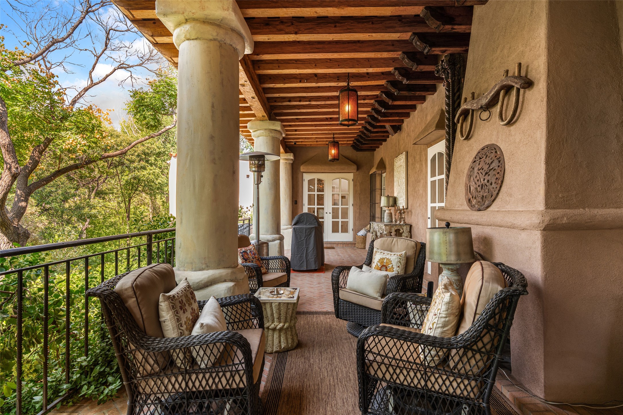 CASON DEL TRIUNFO - THE GIORGIO AND YOLANDA BELLOLI ESTATE - Originally designed and built in 1935, Santa Fe's most beautiful home has been lovingly maintained, expanded, and embellished by subsequent owners. The present-day architectural masterpiece presents an opportunity like no other - unique architecture featuring buttresses and curved terracotta tile roof, magnificent patios, 3 guest casitas, elaborate office and movie theatre, wine cellar, swimming pool and hot tub, 250+ feet of Rio Santa Fe frontage, and magnificent landscaping and outdoor spaces.