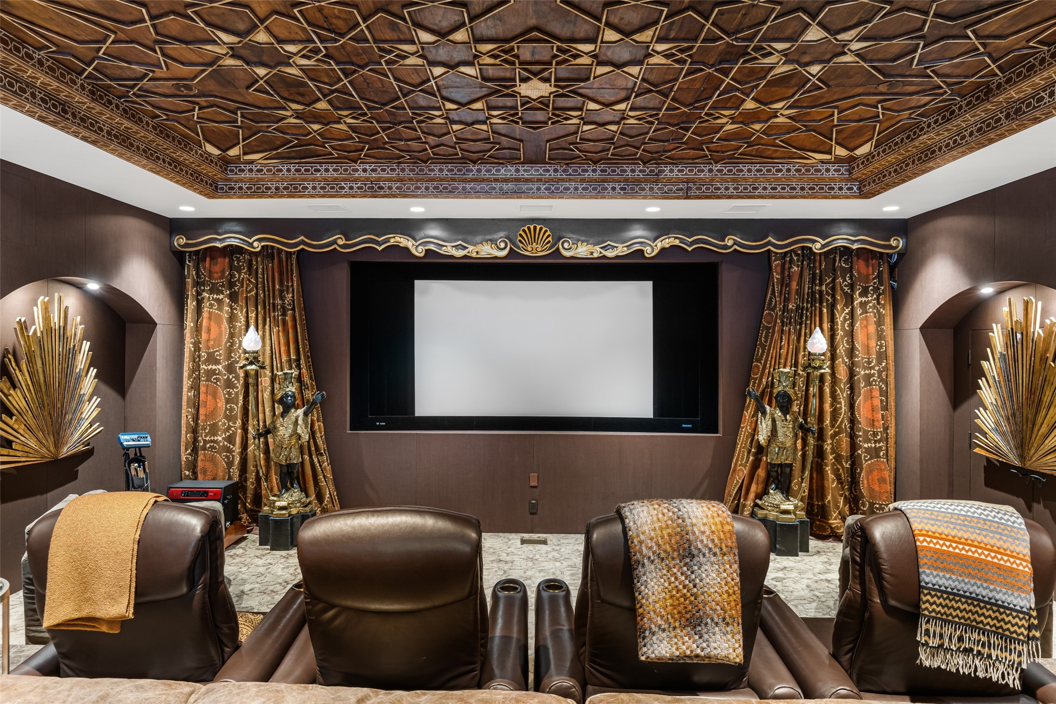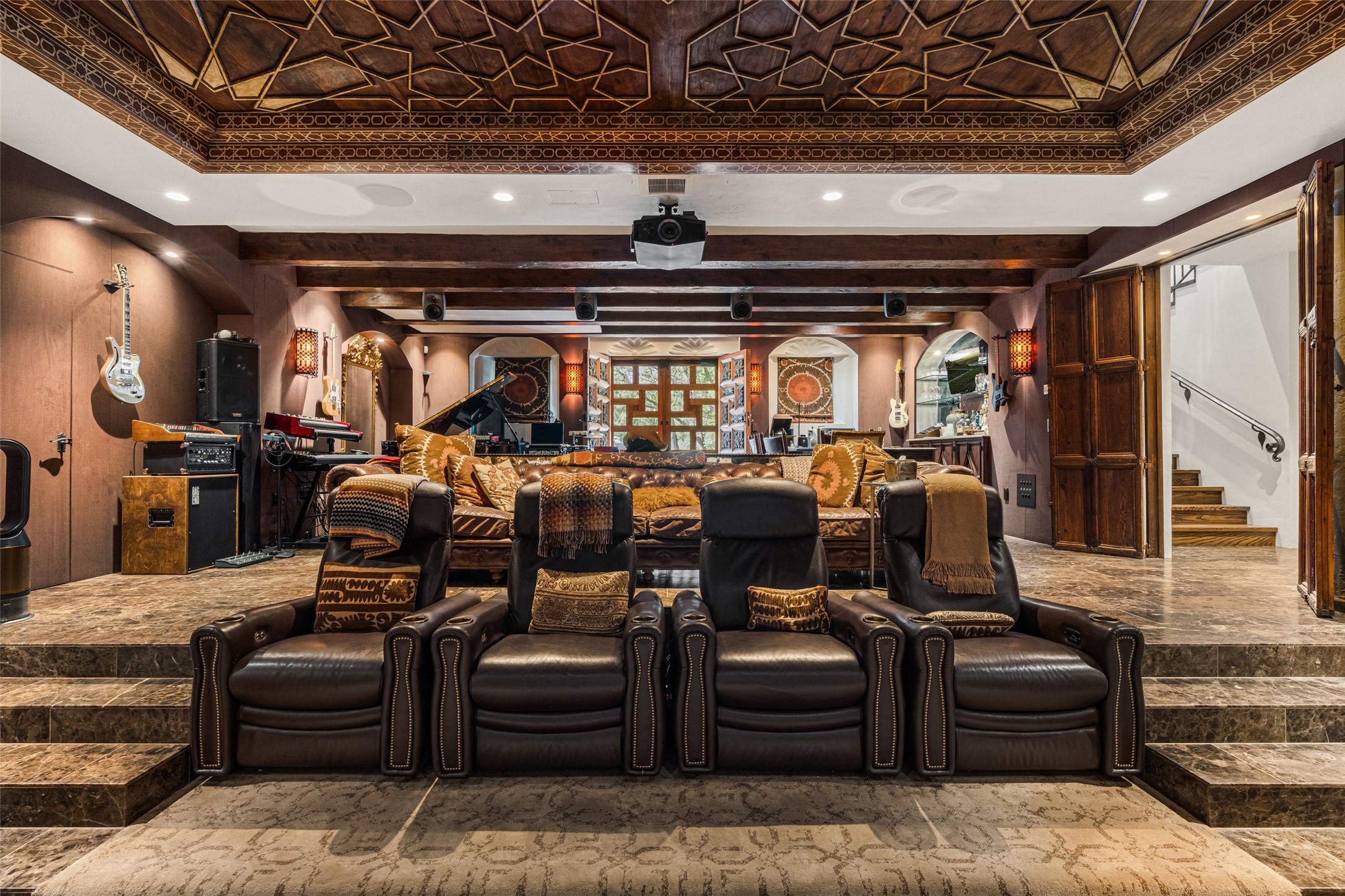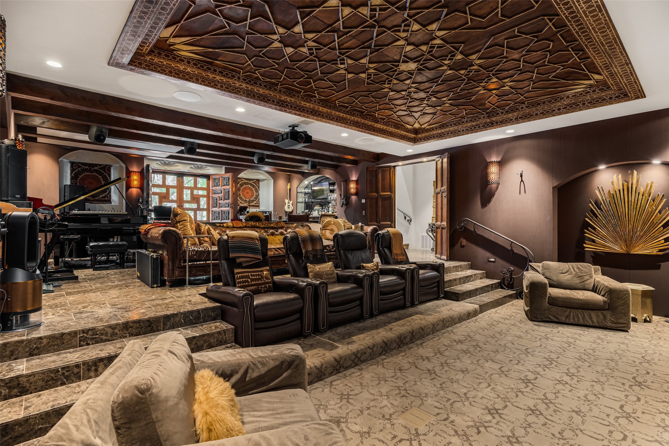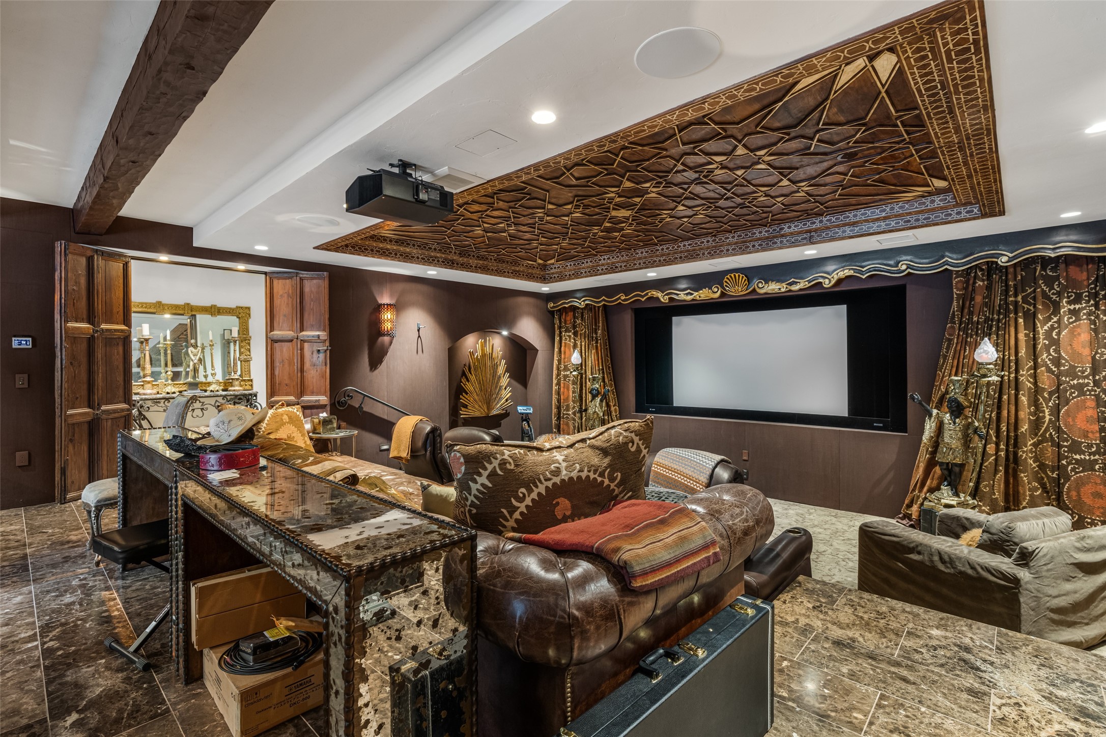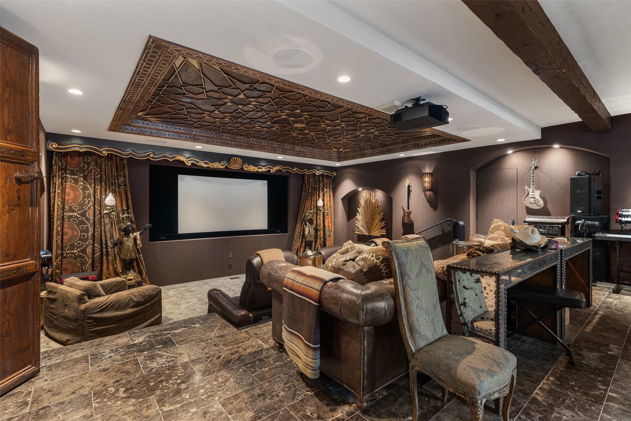 CASON DEL TRIUNFO - THE GIORGIO AND YOLANDA BELLOLI ESTATE - Originally designed and built in 1935, Santa Fe's most beautiful home has been lovingly maintained, expanded, and embellished by subsequent owners. The present-day architectural masterpiece presents an opportunity like no other - unique architecture featuring buttresses and curved terracotta tile roof, magnificent patios, 3 guest casitas, elaborate office and movie theatre, wine cellar, swimming pool and hot tub, 250+ feet of Rio Santa Fe frontage, and magnificent landscaping and outdoor spaces.