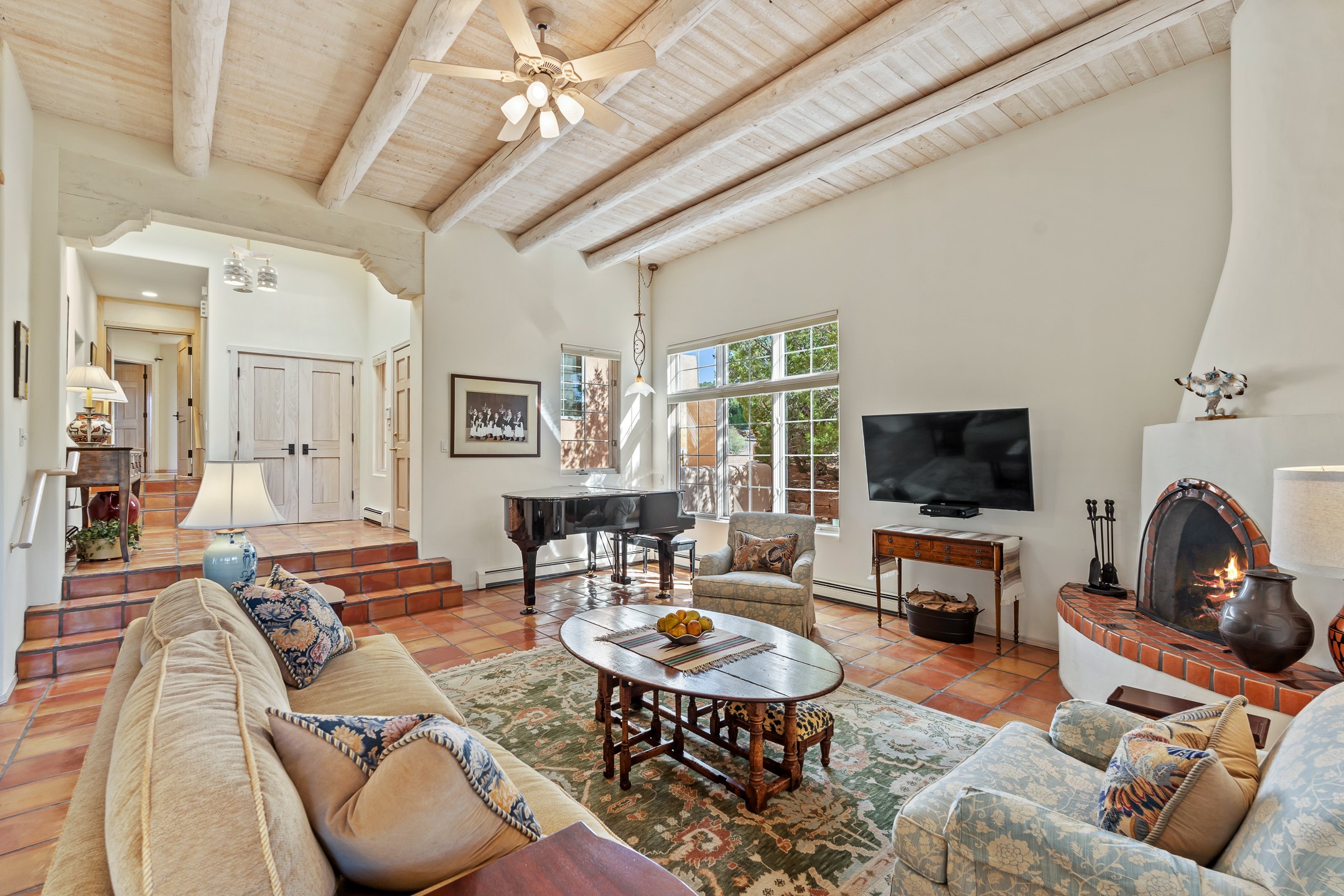 Perched above the city with beautiful Southern views of the Ortiz/Sandia and overlooking Santa Fe's beloved Ortiz Dog Park, this 2,814 sq. ft. residence offers 3 bedrooms and 3 bathrooms, including a beautifully designed, attached 1-bedroom, 1-bath guest house. The guest house has an interior connection to the home yet has its own private entrance, providing exceptional flexibility for extended family, guests, or income potential.The main living and dining area exudes Southwestern charm with high ceilings, vigas, a lovely wood-burning kiva fireplace, and French doors opening to a wraparound portal. A flagstone patio creates a magical outdoor dining setting to enjoy Santa Fe's sunsets and outdoor living. The kitchen, with its inviting breakfast nook, island, and warm regional details, is perfectly suited for both everyday living and entertaining.The spacious primary suite is a retreat of its own, with views, a luxurious bathroom featuring double vanities, a walk-in shower, and a deep soaking tub, plus an impressive walk-in closet. A guest bedroom and bath, set privately off the main hallway, complete the thoughtful floor plan.The guest house with full kitchen is accessible via an interior main house door or private exterior entrance, includes its own patio and offers endless possibilities--multi-generational living, a guest retreat, or a rental opportunity.Sited in a superior location just five minutes to downtown and ten minutes to the Plaza, this property combines views, versatility, and value in one of Santa Fe's most desirable settings. No HOA.