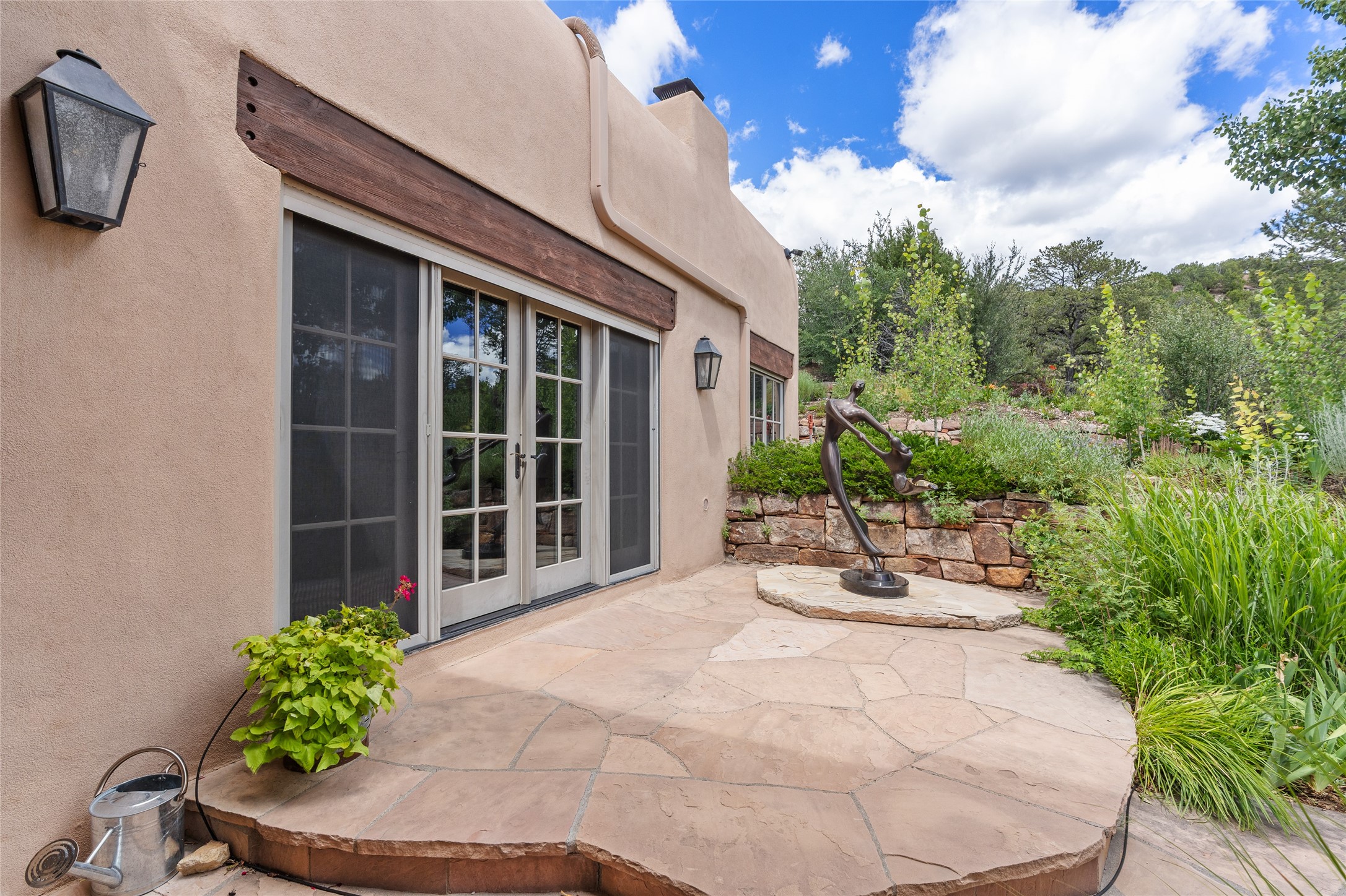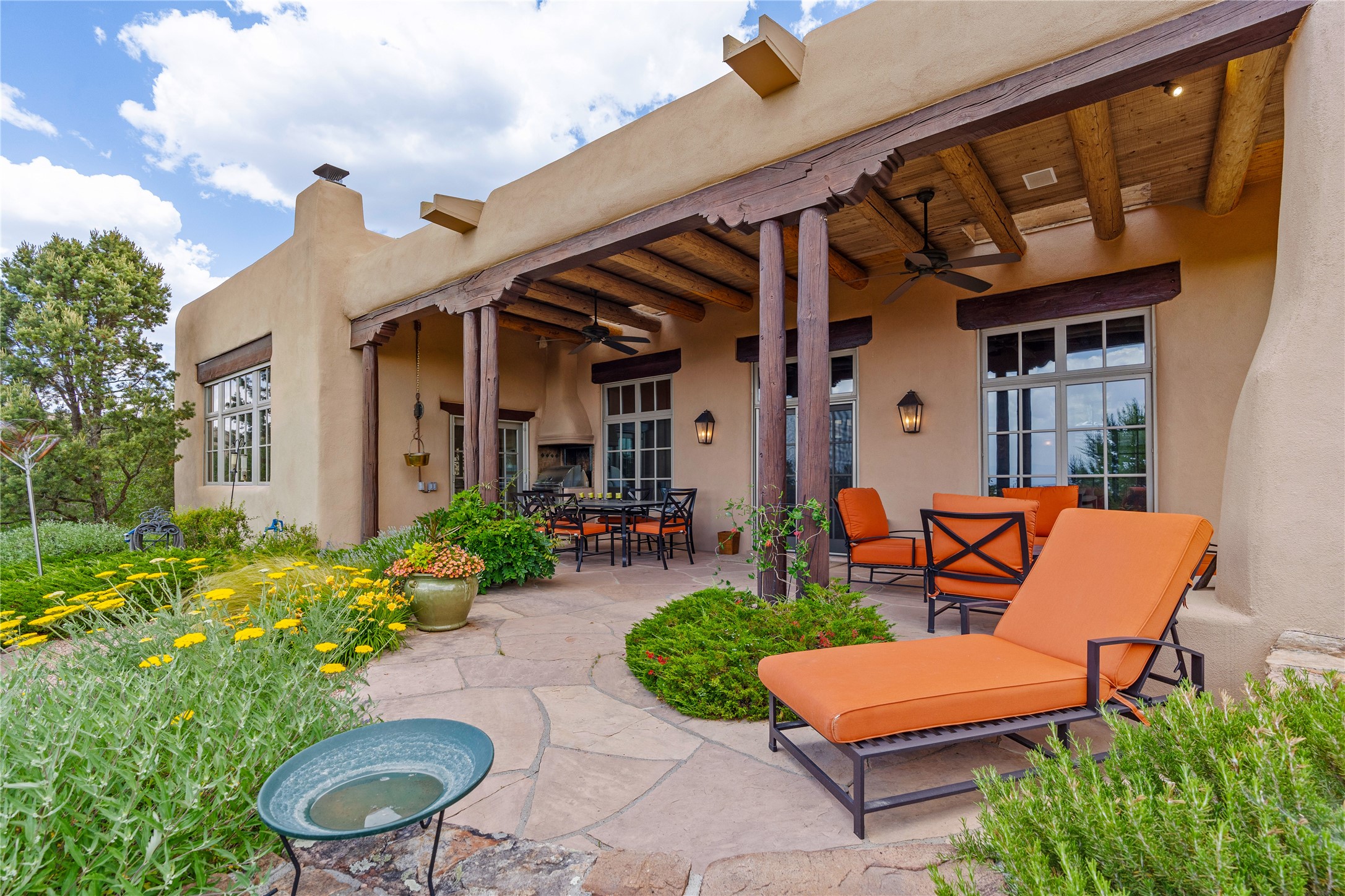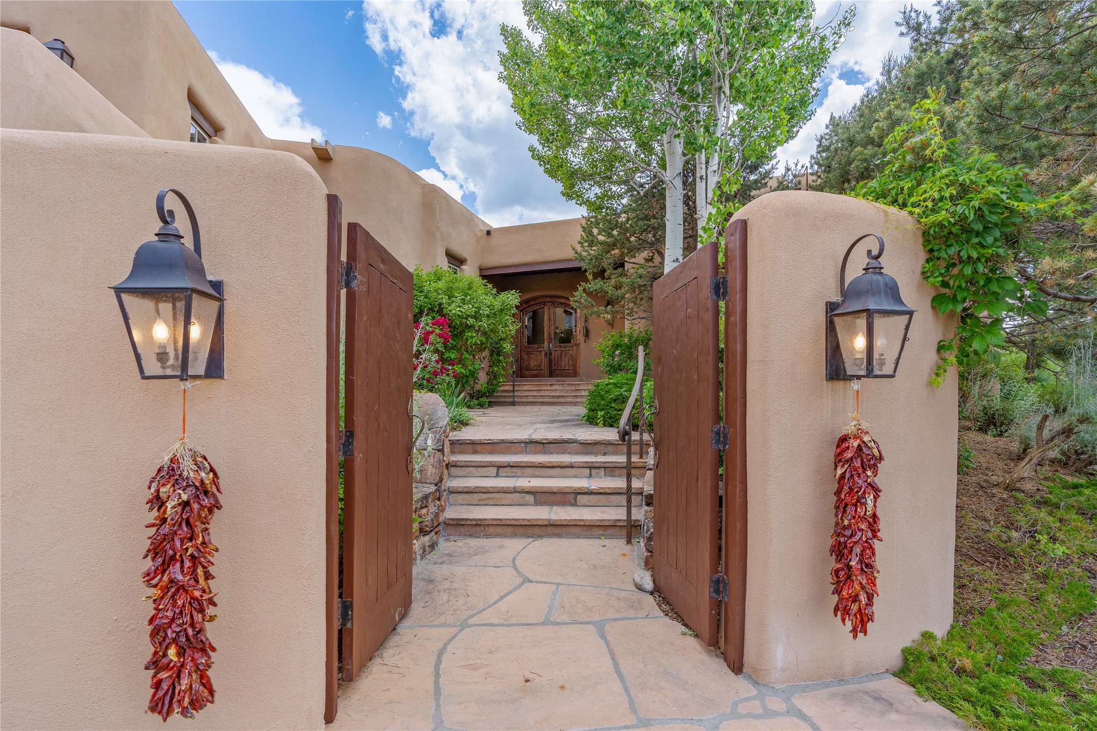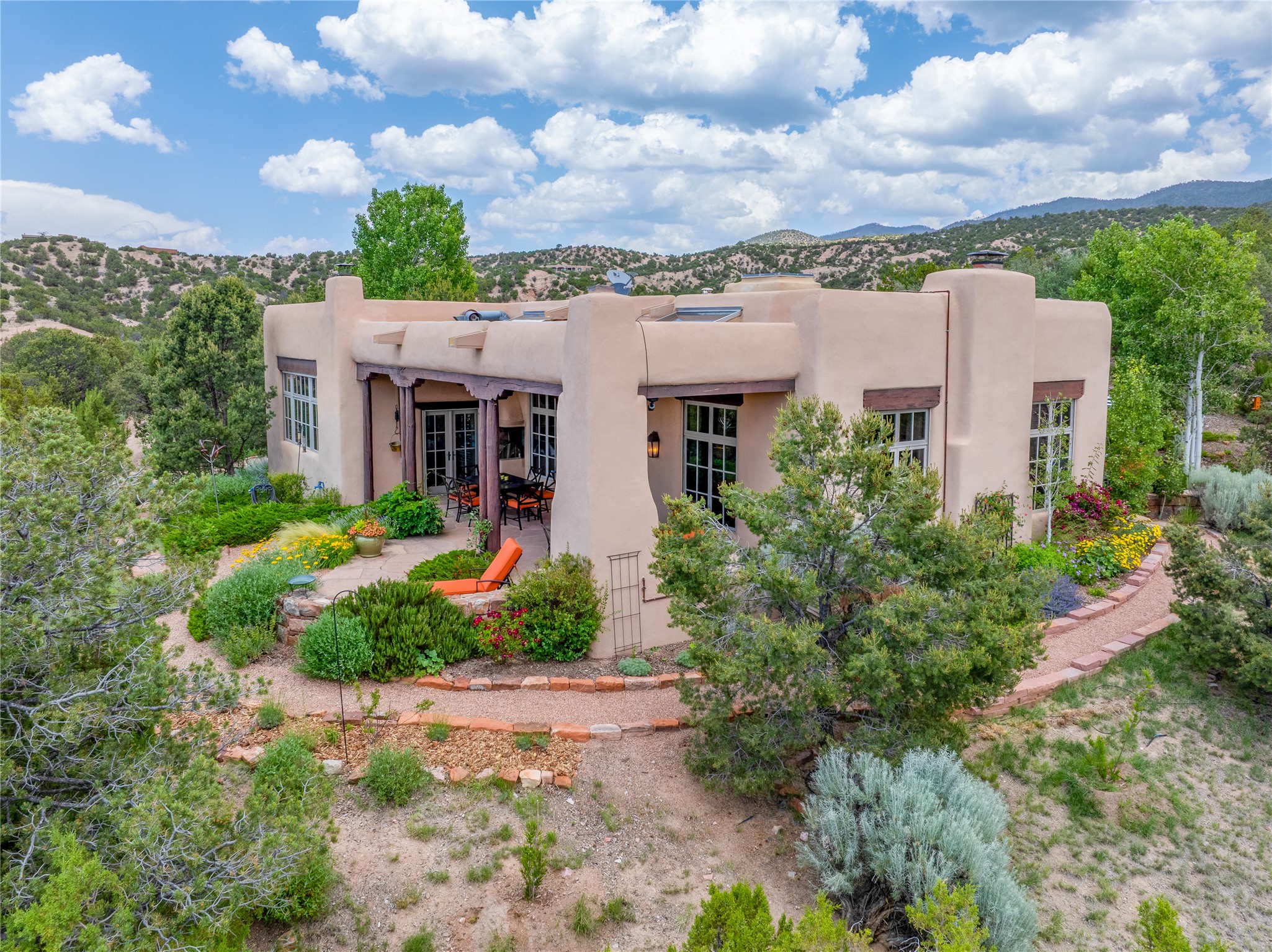 Welcome to a stunning Tesuque area compound in the prestigious gated Los Caminitos subdivision. On over 5 acres with a private well, fantastic Jemez and sunset views from main house built by Sharon Woods in 95'. The kitchen is stunning with doors to the portal with outdoor fireplace. Elegant living/dinning room surrounded on three sides by windows with upper end metal shades. Primary bedroom includes fireplace and access to rear patio. Two guest bedrooms have their own private deck with views of the Sangres. 3 car garage. Separate guest house with bath, as well as a large studio apartment and spacious studio with large north windows and new modern bathroom. Several owner upgrades including new entrance gate and septic field, new drip irrigation and pantry. Community pool and racquet courts. Lavender, roses, aspens, lilacs crab apple and peonies. 15 minutes from the plaza, adjacent to the Four Seasons resort, close to Tesuque Village Market and the world renowned Santa Fe Opera. If privacy, security and the New Mexico landscape is what you are looking for, come see.