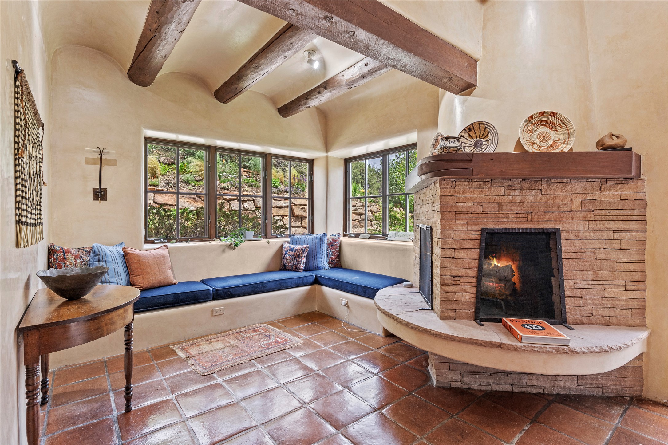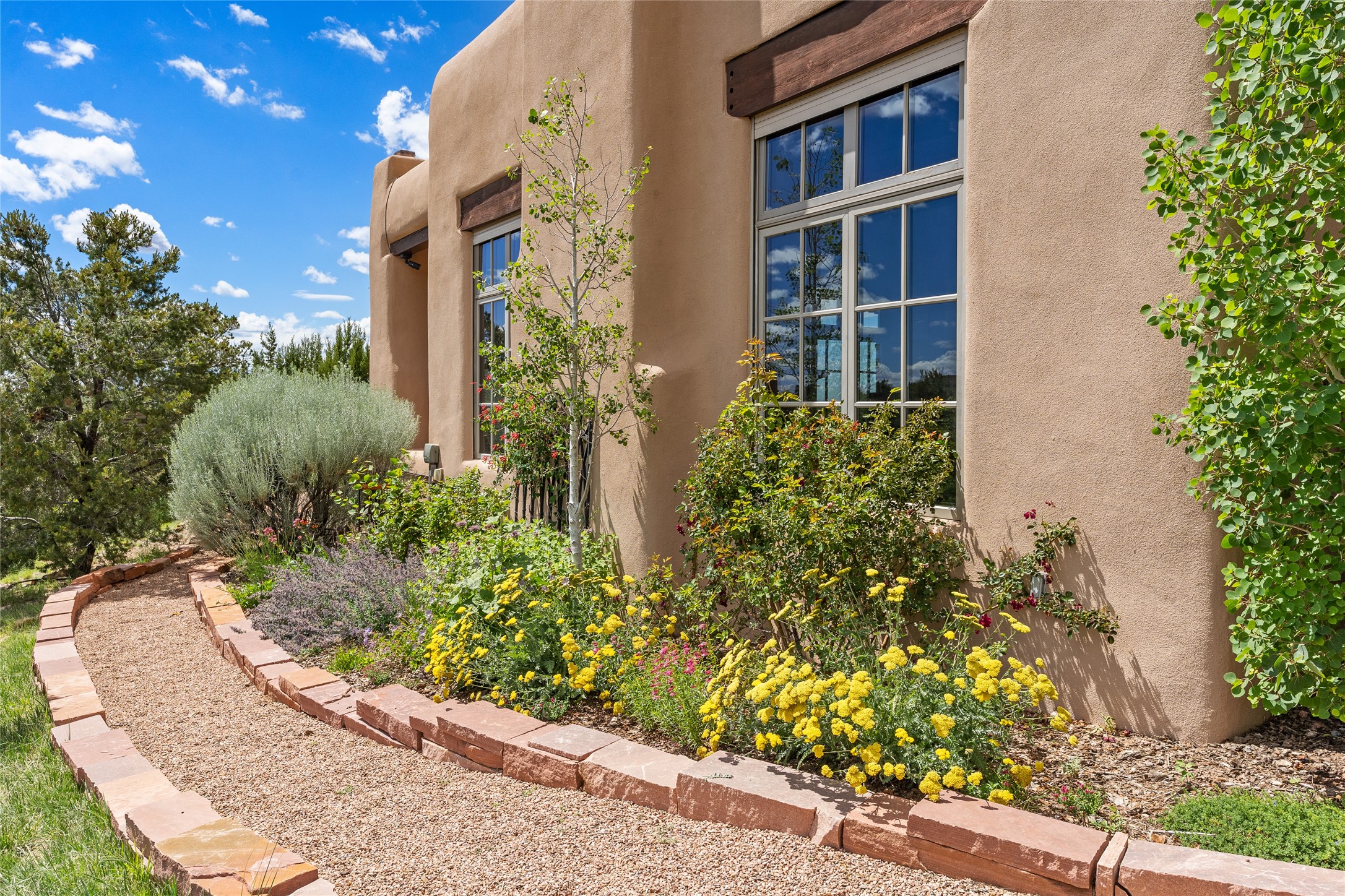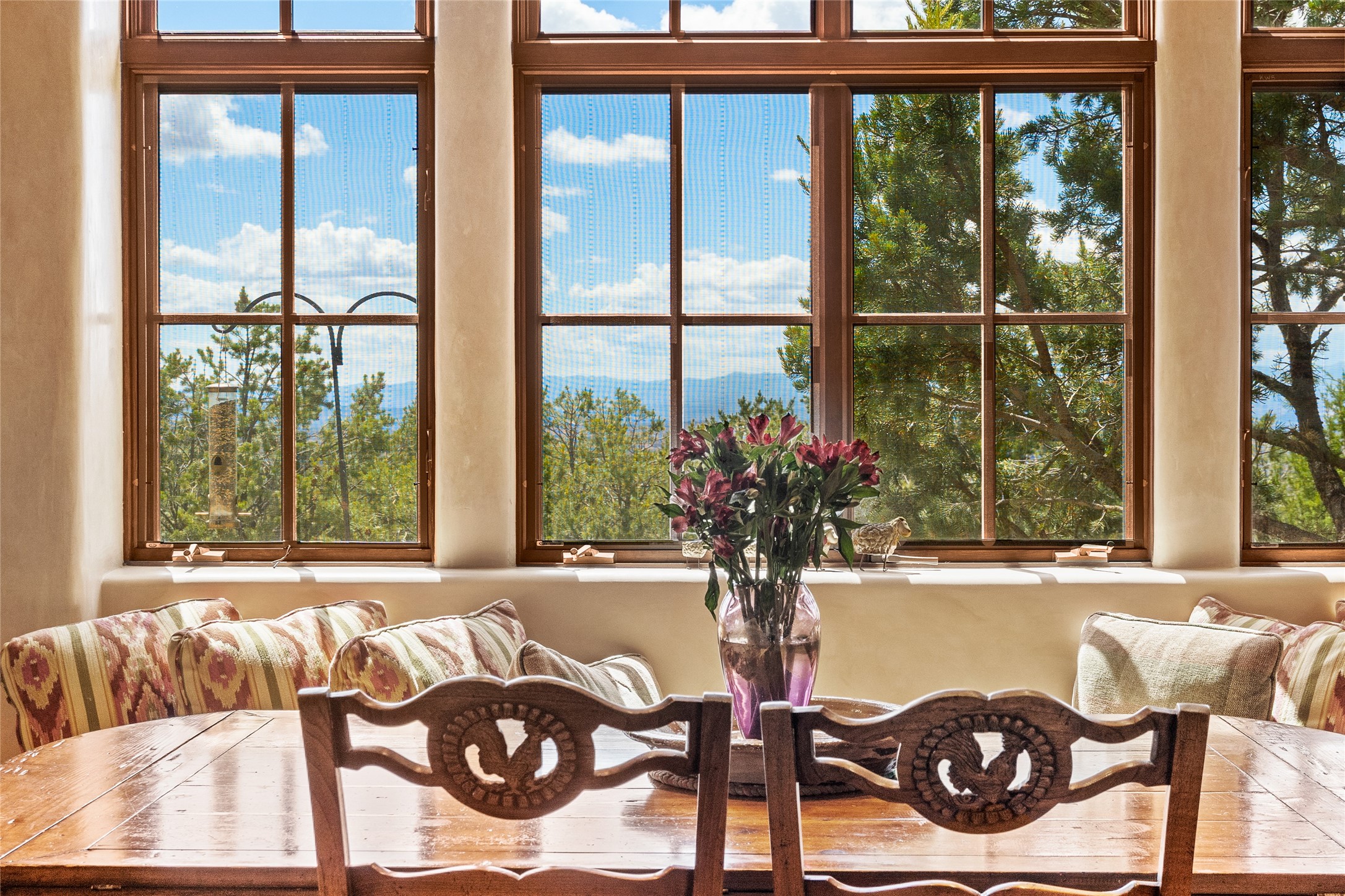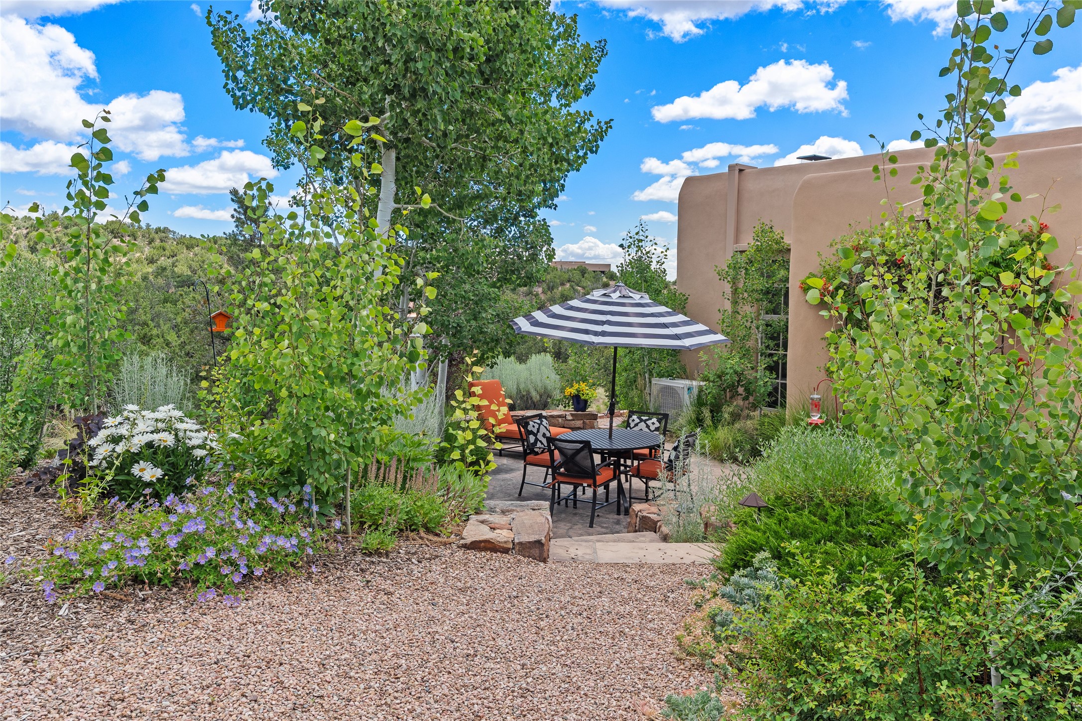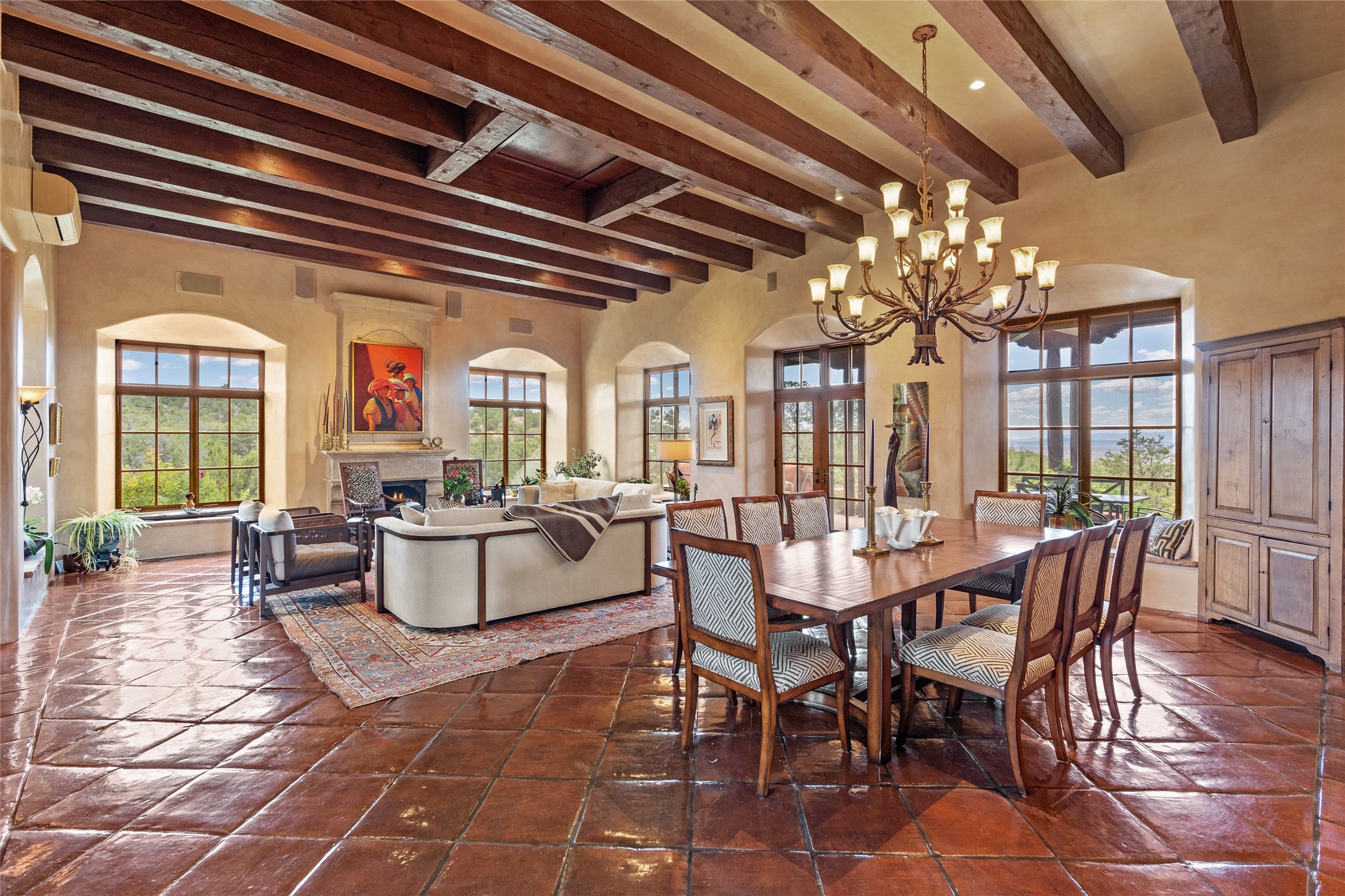 Welcome to a stunning Tesuque area compound in the prestigious gated Los Caminitos subdivision. On over 5 acres with a private well, fantastic Jemez and sunset views from main house built by Sharon Woods in 95'. The kitchen is stunning with doors to the portal with outdoor fireplace. Elegant living/dinning room surrounded on three sides by windows with upper end metal shades. Primary bedroom includes fireplace and access to rear patio. Two guest bedrooms have their own private deck with views of the Sangres. 3 car garage. Separate guest house with bath, as well as a large studio apartment and spacious studio with large north windows and new modern bathroom. Several owner upgrades including new entrance gate and septic field, new drip irrigation and pantry. Community pool and racquet courts. Lavender, roses, aspens, lilacs crab apple and peonies. 15 minutes from the plaza, adjacent to the Four Seasons resort, close to Tesuque Village Market and the world renowned Santa Fe Opera. If privacy, security and the New Mexico landscape is what you are looking for, come see.