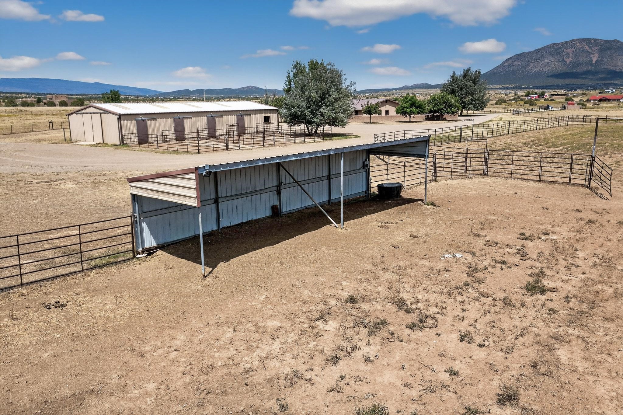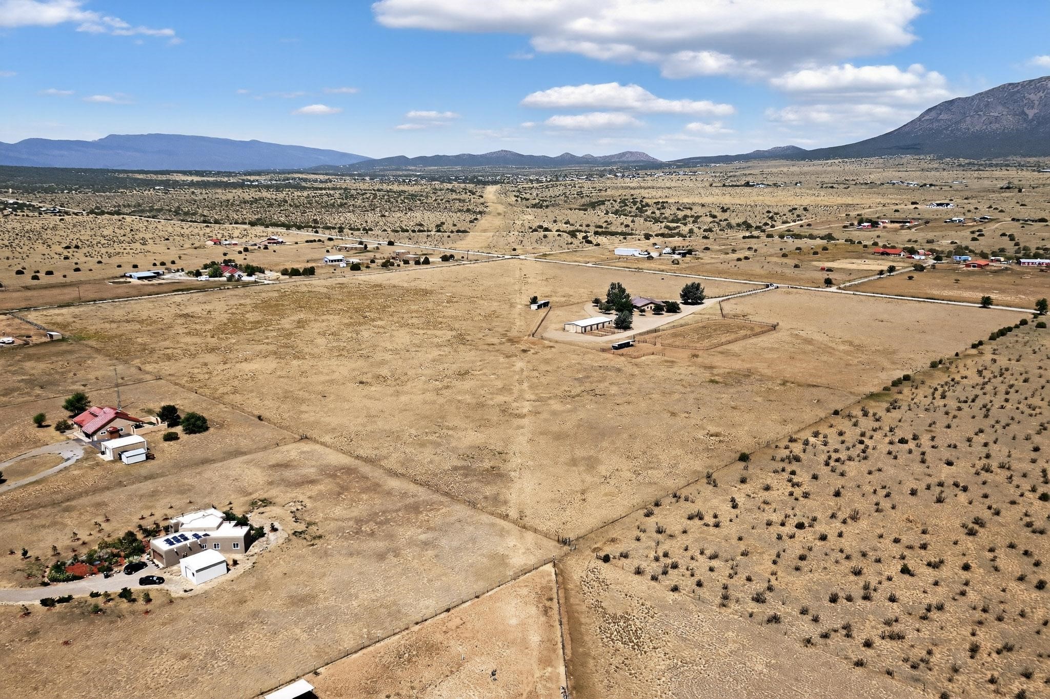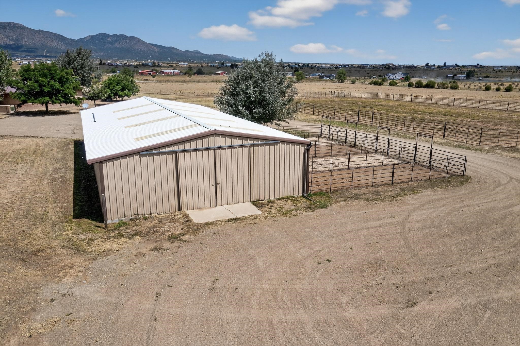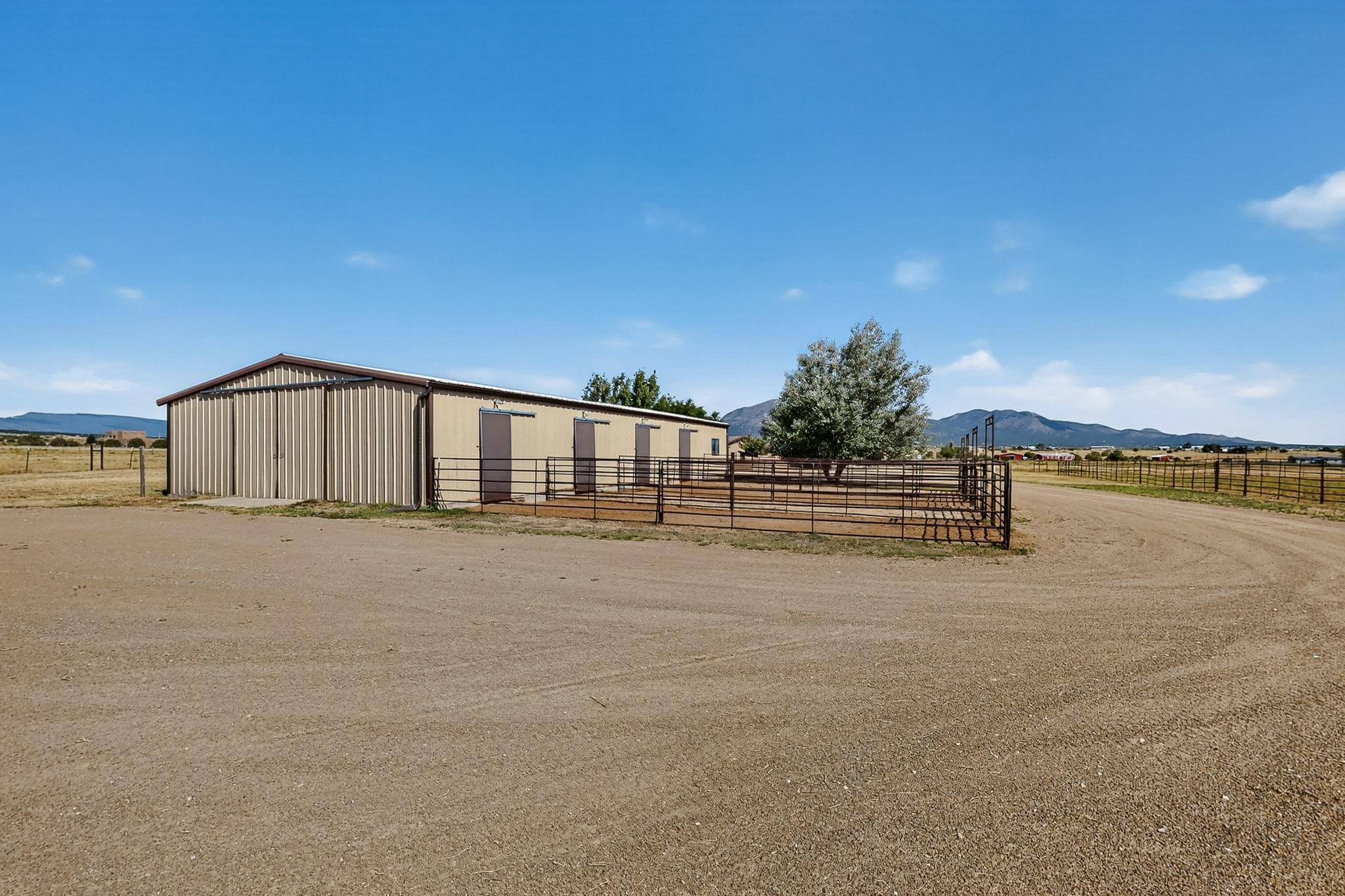 This true equine estate has finally come on the market so don't miss your opportunity to own this amazing property. 38.8 acres fully fenced and cross fenced! 3051 heated sqft of main home and guest suite. This estate home boasts hardwood floors throughout, with custom touches, large spacious open floor plan with great room and kitchen for entertaining, primary bedroom suite with wall to wall closets, double vanities, and exterior access. 3bed 2bath main home, 2 living areas, gourmet stainless steel kitchen, laundry room with storage. There are so many built in storage and closets the possibilities are endless on how you use it. Oversized finished 2 car garage with built in storage. 4 stall barn with finished tack room, and 1 bedroom, 1 bath, kitchenette, walk in closet: guest suite.Not only are you going to love this estate, but your animals will love it too! Full sized arena for your use and three cross fenced pastures all with barn loafing sheds. Water has been run throughout the property to the barns for the convenience of keeping the critters taken care of. The approx. 2300 sqft barn has pull through capability, a finished tack room, 4 walk out stalls, hay storage, rubber floor mats, and a 363 sqft guest living quarters! A large equine estate like this doesn't come up for sale in the East Mountains/Southern Santa Fe County area too often, and none are as nice and custom as this property. If you are needing a place to kick up your boots, let your critters stretch their legs, and for yourself to relax from dawn to dusk, you have found your 38.8 acre slice of paradise with this equine estate.