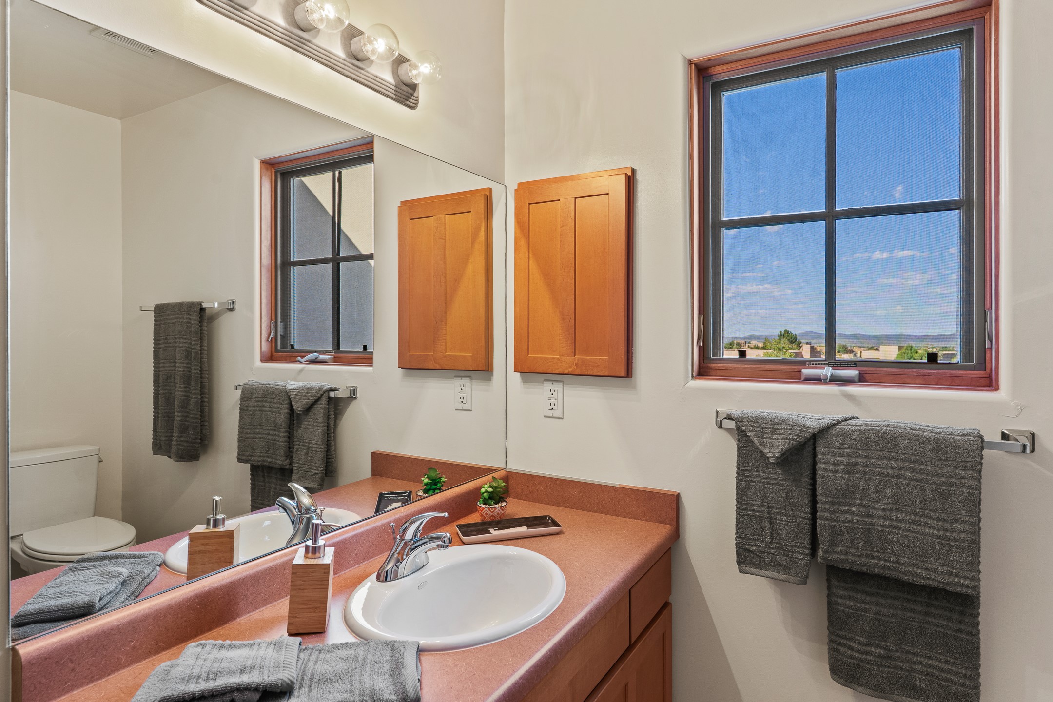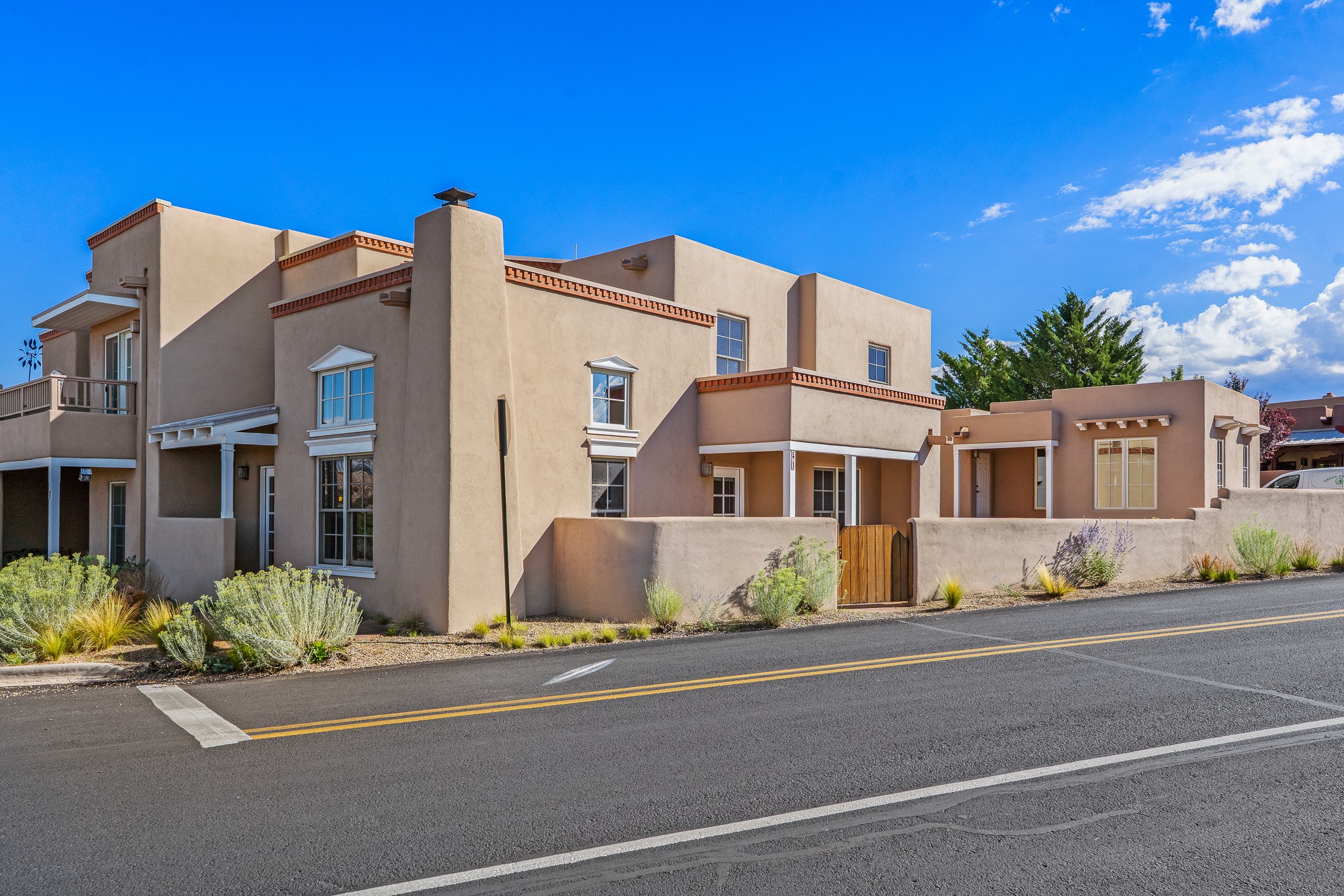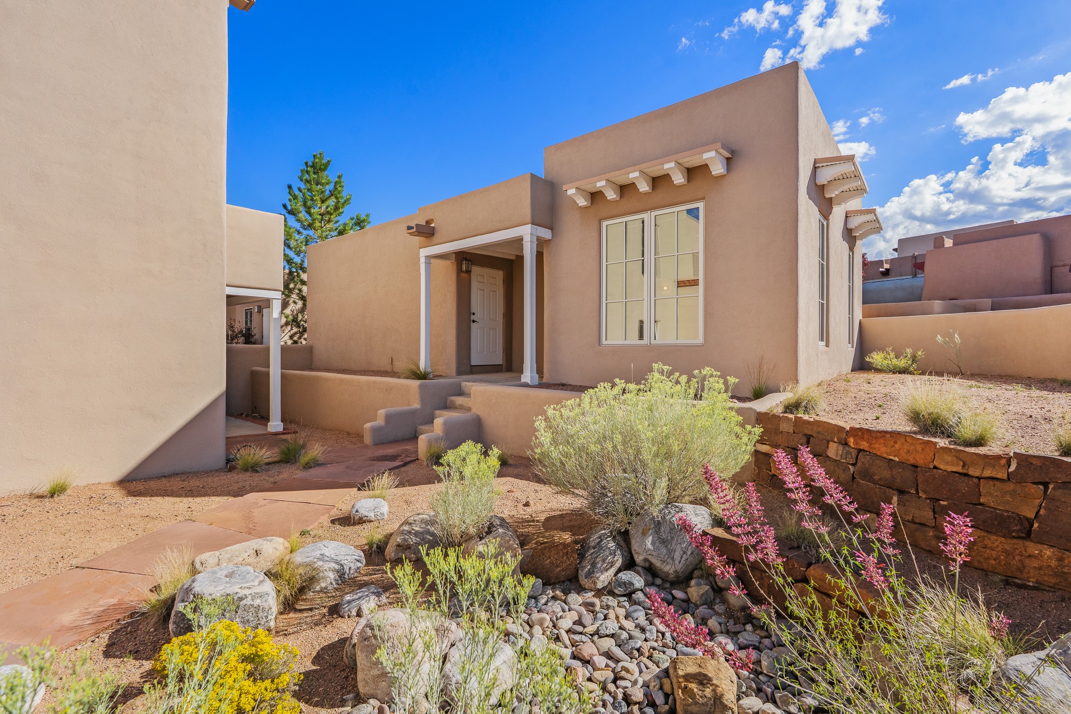 First time on the market in Santa Fe's Aldea de Santa Fe community! Built in 2003 by Bruce Thompson, this wonderfully flexible configuration offers a three-bedroom main house and detached casita perfectly suited to serve creative pursuits and hosting-needs. The main home's central living and dining spaces are adorned with Santa Fe-classics: plaster walls, viga-accented ceilings, and a cozy wood-burning kiva fireplace. Adjacent to the light-filled living room is a private nook, finished with built-in bookcases, that functions effortlessly as an office/study, secondary seating area, or creative space. The kitchen is complete with abundant countertop space, ample cabinetry/storage and an informal dining area. Upstairs, the primary bedroom is a relaxing retreat with its own private deck. Outside, the patio area is a serene setting to unwind and the surrounding yard is well-suited for low-fuss flower and garden beds. The detached 345+/- sqft casita is a work-from-home dream, or a comfortable arrangement for hosting friends and family. Sensibility and style collide in one of Santa Fe's vibrant and well-cared for communities. Aldea is an active community with miles of walking trails, a community center and other amenities--all just 15 minutes from downtown Santa Fe.