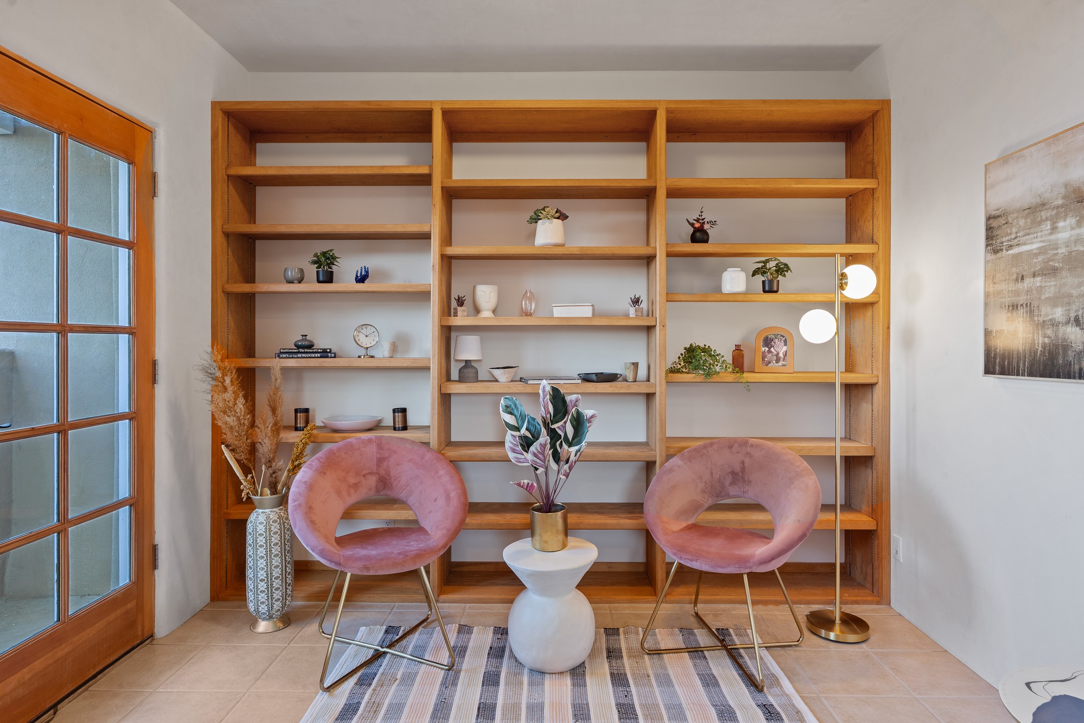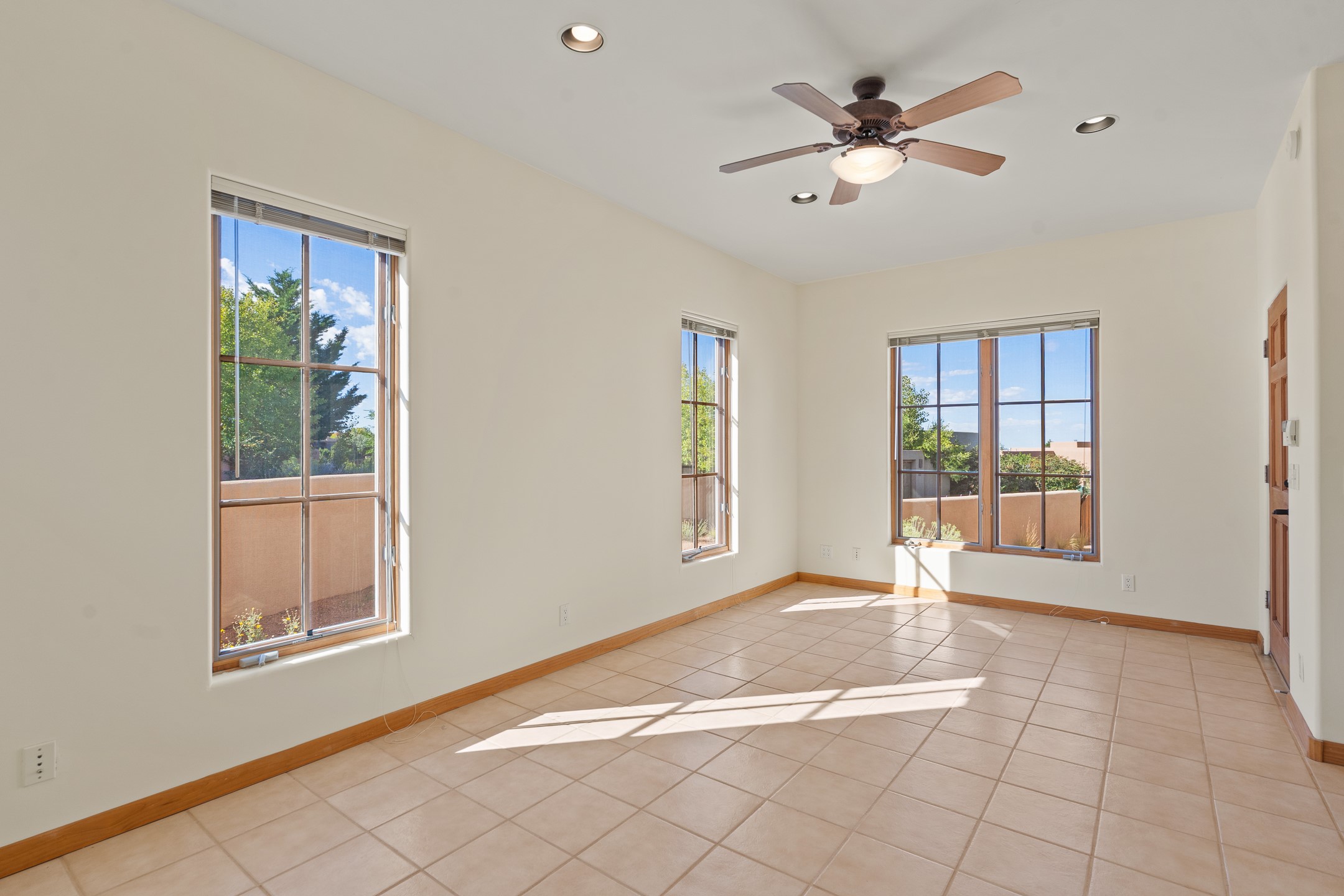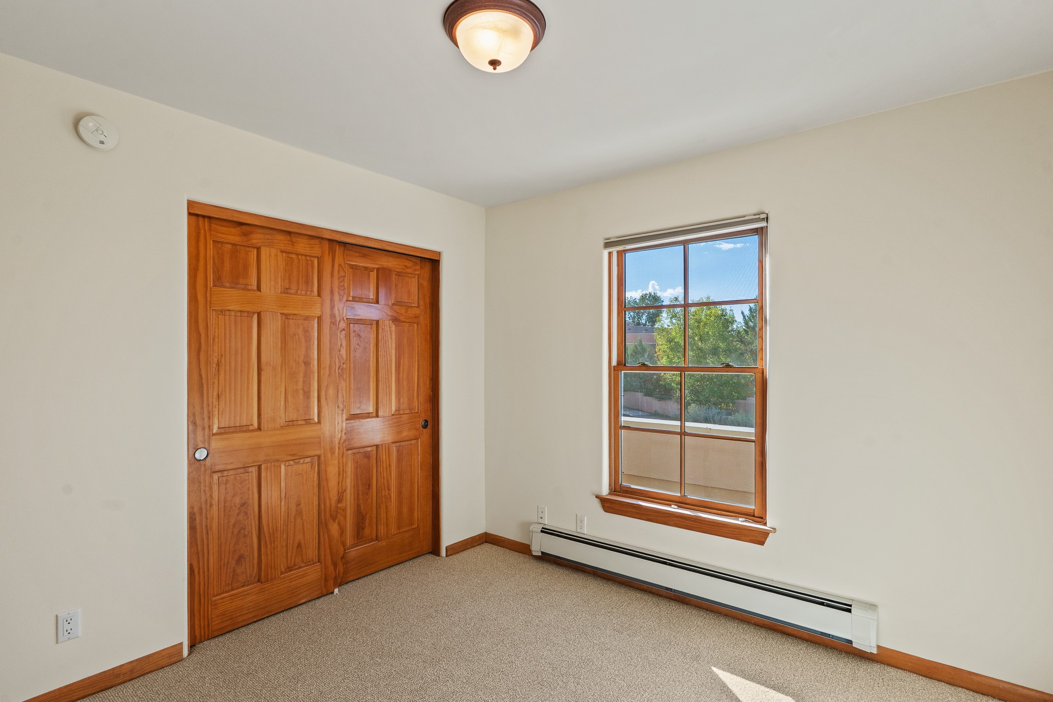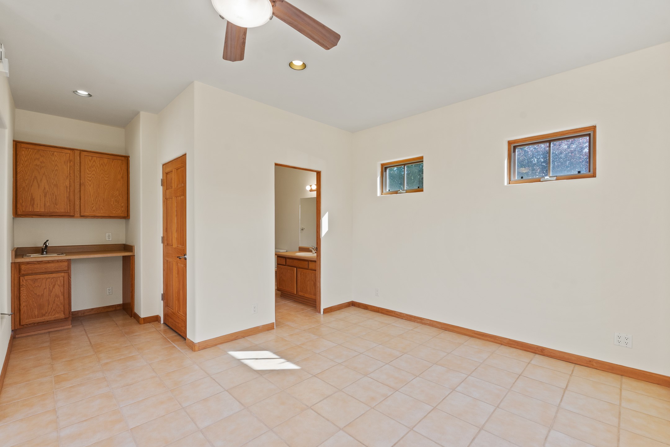 First time on the market in Santa Fe's Aldea de Santa Fe community! Built in 2003 by Bruce Thompson, this wonderfully flexible configuration offers a three-bedroom main house and detached casita perfectly suited to serve creative pursuits and hosting-needs. The main home's central living and dining spaces are adorned with Santa Fe-classics: plaster walls, viga-accented ceilings, and a cozy wood-burning kiva fireplace. Adjacent to the light-filled living room is a private nook, finished with built-in bookcases, that functions effortlessly as an office/study, secondary seating area, or creative space. The kitchen is complete with abundant countertop space, ample cabinetry/storage and an informal dining area. Upstairs, the primary bedroom is a relaxing retreat with its own private deck. Outside, the patio area is a serene setting to unwind and the surrounding yard is well-suited for low-fuss flower and garden beds. The detached 345+/- sqft casita is a work-from-home dream, or a comfortable arrangement for hosting friends and family. Sensibility and style collide in one of Santa Fe's vibrant and well-cared for communities. Aldea is an active community with miles of walking trails, a community center and other amenities--all just 15 minutes from downtown Santa Fe.