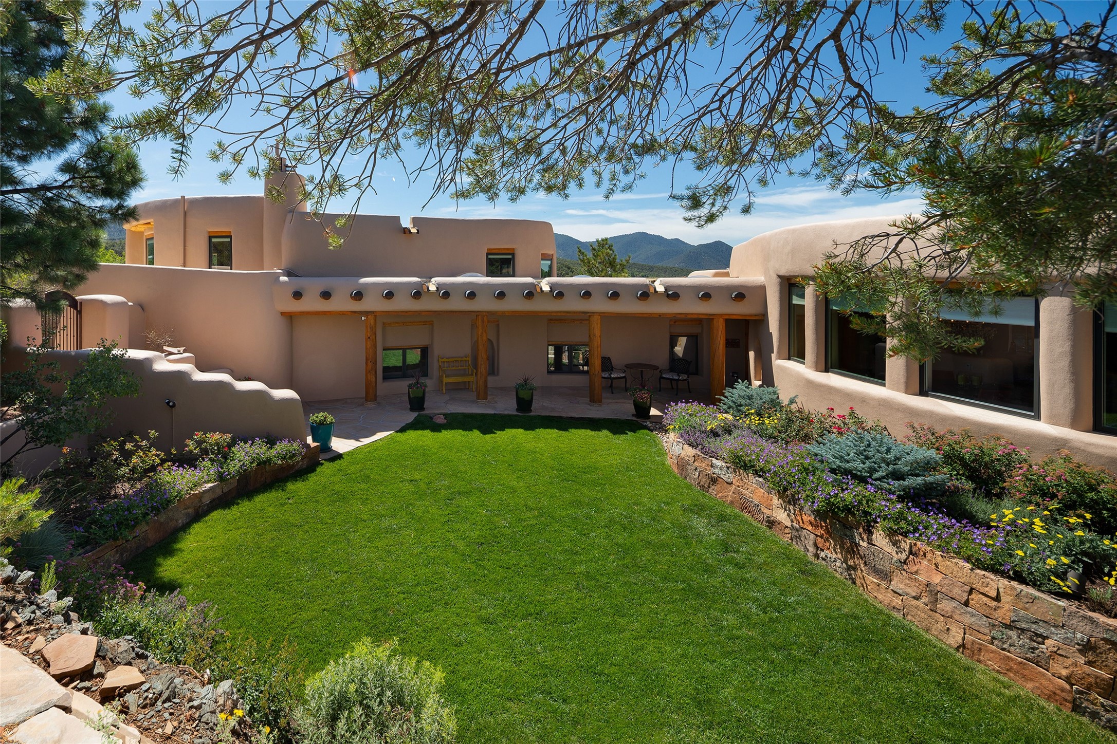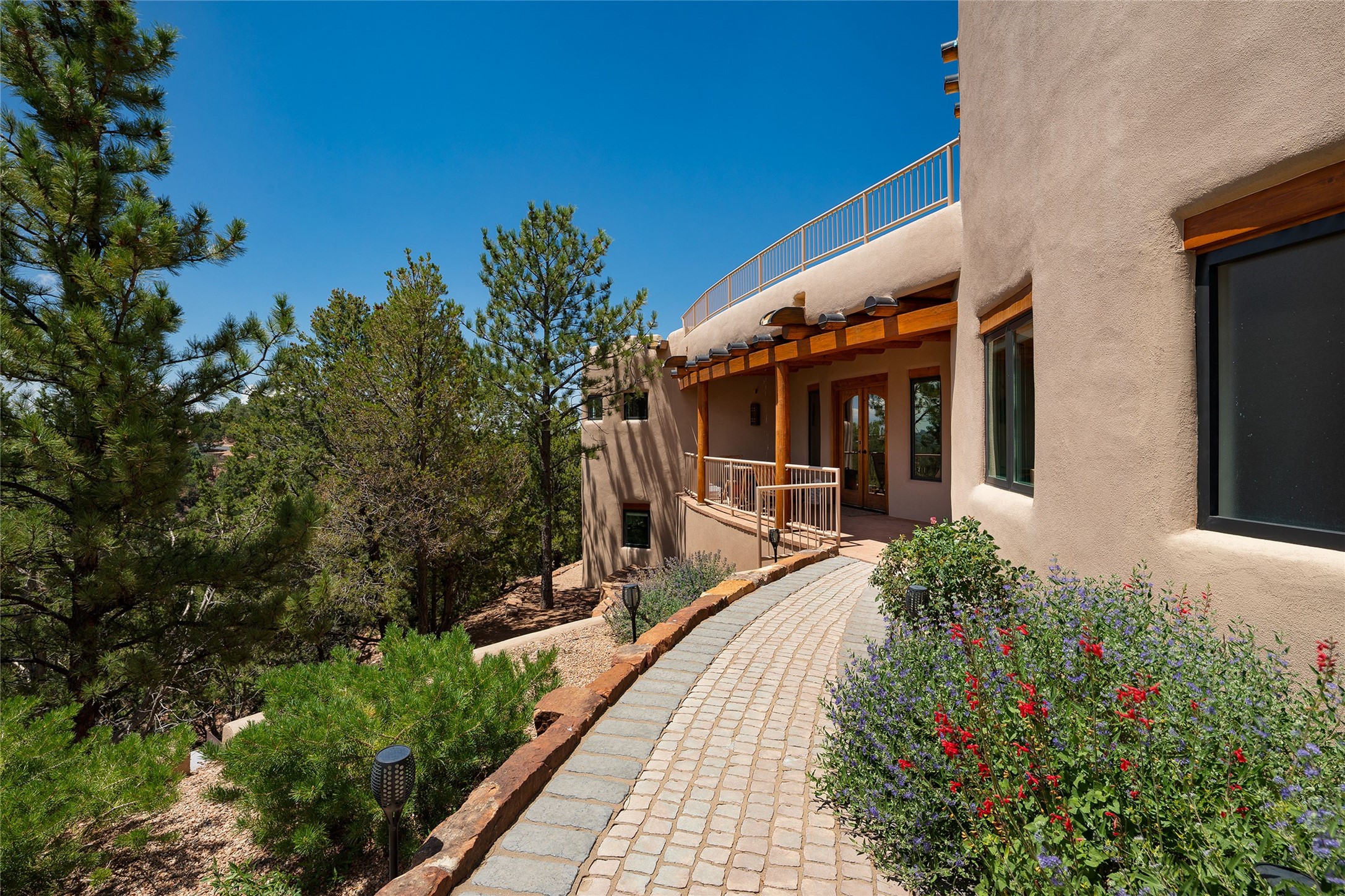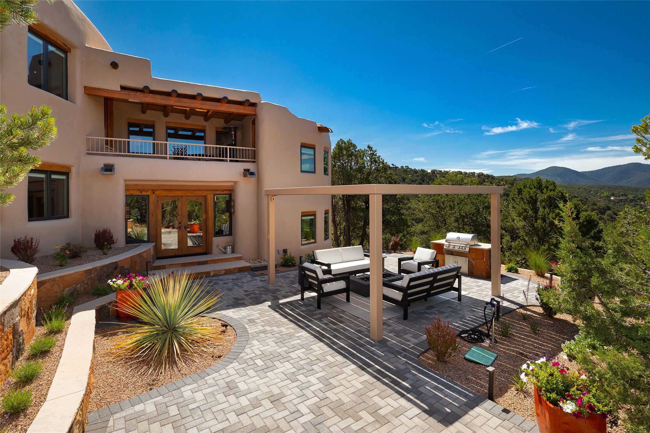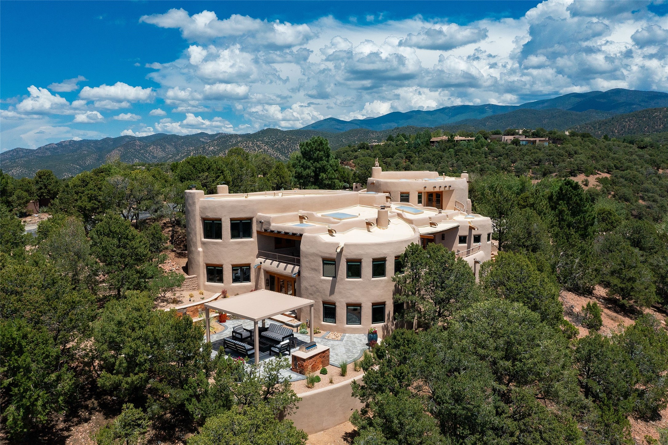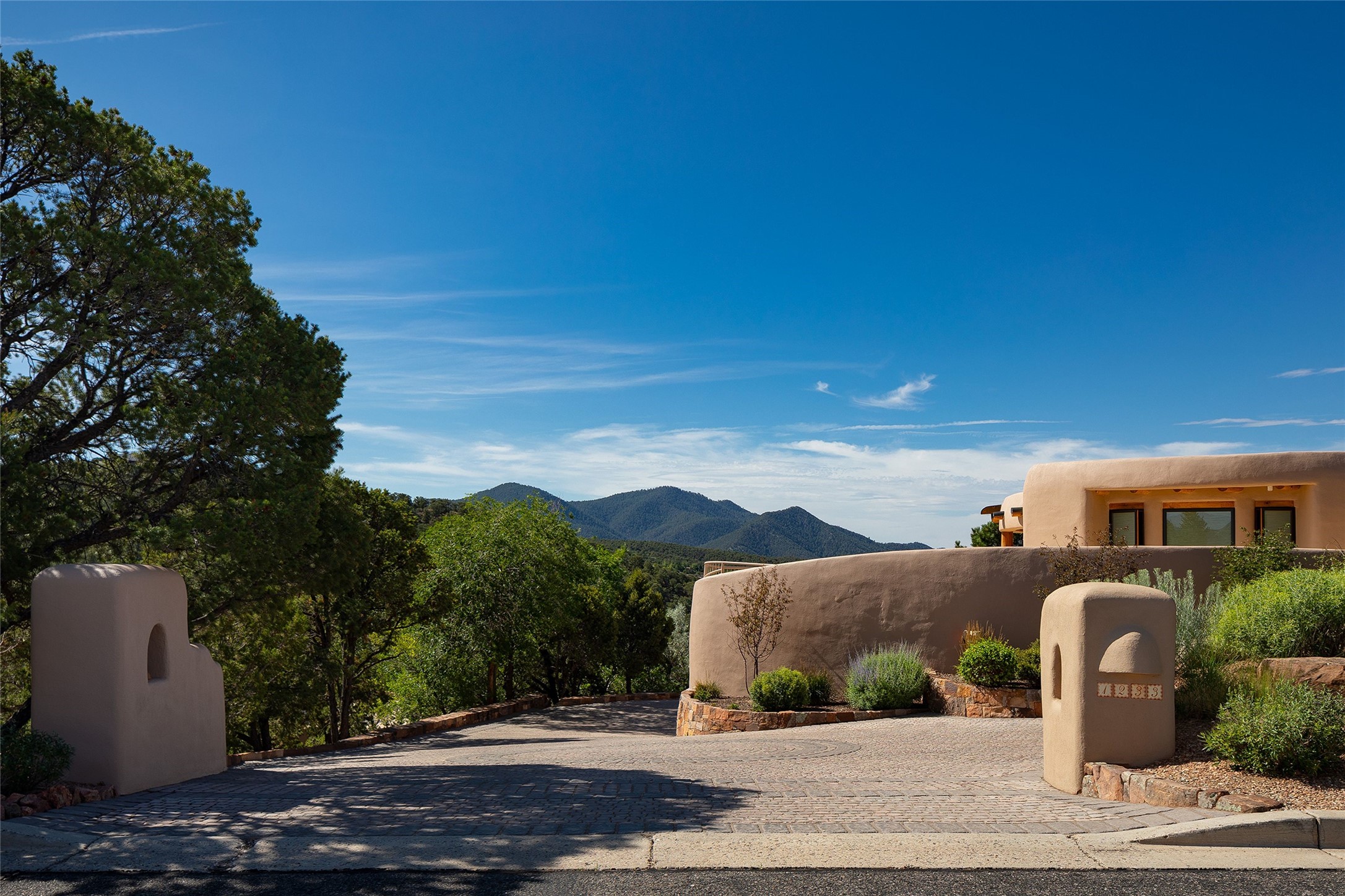 Welcome to 1233 North Summit Drive. One of the most extraordinary homes in all of Santa Fe, this captivating residence stuns with powerful architecture and majestic mountain views, and celebrates the ultimate Santa Fe lifestyle. Located within the coveted, private gates of the Santa Fe Summit, this 7,200 sq. ft. adobe residence is one of architect/builder Mike Fischer's most exceptional works. Built with uncompromising craftsmanship, the home blends timeless Santa Fe style with thoughtful modern updates--showcasing curved plaster walls, viga and beam ceilings, handcrafted fireplaces, and luxury finishes throughout. The main level is designed for entertaining, with spacious living and dining areas, while the upper floor is devoted to a private primary suite, complete with a luxurious bath, sitting room or office, and a rooftop deck that captures sweeping mountain views. Thoughtful updates include a 2018 kitchen renovation and a 2020 spa-like bath remodel, bringing modern elegance to traditional adobe design. The lower level offers excellent guest accommodations, with two bedrooms, two baths, and a large media/game room. A rare 4-car garage adds convenience and storage, while recent upgrades impress, such as new Pella windows, a TPO roof, and newly designed hardscape and lush, vibrant, surrounding landscape.From its perch at one of the highest residential elevations in Santa Fe, the home enjoys awe-inspiring panoramas of the Sangre de Cristo and Jemez ranges, the dramatic north face of Atalaya Mountain, and the north side of Picacho Peak. Multiple view decks and patios maximize the setting, while direct access to the Dale Ball Trail system makes outdoor adventure effortless. Just steps away from the world-class 10,000 Waves resort and spa, and only 3.5 miles from the Plaza, this incredible residence, sited in a tranquil, park-like setting, offers an unmatched blend of mountain living, privacy, and convenience, combined with architectural pedigree and modern upgrades.