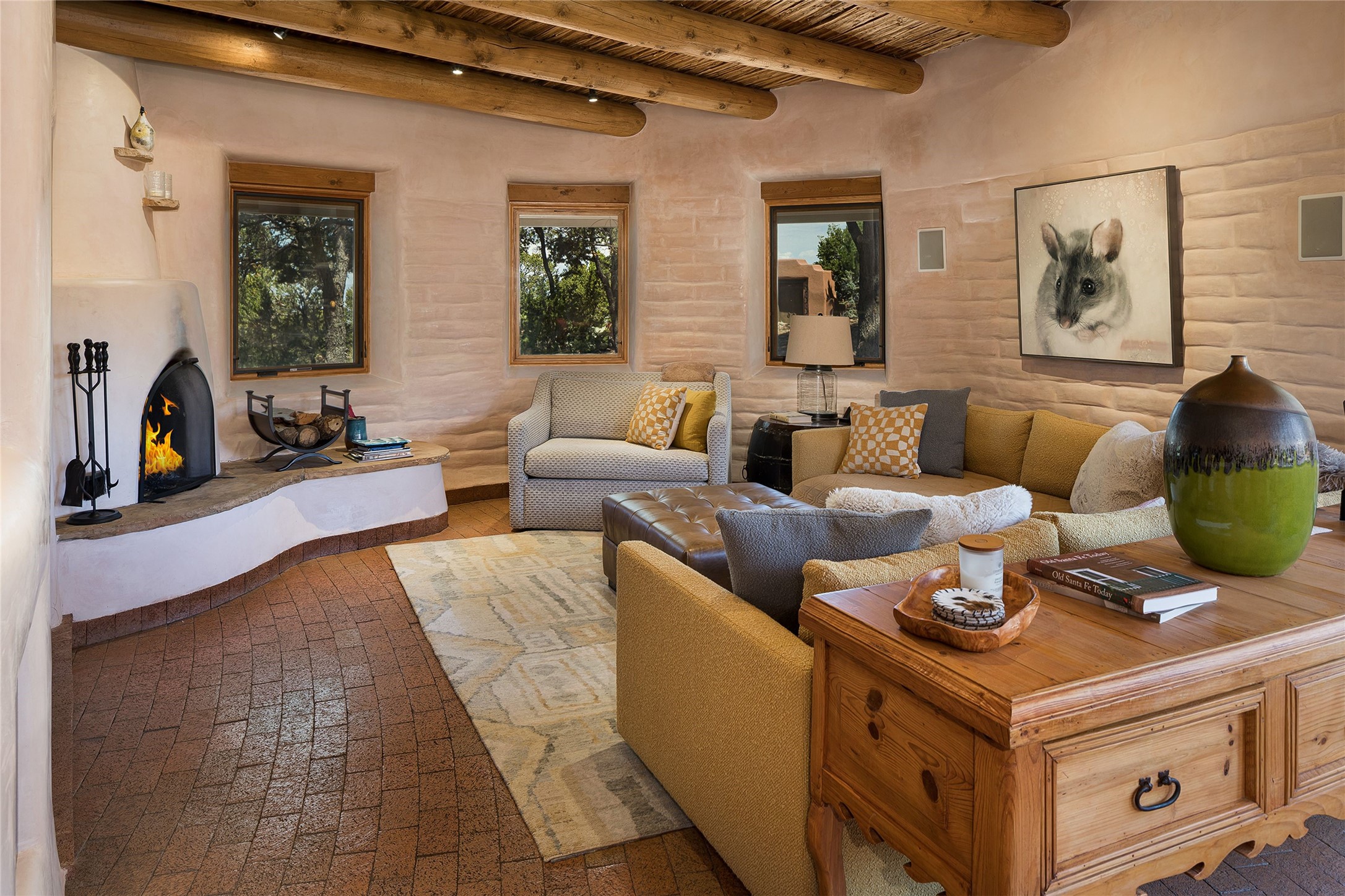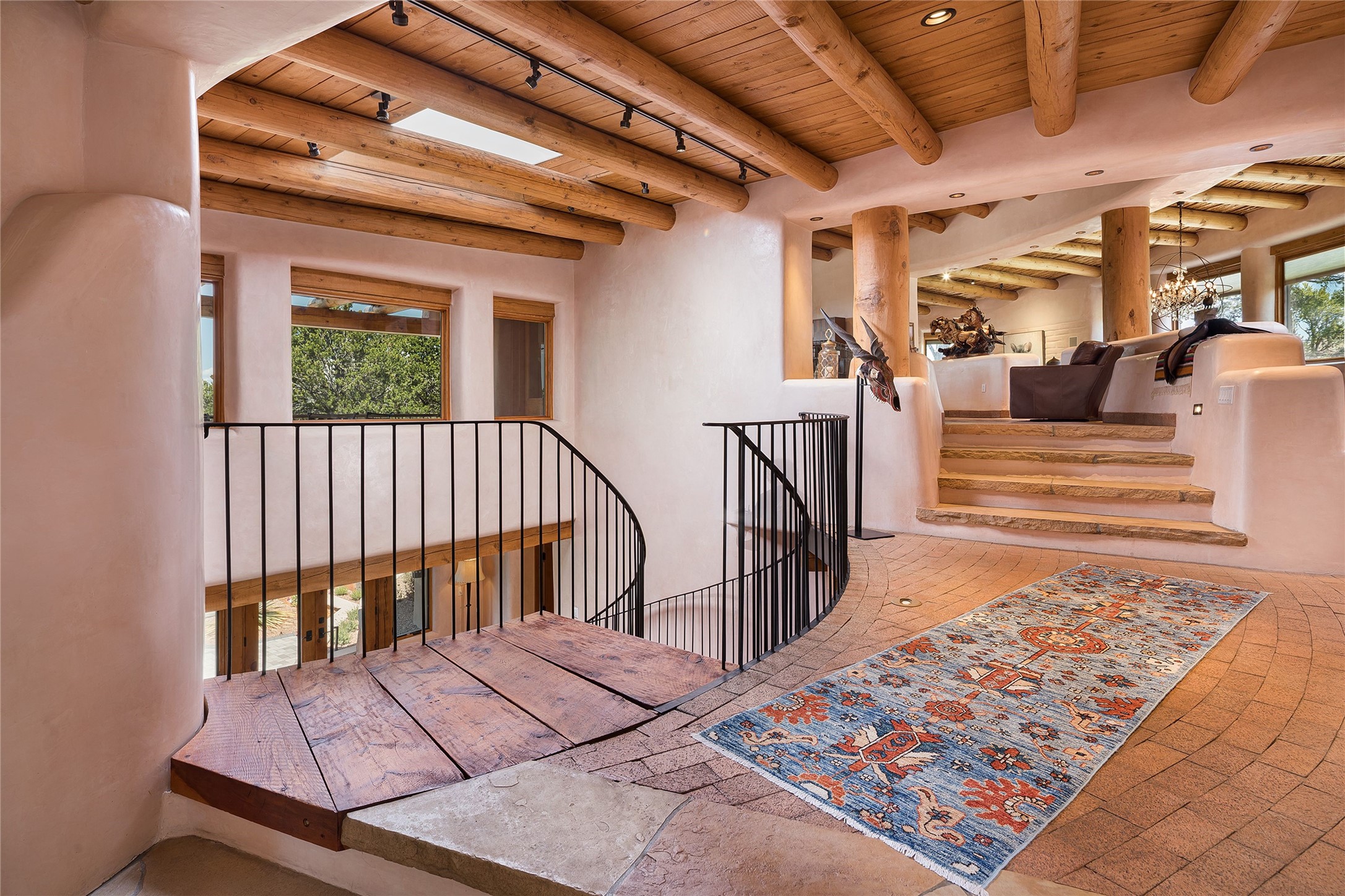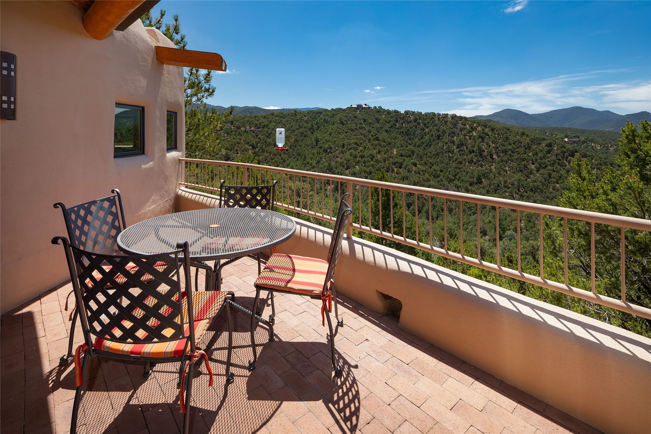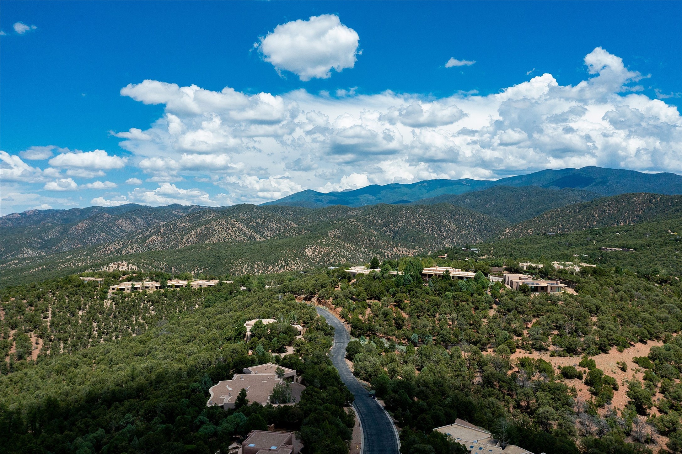 Welcome to 1233 North Summit Drive. One of the most extraordinary homes in all of Santa Fe, this captivating residence stuns with powerful architecture and majestic mountain views, and celebrates the ultimate Santa Fe lifestyle. Located within the coveted, private gates of the Santa Fe Summit, this 7,200 sq. ft. adobe residence is one of architect/builder Mike Fischer's most exceptional works. Built with uncompromising craftsmanship, the home blends timeless Santa Fe style with thoughtful modern updates--showcasing curved plaster walls, viga and beam ceilings, handcrafted fireplaces, and luxury finishes throughout. The main level is designed for entertaining, with spacious living and dining areas, while the upper floor is devoted to a private primary suite, complete with a luxurious bath, sitting room or office, and a rooftop deck that captures sweeping mountain views. Thoughtful updates include a 2018 kitchen renovation and a 2020 spa-like bath remodel, bringing modern elegance to traditional adobe design. The lower level offers excellent guest accommodations, with two bedrooms, two baths, and a large media/game room. A rare 4-car garage adds convenience and storage, while recent upgrades impress, such as new Pella windows, a TPO roof, and newly designed hardscape and lush, vibrant, surrounding landscape.From its perch at one of the highest residential elevations in Santa Fe, the home enjoys awe-inspiring panoramas of the Sangre de Cristo and Jemez ranges, the dramatic north face of Atalaya Mountain, and the north side of Picacho Peak. Multiple view decks and patios maximize the setting, while direct access to the Dale Ball Trail system makes outdoor adventure effortless. Just steps away from the world-class 10,000 Waves resort and spa, and only 3.5 miles from the Plaza, this incredible residence, sited in a tranquil, park-like setting, offers an unmatched blend of mountain living, privacy, and convenience, combined with architectural pedigree and modern upgrades.