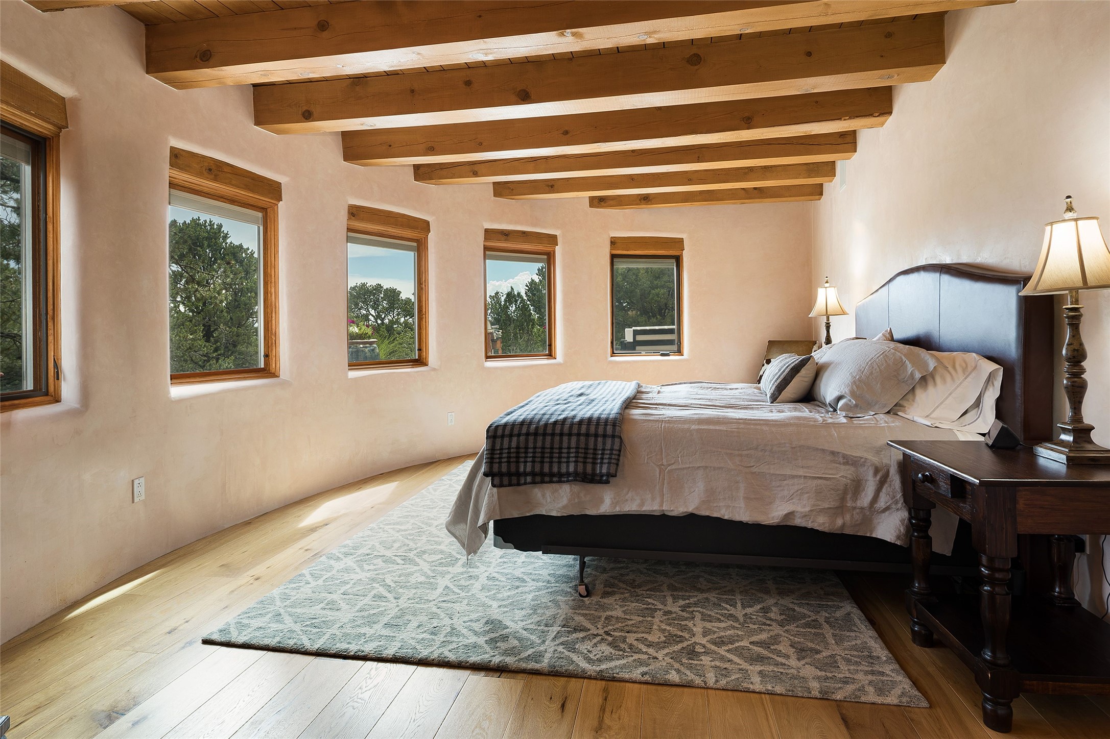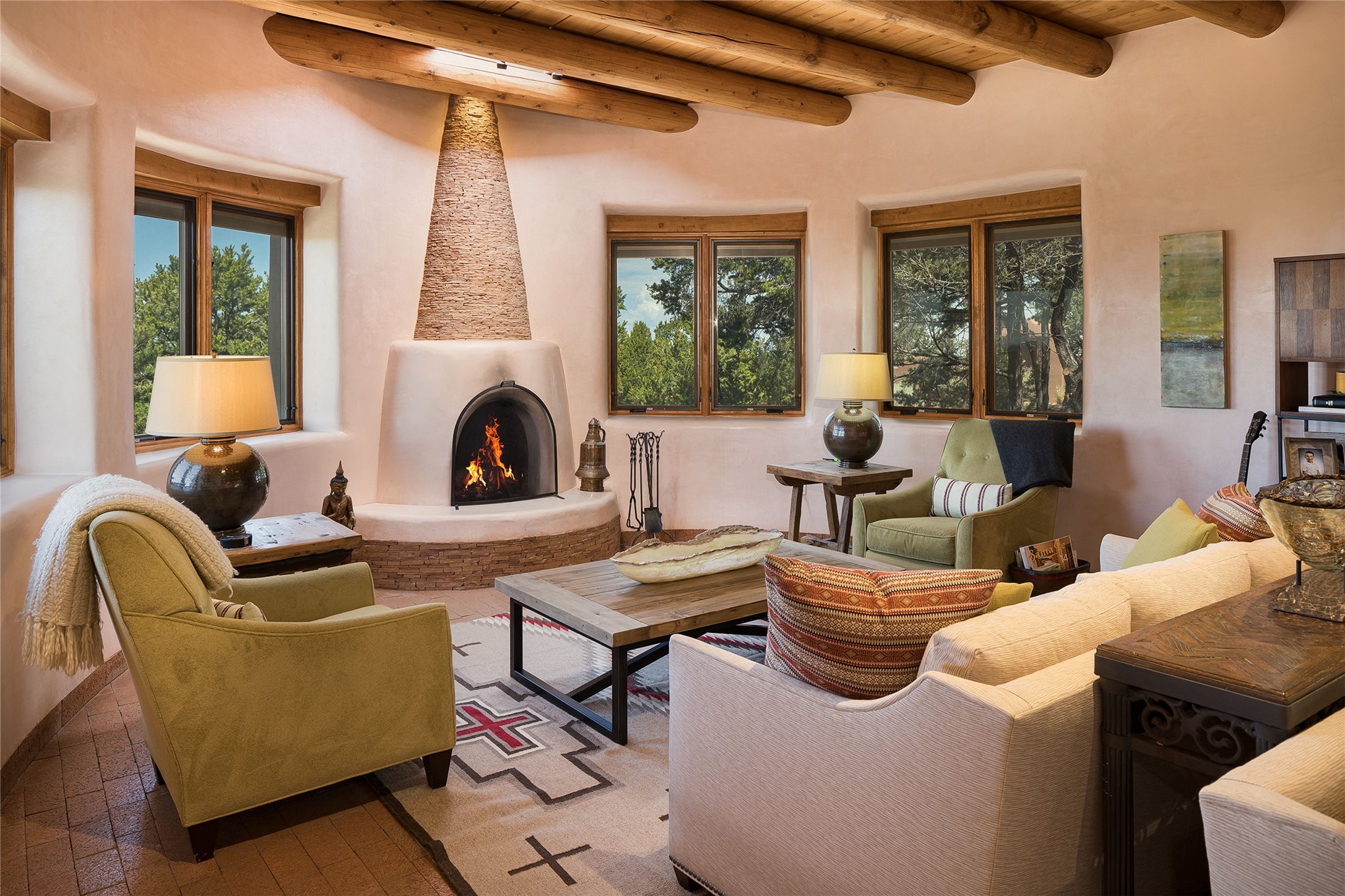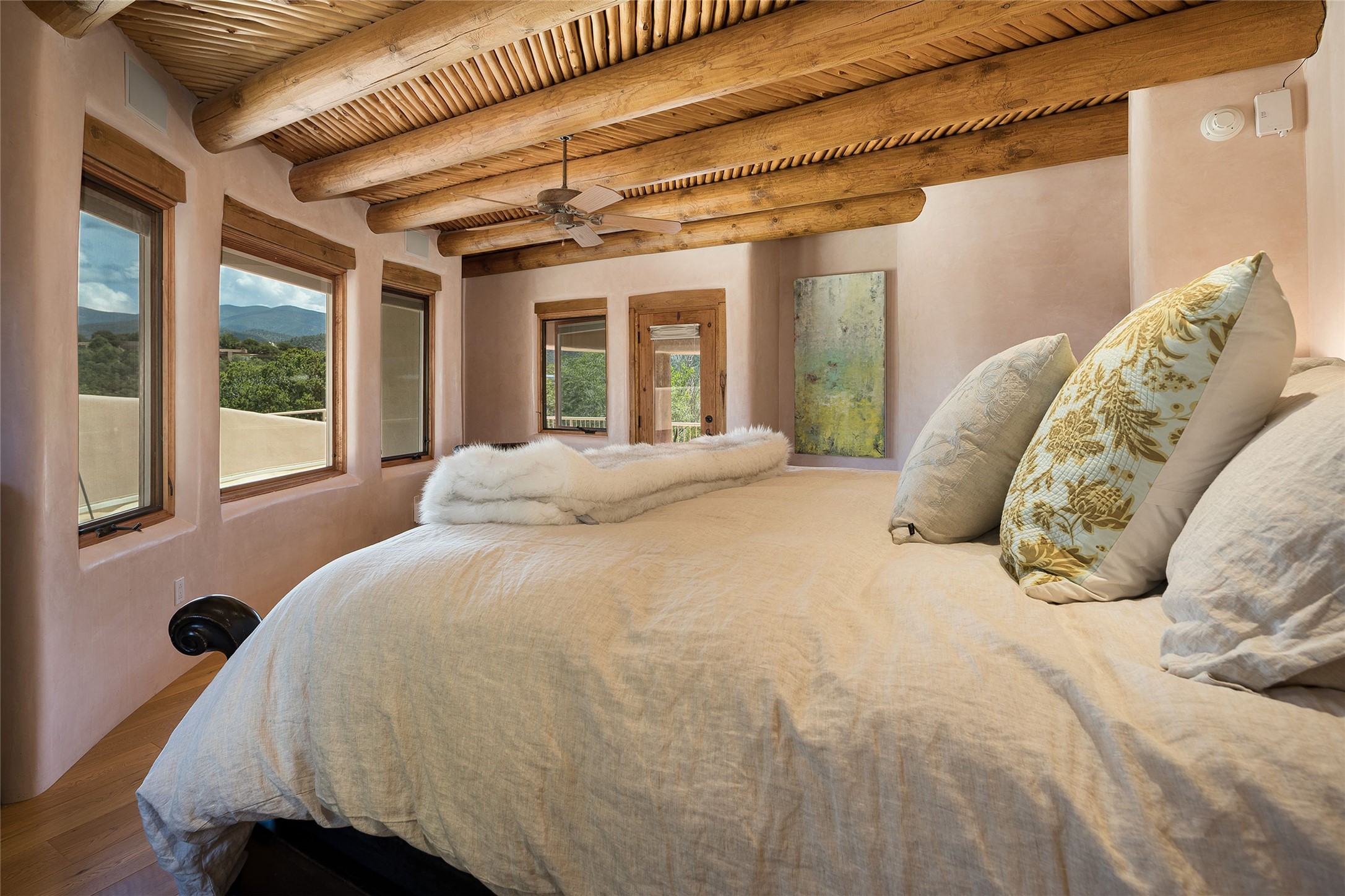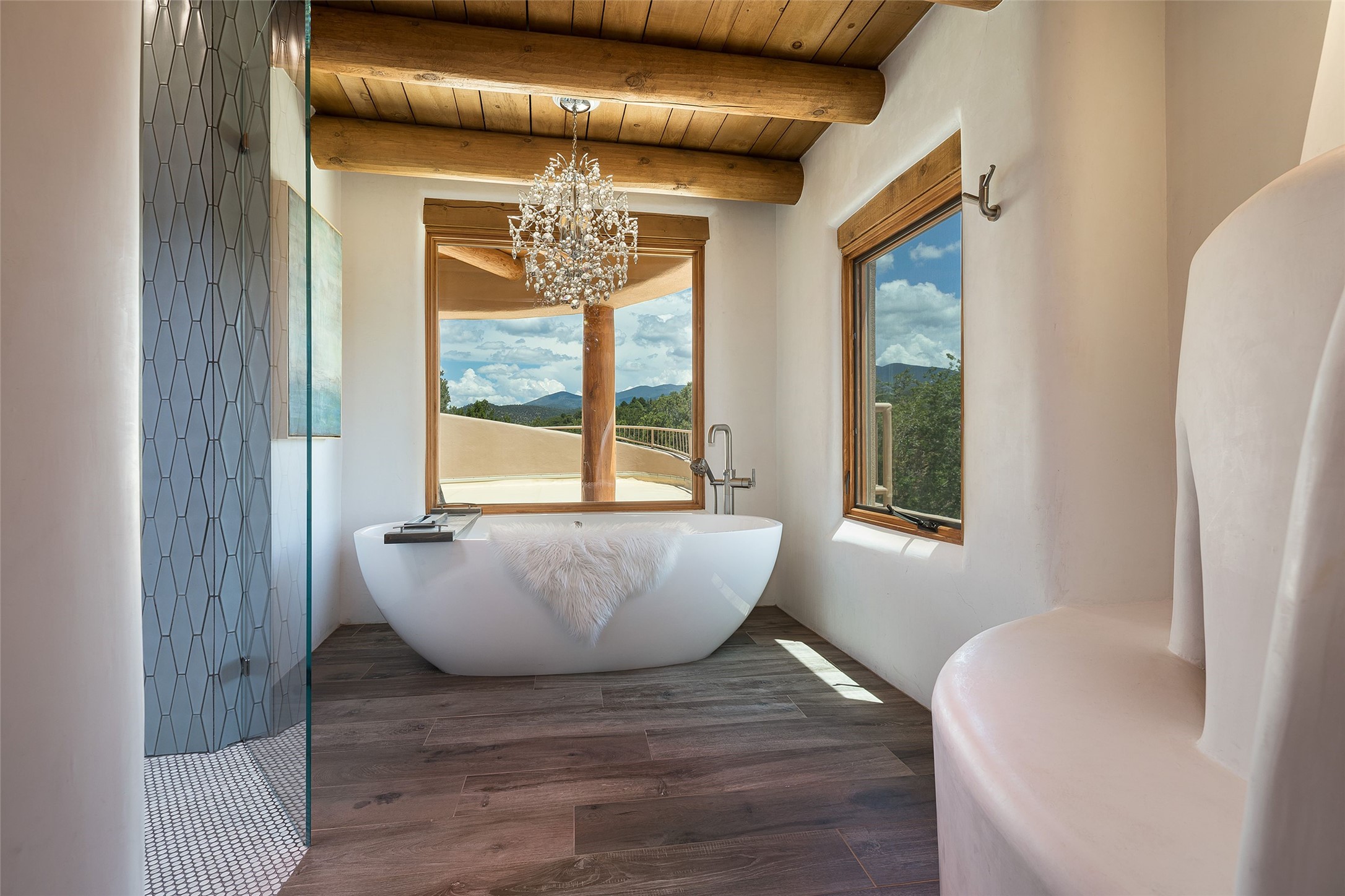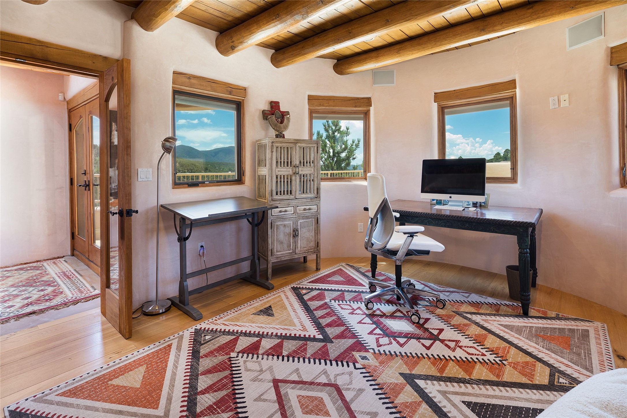 Welcome to 1233 North Summit Drive. One of the most extraordinary homes in all of Santa Fe, this captivating residence stuns with powerful architecture and majestic mountain views, and celebrates the ultimate Santa Fe lifestyle. Located within the coveted, private gates of the Santa Fe Summit, this 7,200 sq. ft. adobe residence is one of architect/builder Mike Fischer's most exceptional works. Built with uncompromising craftsmanship, the home blends timeless Santa Fe style with thoughtful modern updates--showcasing curved plaster walls, viga and beam ceilings, handcrafted fireplaces, and luxury finishes throughout. The main level is designed for entertaining, with spacious living and dining areas, while the upper floor is devoted to a private primary suite, complete with a luxurious bath, sitting room or office, and a rooftop deck that captures sweeping mountain views. Thoughtful updates include a 2018 kitchen renovation and a 2020 spa-like bath remodel, bringing modern elegance to traditional adobe design. The lower level offers excellent guest accommodations, with two bedrooms, two baths, and a large media/game room. A rare 4-car garage adds convenience and storage, while recent upgrades impress, such as new Pella windows, a TPO roof, and newly designed hardscape and lush, vibrant, surrounding landscape.From its perch at one of the highest residential elevations in Santa Fe, the home enjoys awe-inspiring panoramas of the Sangre de Cristo and Jemez ranges, the dramatic north face of Atalaya Mountain, and the north side of Picacho Peak. Multiple view decks and patios maximize the setting, while direct access to the Dale Ball Trail system makes outdoor adventure effortless. Just steps away from the world-class 10,000 Waves resort and spa, and only 3.5 miles from the Plaza, this incredible residence, sited in a tranquil, park-like setting, offers an unmatched blend of mountain living, privacy, and convenience, combined with architectural pedigree and modern upgrades.