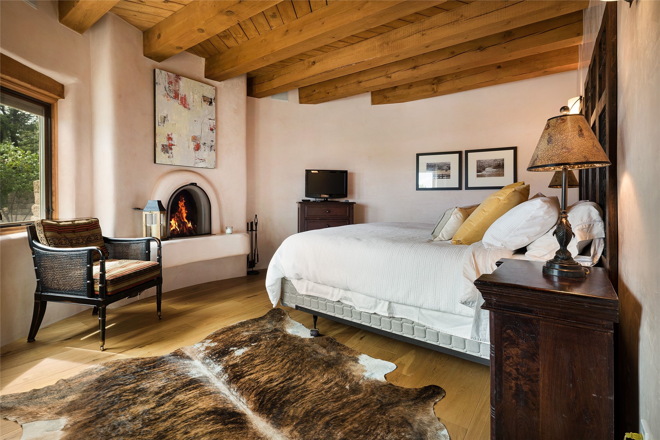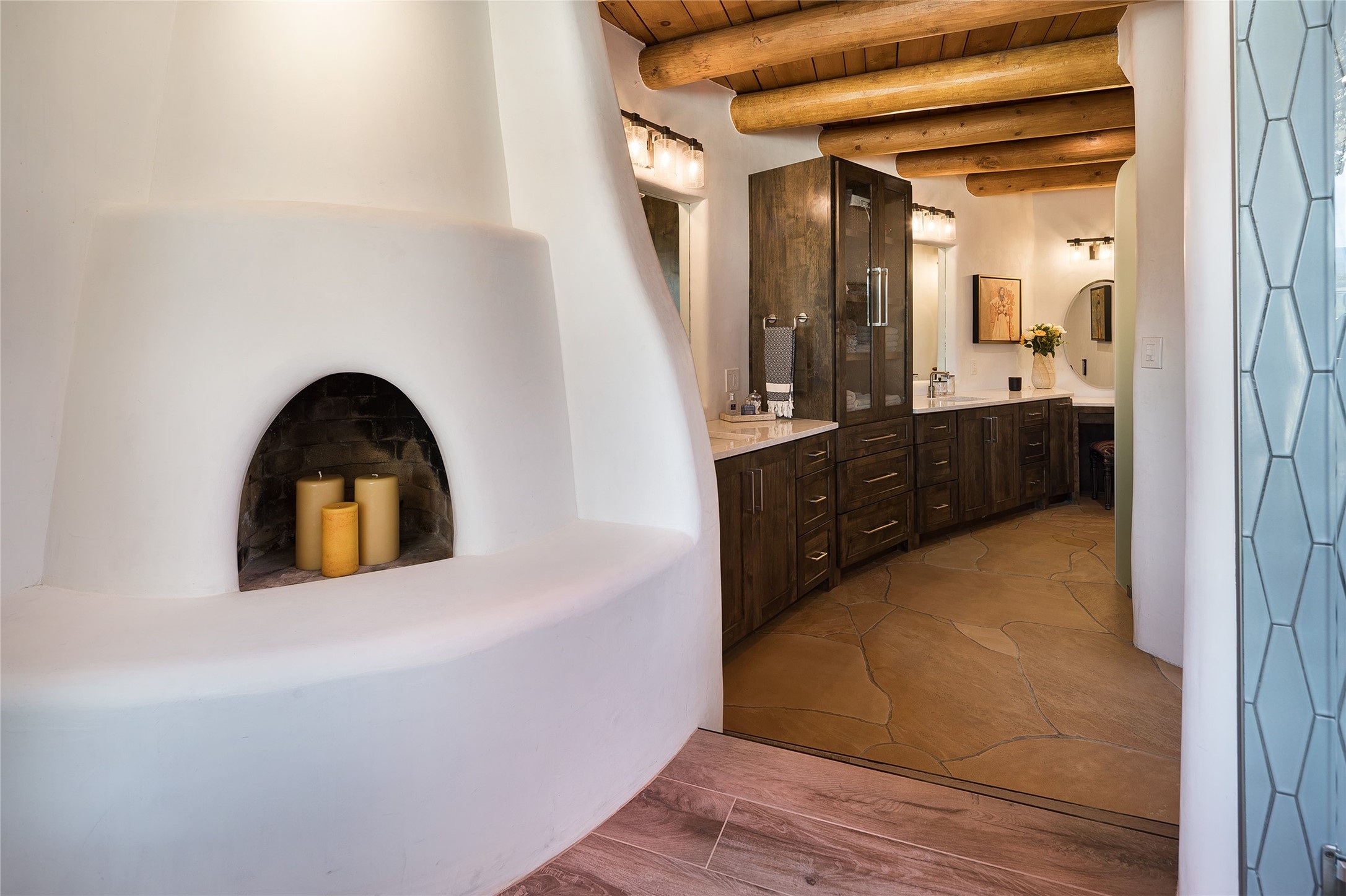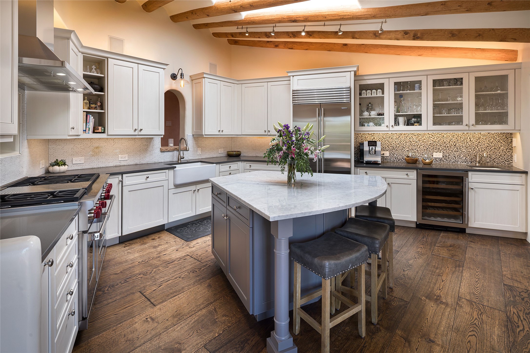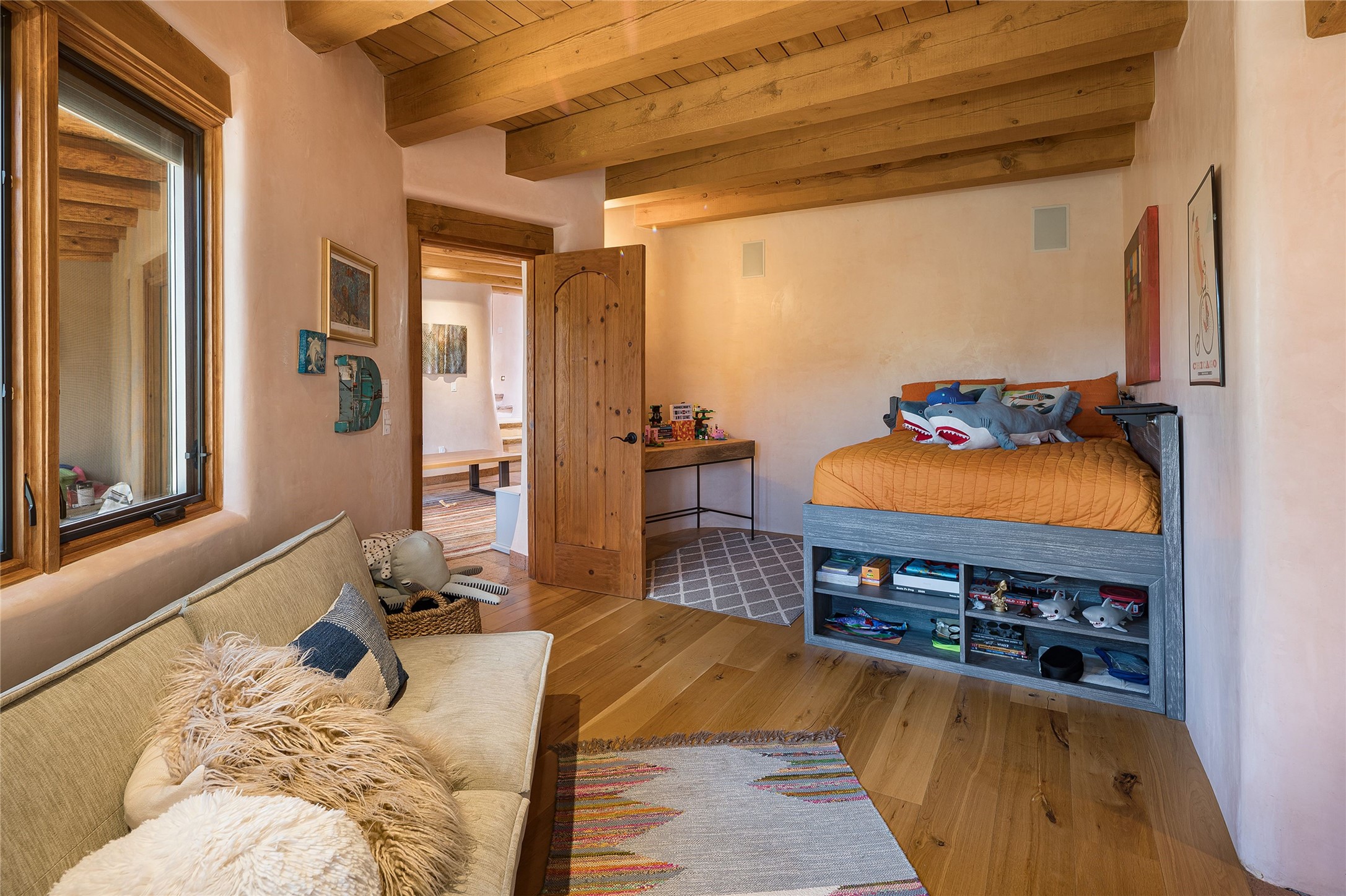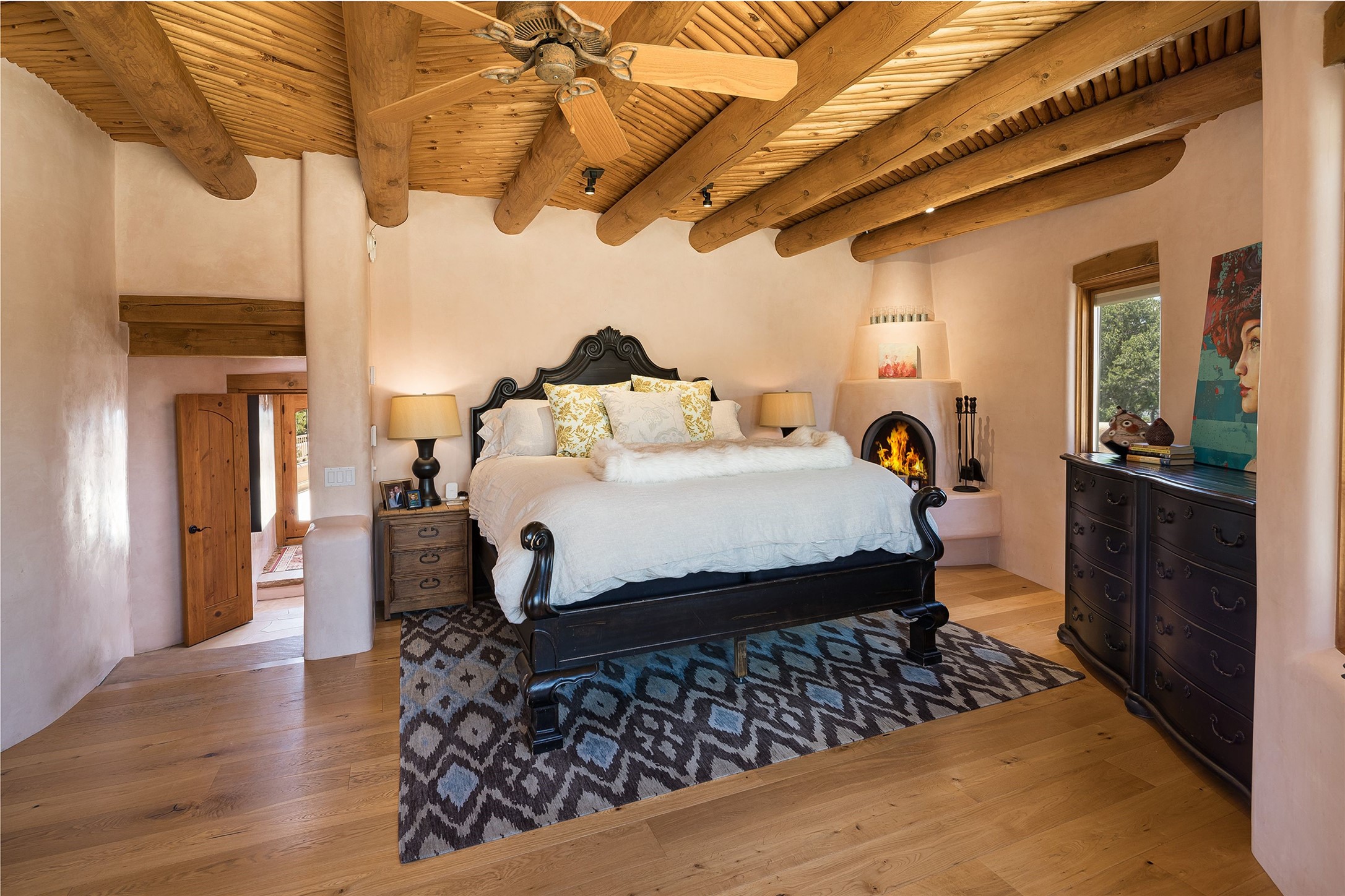 Welcome to 1233 North Summit Drive. One of the most extraordinary homes in all of Santa Fe, this captivating residence stuns with powerful architecture and majestic mountain views, and celebrates the ultimate Santa Fe lifestyle. Located within the coveted, private gates of the Santa Fe Summit, this 7,200 sq. ft. adobe residence is one of architect/builder Mike Fischer's most exceptional works. Built with uncompromising craftsmanship, the home blends timeless Santa Fe style with thoughtful modern updates--showcasing curved plaster walls, viga and beam ceilings, handcrafted fireplaces, and luxury finishes throughout. The main level is designed for entertaining, with spacious living and dining areas, while the upper floor is devoted to a private primary suite, complete with a luxurious bath, sitting room or office, and a rooftop deck that captures sweeping mountain views. Thoughtful updates include a 2018 kitchen renovation and a 2020 spa-like bath remodel, bringing modern elegance to traditional adobe design. The lower level offers excellent guest accommodations, with two bedrooms, two baths, and a large media/game room. A rare 4-car garage adds convenience and storage, while recent upgrades impress, such as new Pella windows, a TPO roof, and newly designed hardscape and lush, vibrant, surrounding landscape.From its perch at one of the highest residential elevations in Santa Fe, the home enjoys awe-inspiring panoramas of the Sangre de Cristo and Jemez ranges, the dramatic north face of Atalaya Mountain, and the north side of Picacho Peak. Multiple view decks and patios maximize the setting, while direct access to the Dale Ball Trail system makes outdoor adventure effortless. Just steps away from the world-class 10,000 Waves resort and spa, and only 3.5 miles from the Plaza, this incredible residence, sited in a tranquil, park-like setting, offers an unmatched blend of mountain living, privacy, and convenience, combined with architectural pedigree and modern upgrades.
