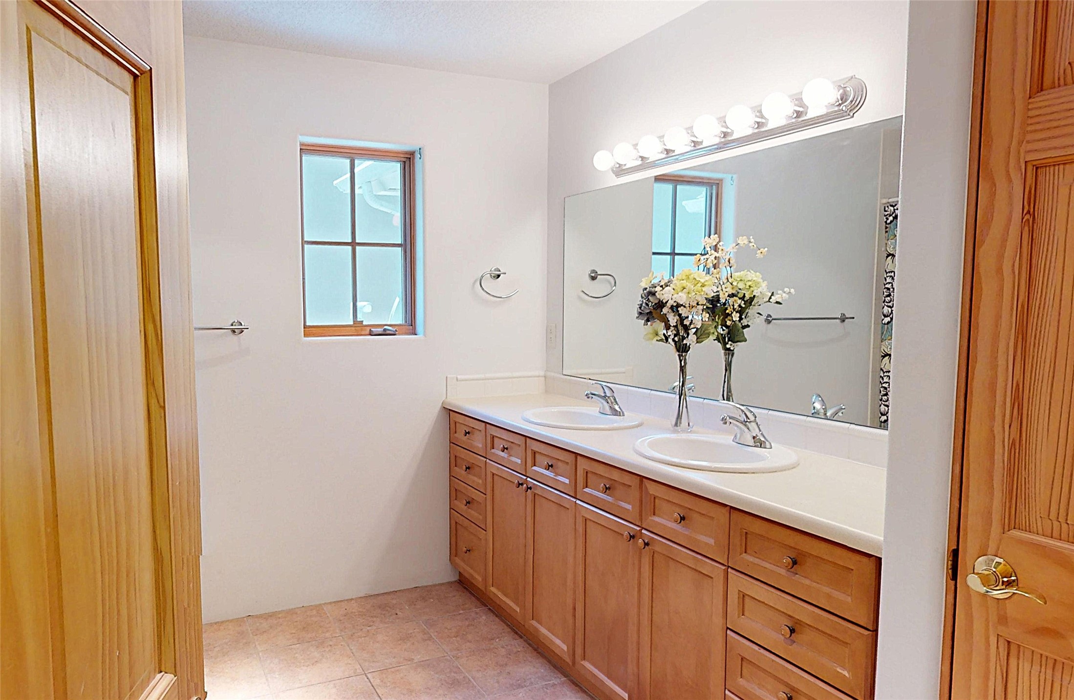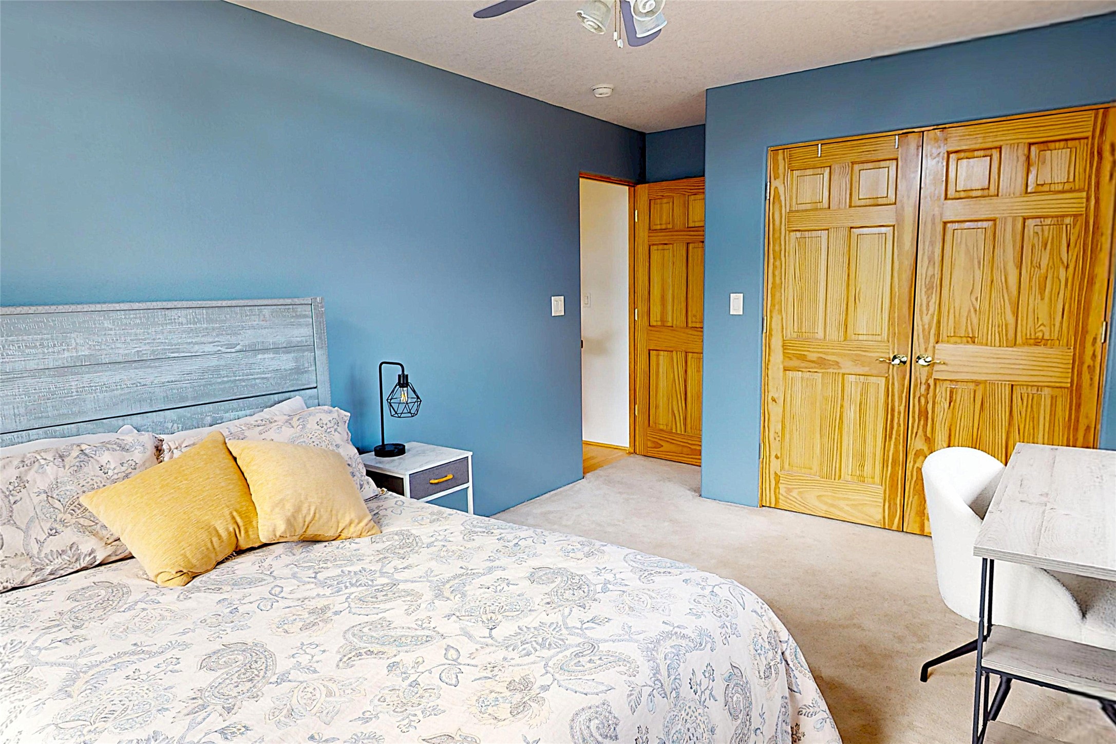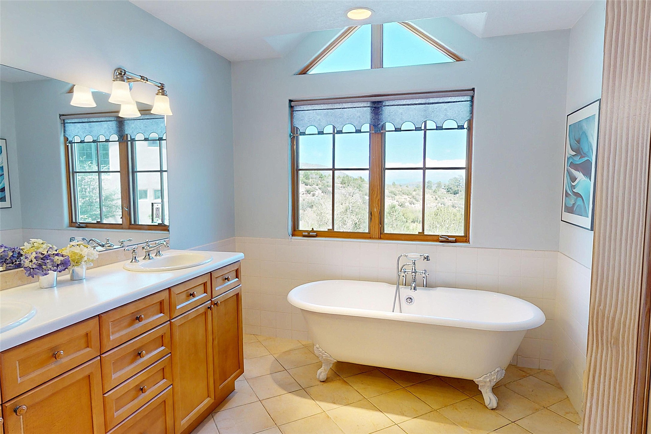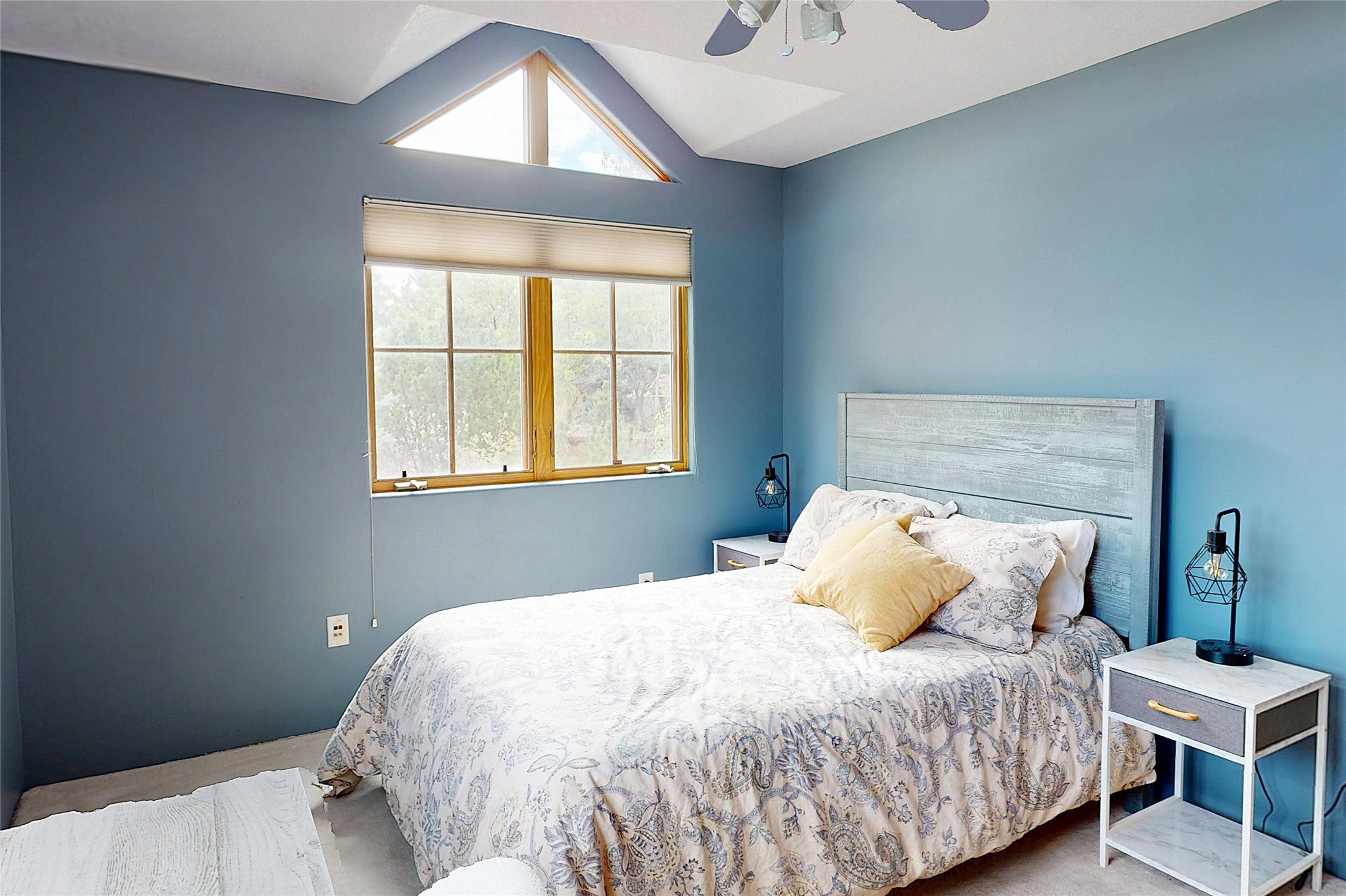 This stunning 4-bedroom, 2.5-bath Quemazon home backs to open space, offering privacy and direct access to the Perimeter Trail. The open floor plan flows seamlessly between the kitchen, dining, and living areas, with easy access to the covered Trex deck--perfect for enjoying mountain and forest views as well as the private backyard. The spacious primary suite includes a private study framed by French doors, dual walk-in closets, and a luxurious en-suite bath with dual sinks and a freestanding tub. Three additional bedrooms and a well-appointed hall bath complete the layout. A walk-out basement with additional living space and a crawl space for storage adds flexibility. Thoughtful details include architectural touches throughout the home, in-floor radiant heat with four zones, WindsorLite windows, six-panel wood doors, ceiling fans in every bedroom and the living room, track lighting, and Kohler fixtures. The kitchen is equipped with a Bosch dishwasher, gas stove/oven, and a newer refrigerator (2022). Major updates include roof replacement in 2009 with a lower-roof update in 2025, and a full stucco renovation in 2019. Outdoors, mature fruit trees--cherry, apple, pear, plum, apricot, nectarine, and peach--along with raspberries, drought-tolerant blue grama grass, and a private front yard with precision-cut stone walls, create a serene retreat. French drains along the west side provide peace of mind. This Quemazon gem blends comfort, thoughtful upgrades, and a premier setting with trails at your doorstep.