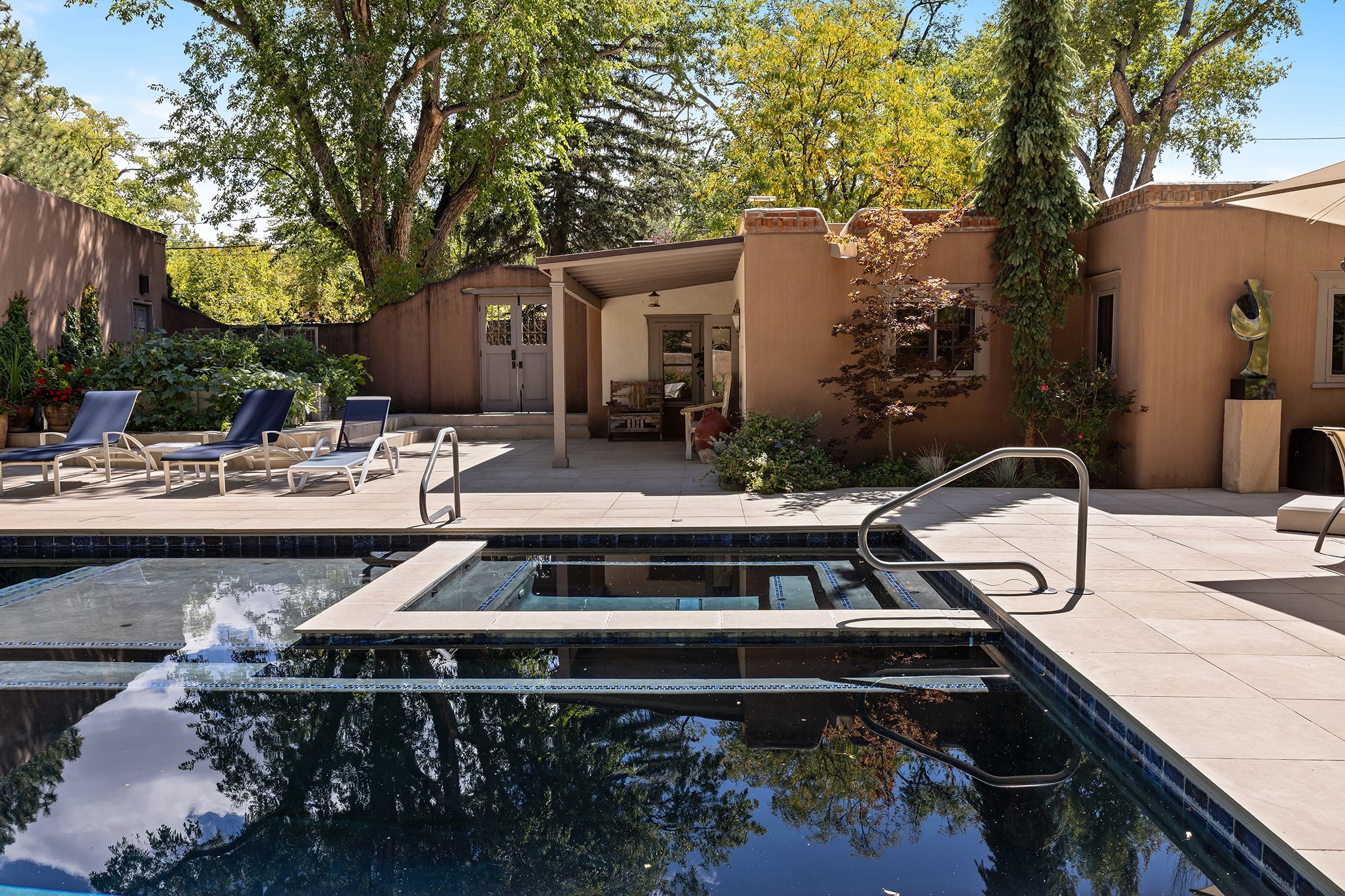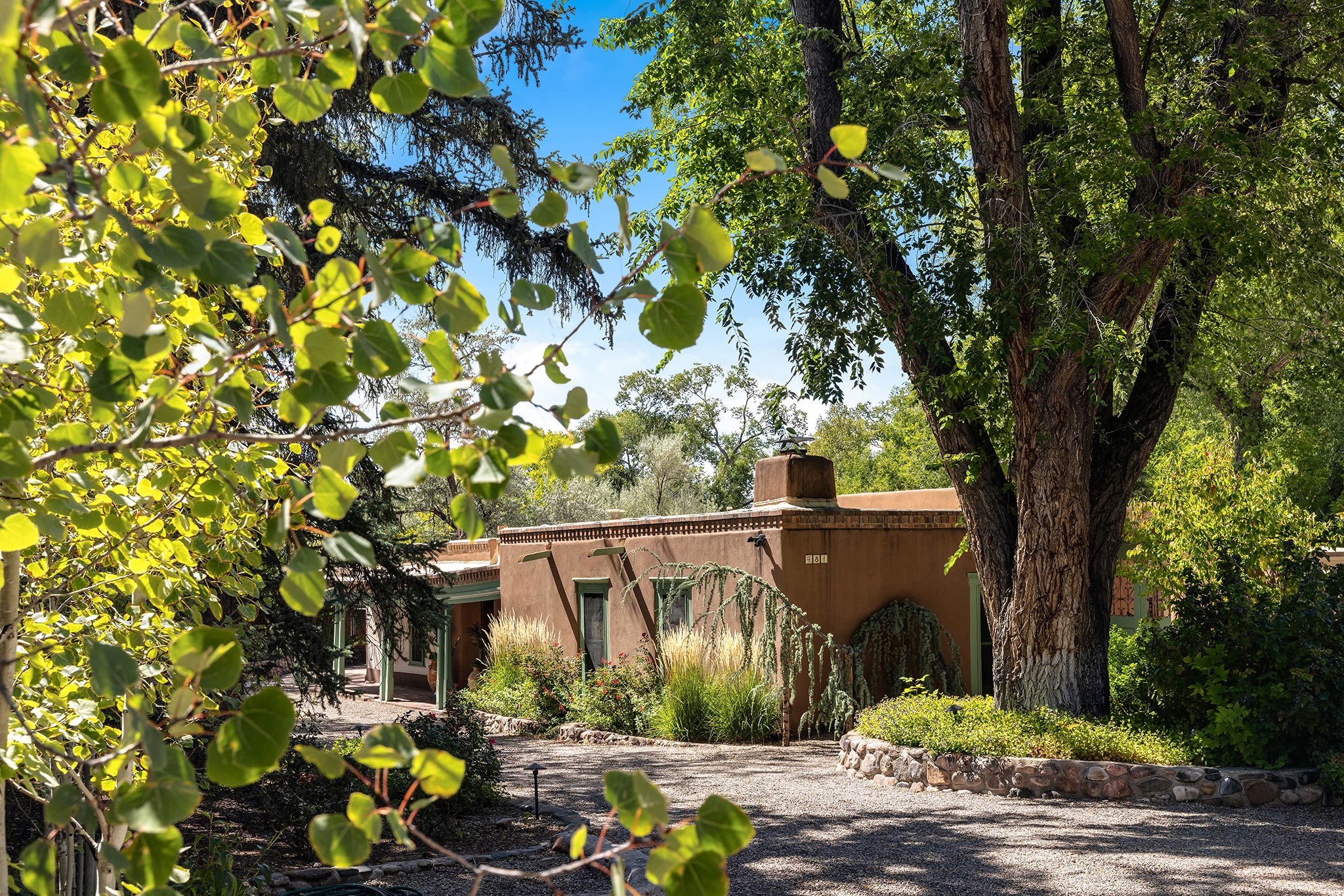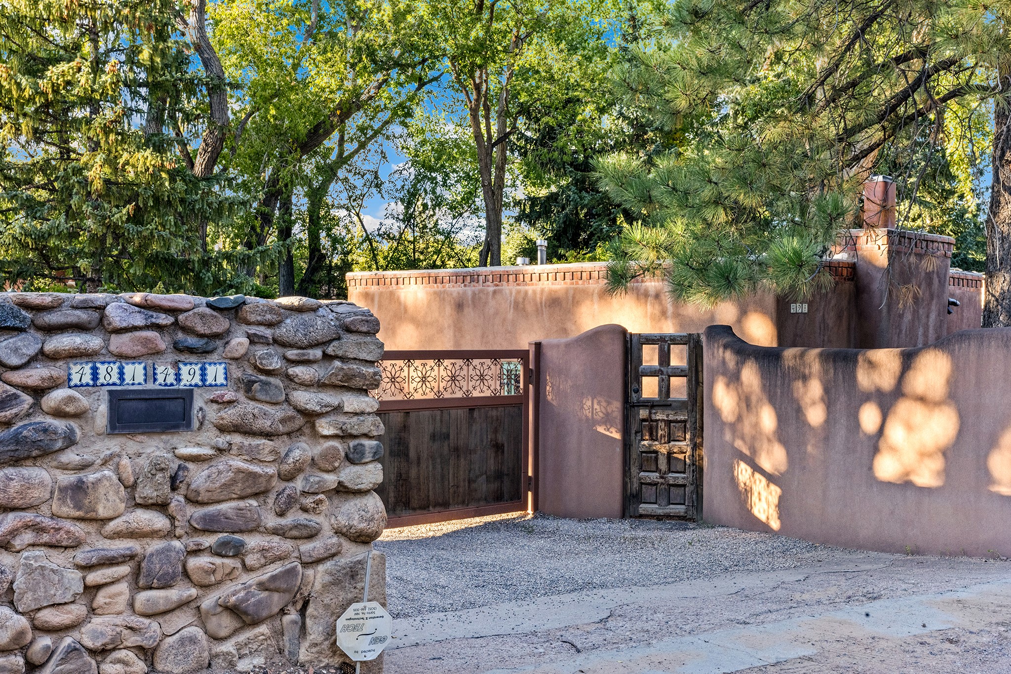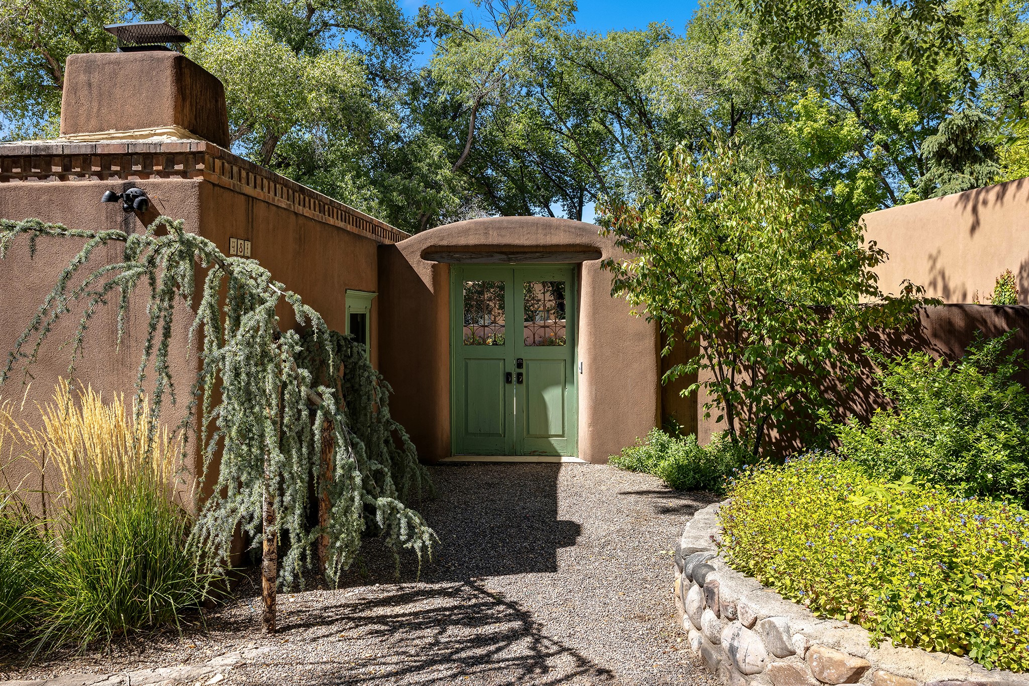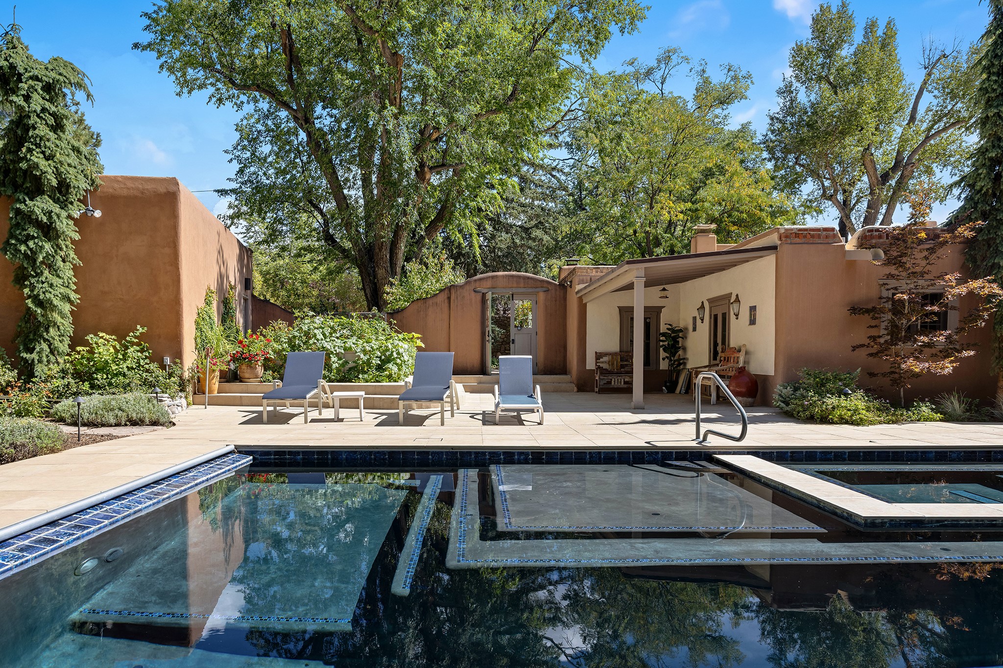 481 Arroyo Tenorio, behind an iconic stonewall in the heart of the Historic East side and the Acequia Madre runs through it! Tucked away and gated on a serene lane in the coveted Historic District is this enviable compound which blends traditional Santa Fe architecture with modern comforts. Thick plastered walls, vigas, coved ceilings, and multiple fireplaces create warmth and authenticity, while large windows and French doors invite abundant natural light. An elegantly designed pool, hot tub and extended outdoor living space and vegetable garden were added in 2022. The main house flexible floor plan offers gracious living and dining areas, a well-appointed kitchen, two private bedroom suites , additional guest bedroom , 2.5 baths office and media room. Perfect for full-time living or part time with privacy and security . The guest house features one bedroom , one bath , living area ,dining and kitchenette. Outdoor living is equally inviting, with lush, landscaped gardens, flagstone patios, and shaded portals ideal for entertaining or quiet retreat.Just moments from Canyon Road, the Plaza, and some of Santa Fe's finest restaurants and galleries, around the corner from famous local Downtown Subscription coffee shop and Garcia Street Books. This home provides the perfect balance of privacy and proximity. A rare opportunity to own a classic East side property in one of the city's most sought-after neighborhoods.