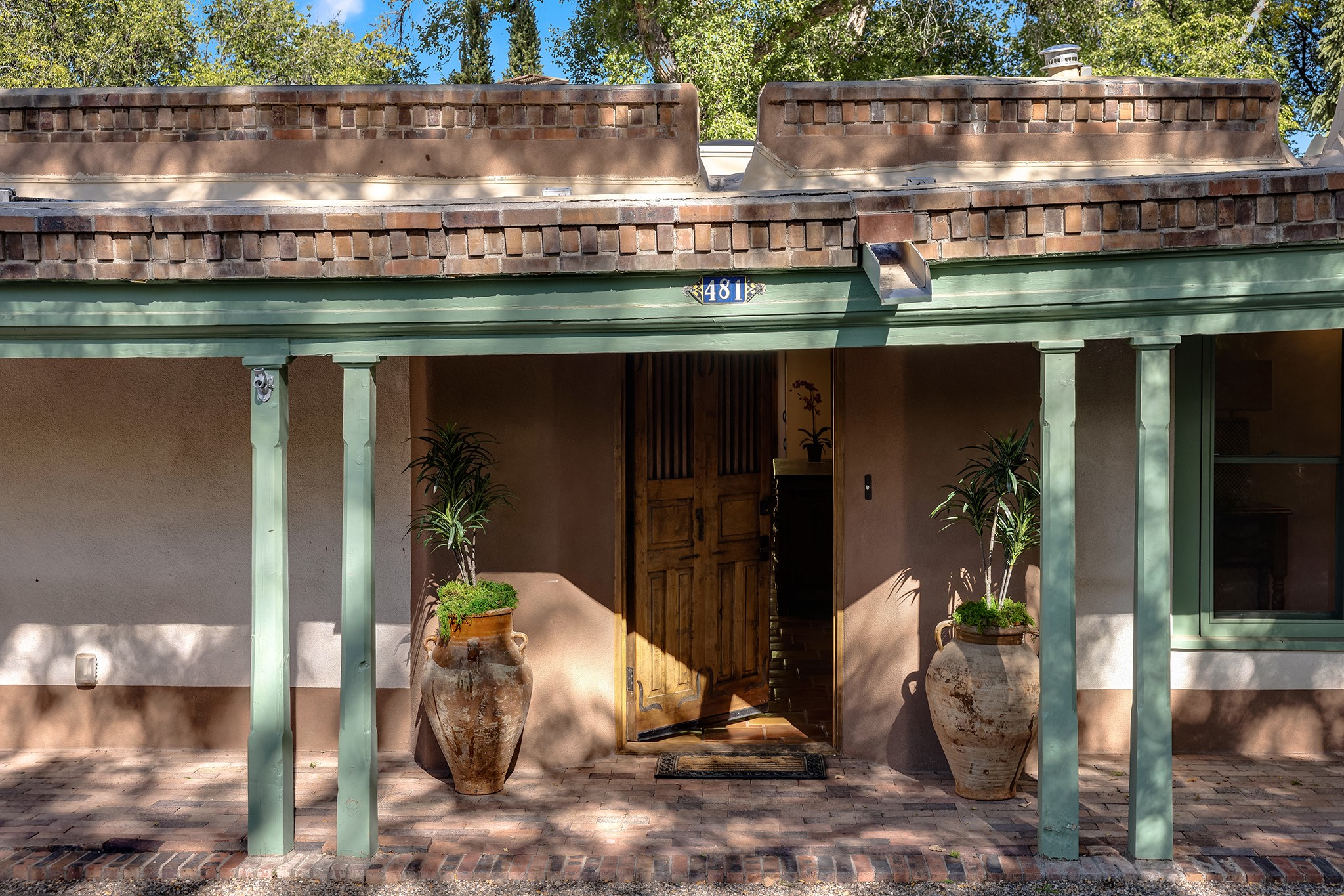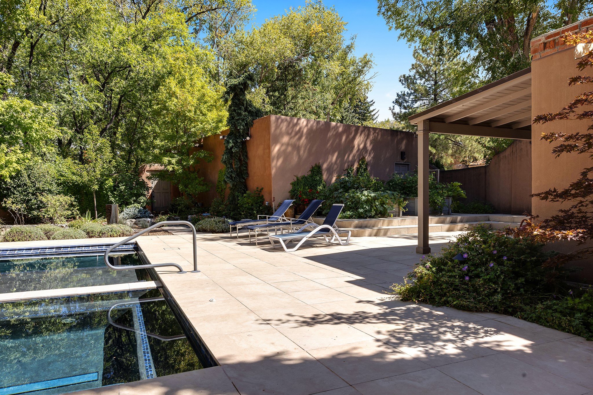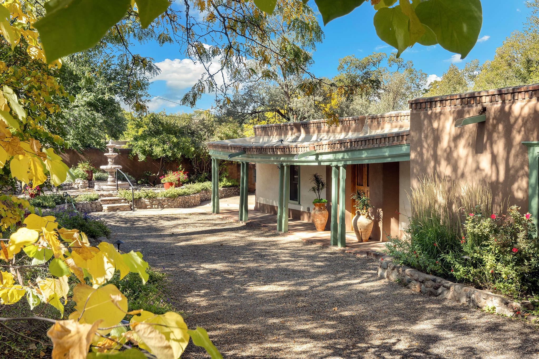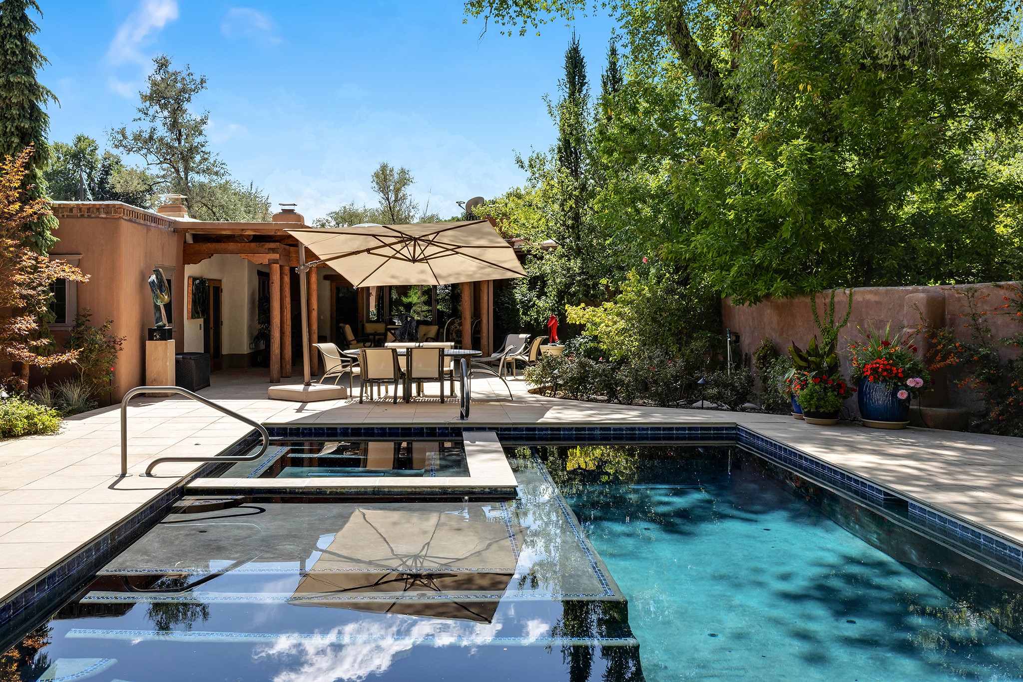 481 Arroyo Tenorio, behind an iconic stonewall in the heart of the Historic East side and the Acequia Madre runs through it! Tucked away and gated on a serene lane in the coveted Historic District is this enviable compound which blends traditional Santa Fe architecture with modern comforts. Thick plastered walls, vigas, coved ceilings, and multiple fireplaces create warmth and authenticity, while large windows and French doors invite abundant natural light. An elegantly designed pool, hot tub and extended outdoor living space and vegetable garden were added in 2022. The main house flexible floor plan offers gracious living and dining areas, a well-appointed kitchen, two private bedroom suites , additional guest bedroom , 2.5 baths office and media room. Perfect for full-time living or part time with privacy and security . The guest house features one bedroom , one bath , living area ,dining and kitchenette. Outdoor living is equally inviting, with lush, landscaped gardens, flagstone patios, and shaded portals ideal for entertaining or quiet retreat.Just moments from Canyon Road, the Plaza, and some of Santa Fe's finest restaurants and galleries, around the corner from famous local Downtown Subscription coffee shop and Garcia Street Books. This home provides the perfect balance of privacy and proximity. A rare opportunity to own a classic East side property in one of the city's most sought-after neighborhoods.