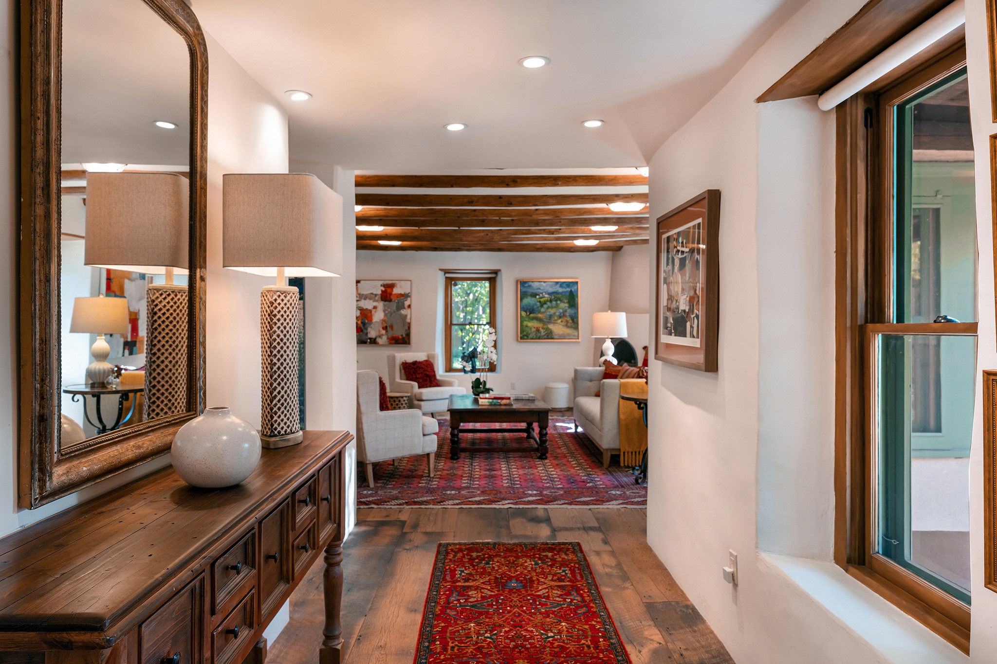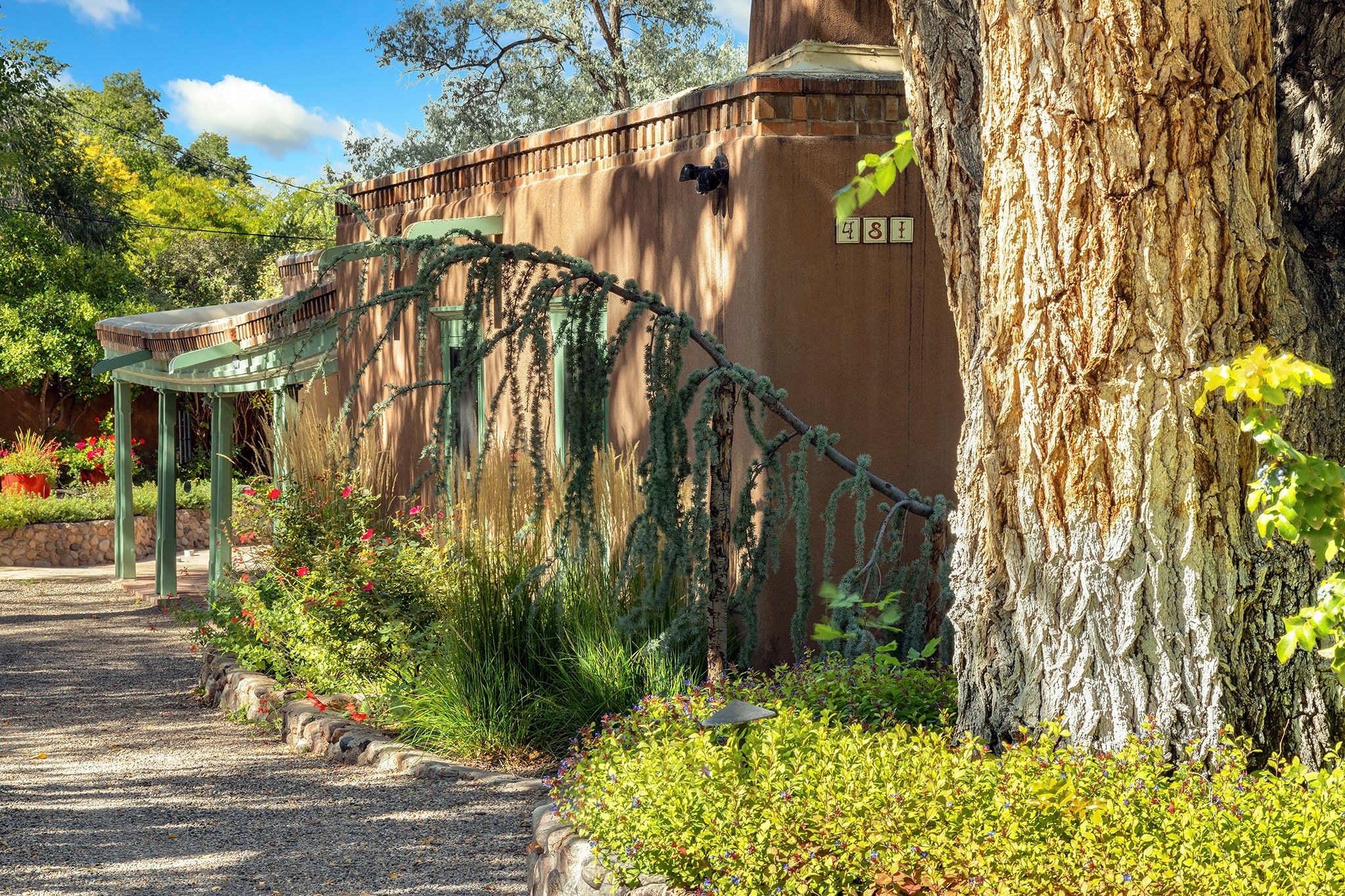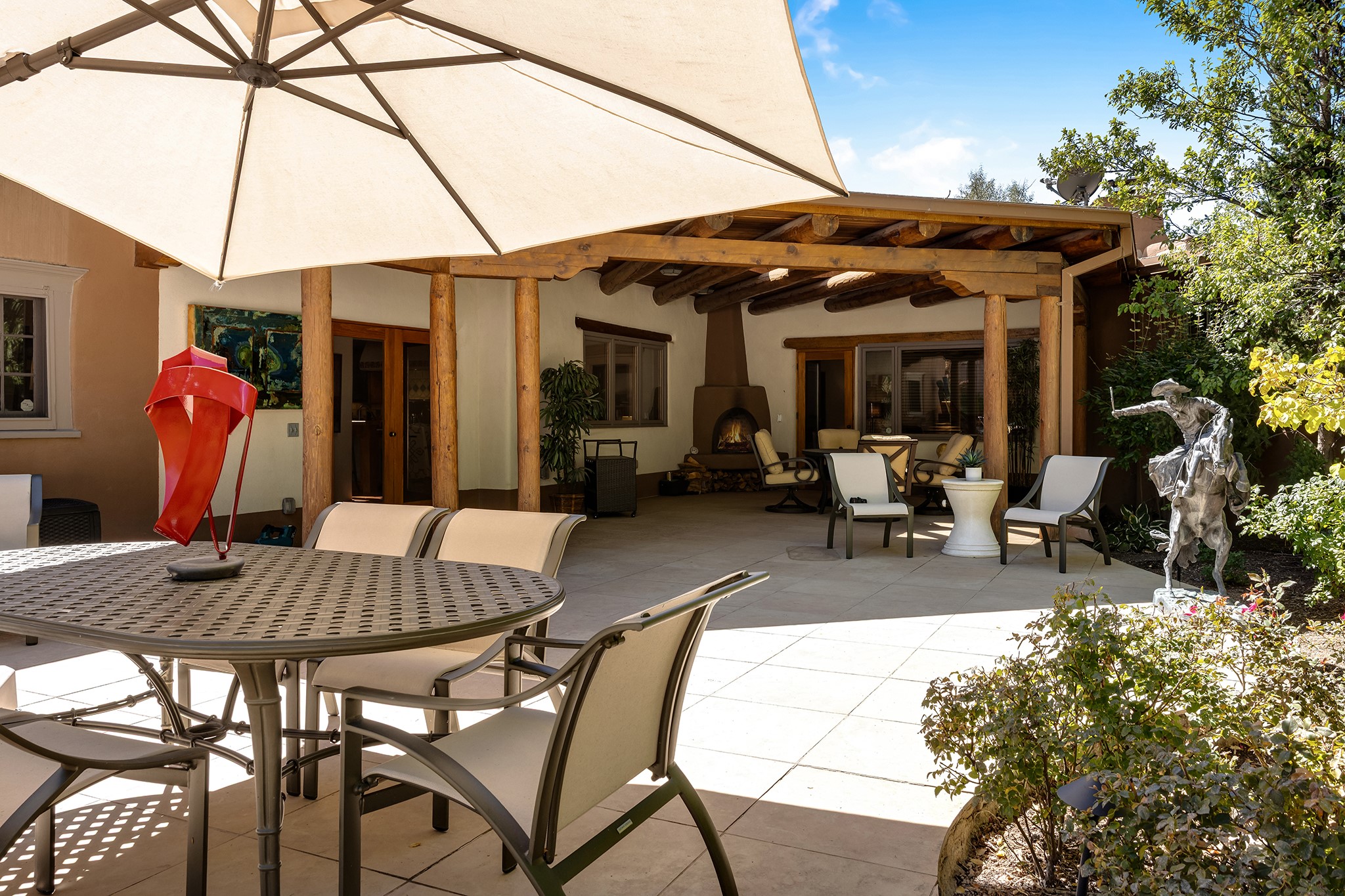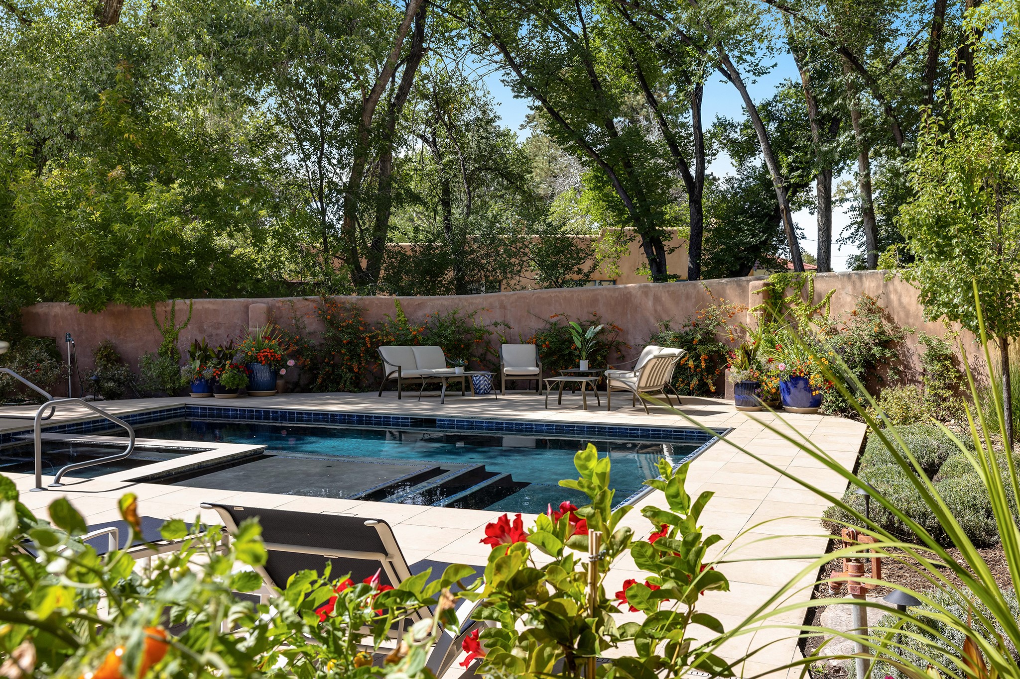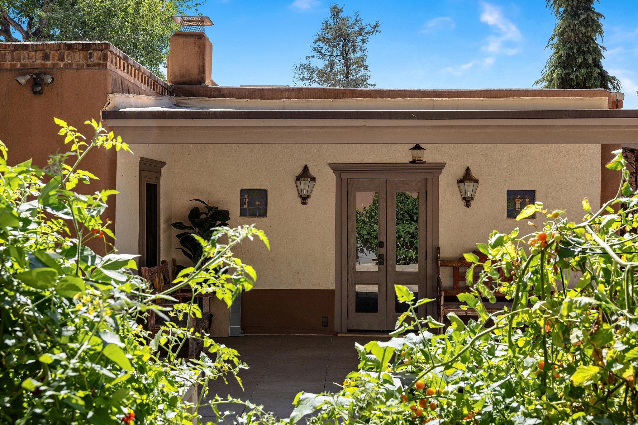481 Arroyo Tenorio, behind an iconic stonewall in the heart of the Historic East side and the Acequia Madre runs through it! Tucked away and gated on a serene lane in the coveted Historic District is this enviable compound which blends traditional Santa Fe architecture with modern comforts. Thick plastered walls, vigas, coved ceilings, and multiple fireplaces create warmth and authenticity, while large windows and French doors invite abundant natural light. An elegantly designed pool, hot tub and extended outdoor living space and vegetable garden were added in 2022. The main house flexible floor plan offers gracious living and dining areas, a well-appointed kitchen, two private bedroom suites , additional guest bedroom , 2.5 baths office and media room. Perfect for full-time living or part time with privacy and security . The guest house features one bedroom , one bath , living area ,dining and kitchenette. Outdoor living is equally inviting, with lush, landscaped gardens, flagstone patios, and shaded portals ideal for entertaining or quiet retreat.Just moments from Canyon Road, the Plaza, and some of Santa Fe's finest restaurants and galleries, around the corner from famous local Downtown Subscription coffee shop and Garcia Street Books. This home provides the perfect balance of privacy and proximity. A rare opportunity to own a classic East side property in one of the city's most sought-after neighborhoods.