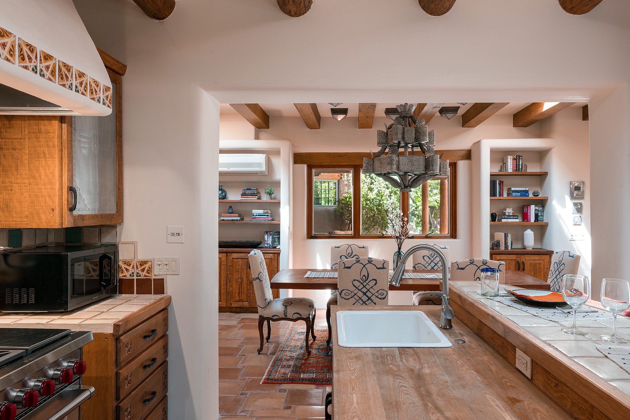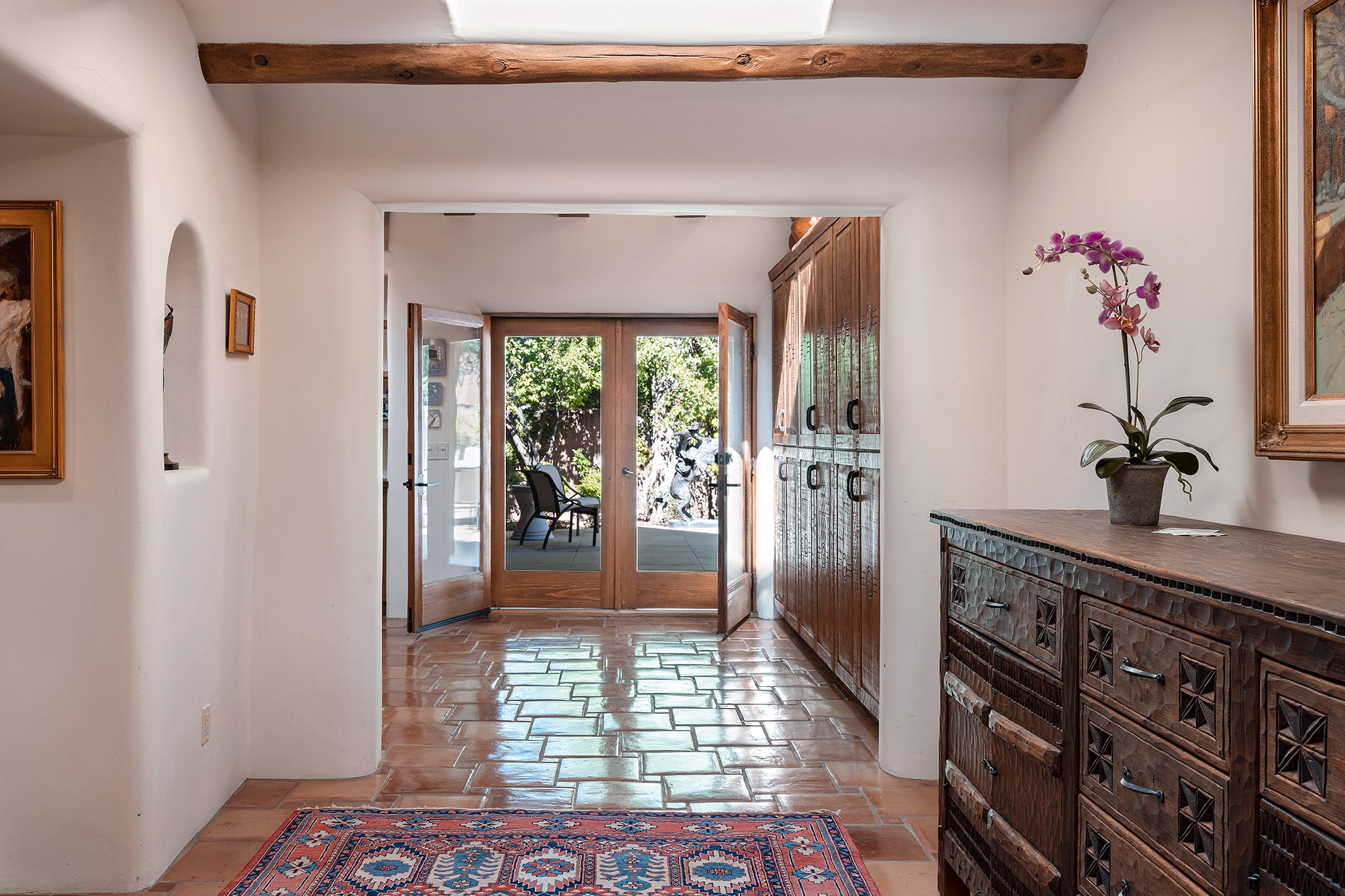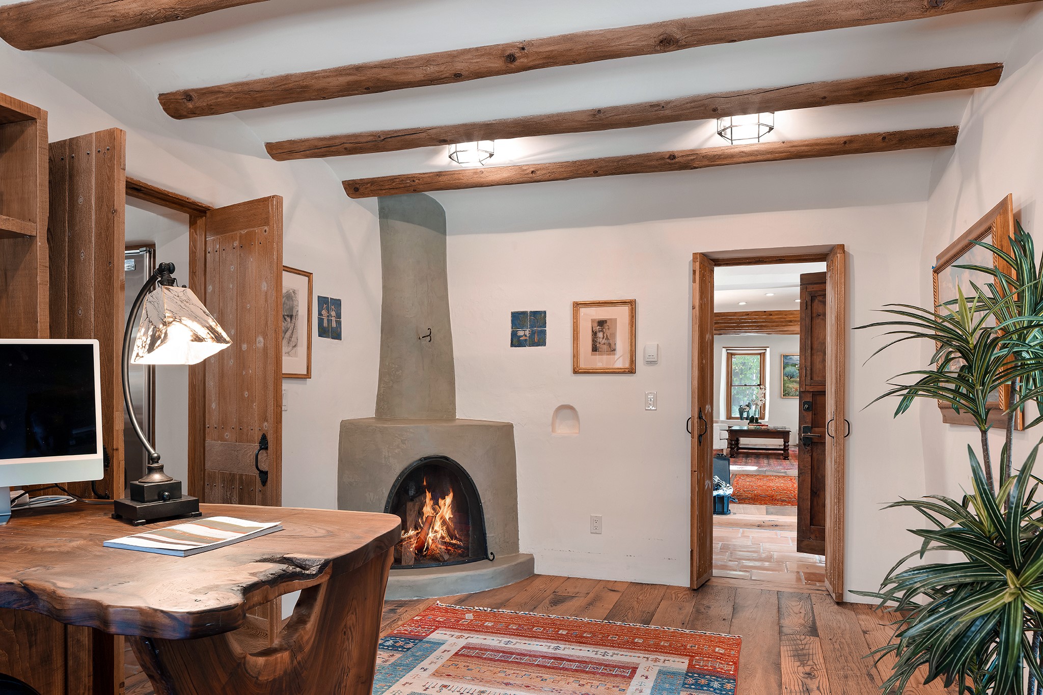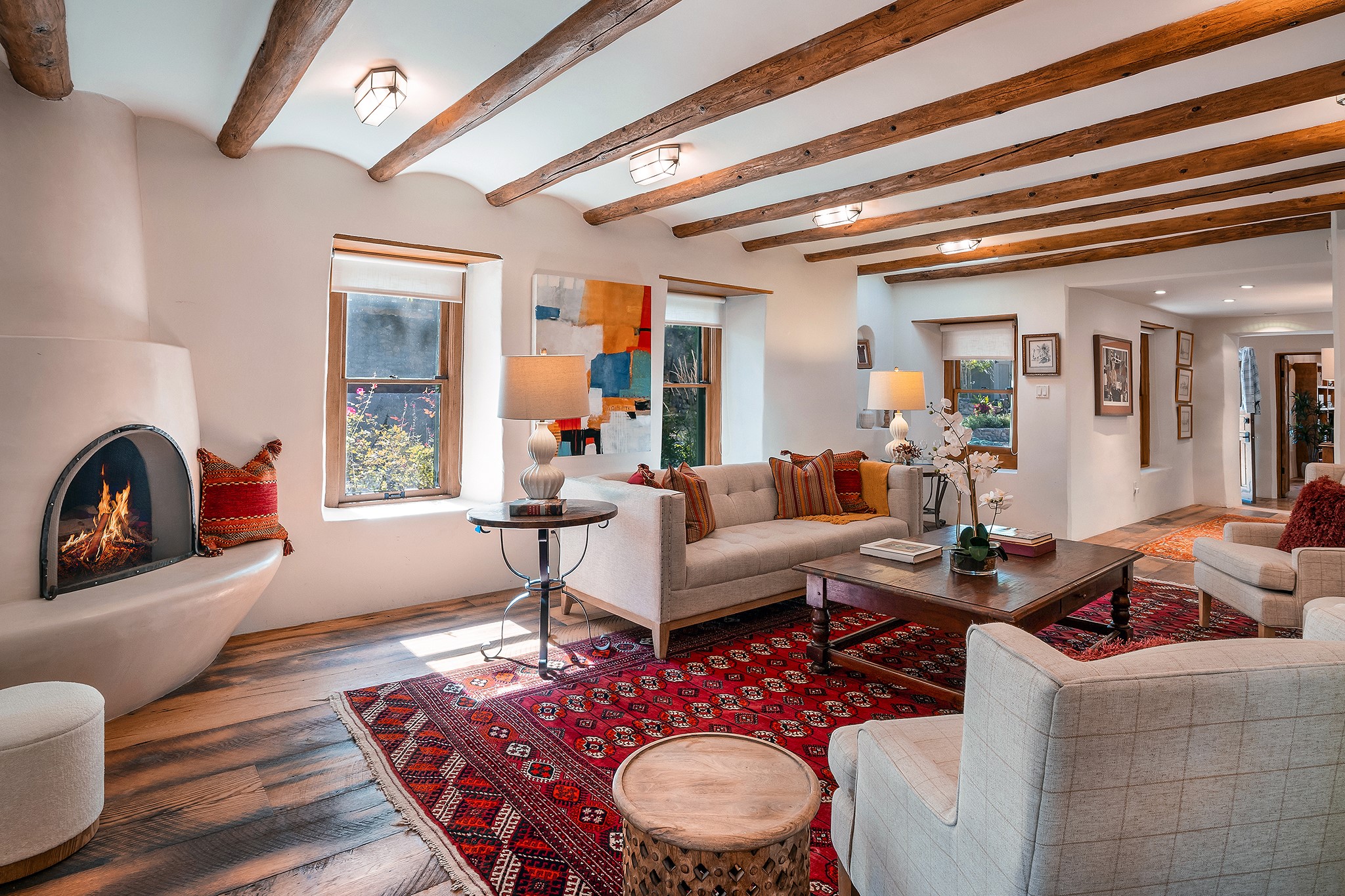 481 Arroyo Tenorio, behind an iconic stonewall in the heart of the Historic East side and the Acequia Madre runs through it! Tucked away and gated on a serene lane in the coveted Historic District is this enviable compound which blends traditional Santa Fe architecture with modern comforts. Thick plastered walls, vigas, coved ceilings, and multiple fireplaces create warmth and authenticity, while large windows and French doors invite abundant natural light. An elegantly designed pool, hot tub and extended outdoor living space and vegetable garden were added in 2022. The main house flexible floor plan offers gracious living and dining areas, a well-appointed kitchen, two private bedroom suites , additional guest bedroom , 2.5 baths office and media room. Perfect for full-time living or part time with privacy and security . The guest house features one bedroom , one bath , living area ,dining and kitchenette. Outdoor living is equally inviting, with lush, landscaped gardens, flagstone patios, and shaded portals ideal for entertaining or quiet retreat.Just moments from Canyon Road, the Plaza, and some of Santa Fe's finest restaurants and galleries, around the corner from famous local Downtown Subscription coffee shop and Garcia Street Books. This home provides the perfect balance of privacy and proximity. A rare opportunity to own a classic East side property in one of the city's most sought-after neighborhoods.