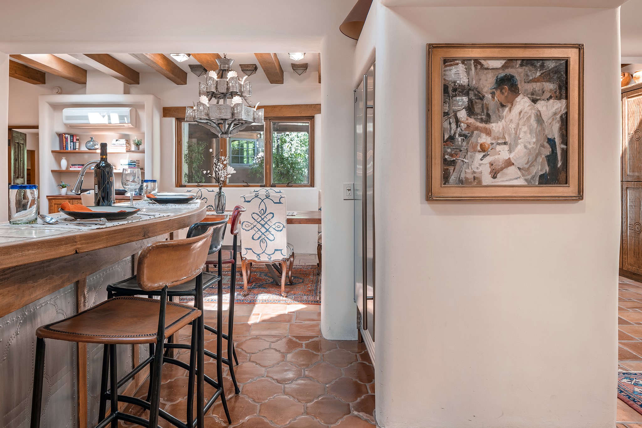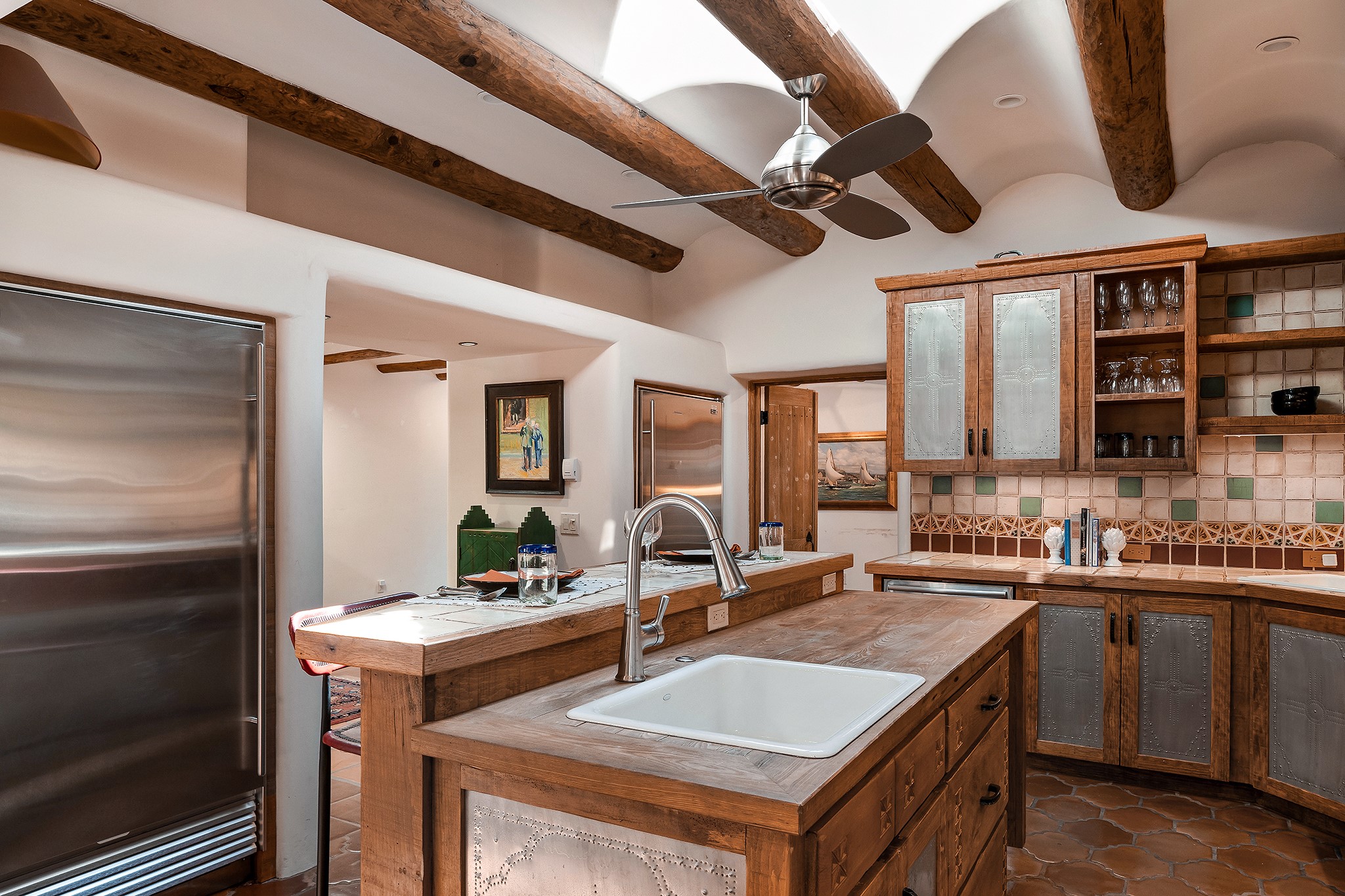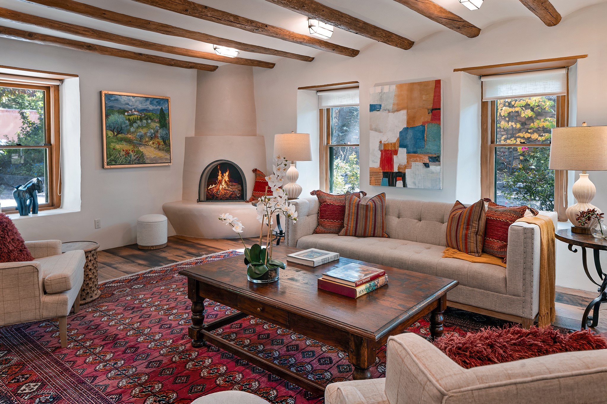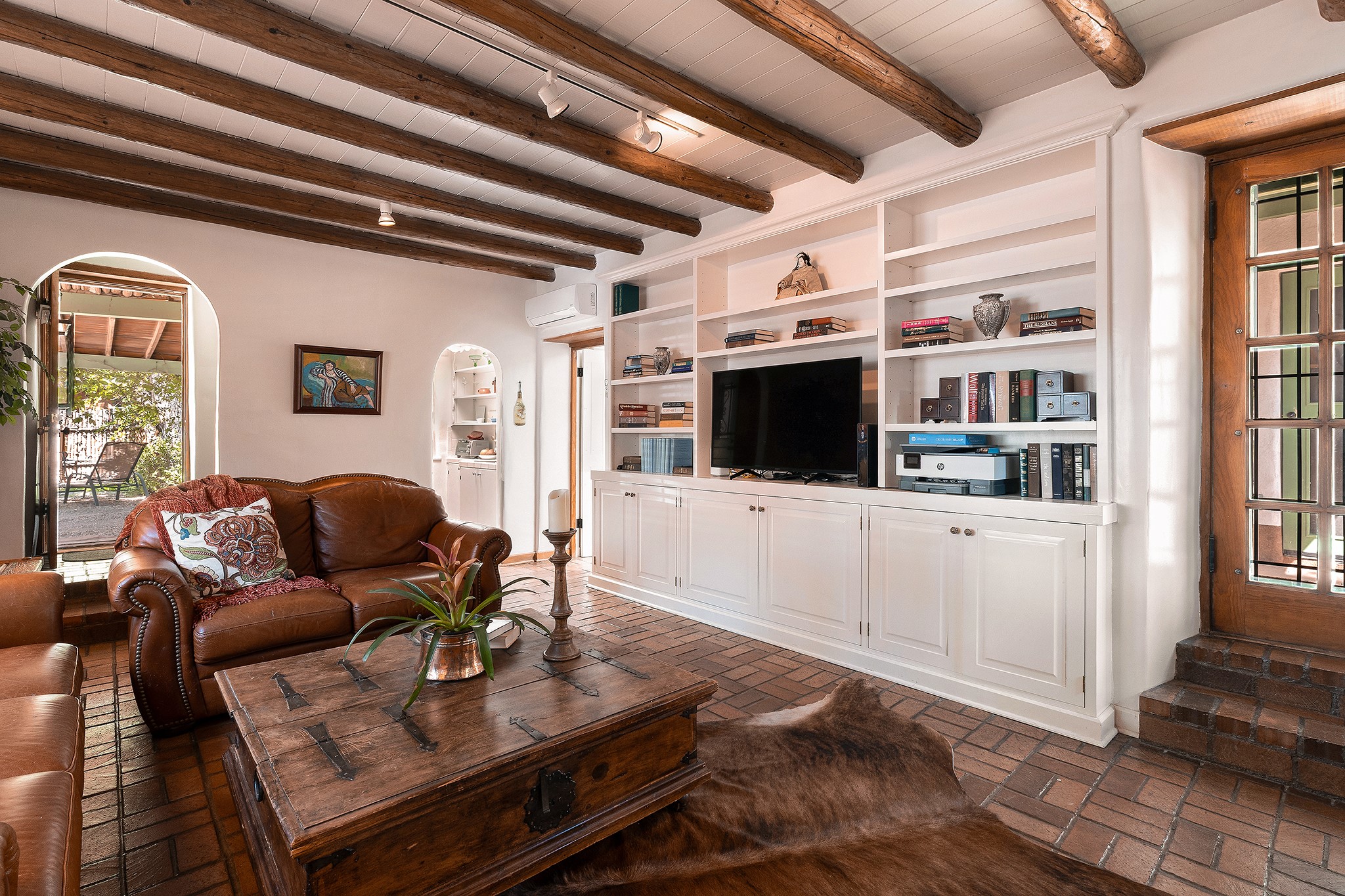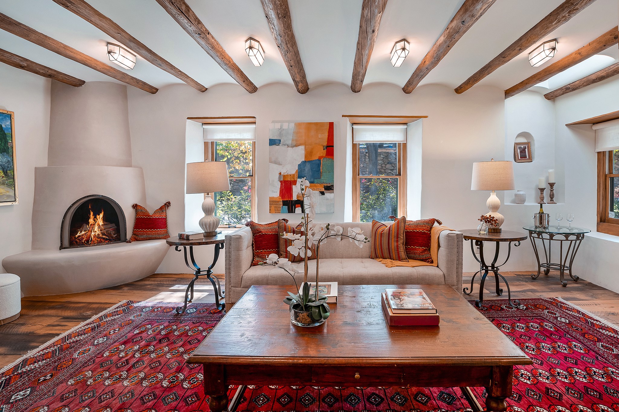 481 Arroyo Tenorio, behind an iconic stonewall in the heart of the Historic East side and the Acequia Madre runs through it! Tucked away and gated on a serene lane in the coveted Historic District is this enviable compound which blends traditional Santa Fe architecture with modern comforts. Thick plastered walls, vigas, coved ceilings, and multiple fireplaces create warmth and authenticity, while large windows and French doors invite abundant natural light. An elegantly designed pool, hot tub and extended outdoor living space and vegetable garden were added in 2022. The main house flexible floor plan offers gracious living and dining areas, a well-appointed kitchen, two private bedroom suites , additional guest bedroom , 2.5 baths office and media room. Perfect for full-time living or part time with privacy and security . The guest house features one bedroom , one bath , living area ,dining and kitchenette. Outdoor living is equally inviting, with lush, landscaped gardens, flagstone patios, and shaded portals ideal for entertaining or quiet retreat.Just moments from Canyon Road, the Plaza, and some of Santa Fe's finest restaurants and galleries, around the corner from famous local Downtown Subscription coffee shop and Garcia Street Books. This home provides the perfect balance of privacy and proximity. A rare opportunity to own a classic East side property in one of the city's most sought-after neighborhoods.