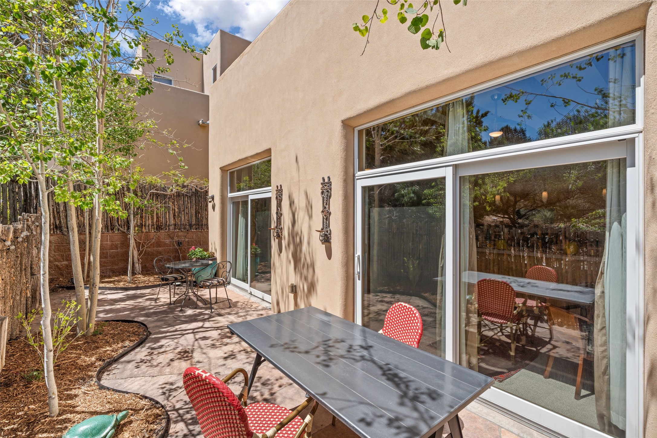 Northside 3-bedroom, 2.5-bath condominium offering captivating views and a thoughtfully designed multi-level layout. The first level features a two-car garage, mechanical room, and generous storage options. Move up to the second level, where the living area includes a welcoming fireplace, providing a focal point for relaxation. The open living room and kitchen design encourages easy interaction, complemented by a convenient half bath. Enjoy access to a private patio and outdoor area, perfect for unwinding or entertaining. On the third level, discover a guest bedroom, a laundry area, an office, and a full bath. A balcony enhances this level, offering an additional outdoor retreat. The primary suite occupies the fourth level, serving as a tranquil getaway. Recent updates add to this home's charm, featuring upgraded fireplace with granite, modern lighting, ceiling fans, and practical shelving. The addition of flagstone and aspen trees enhances the outdoor environment, creating a serene atmosphere. Conveniently located, this condo is just moments away from the DeVargas Center, Frank Ortiz Dog Park, Ft. Marcy Recreation Center, and the Historic Santa Fe Plaza.
