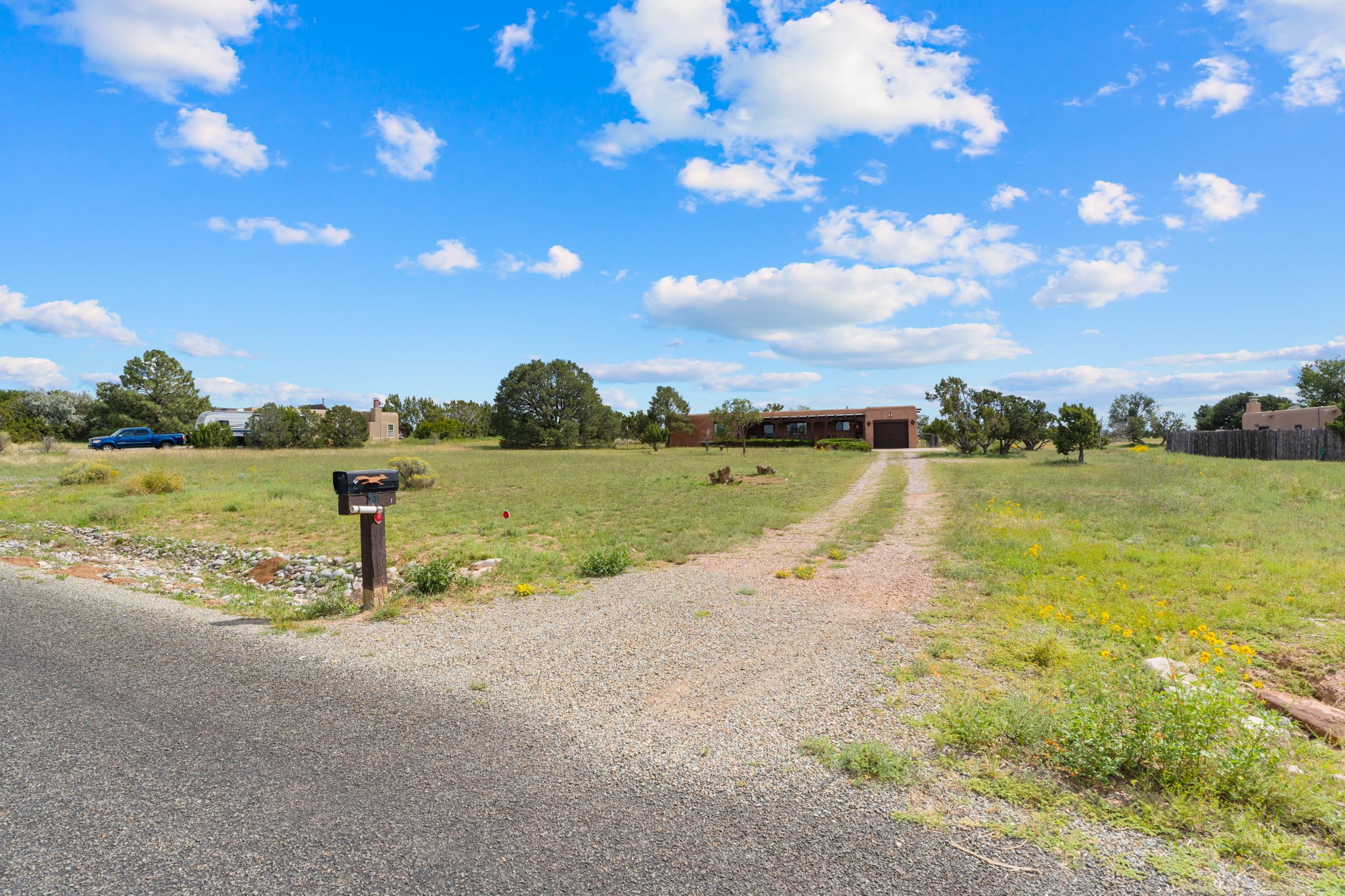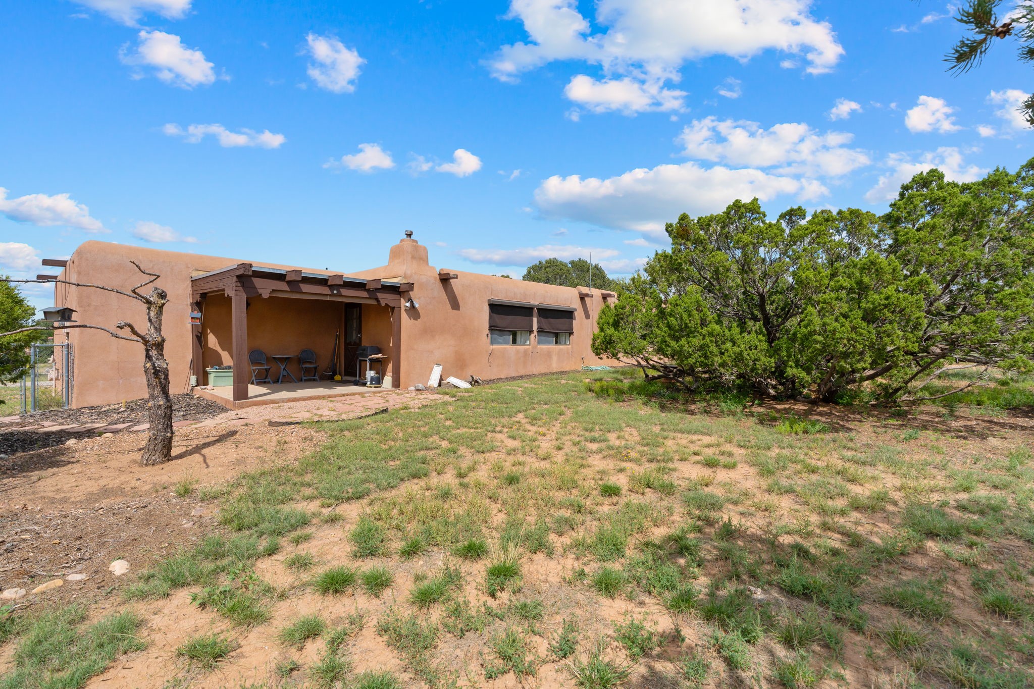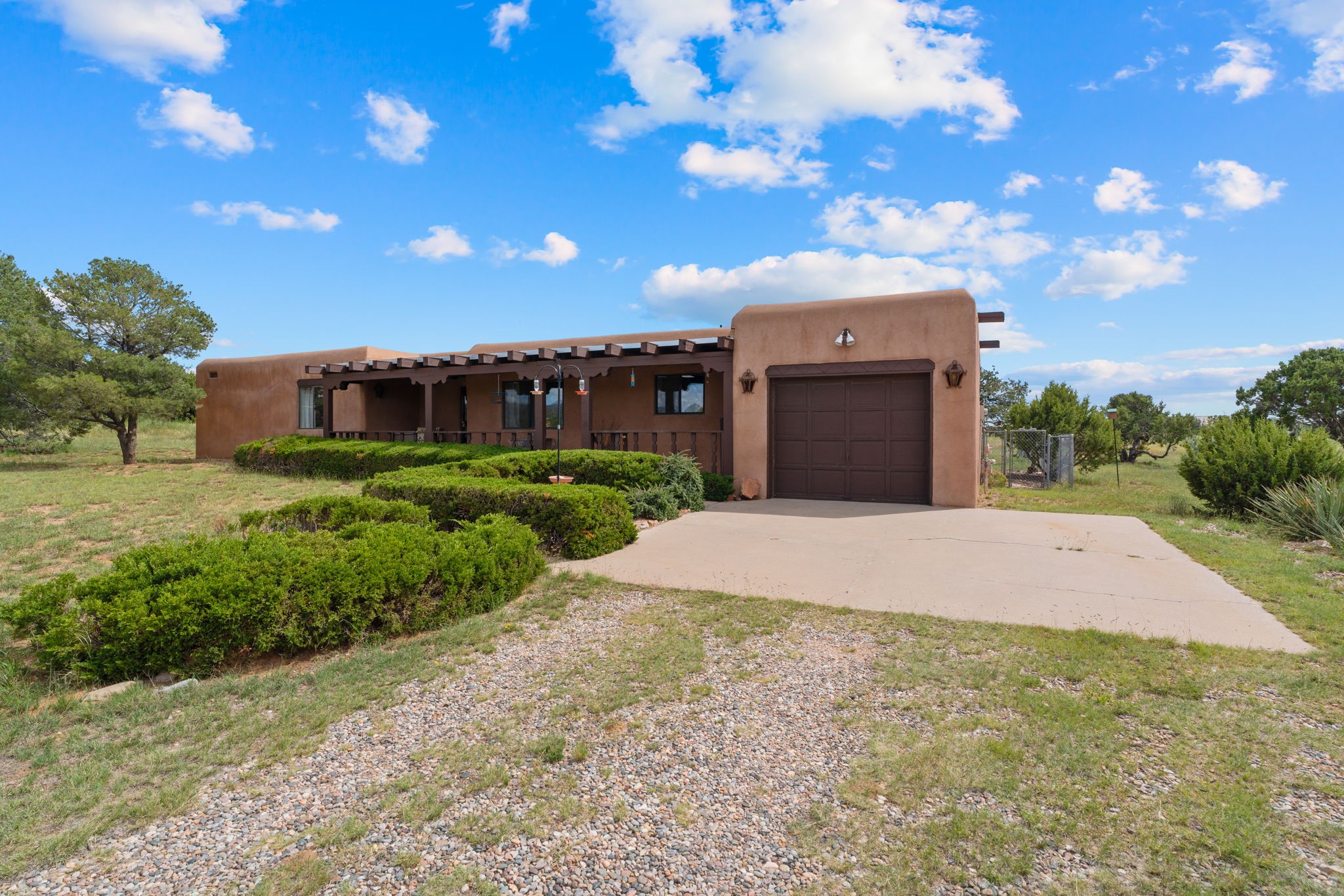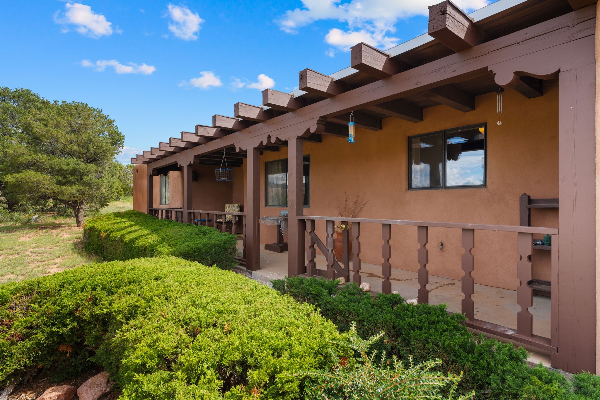 Imagine relaxing under a long portal, watching the birds and facing panoramic foothill views of the Sangre de Cristo mountains. This is the entrance to 77 Moya Rd, in the Eldorado subdivision, just minutes from Santa Fe. This 3 bedroom, 2 bath home is over 1600 square feet, with a living room highlighted by beamed, wooden ceilings, wood floors, and a kiva fireplace with gas insert. New pleated shades highlight the windows in most of the home. There is direct access to the covered portal in the rear fenced yard. The kitchen is light and pleasant with re-faced and painted cabinets, Stainless Steel Appliances, (new Kitchen aid stove and Bosch dishwasher), and flows to the adjacent dining room. The bedrooms have ample closet space and the baths have colorful tile throughout. The home has a one-car finished garage. Situated on a large 1.45 acre view lot, the location is very close to the school, library, senior center, and the community pool. The extensive hike/bike trail is off of the back yard, an local restaurants and shopping are nearby.