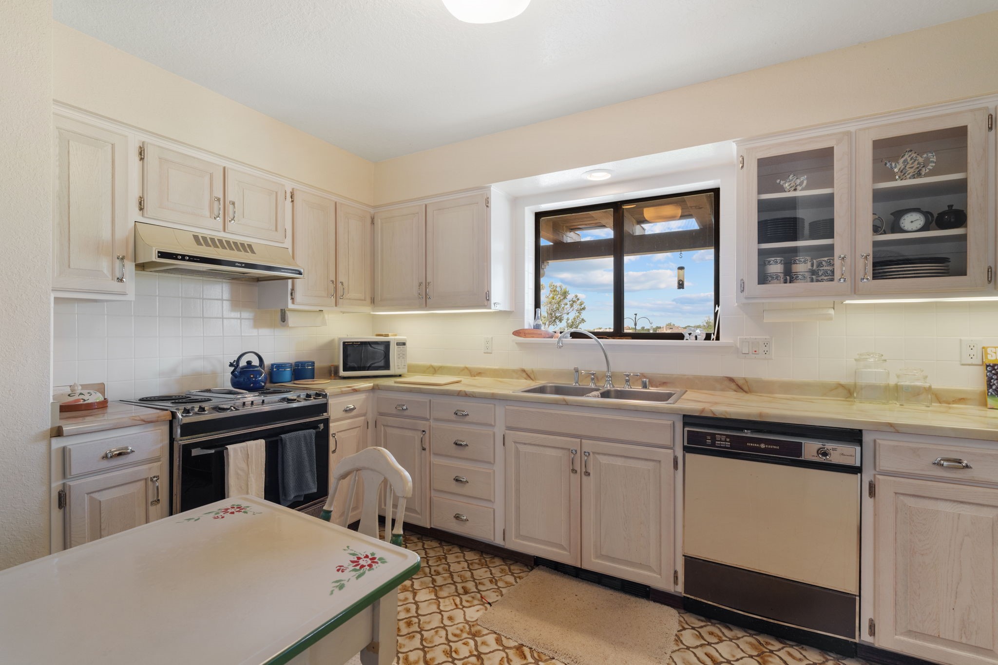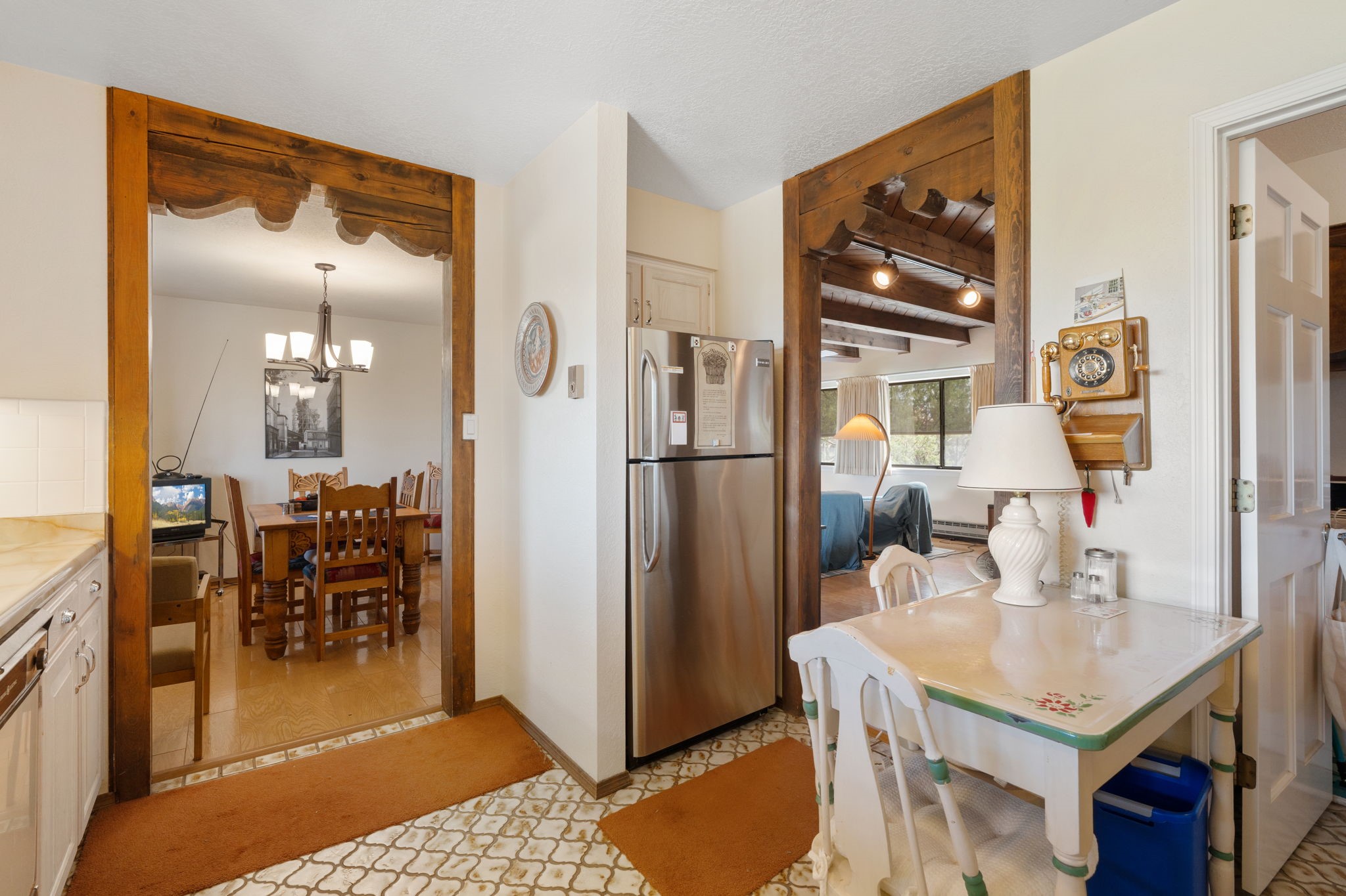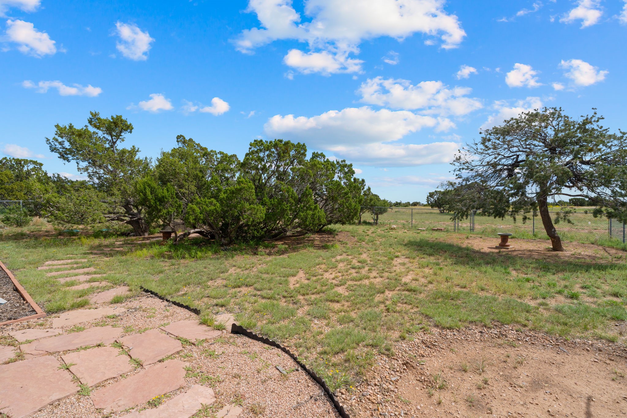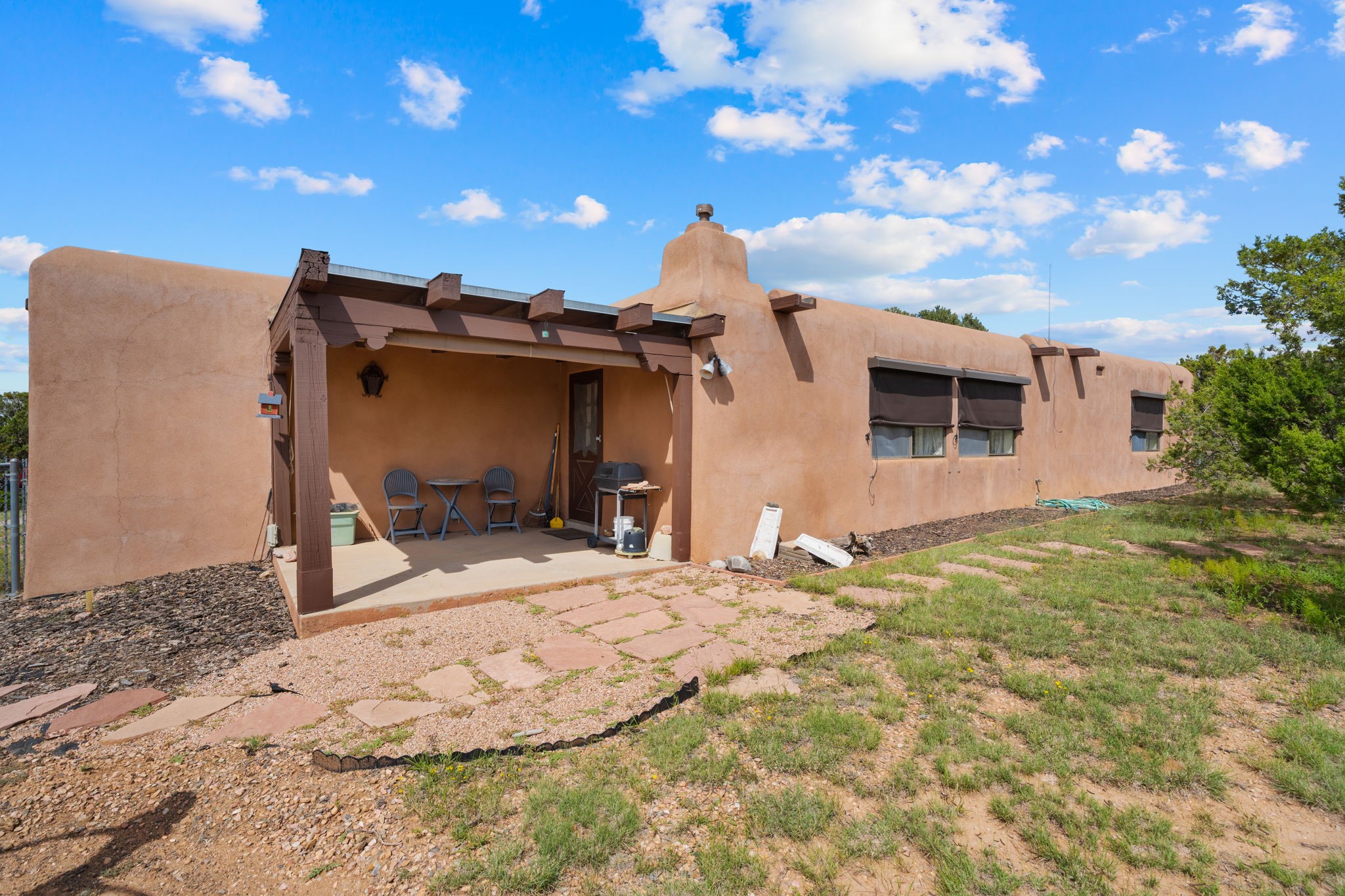 Imagine relaxing under a long portal, watching the birds and facing panoramic foothill views of the Sangre de Cristo mountains. This is the entrance to 77 Moya Rd, in the Eldorado subdivision, just minutes from Santa Fe. This 3 bedroom, 2 bath home is over 1600 square feet, with a living room highlighted by beamed, wooden ceilings, wood floors, and a kiva fireplace with gas insert. New pleated shades highlight the windows in most of the home. There is direct access to the covered portal in the rear fenced yard. The kitchen is light and pleasant with re-faced and painted cabinets, Stainless Steel Appliances, (new Kitchen aid stove and Bosch dishwasher), and flows to the adjacent dining room. The bedrooms have ample closet space and the baths have colorful tile throughout. The home has a one-car finished garage. Situated on a large 1.45 acre view lot, the location is very close to the school, library, senior center, and the community pool. The extensive hike/bike trail is off of the back yard, an local restaurants and shopping are nearby.