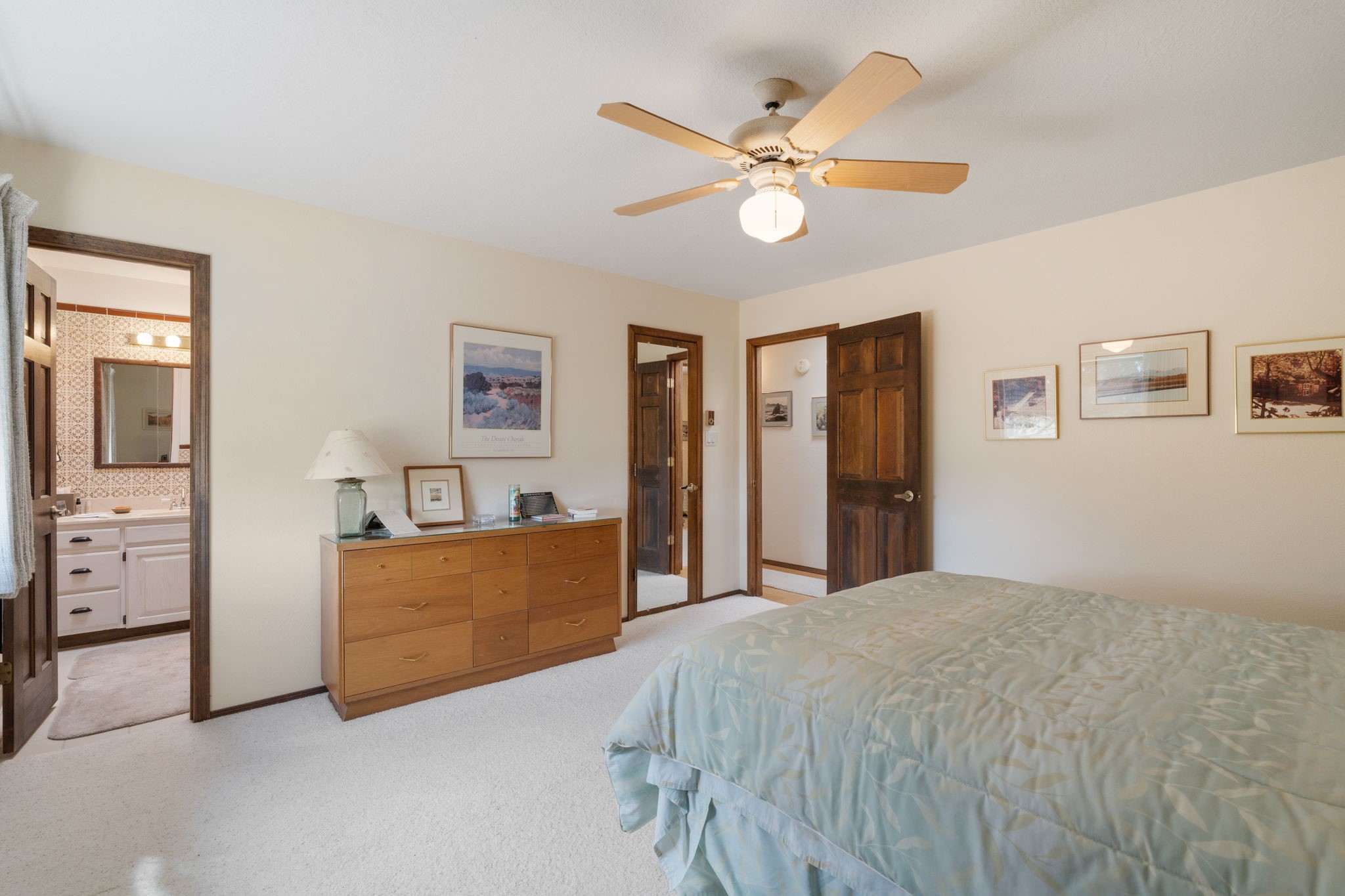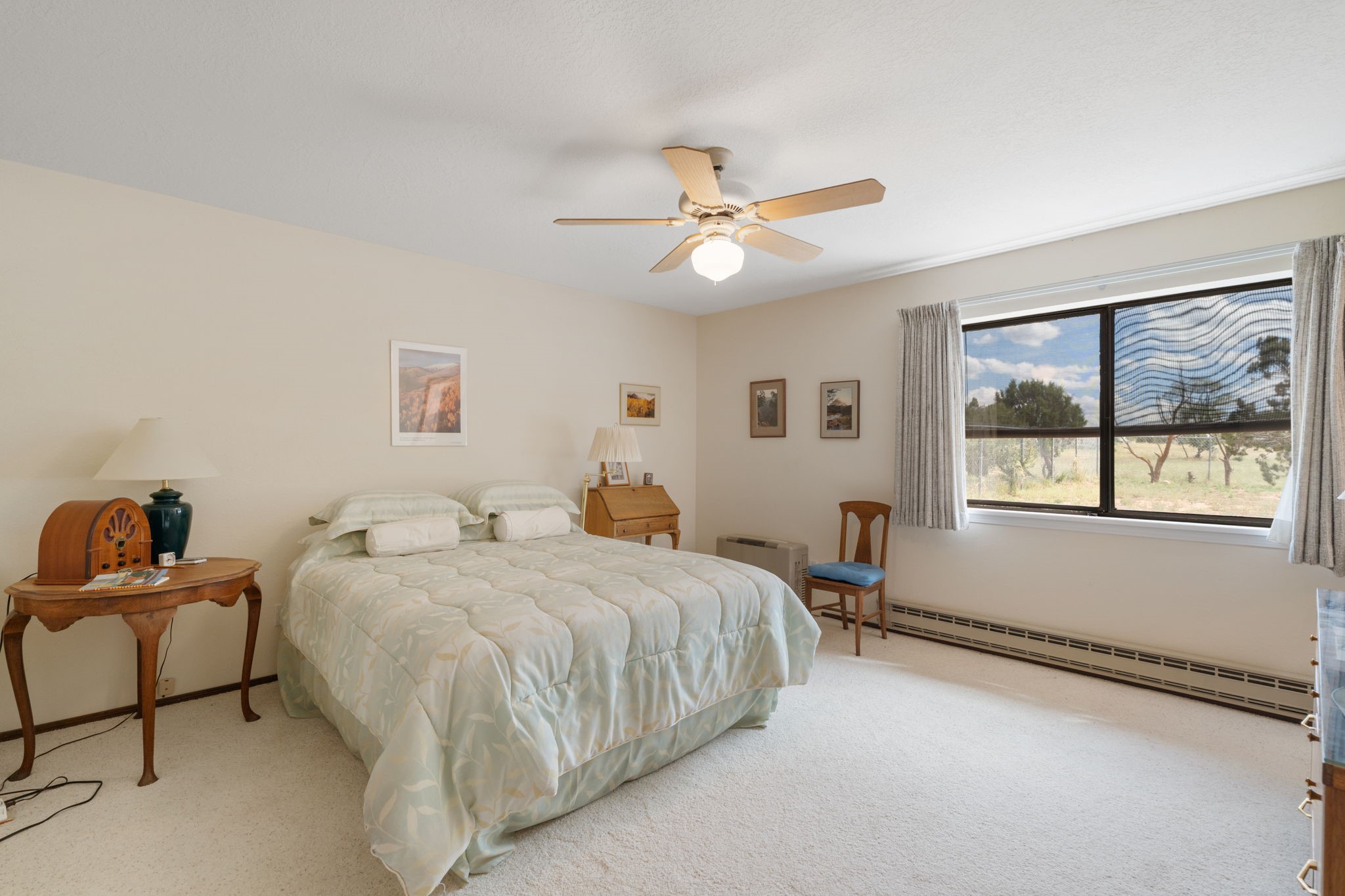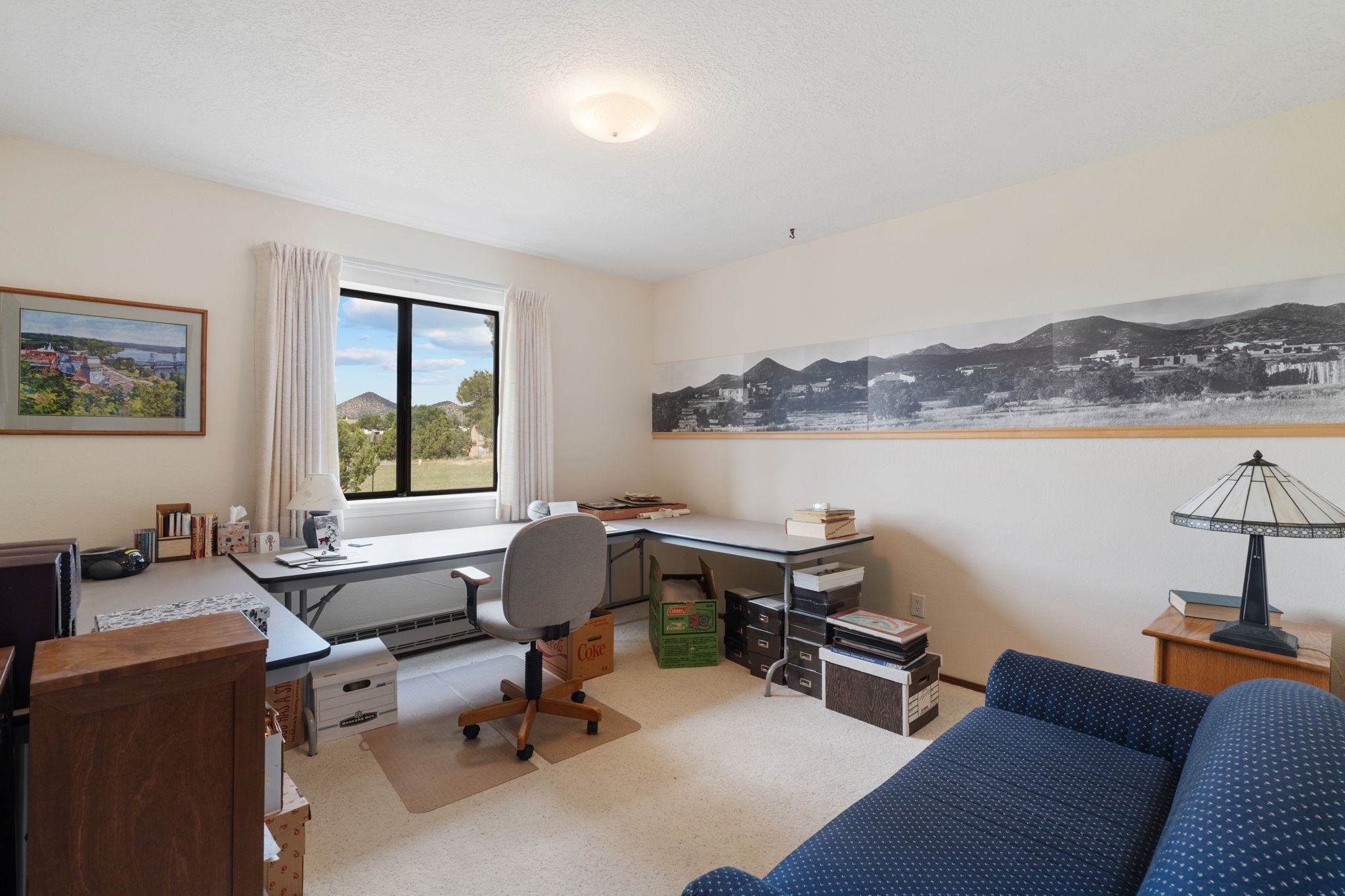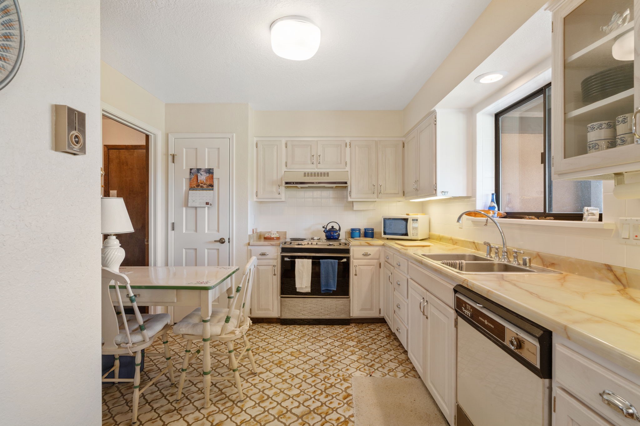 Imagine relaxing under a long portal, watching the birds and facing panoramic foothill views of the Sangre de Cristo mountains. This is the entrance to 77 Moya Rd, in the Eldorado subdivision, just minutes from Santa Fe. This 3 bedroom, 2 bath home is over 1600 square feet, with a living room highlighted by beamed, wooden ceilings, wood floors, and a kiva fireplace with gas insert. New pleated shades highlight the windows in most of the home. There is direct access to the covered portal in the rear fenced yard. The kitchen is light and pleasant with re-faced and painted cabinets, Stainless Steel Appliances, (new Kitchen aid stove and Bosch dishwasher), and flows to the adjacent dining room. The bedrooms have ample closet space and the baths have colorful tile throughout. The home has a one-car finished garage. Situated on a large 1.45 acre view lot, the location is very close to the school, library, senior center, and the community pool. The extensive hike/bike trail is off of the back yard, an local restaurants and shopping are nearby.