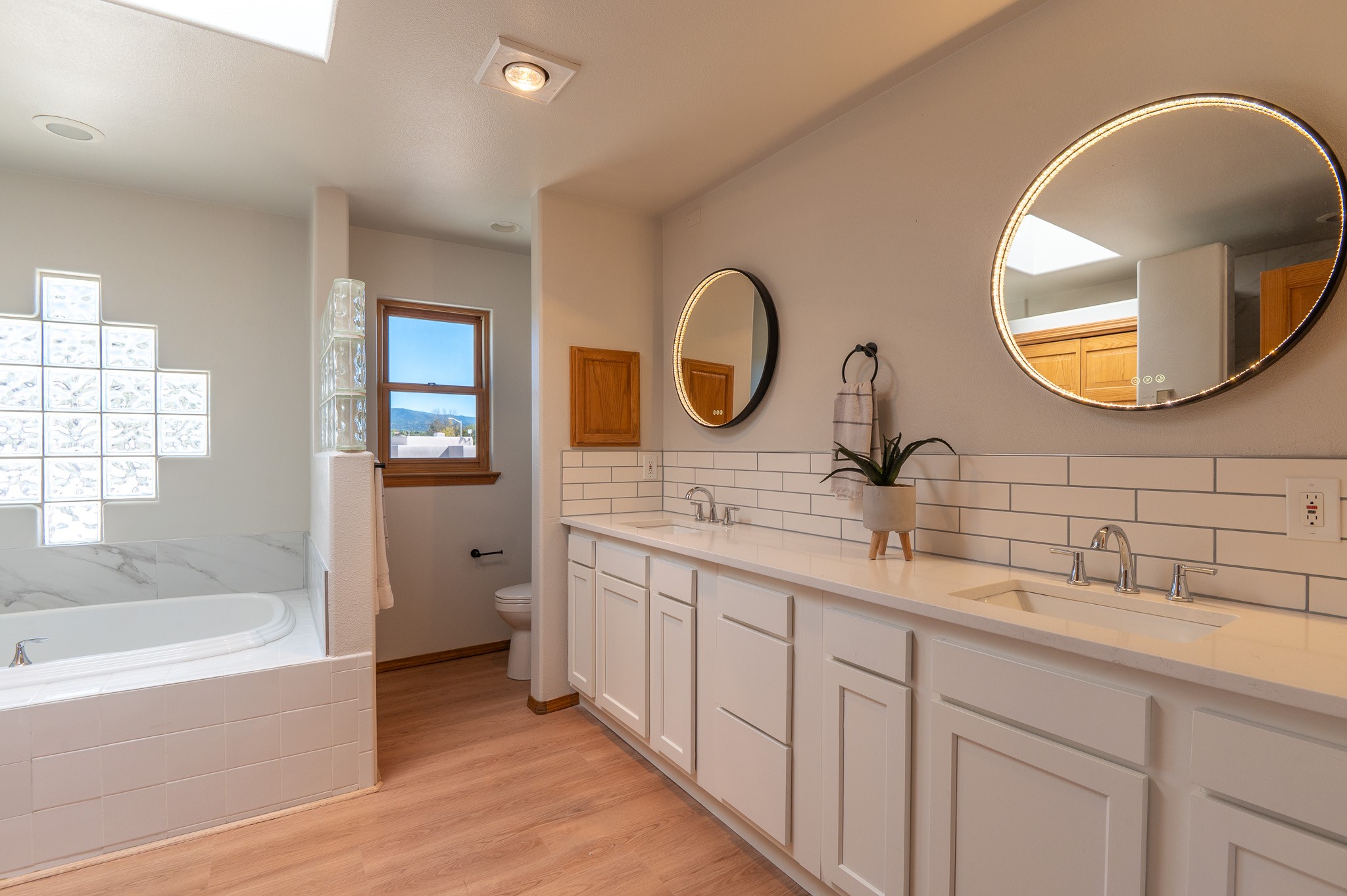 This is the house where you actually live the great Santa Fe life effortlessly. Nestled on a quarter acre of beautiful land, it's been completely updated so you don't spend weekends dealing with a contractor. This generous 2,200 sq ft, adobe-style home just got a serious glow up. We're talking newly installed TPO roof, fresh interior paint, and gorgeous newly installed LVP flooring all done. The place feels legitimately new, running on a newly installed evaporative cooling unit, plus, lovely newly installed light fixtures throughout the entire home. The main level is the ultimate hang out zone, offering three distinct living spaces for any mood. The chef's kitchen (newly installed granite, cabinets, and appliances) anchorsthe flow between the open Living and Dining areas, which feature amazing rounded Vigas and classic ceilings, perfect for hosting. Need a quiet retreat? There's a large great room with soaring ceilings and beautiful fireplace for cozy winter nights. Two flexible bedrooms and a full bath are conveniently located on this main level, along with a huge laundry room with tons of storage and counter space.Upstairs is the Primary Suite, your luxurious private retreat. It features a spacious walk in closet, a newly remodeled and updated spa-worthy en suite bath, and a private deck on this level for morning coffee under the New Mexico sky.The outside is a peaceful haven. Your backyard is perfect for relaxing, under the covered patio.An oversized two-car garage with workspace ensures this home combines classic Santa Fe style with zero compromises on convenience. All the big, annoying projects are done.Come see the home that lets you stop working on your house, and start living in it.