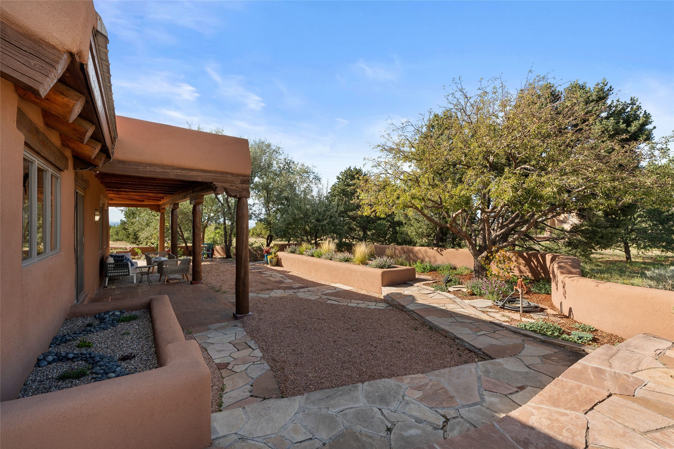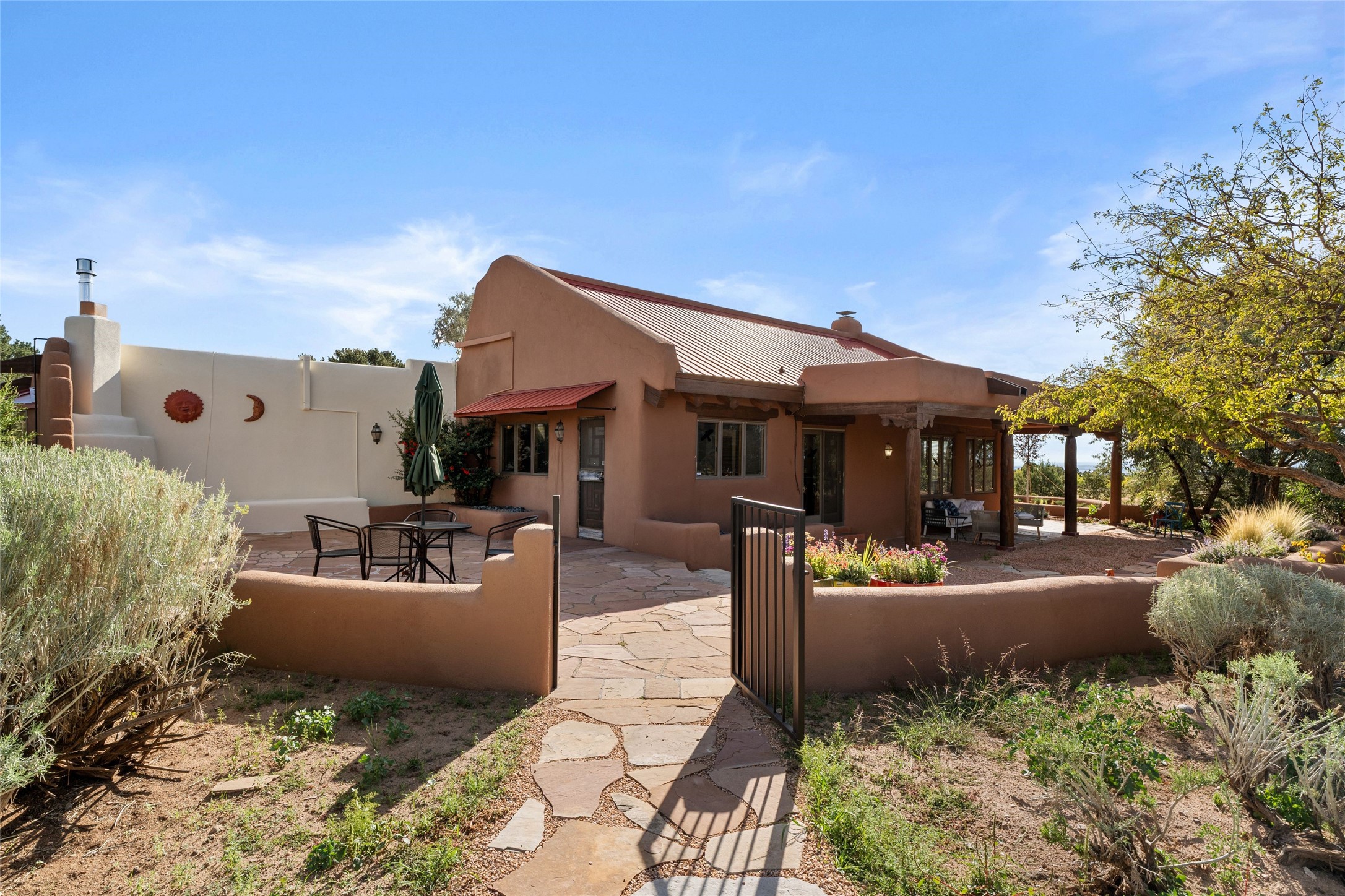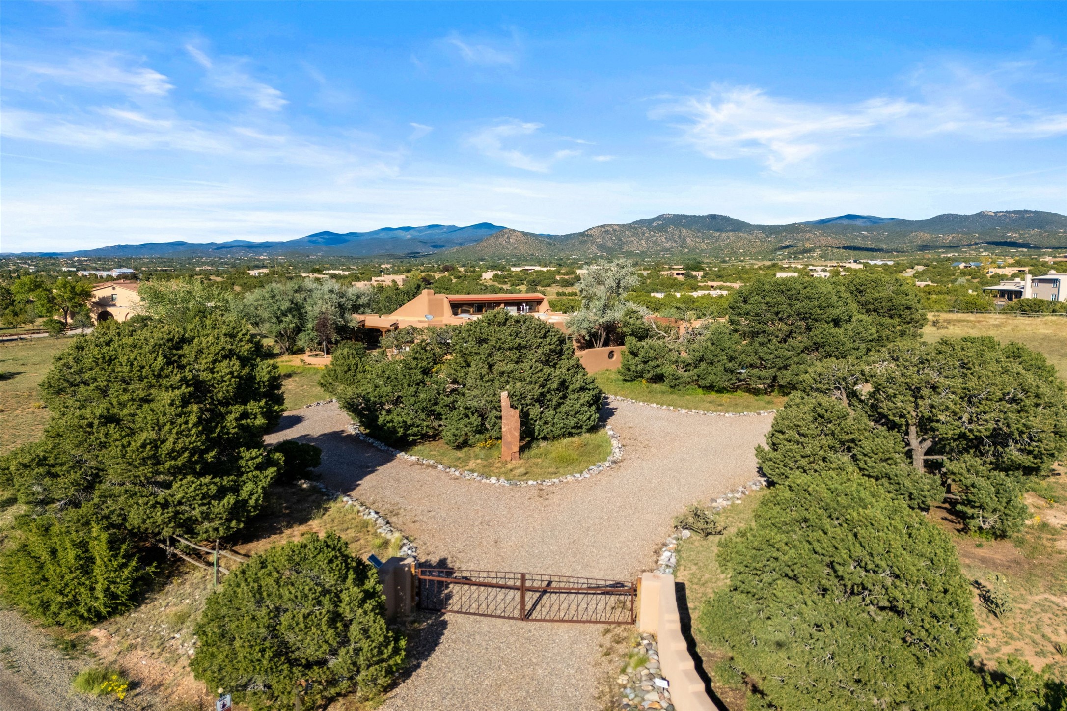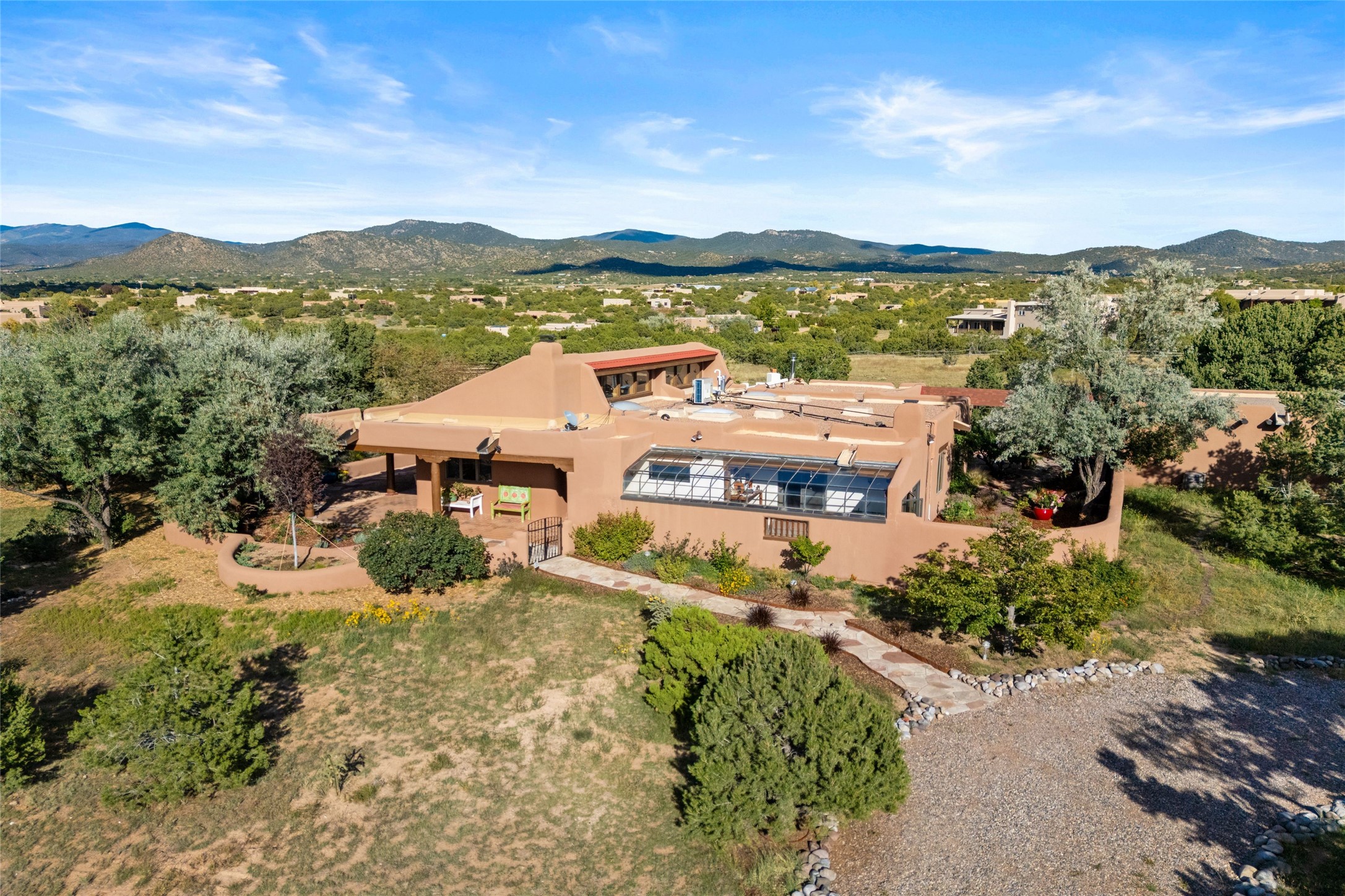 Set on 4.3 gated acres of natural beauty, this tranquil Santa Fe retreat offers breathtaking views from every room and effortless access to downtown, Zafarano Road, and I-25.The open living, dining, and kitchen area flows beautifully for both relaxed living and elegant entertaining. Surrounded by walled courtyards and lush gardens, the property offers exceptional privacy and serenity--an ideal artist's haven or personal sanctuary.Two spacious bedrooms and a versatile bonus room provide flexibility for a studio, family room, or large den. A newly added open greenhouse, set on a poured concrete slab, enhances the property's picturesque charm and creative potential.Meticulously maintained and thoughtfully updated, recent improvements include repaired stucco, new KitchenAid appliances, refreshed landscaping with drip irrigation, new mini-split systems, and fully serviced electrical systems.Experience the perfect blend of beauty, tranquility, and convenience in this rare Santa Fe retreat.