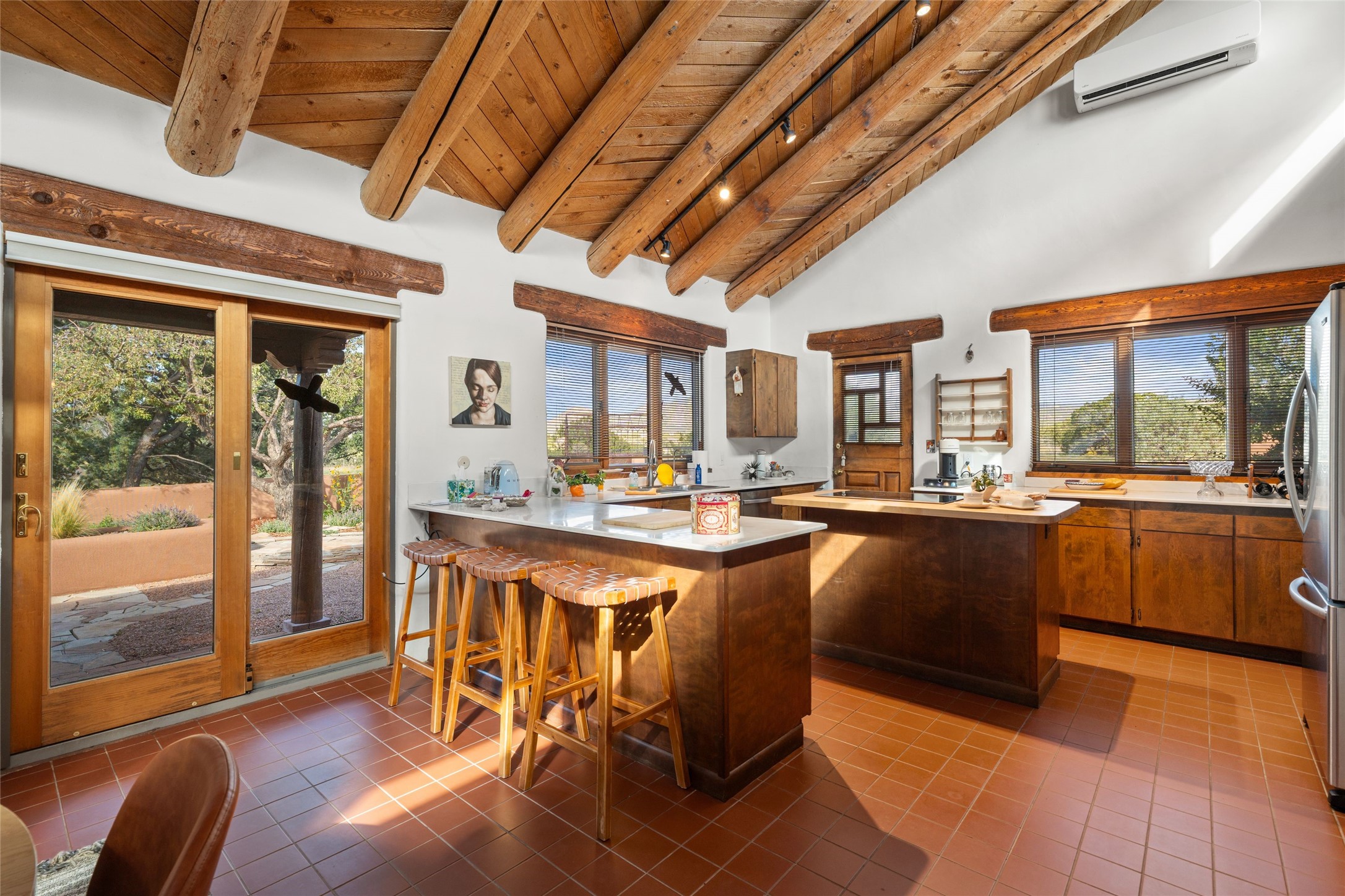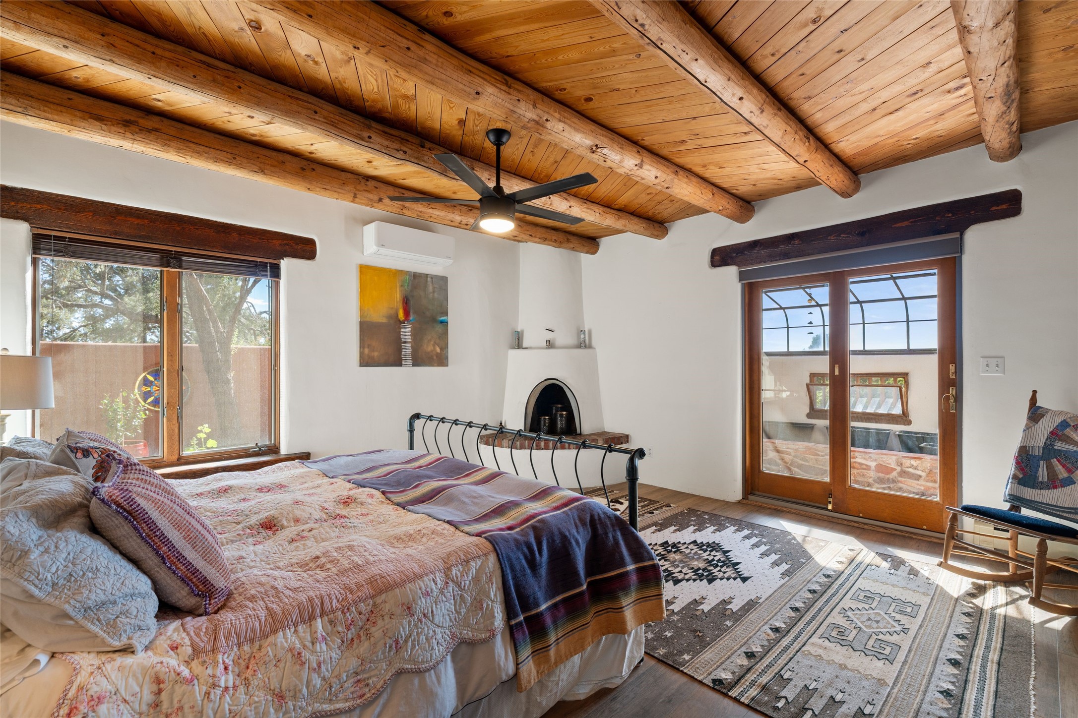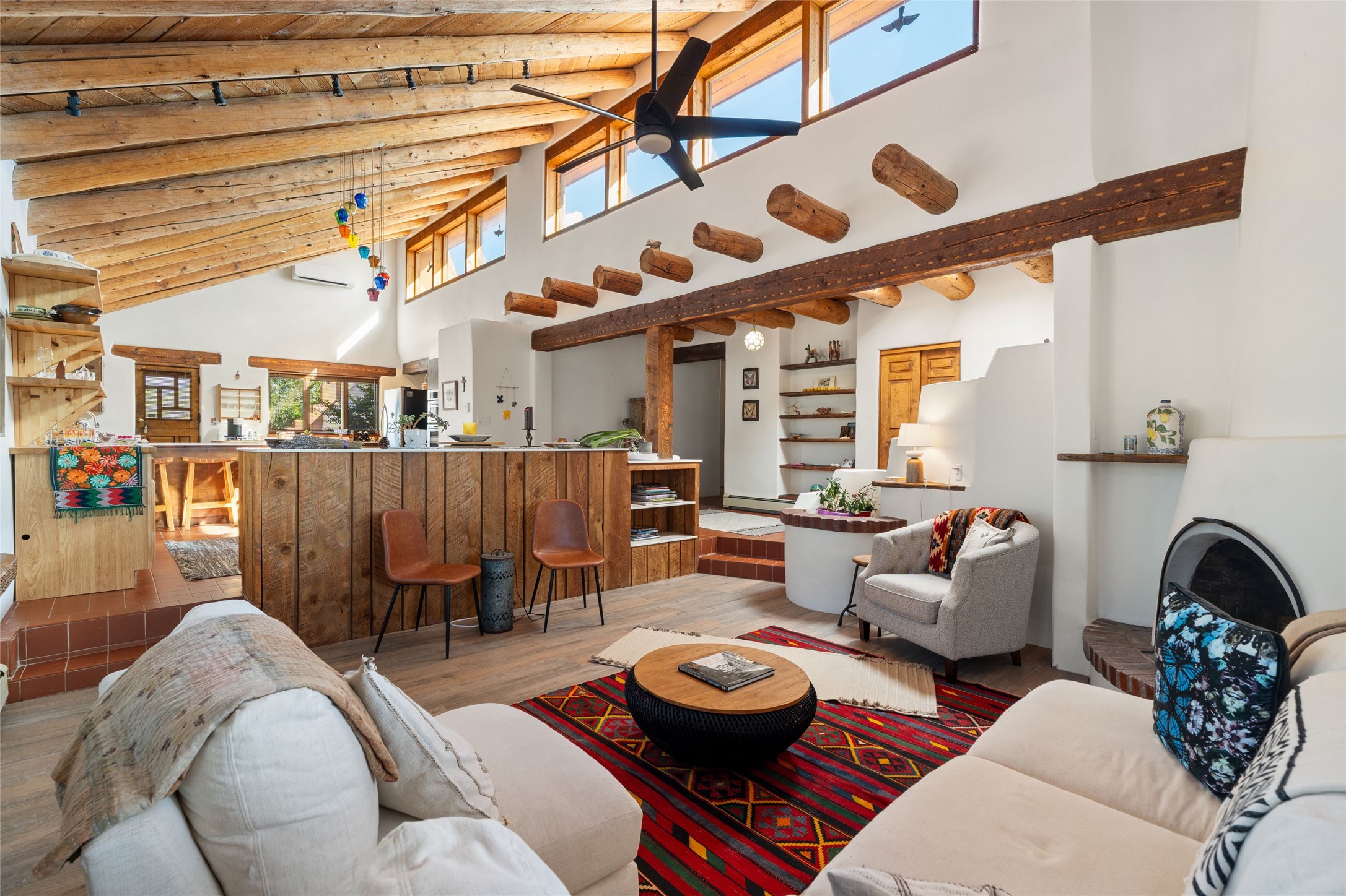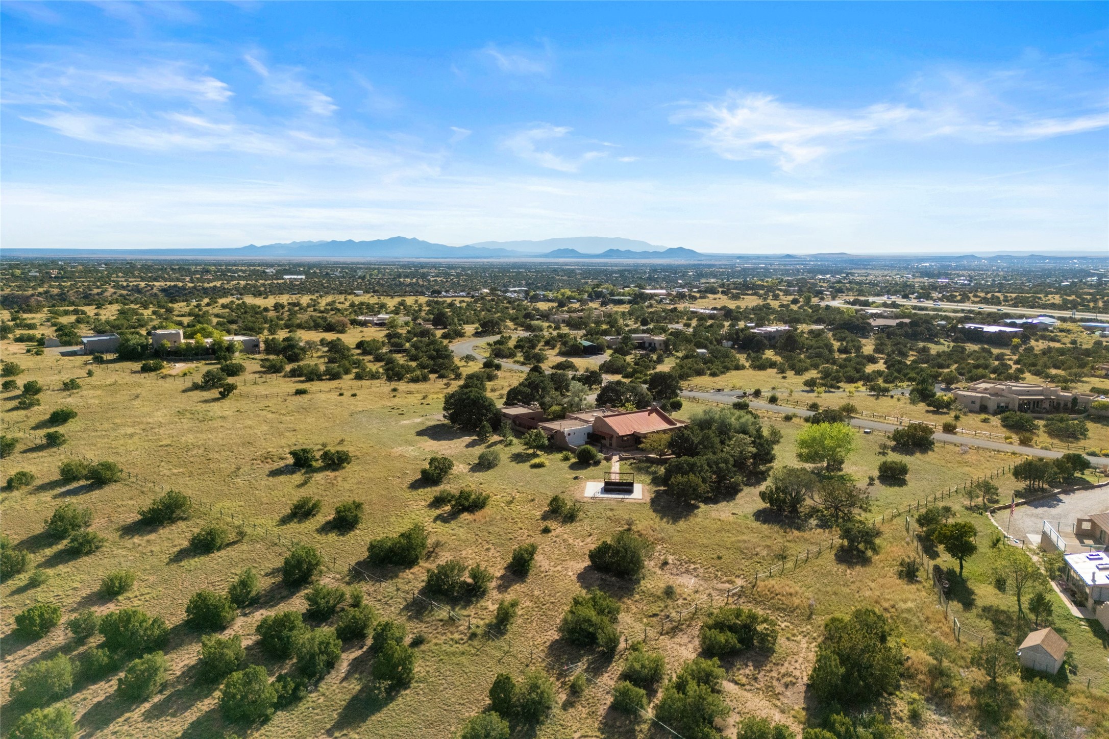 Set on 4.3 gated acres of natural beauty, this tranquil Santa Fe retreat offers breathtaking views from every room and effortless access to downtown, Zafarano Road, and I-25.The open living, dining, and kitchen area flows beautifully for both relaxed living and elegant entertaining. Surrounded by walled courtyards and lush gardens, the property offers exceptional privacy and serenity--an ideal artist's haven or personal sanctuary.Two spacious bedrooms and a versatile bonus room provide flexibility for a studio, family room, or large den. A newly added open greenhouse, set on a poured concrete slab, enhances the property's picturesque charm and creative potential.Meticulously maintained and thoughtfully updated, recent improvements include repaired stucco, new KitchenAid appliances, refreshed landscaping with drip irrigation, new mini-split systems, and fully serviced electrical systems.Experience the perfect blend of beauty, tranquility, and convenience in this rare Santa Fe retreat.