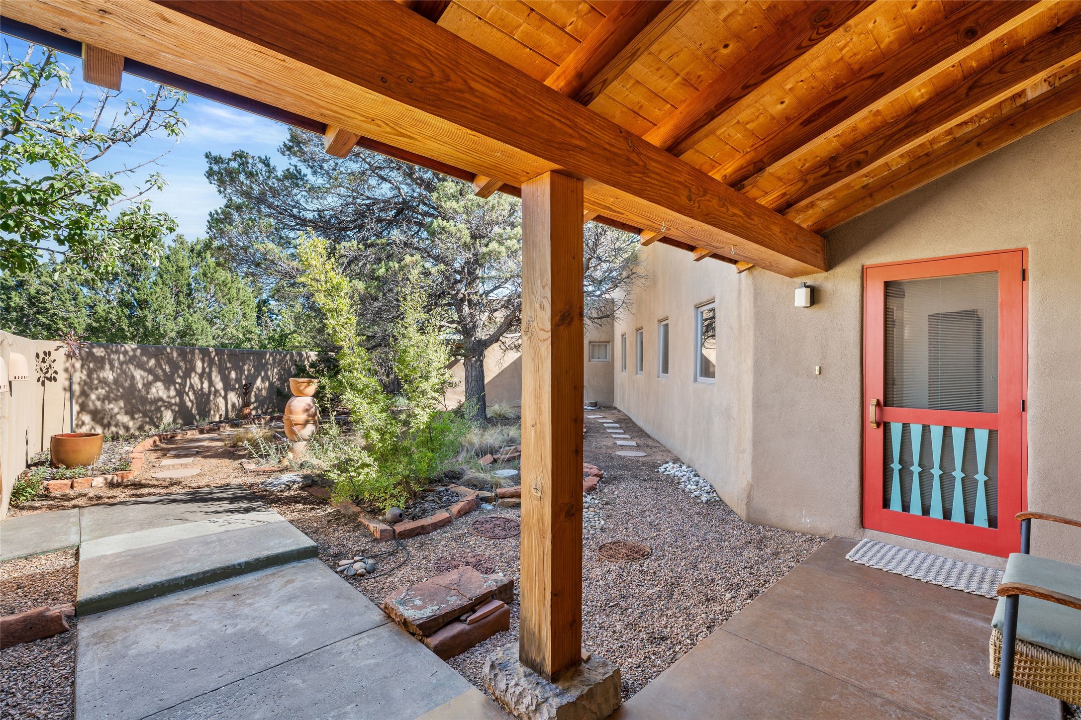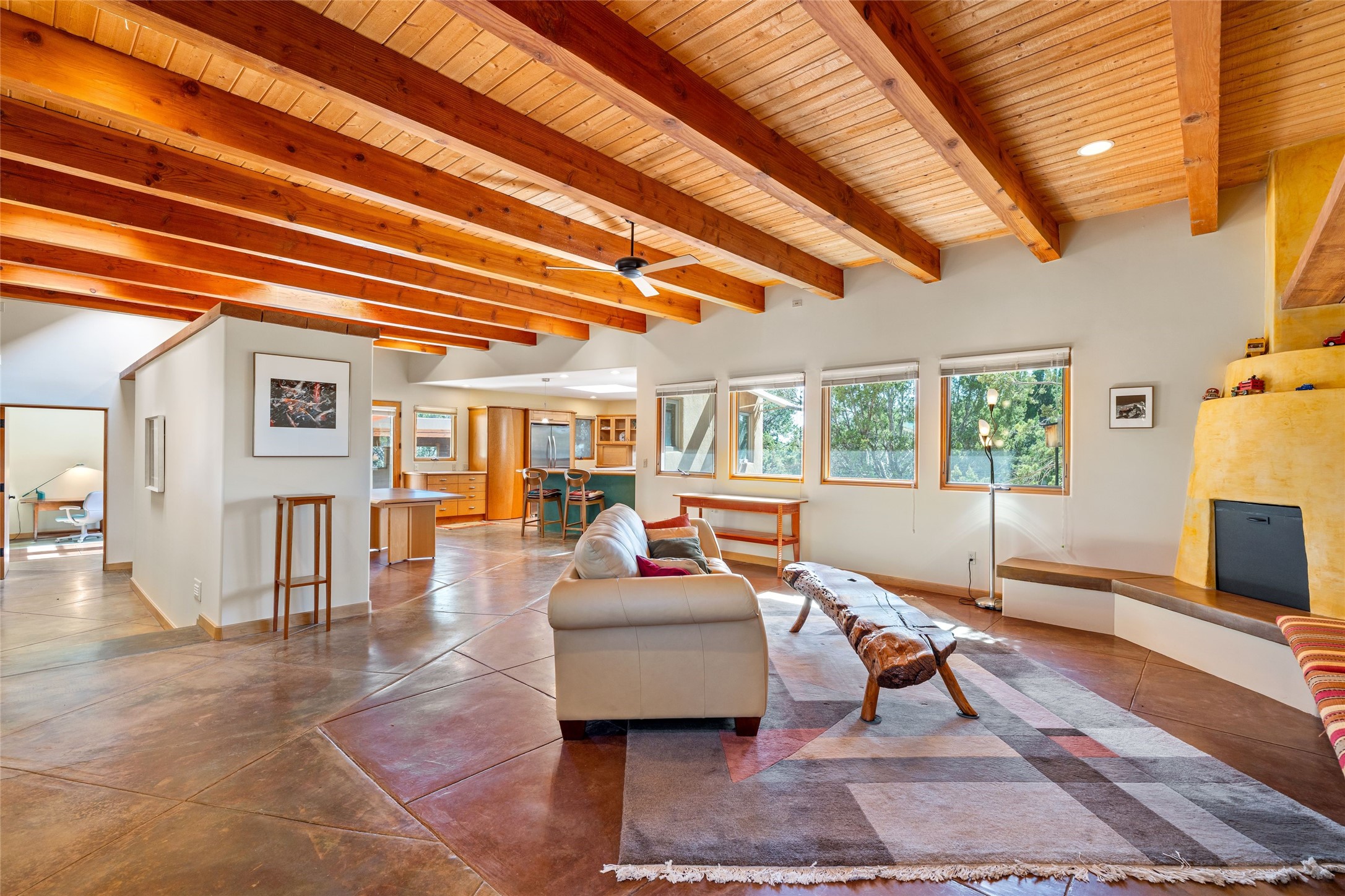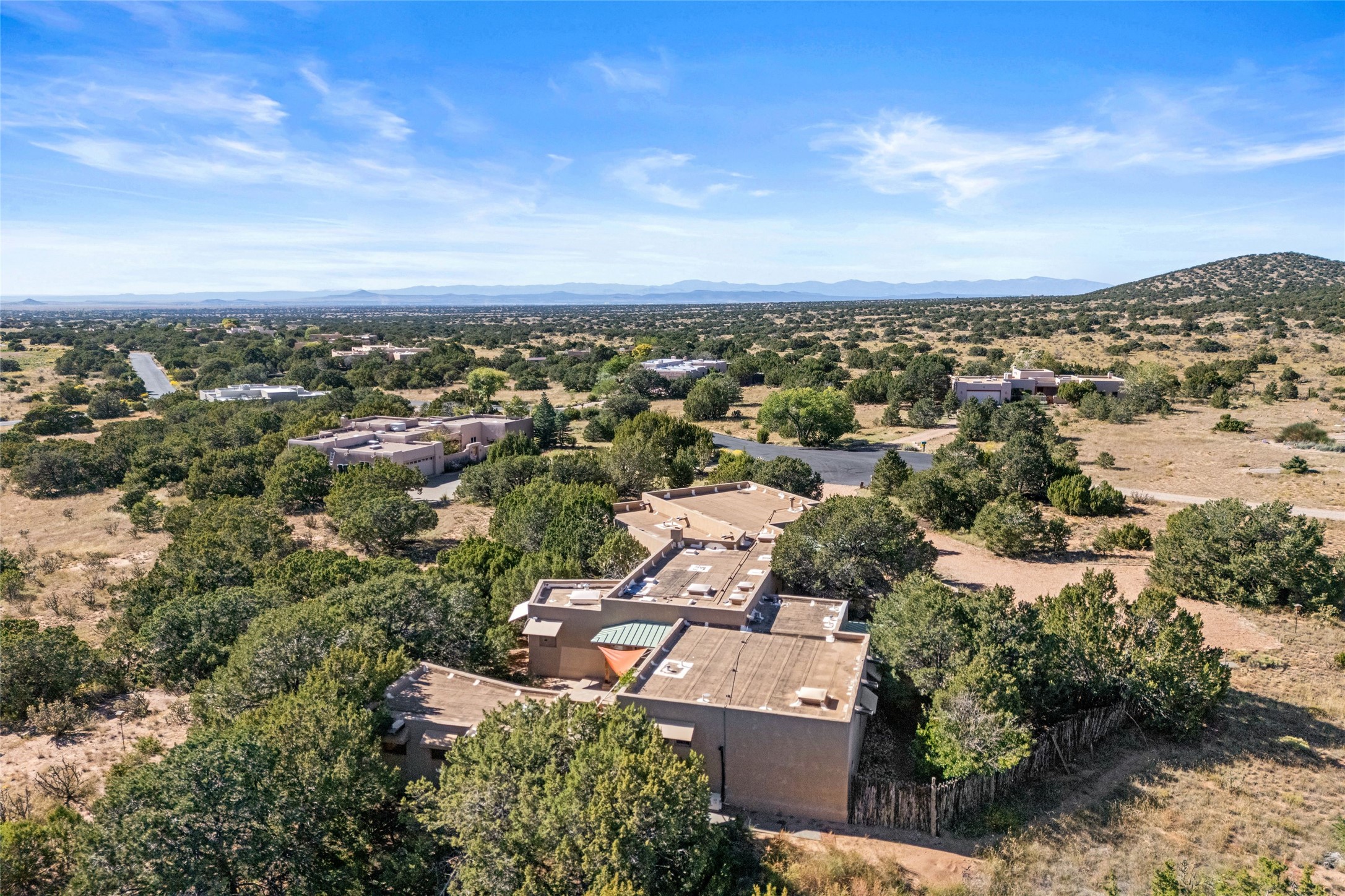 Offered for the first time since its construction in 1997 by renowed builder J. Koledin, this custom single-level residence blends soft contemporary design with mid-century modern influences and New Mexico charm in a peaceful, private setting. Nestled on approximately three acres at the end of a paved cul-de-sac within the exclusive, gated, Belicia Estates, the home offers both tranquility and convenient access to Santa Fe.A walled and gated patio entry opens to a warm and inviting living area, highlighed by a custom fireplace and striking wood-beamed ceilings. The kitchen features cherry wood flooring, custom cabinetry, and artful wall tile, while colored concrete floors with radiant heating flow throughout the rest of the home.The floor plan provides excellent bedroom separation, a dedicated office adjacent to the primary suite, private studio, laundry room with porcelain sink, plentiful cabinetry. A detached open-air structure near the rear courtyard serves as a serene retreat-perfect for yoga, exercise, or creative purcuits.Additional features include an oversized two-car garage with ample parking nearby.Set within a private, conservation-minded community of just 44 homesites, this distinctive property offers sweeping mountain views, exceptional privacy, and effortless proximity to downtown Santa Fe.