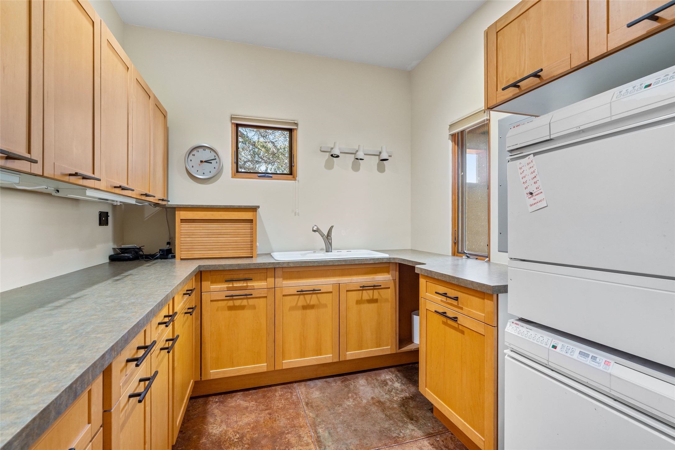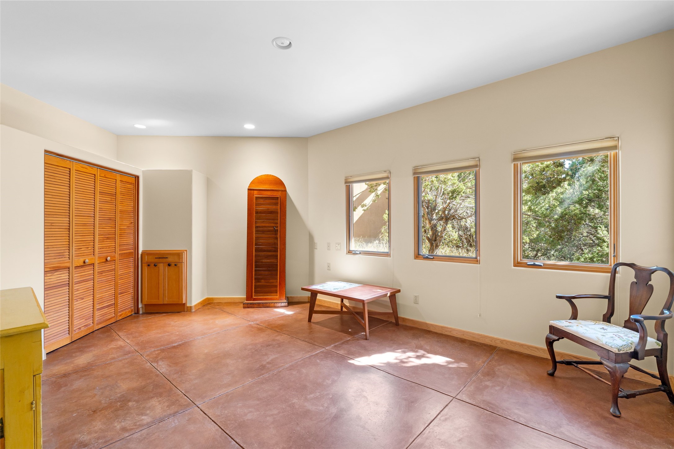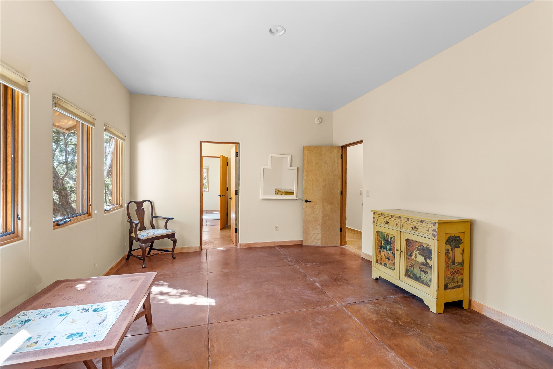 Offered for the first time since its construction in 1997 by renowed builder J. Koledin, this custom single-level residence blends soft contemporary design with mid-century modern influences and New Mexico charm in a peaceful, private setting. Nestled on approximately three acres at the end of a paved cul-de-sac within the exclusive, gated, Belicia Estates, the home offers both tranquility and convenient access to Santa Fe.A walled and gated patio entry opens to a warm and inviting living area, highlighed by a custom fireplace and striking wood-beamed ceilings. The kitchen features cherry wood flooring, custom cabinetry, and artful wall tile, while colored concrete floors with radiant heating flow throughout the rest of the home.The floor plan provides excellent bedroom separation, a dedicated office adjacent to the primary suite, private studio, laundry room with porcelain sink, plentiful cabinetry. A detached open-air structure near the rear courtyard serves as a serene retreat-perfect for yoga, exercise, or creative purcuits.Additional features include an oversized two-car garage with ample parking nearby.Set within a private, conservation-minded community of just 44 homesites, this distinctive property offers sweeping mountain views, exceptional privacy, and effortless proximity to downtown Santa Fe.