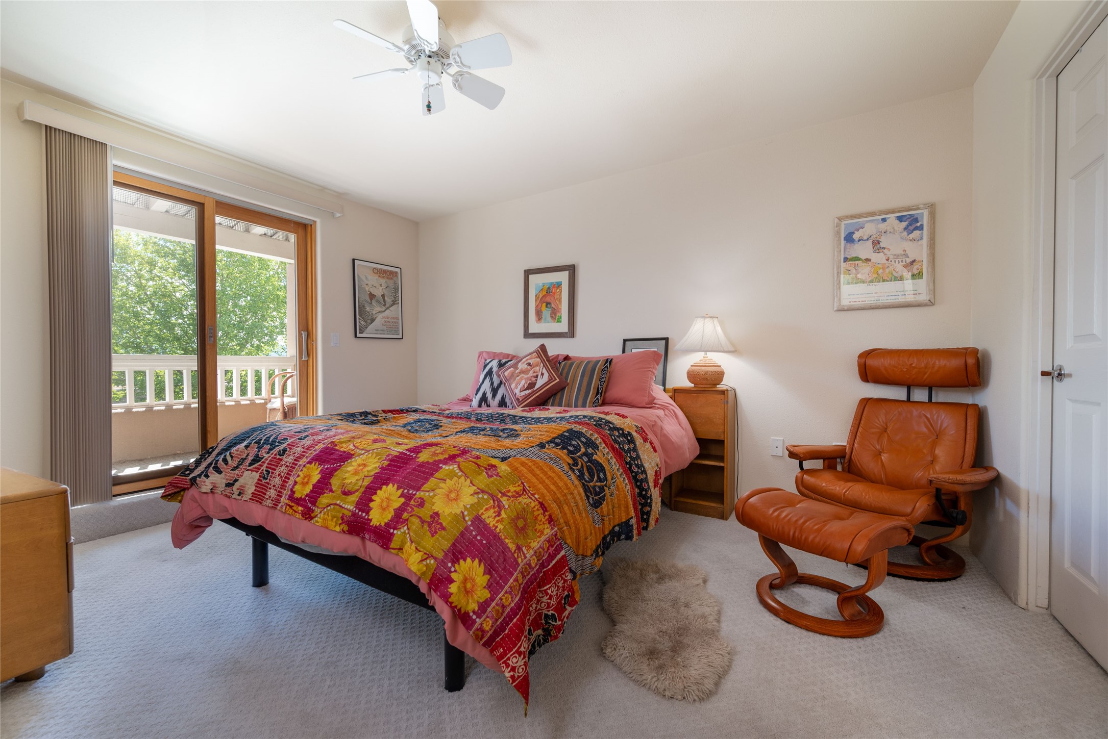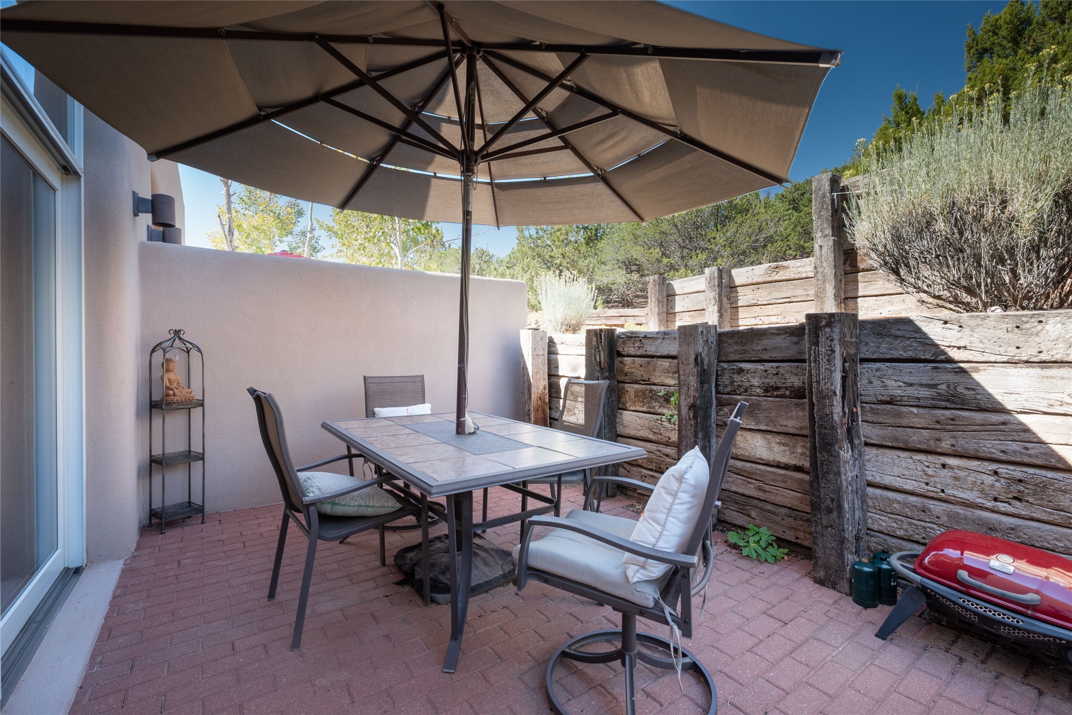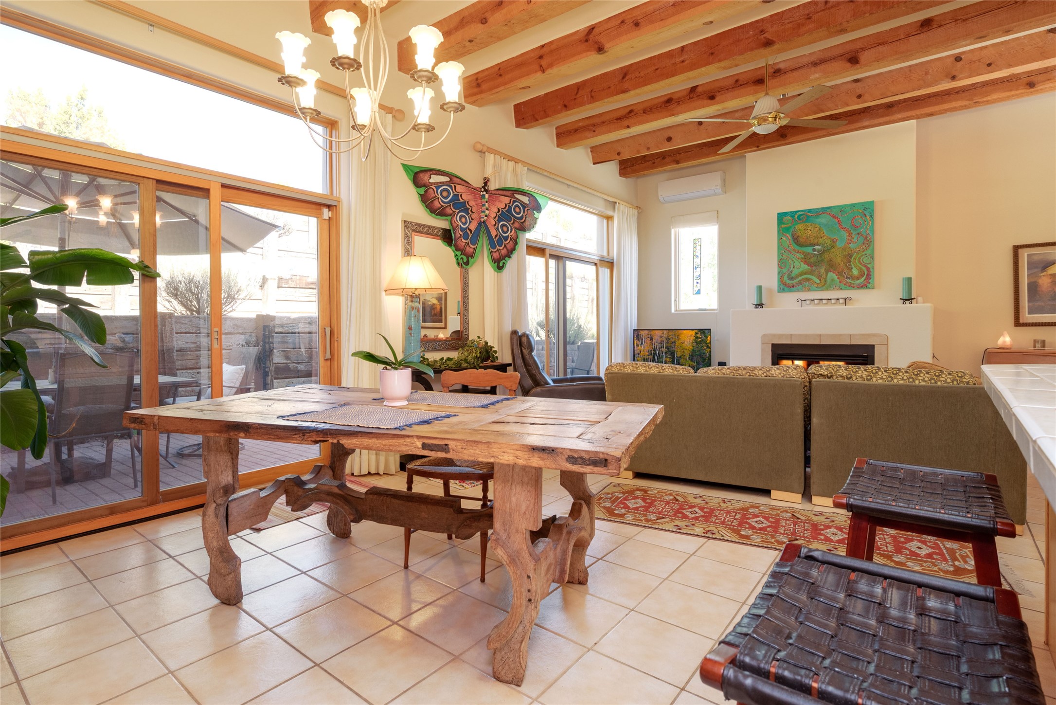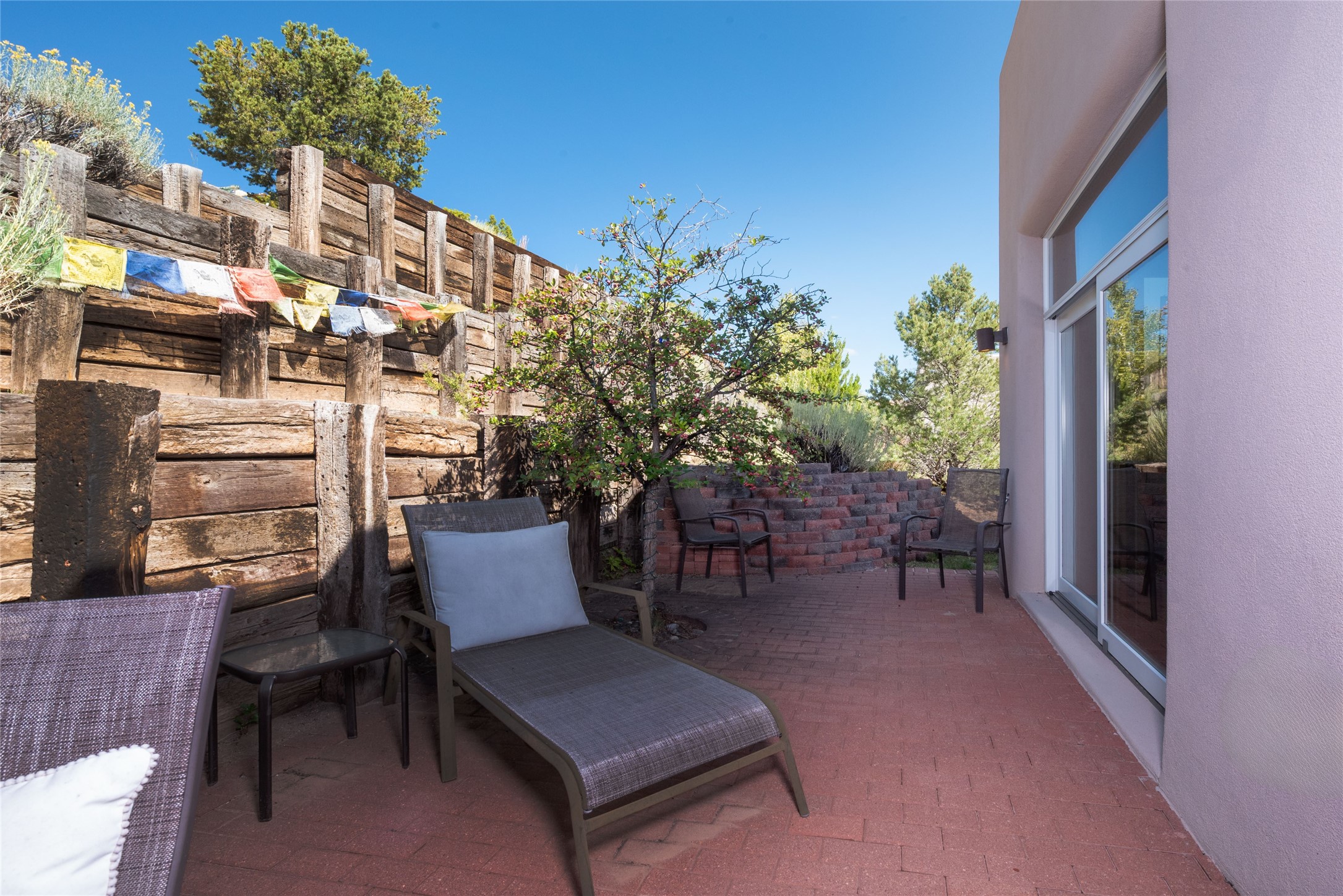 Minutes to De Vargas Mall, Down Town Plaza and Highway 285/84 .This light filled Townhome with spectacular views has it all. The open Living area features Cathedral ceilings, vigas, fireplace and walk out to private courtyard..The radiant floor heating is enhanced with refrigerated ductless A/C heat splits in living room and both upstairs bedrooms. Each Bedroom features en suite baths and the primary bedroom has its own balcony and walk in closet. Other features include skylights, nichos, and parking for guests .. Furniture for sale separately...Don't forget the oversized 2 car garage which offers extra storage space !!