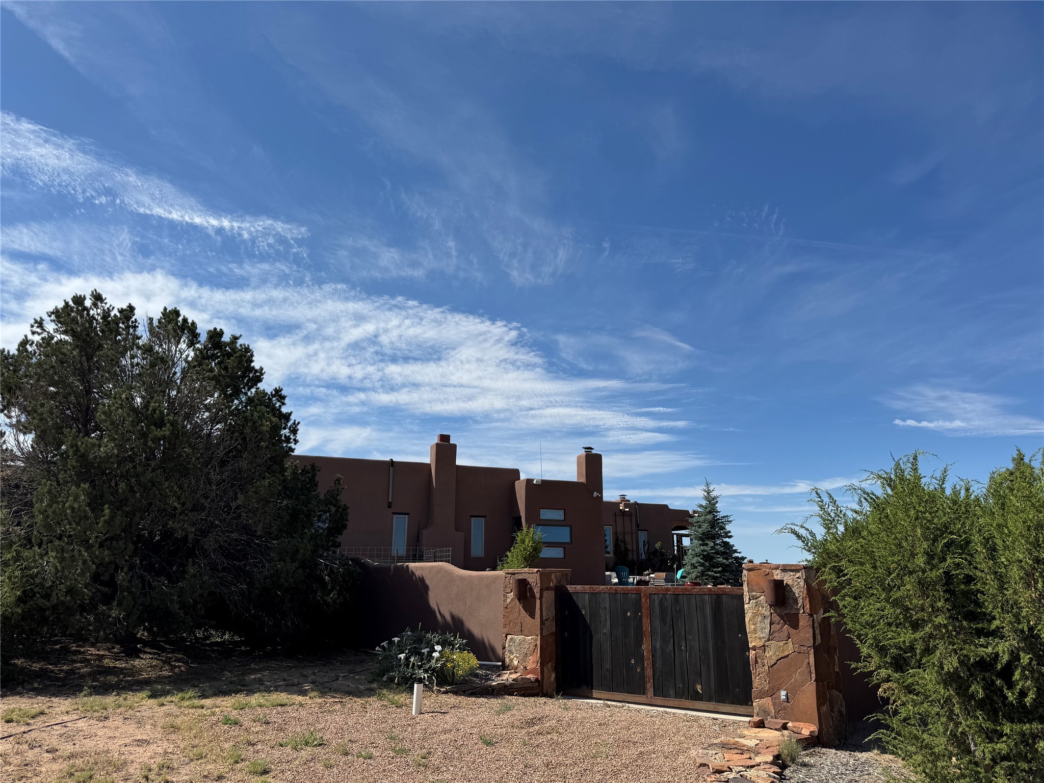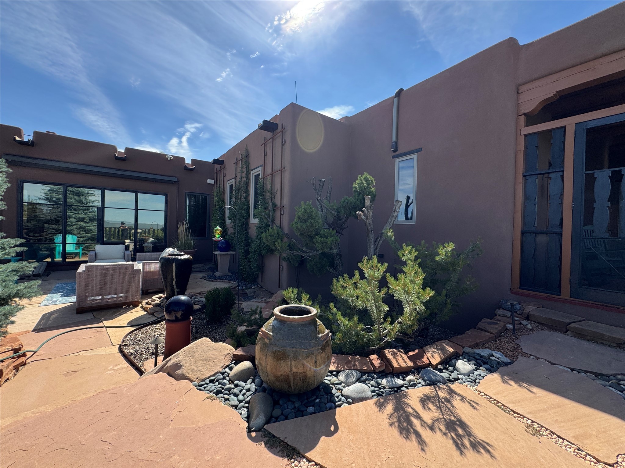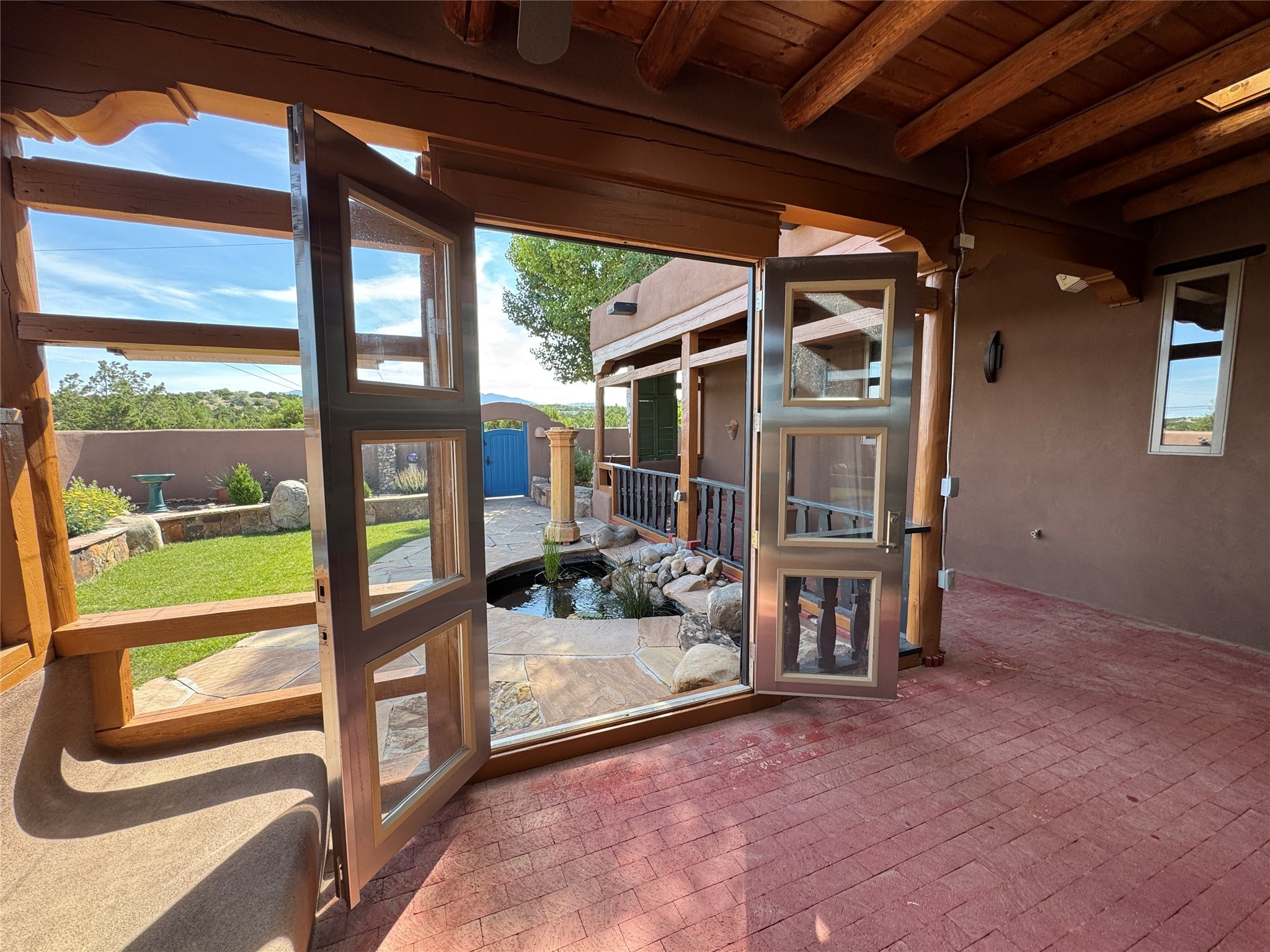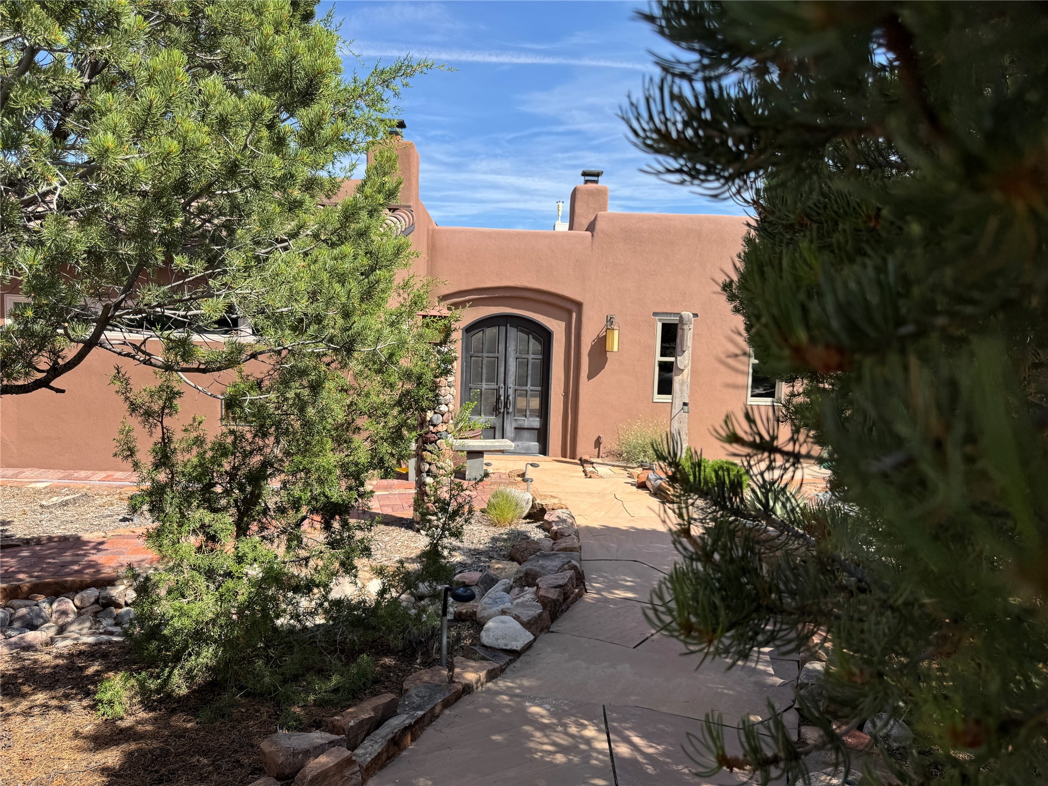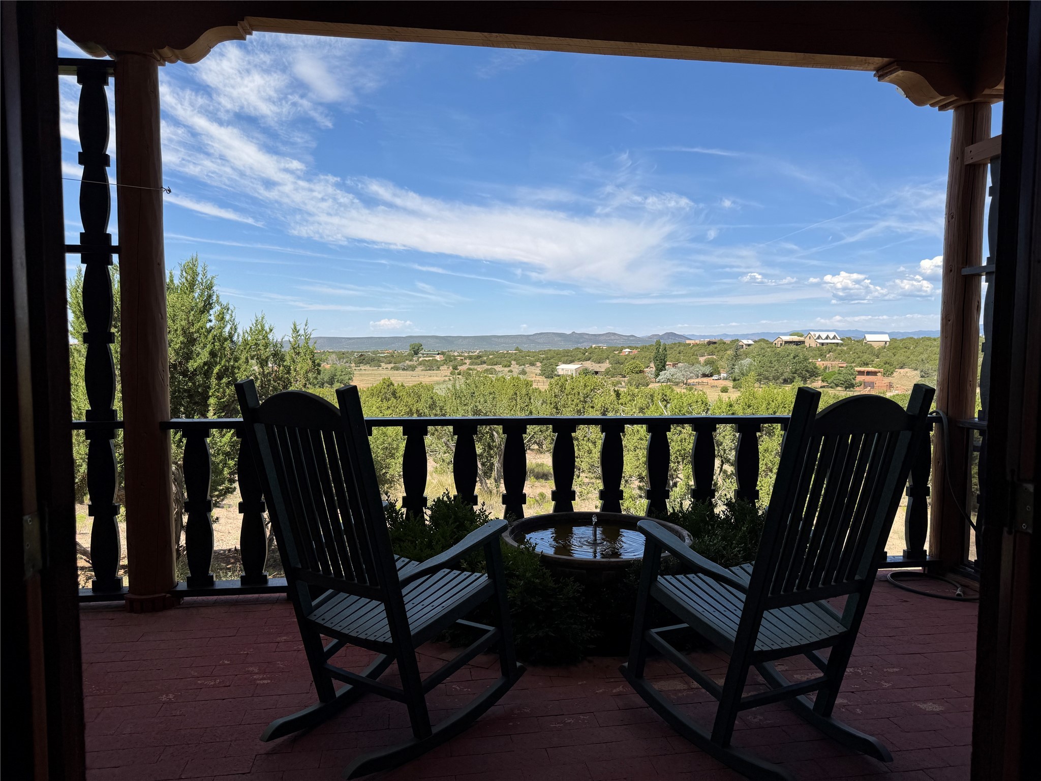 Come discover the beauty of 67 Vallecito Road. This dreamy Santa Fe home is on 3.5 acres with great mountain views only 10 minutes outside of Santa Fe. The home has 3 bedrooms plus a flex room that could be used as an office or additional bedroom with a closet and wood burning kiva fireplace. Other custom features include: Radiant in-floor heating, metal clad insulated wood windows, Italian Tile and Berber Carpet, custom crafted wood interior doors, 3 brick paved portals, viga ceilings with herringbone pine decking and latillas, and 6 custom designed masonry fireplaces. Check out the exquisite chef's kitchen with a large kitchen island, Wolf gas stove, large refrigerator with built-in wine cooler. The interior doorways with scalloped carved archways, and thick recessed wall and nichos give a warm and unique feel to this Northern New Mexico home. The living room and dining rooms flow together nicely and both have doors leading to the outside portals that wrap around the back of the house. There is a dreamy walled patio with a private garden off the dining room that includes a goldfish pond with waterfall, perfect for cozying up with a good book or stargazing at night. The main bedroom also features a fireplace, large soaking tub with mountain views and it's own private portal with a peaceful water feature perfect for relaxing with that first cup of coffee in the morning. An 1800 gallon cistern system catches the rain water draining off the roof, providing water for the irrigation system throughout the yard. E/V charger in garage. Come see and experience this peaceful, high desert oasis with some of the most beautiful sunsets in the Southwest!