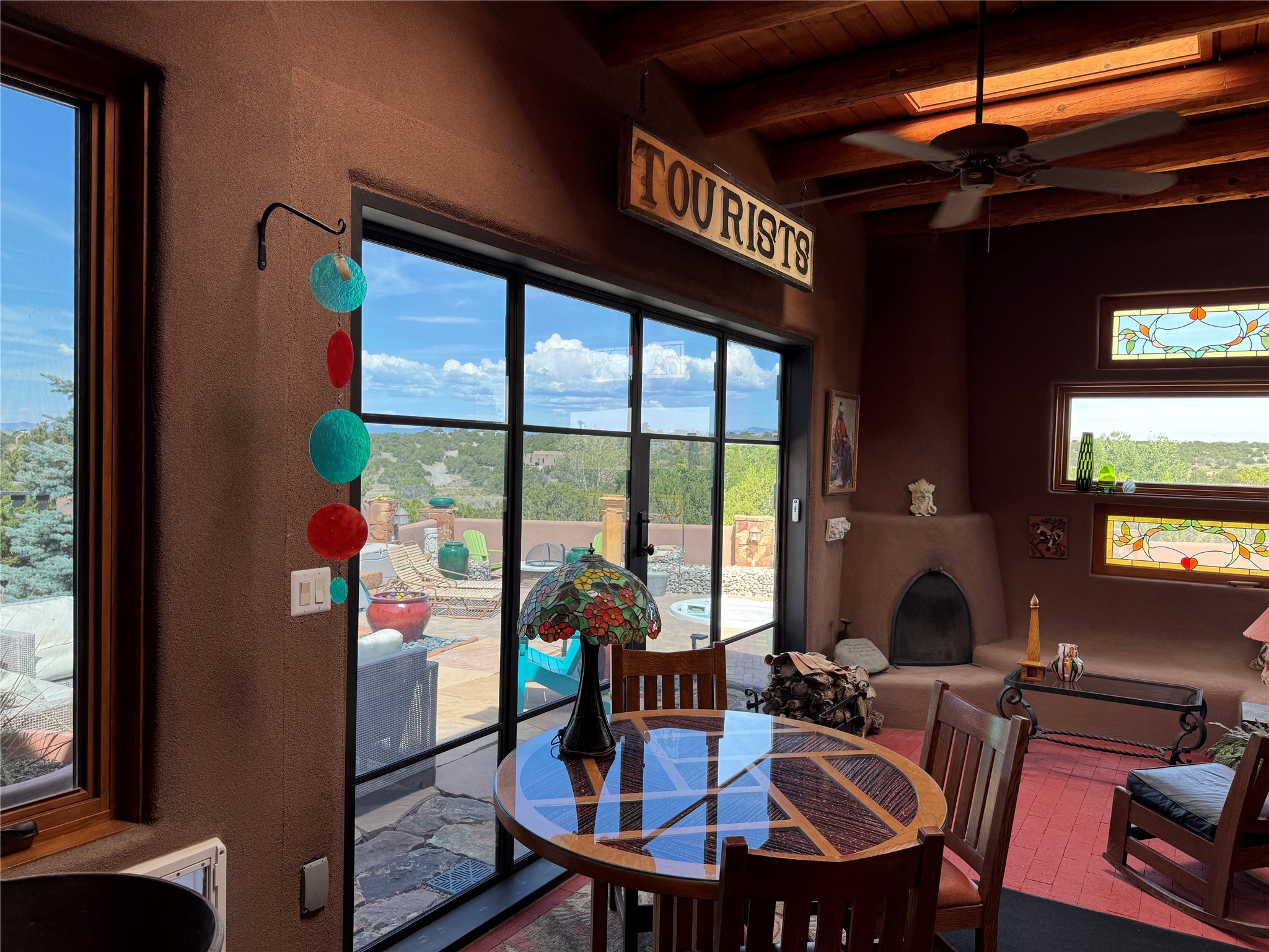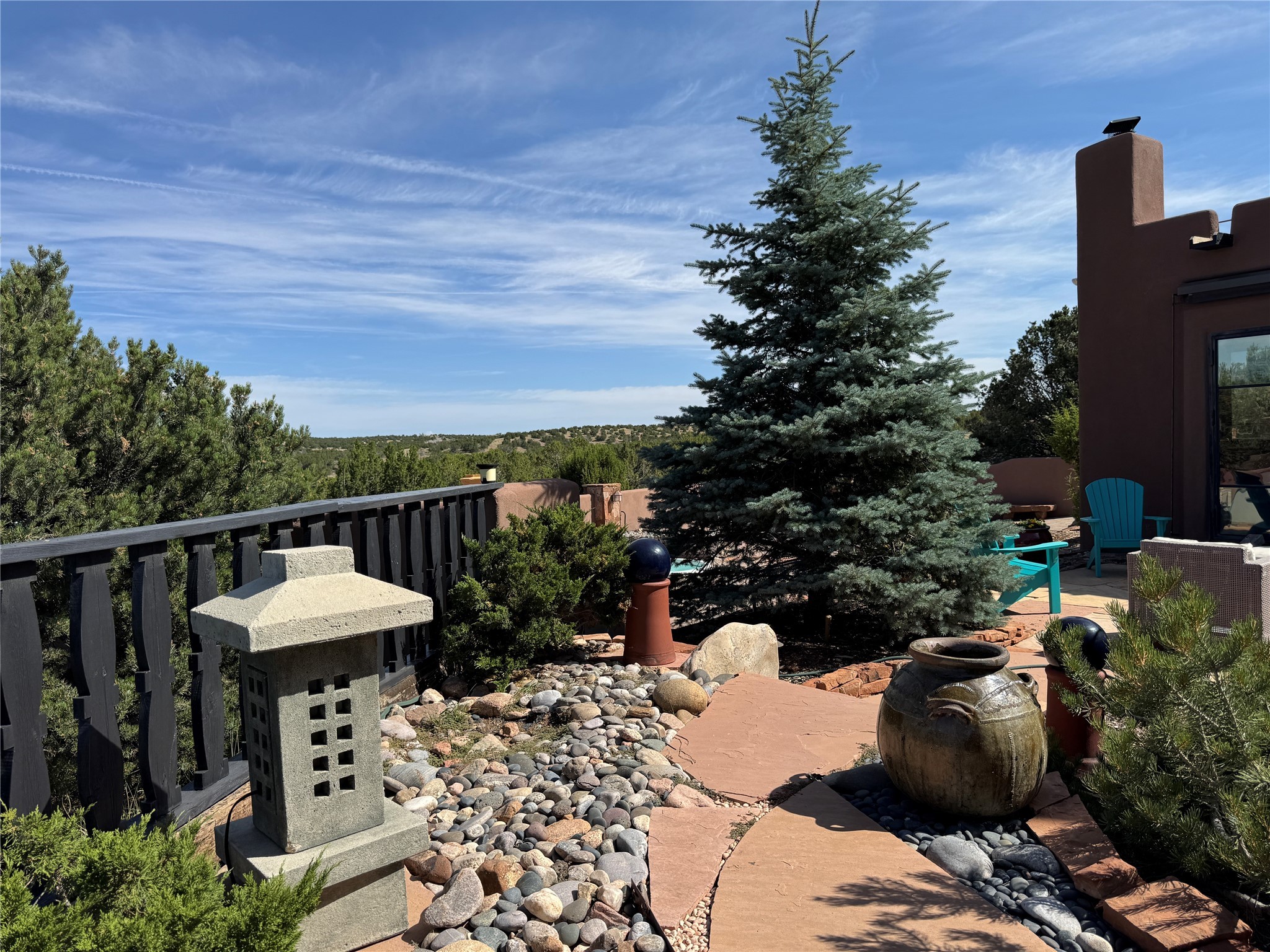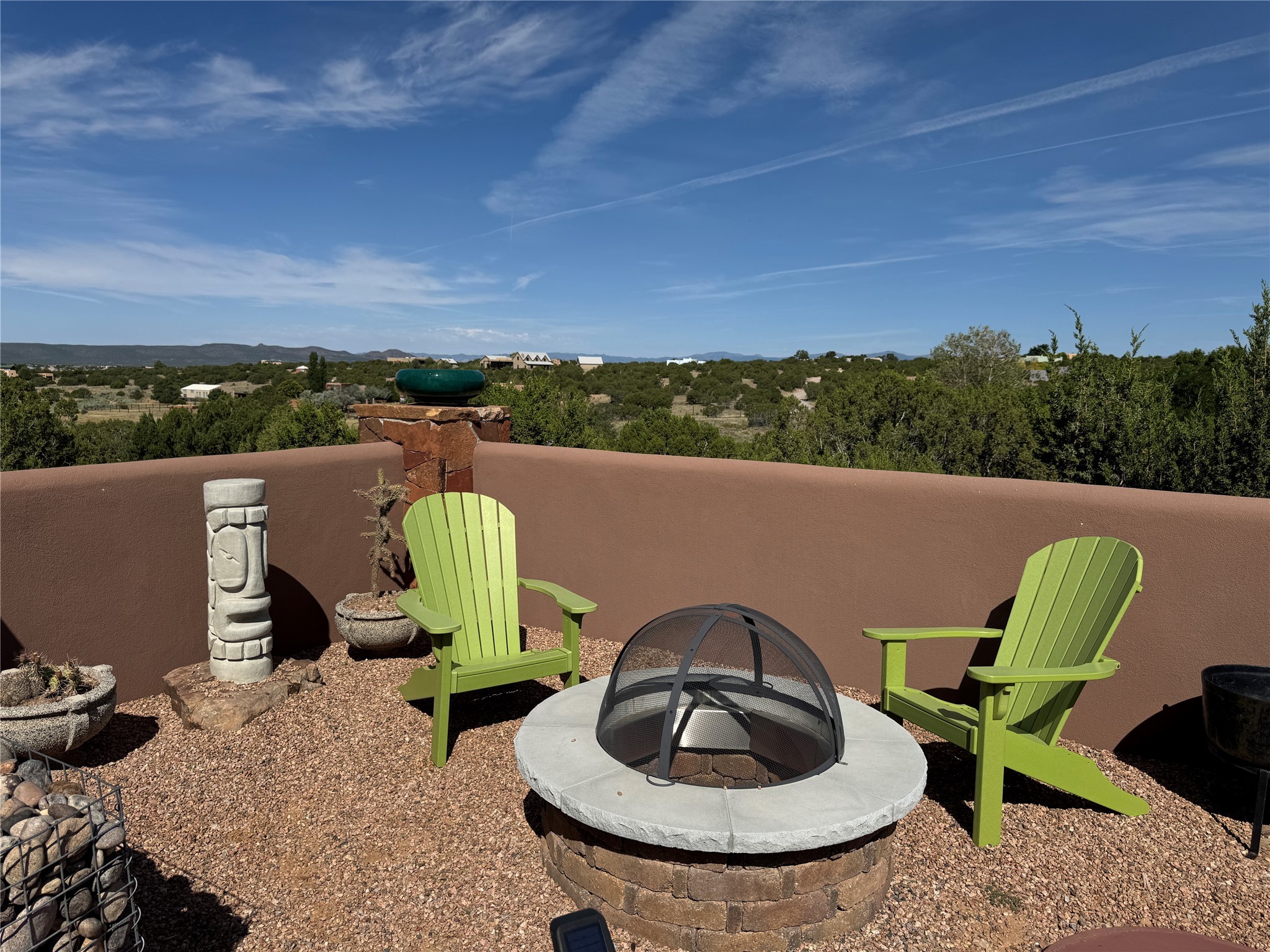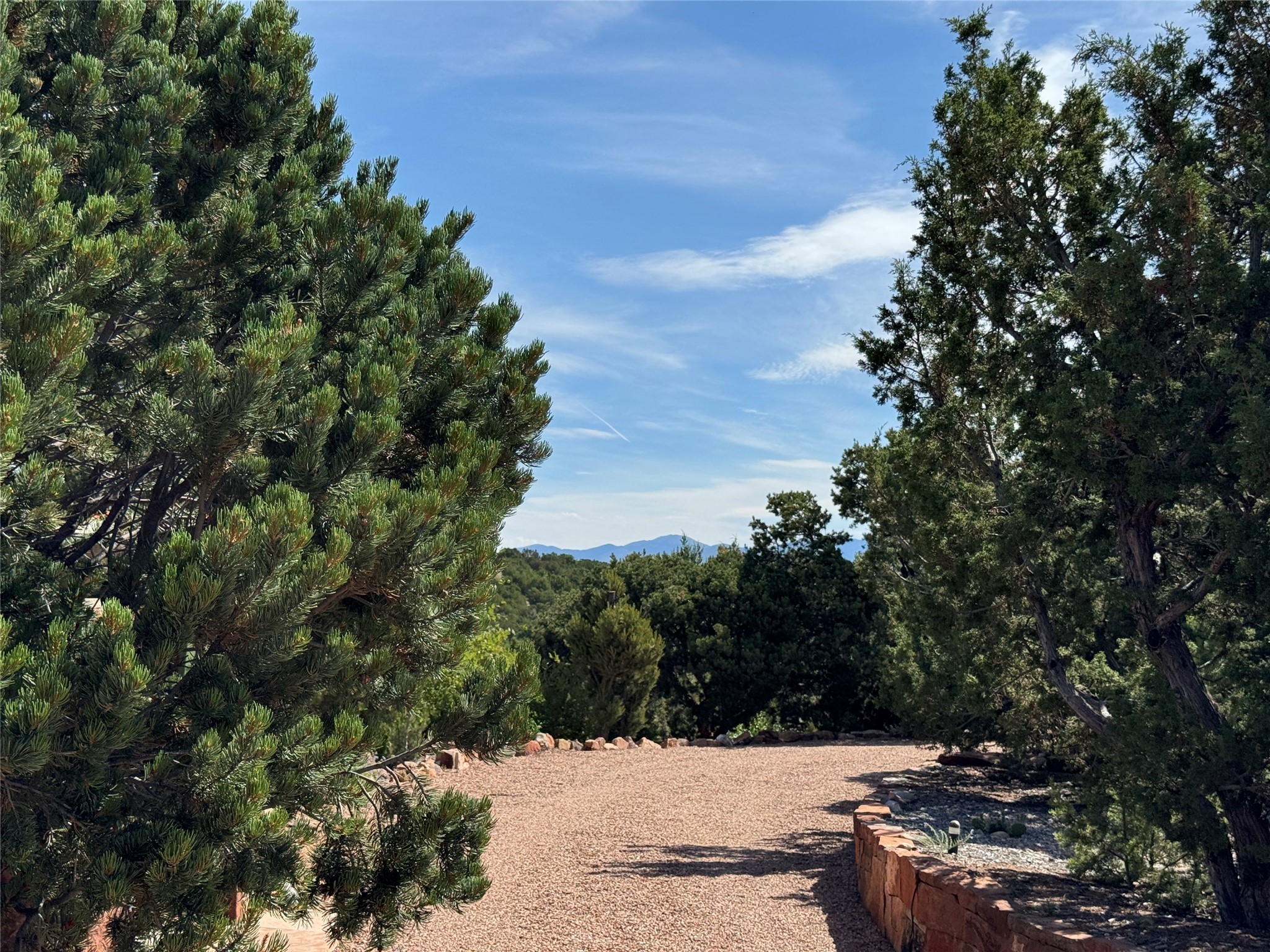 Come discover the beauty of 67 Vallecito Road. This dreamy Santa Fe home is on 3.5 acres with great mountain views only 10 minutes outside of Santa Fe. The home has 3 bedrooms plus a flex room that could be used as an office or additional bedroom with a closet and wood burning kiva fireplace. Other custom features include: Radiant in-floor heating, metal clad insulated wood windows, Italian Tile and Berber Carpet, custom crafted wood interior doors, 3 brick paved portals, viga ceilings with herringbone pine decking and latillas, and 6 custom designed masonry fireplaces. Check out the exquisite chef's kitchen with a large kitchen island, Wolf gas stove, large refrigerator with built-in wine cooler. The interior doorways with scalloped carved archways, and thick recessed wall and nichos give a warm and unique feel to this Northern New Mexico home. The living room and dining rooms flow together nicely and both have doors leading to the outside portals that wrap around the back of the house. There is a dreamy walled patio with a private garden off the dining room that includes a goldfish pond with waterfall, perfect for cozying up with a good book or stargazing at night. The main bedroom also features a fireplace, large soaking tub with mountain views and it's own private portal with a peaceful water feature perfect for relaxing with that first cup of coffee in the morning. An 1800 gallon cistern system catches the rain water draining off the roof, providing water for the irrigation system throughout the yard. E/V charger in garage. Come see and experience this peaceful, high desert oasis with some of the most beautiful sunsets in the Southwest!