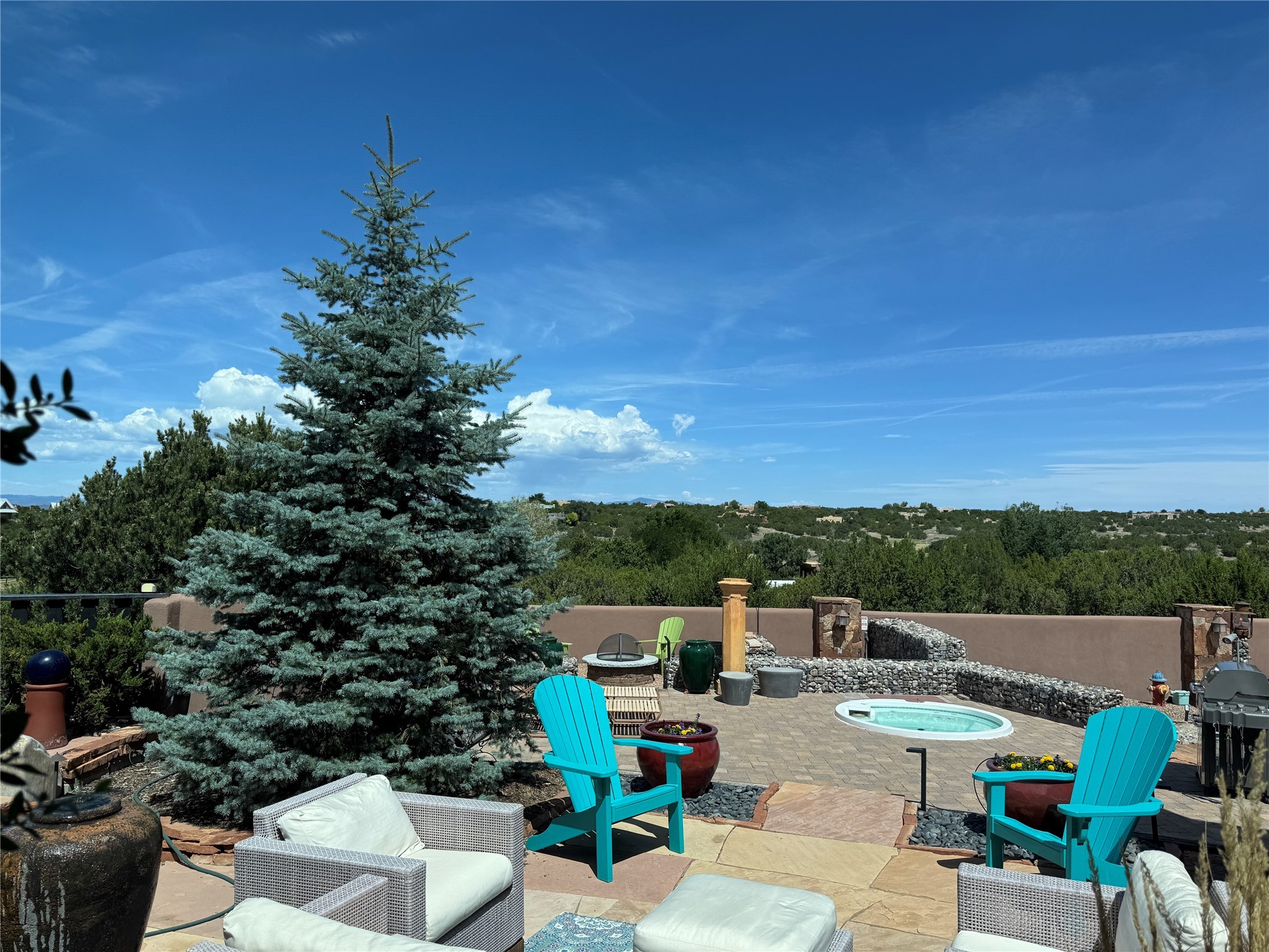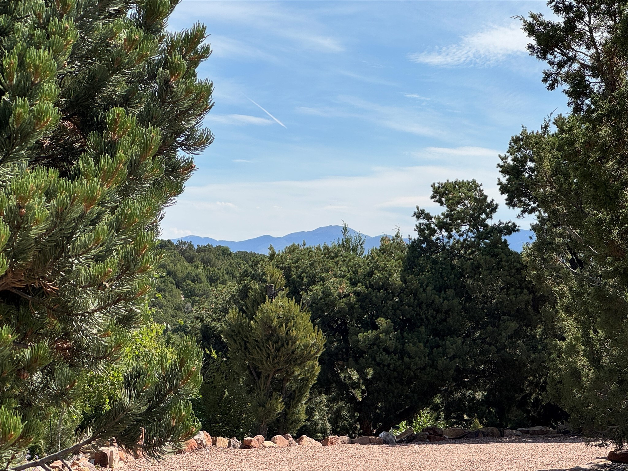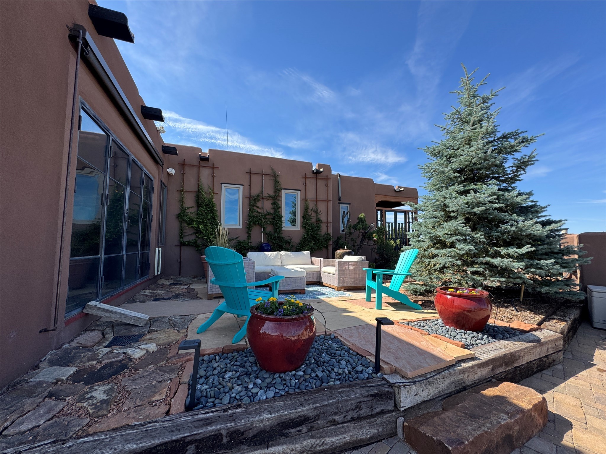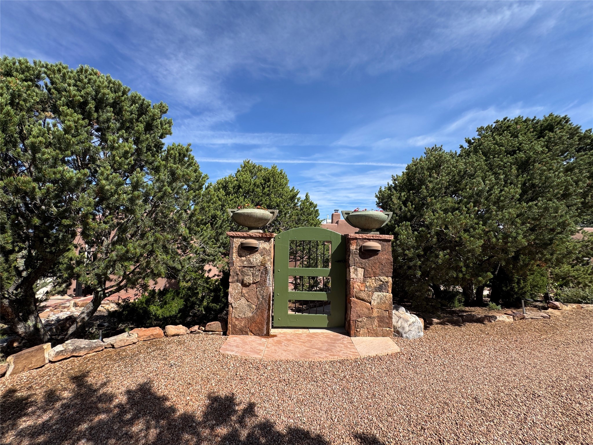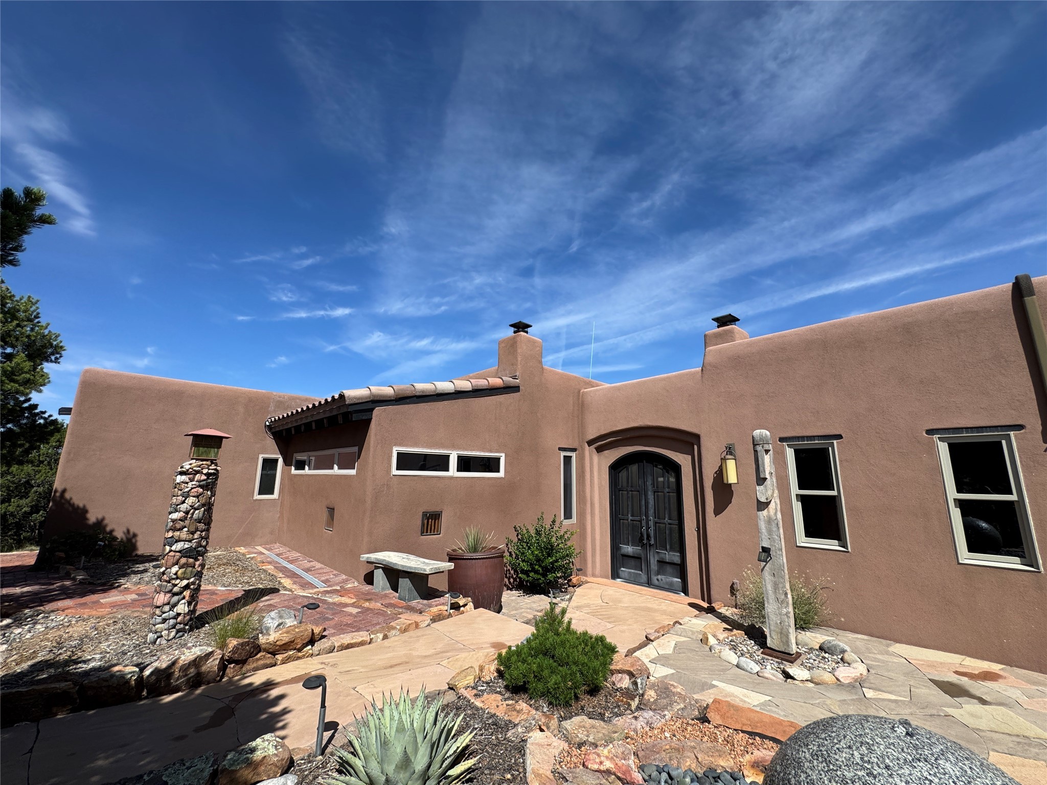 Come discover the beauty of 67 Vallecito Road. This dreamy Santa Fe home is on 3.5 acres with great mountain views only 10 minutes outside of Santa Fe. The home has 3 bedrooms plus a flex room that could be used as an office or additional bedroom with a closet and wood burning kiva fireplace. Other custom features include: Radiant in-floor heating, metal clad insulated wood windows, Italian Tile and Berber Carpet, custom crafted wood interior doors, 3 brick paved portals, viga ceilings with herringbone pine decking and latillas, and 6 custom designed masonry fireplaces. Check out the exquisite chef's kitchen with a large kitchen island, Wolf gas stove, large refrigerator with built-in wine cooler. The interior doorways with scalloped carved archways, and thick recessed wall and nichos give a warm and unique feel to this Northern New Mexico home. The living room and dining rooms flow together nicely and both have doors leading to the outside portals that wrap around the back of the house. There is a dreamy walled patio with a private garden off the dining room that includes a goldfish pond with waterfall, perfect for cozying up with a good book or stargazing at night. The main bedroom also features a fireplace, large soaking tub with mountain views and it's own private portal with a peaceful water feature perfect for relaxing with that first cup of coffee in the morning. An 1800 gallon cistern system catches the rain water draining off the roof, providing water for the irrigation system throughout the yard. E/V charger in garage. Come see and experience this peaceful, high desert oasis with some of the most beautiful sunsets in the Southwest!