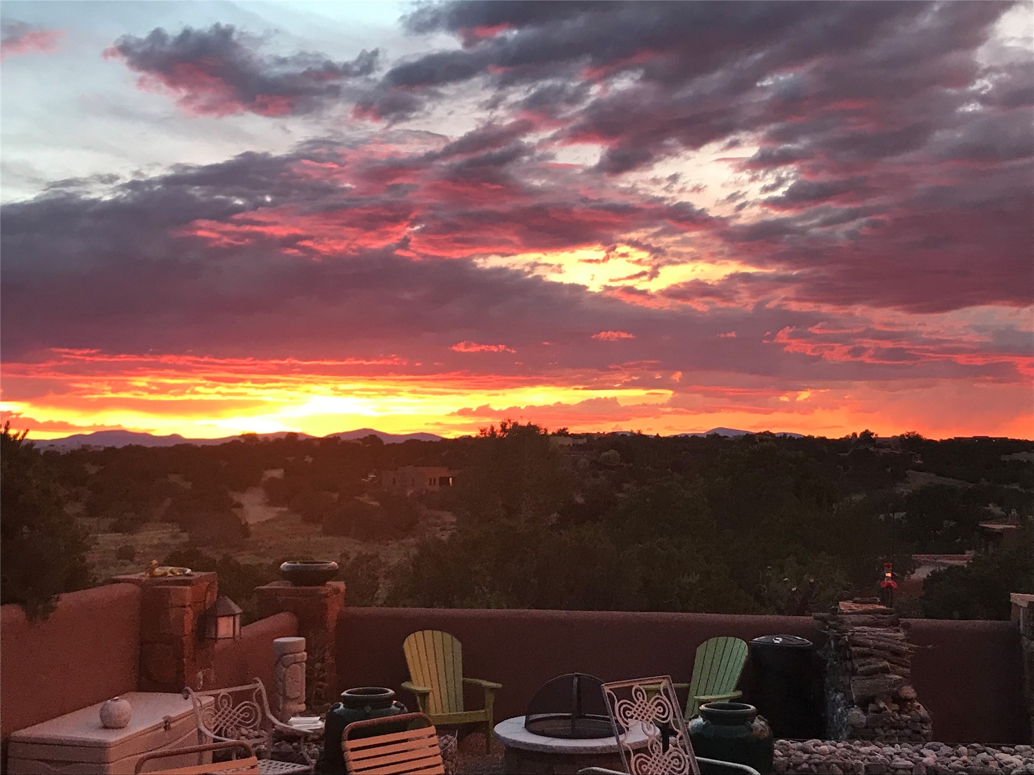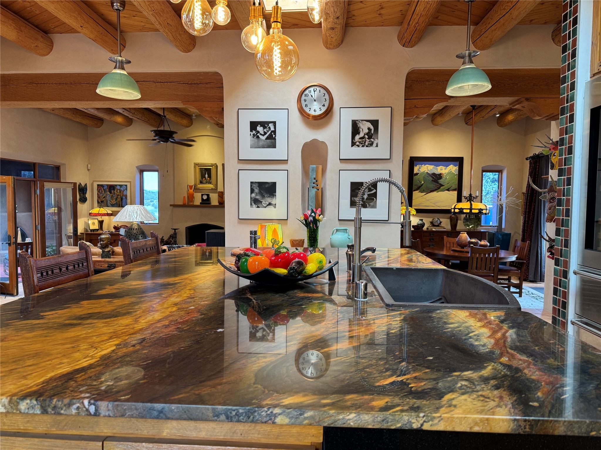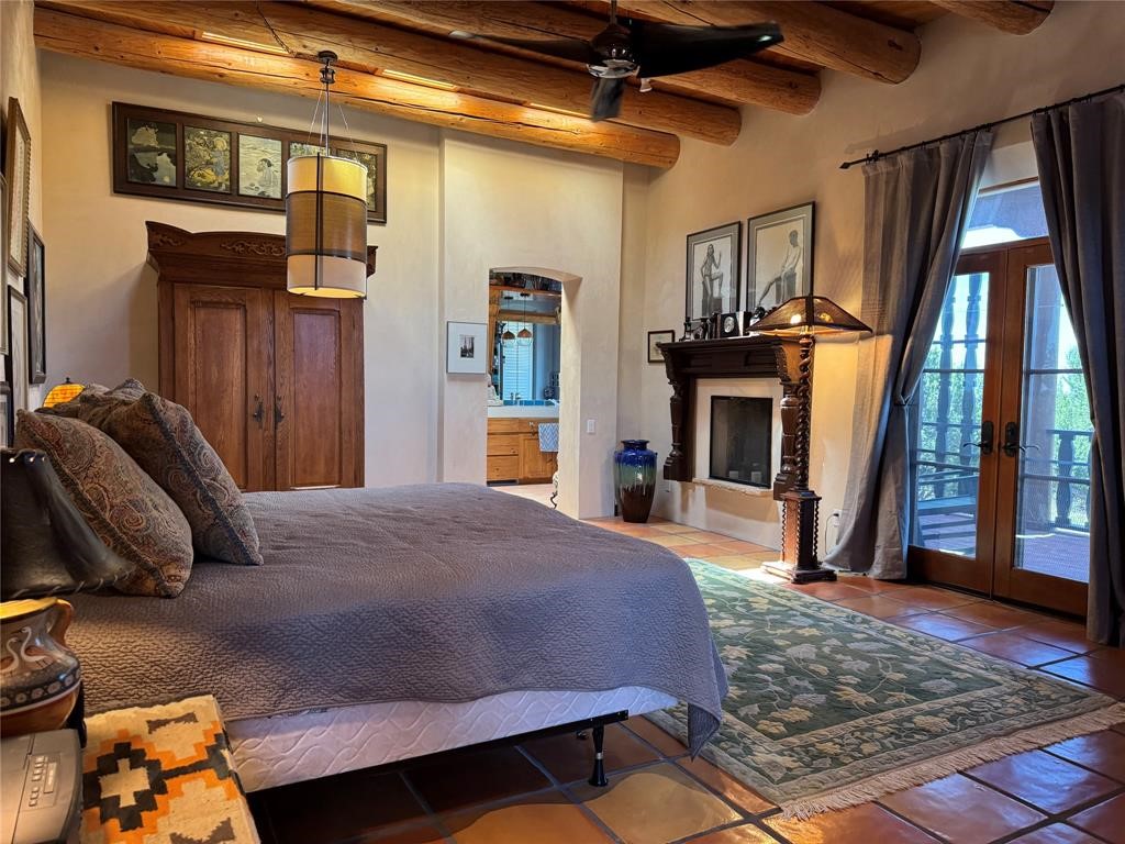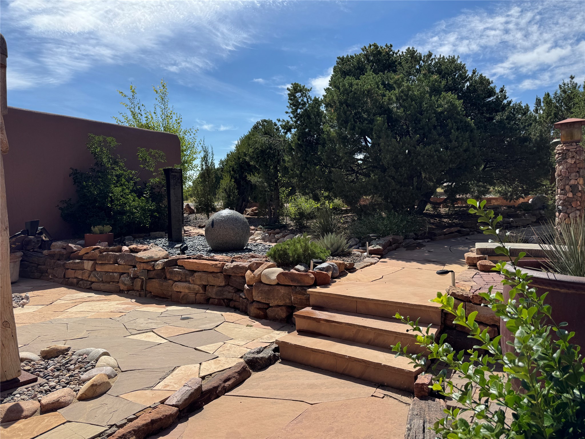 Come discover the beauty of 67 Vallecito Road. This dreamy Santa Fe home is on 3.5 acres with great mountain views only 10 minutes outside of Santa Fe. The home has 3 bedrooms plus a flex room that could be used as an office or additional bedroom with a closet and wood burning kiva fireplace. Other custom features include: Radiant in-floor heating, metal clad insulated wood windows, Italian Tile and Berber Carpet, custom crafted wood interior doors, 3 brick paved portals, viga ceilings with herringbone pine decking and latillas, and 6 custom designed masonry fireplaces. Check out the exquisite chef's kitchen with a large kitchen island, Wolf gas stove, large refrigerator with built-in wine cooler. The interior doorways with scalloped carved archways, and thick recessed wall and nichos give a warm and unique feel to this Northern New Mexico home. The living room and dining rooms flow together nicely and both have doors leading to the outside portals that wrap around the back of the house. There is a dreamy walled patio with a private garden off the dining room that includes a goldfish pond with waterfall, perfect for cozying up with a good book or stargazing at night. The main bedroom also features a fireplace, large soaking tub with mountain views and it's own private portal with a peaceful water feature perfect for relaxing with that first cup of coffee in the morning. An 1800 gallon cistern system catches the rain water draining off the roof, providing water for the irrigation system throughout the yard. E/V charger in garage. Come see and experience this peaceful, high desert oasis with some of the most beautiful sunsets in the Southwest!