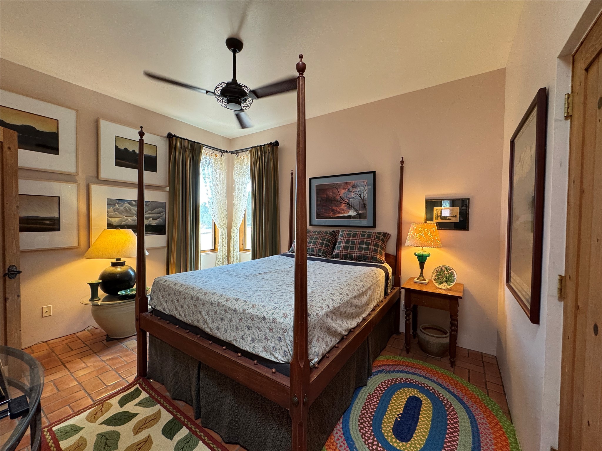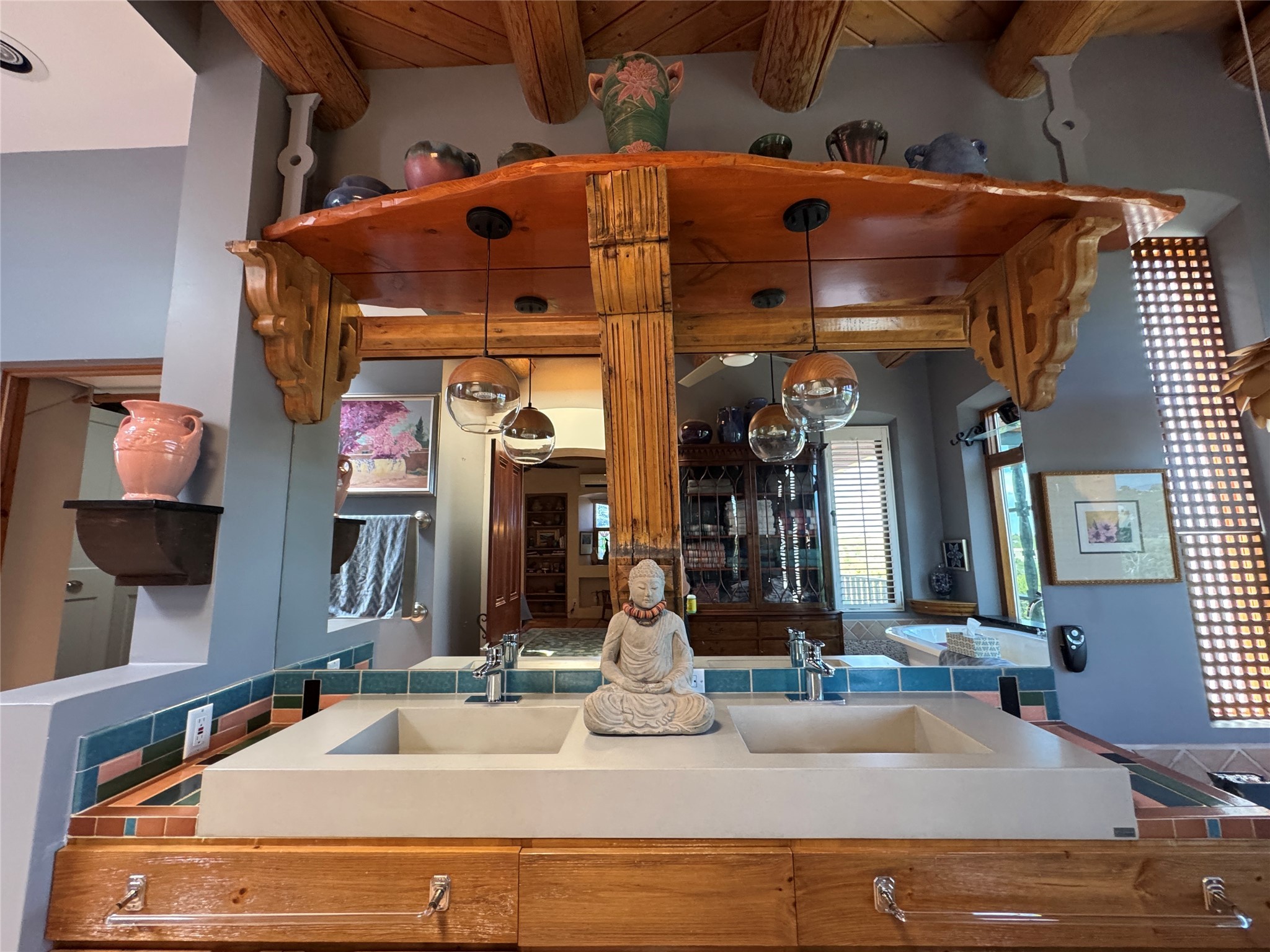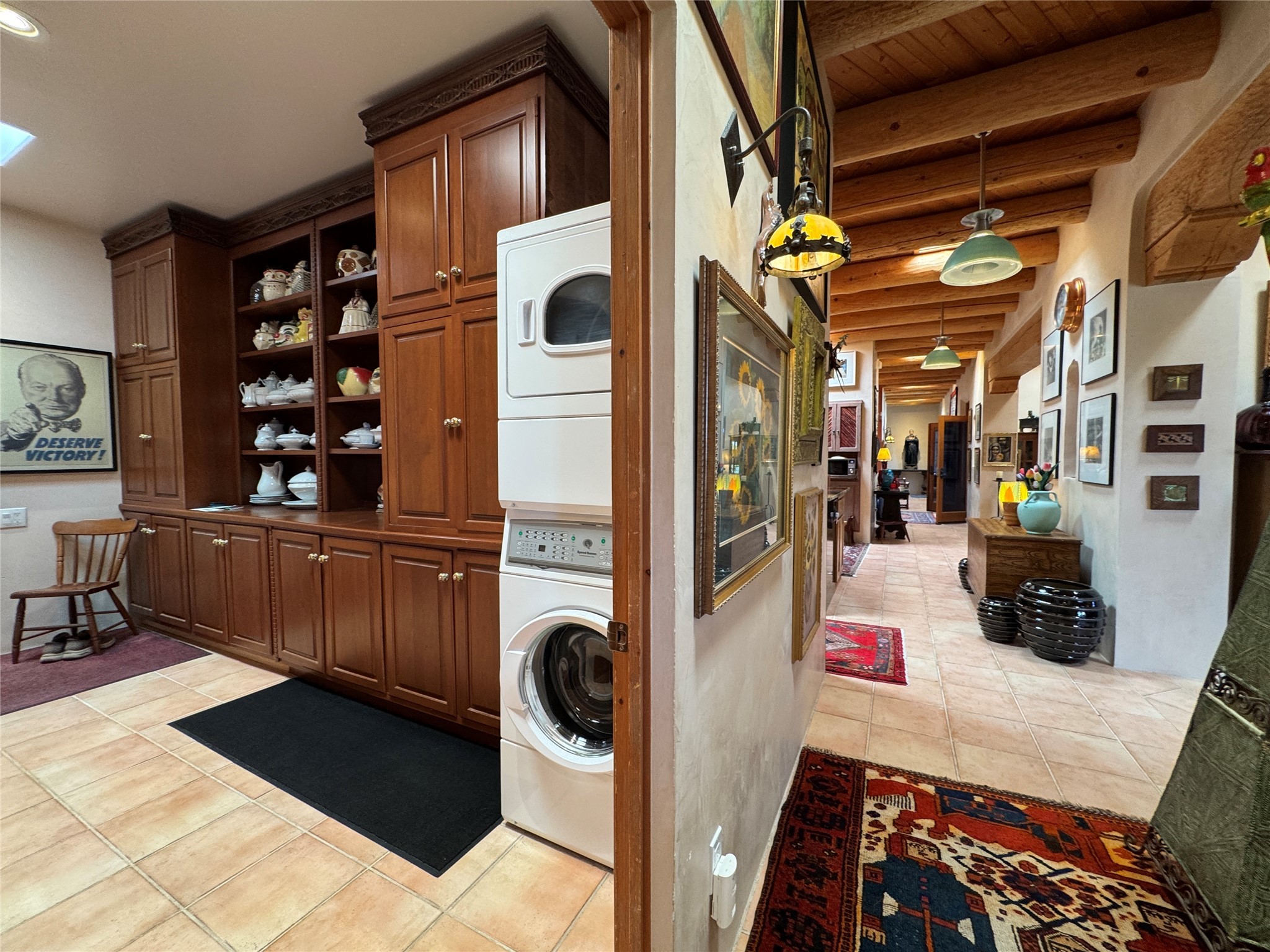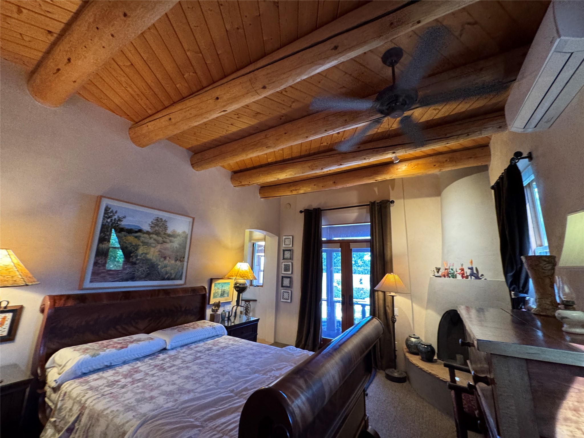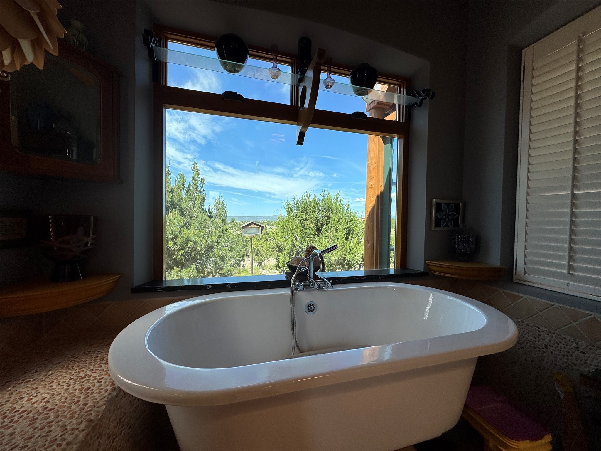 Come discover the beauty of 67 Vallecito Road. This dreamy Santa Fe home is on 3.5 acres with great mountain views only 10 minutes outside of Santa Fe. The home has 3 bedrooms plus a flex room that could be used as an office or additional bedroom with a closet and wood burning kiva fireplace. Other custom features include: Radiant in-floor heating, metal clad insulated wood windows, Italian Tile and Berber Carpet, custom crafted wood interior doors, 3 brick paved portals, viga ceilings with herringbone pine decking and latillas, and 6 custom designed masonry fireplaces. Check out the exquisite chef's kitchen with a large kitchen island, Wolf gas stove, large refrigerator with built-in wine cooler. The interior doorways with scalloped carved archways, and thick recessed wall and nichos give a warm and unique feel to this Northern New Mexico home. The living room and dining rooms flow together nicely and both have doors leading to the outside portals that wrap around the back of the house. There is a dreamy walled patio with a private garden off the dining room that includes a goldfish pond with waterfall, perfect for cozying up with a good book or stargazing at night. The main bedroom also features a fireplace, large soaking tub with mountain views and it's own private portal with a peaceful water feature perfect for relaxing with that first cup of coffee in the morning. An 1800 gallon cistern system catches the rain water draining off the roof, providing water for the irrigation system throughout the yard. E/V charger in garage. Come see and experience this peaceful, high desert oasis with some of the most beautiful sunsets in the Southwest!