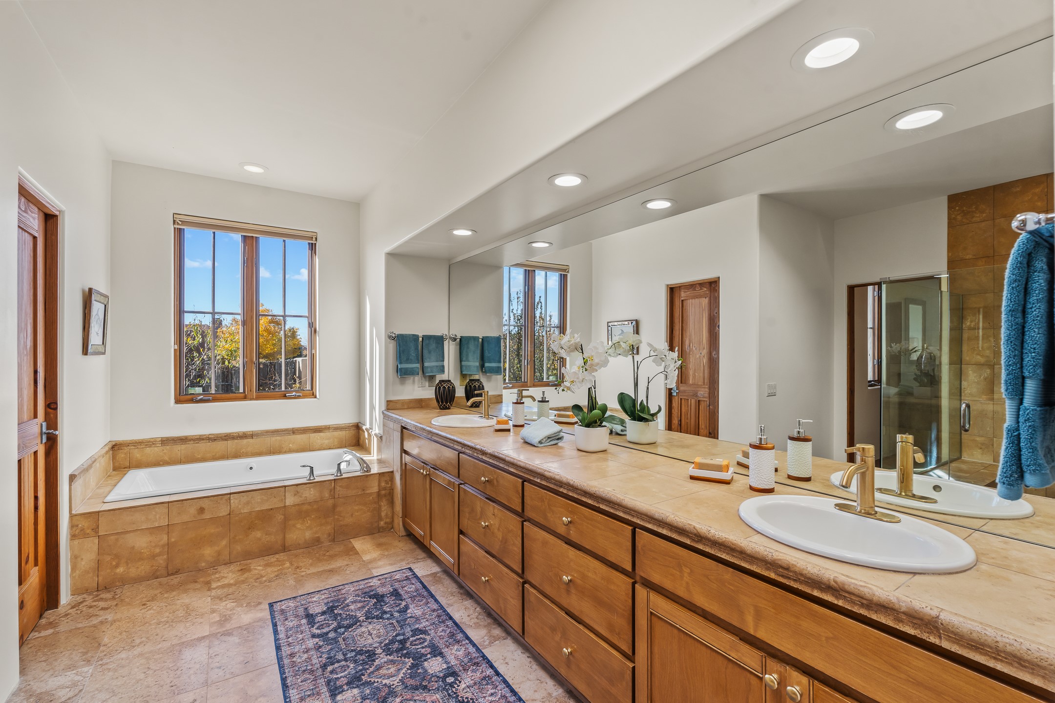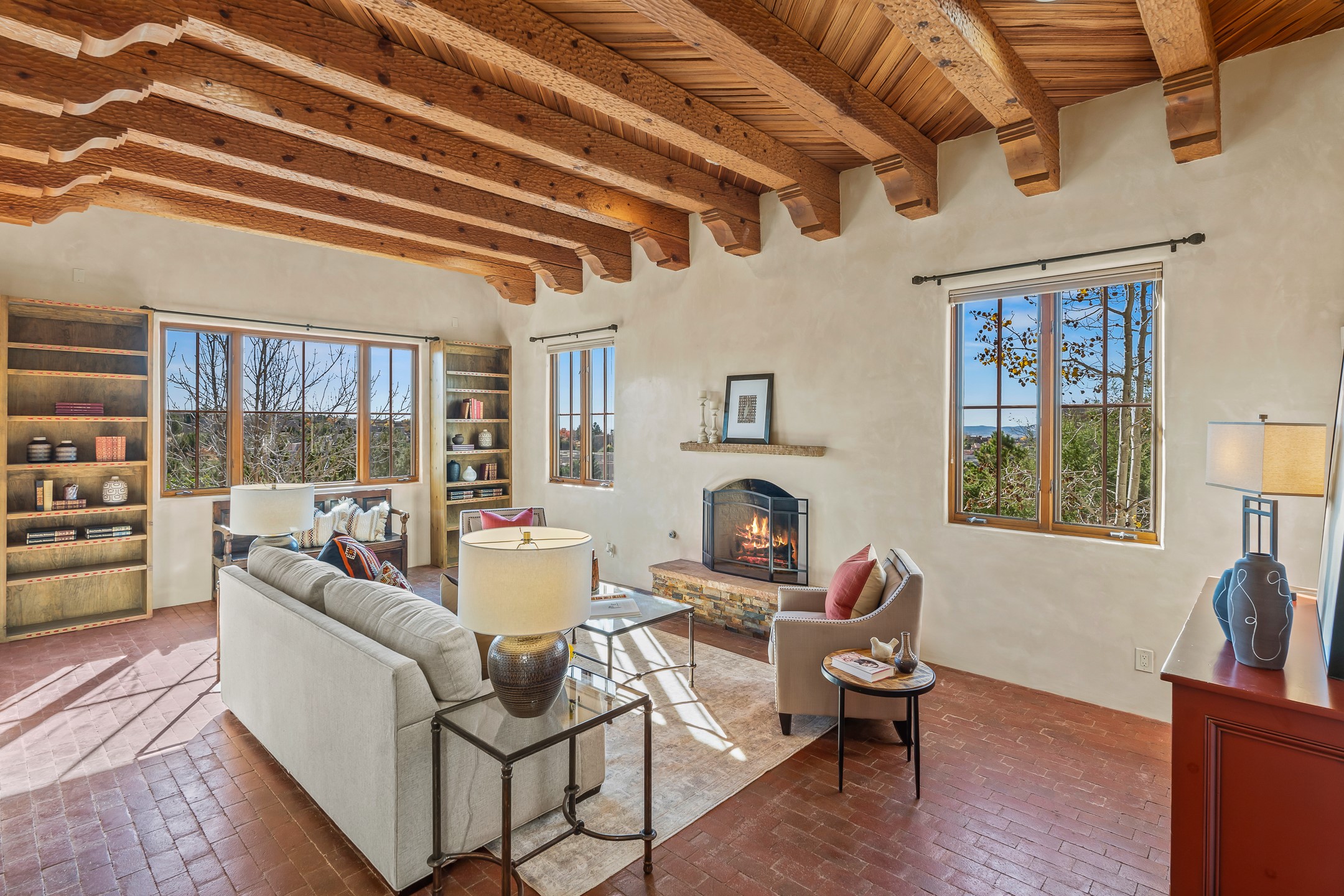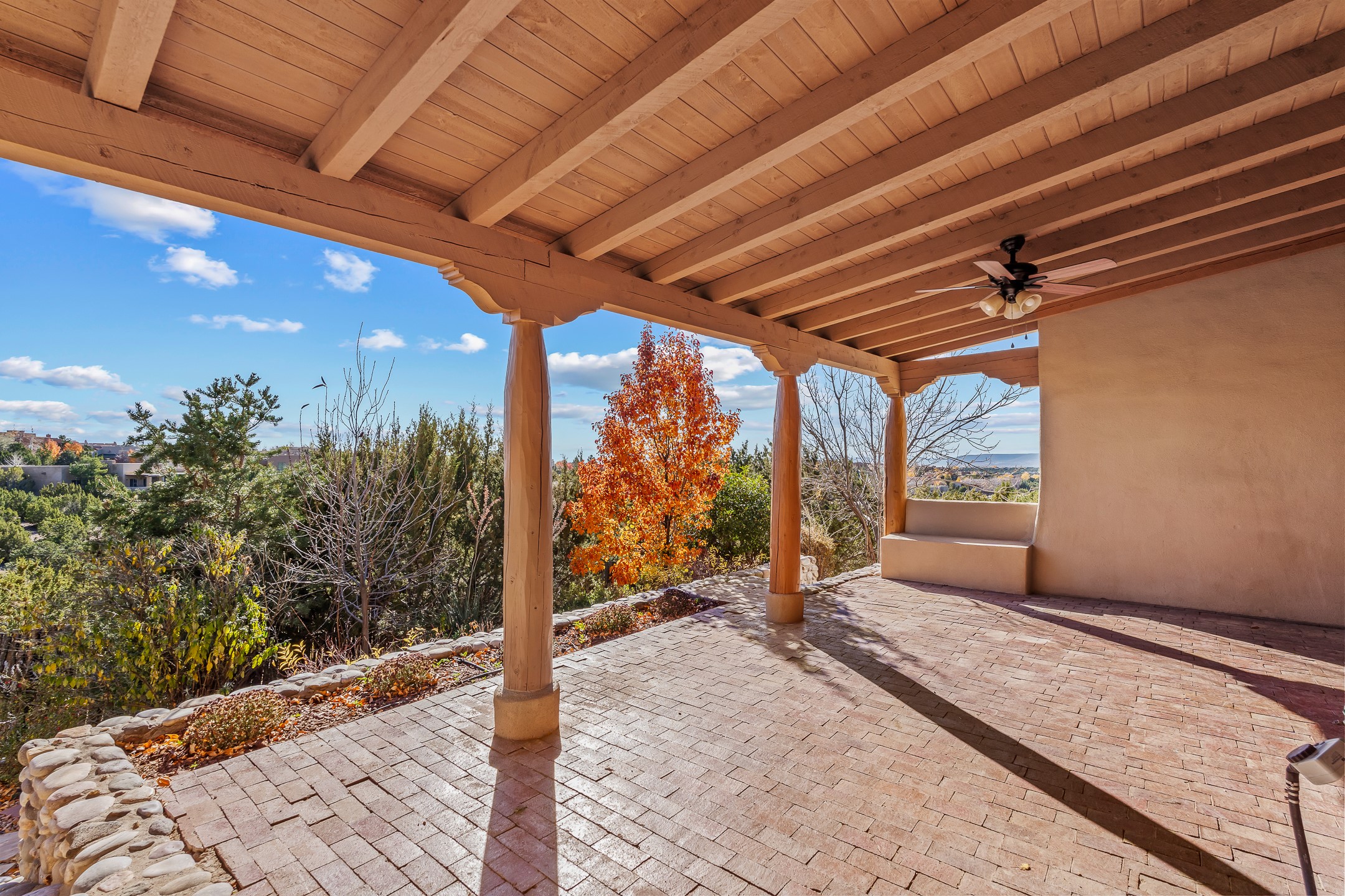 42 E. Va Plaza Nueva offers a warm embrace of classic Santa Fe style within the highly desirable community of Aldea de Santa Fe. This 2,392-square-foot residence features 3 bedrooms, 2.5 baths, and a 2-car garage, blending timeless craftsmanship with inviting indoor-outdoor living.Enter through a private front courtyard and step into a home rich with Old World charm. Brick and tile floors run throughout, complementing the carved wood beams, vigas, and hand-troweled plaster walls in the main living areas. The expansive living room feels gracious and grounded, ideal for quiet evenings or elegant entertaining.The third bedroom, with its own separate entrance and cozy fireplace, offers versatility--perfect as a guest suite or a comfortable home office with added privacy.The kitchen is appointed with wood cabinetry, a gas cooktop and vent hood, double wall ovens, and granite counters accented by tile surrounds. A cozy breakfast nook creates an inviting place to savor your morning coffee.Designed for Santa Fe's coveted lifestyle, the home's outdoor living and dining spaces are surrounded by mature landscaping and back up to open space, creating a serene setting with views to the Sandias to enjoy year-round.Located in desirable Aldea de Santa Fe, a vibrant village-style community, residents enjoy 13 miles of walking trails, extensive shared open space, a community center, and tennis, basketball, and bocce courts. Neighborhood life is enhanced further with annual art tours, community garage sales, and a variety of active clubs--participate as much or as little as you like.This home embodies the warmth, texture, and tradition of Old Santa Fe while offering the amenities of a welcoming, engaged community.