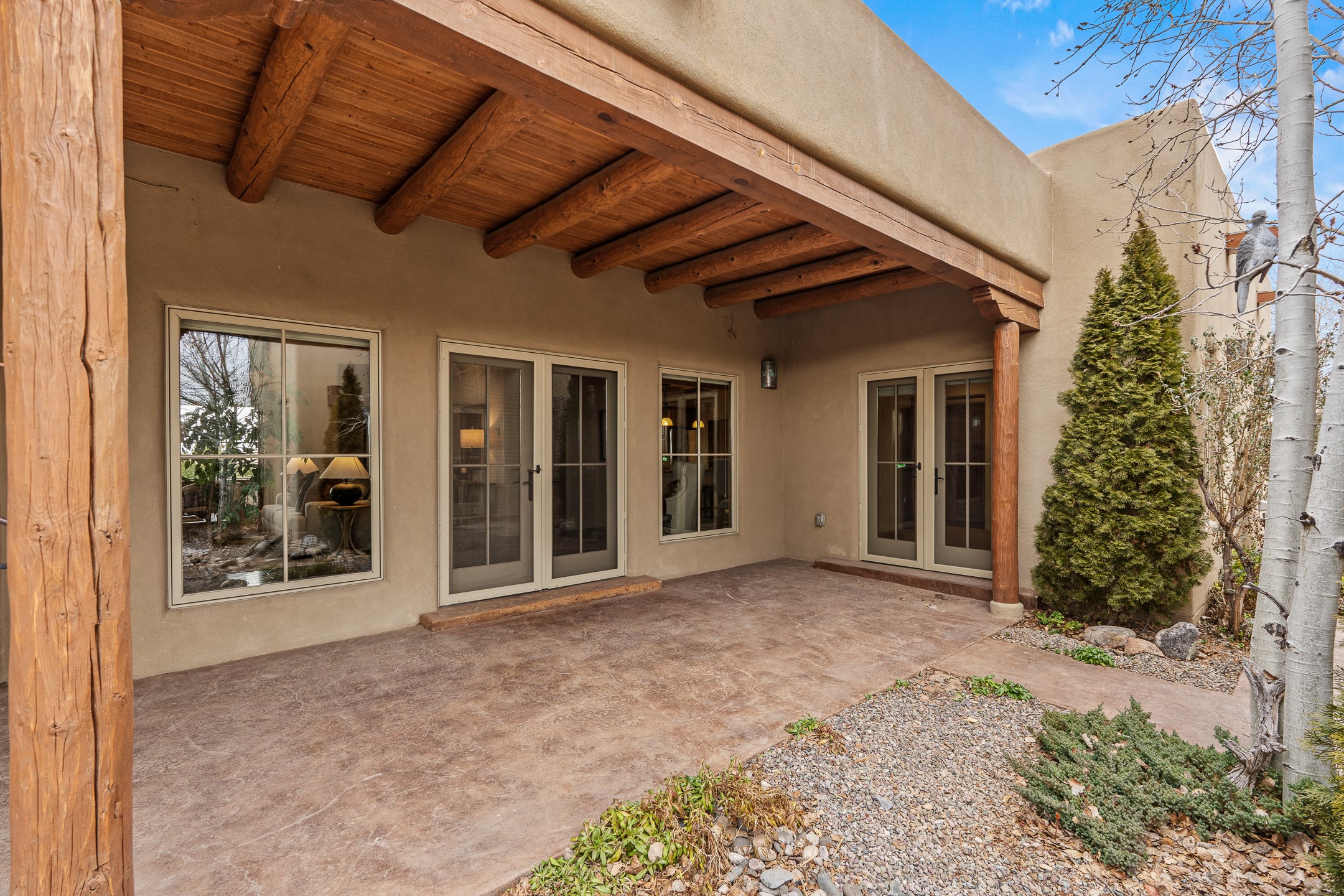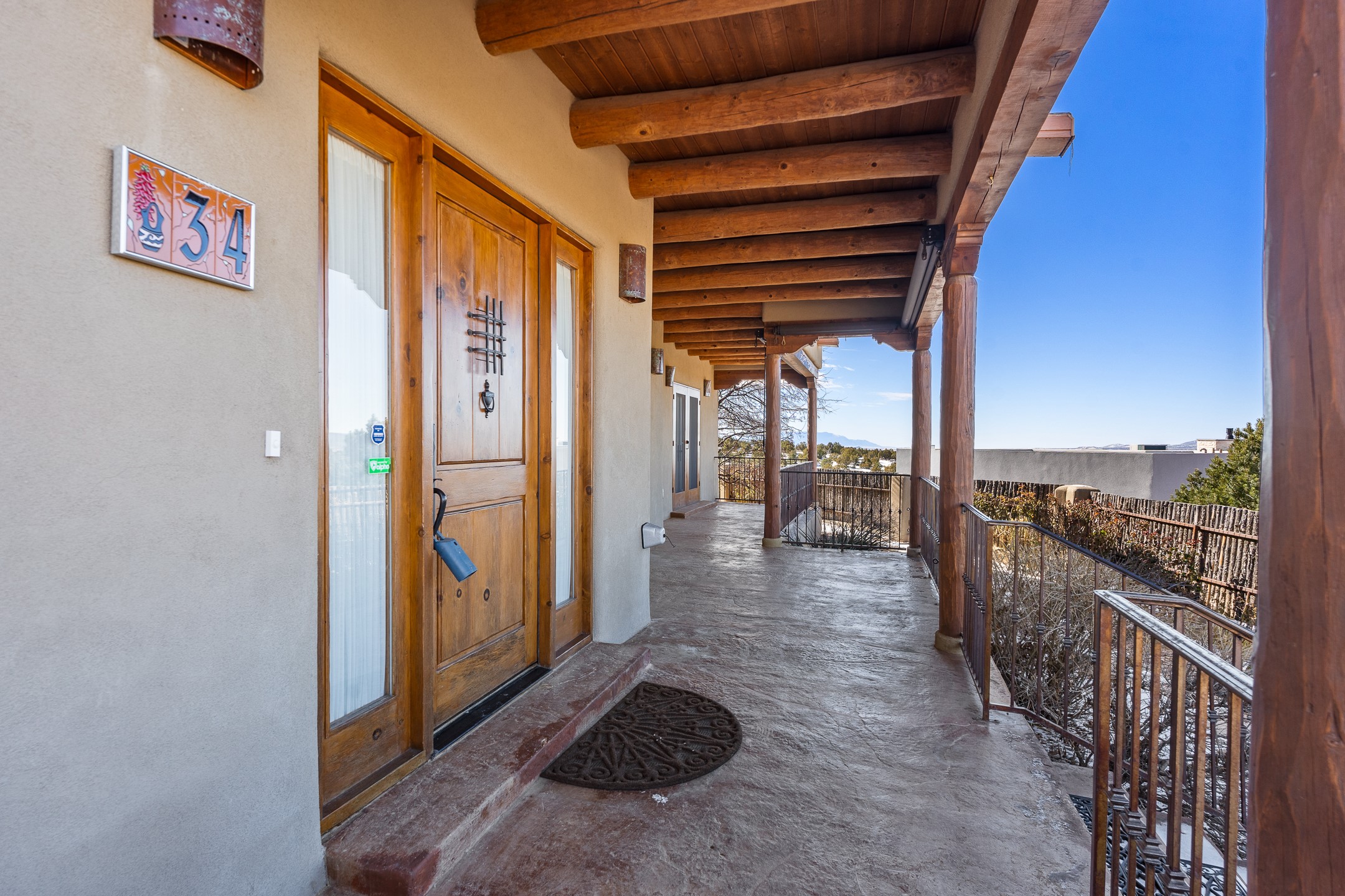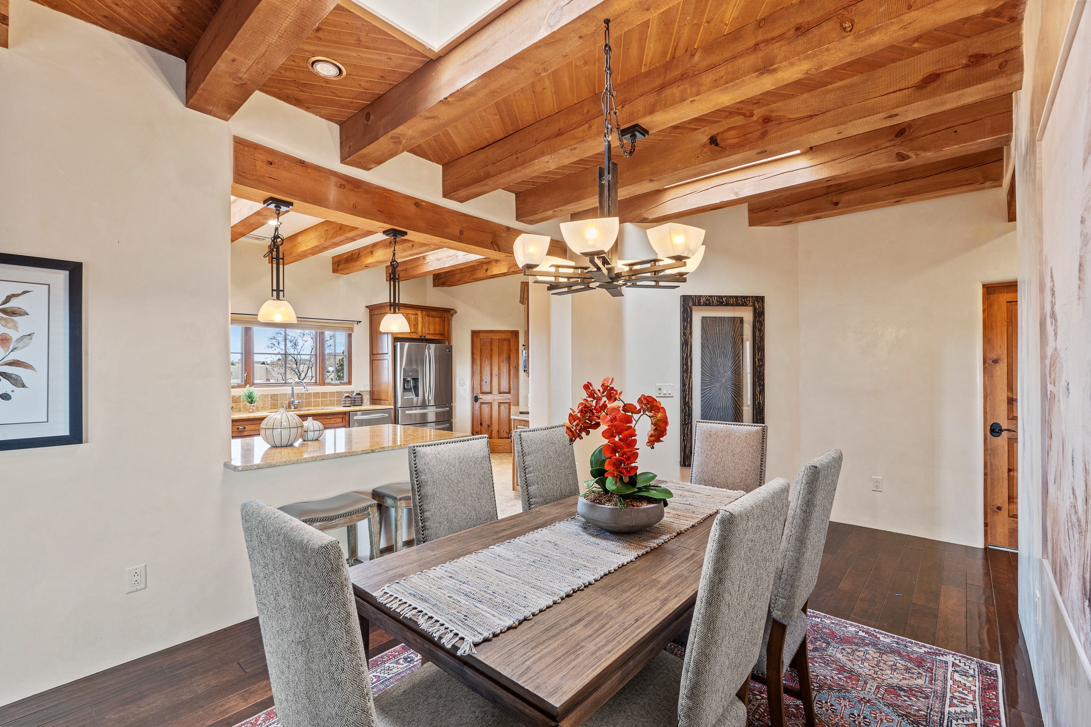 You will fall in love with this stunning Santa Fe-style home, perfectly positioned in the highly sought-after Aldea de Santa Fe community. Set on a quiet cul-de-sac and backing to open space, this property offers exceptional peace, privacy, and breathtaking views in every direction.The 2,635-square-foot residence features 4 bedrooms and 3.5 bathrooms, with three bedrooms located in the main house and a beautifully appointed detached guest casita. Ideal for visitors or extended stays, the casita includes an en-suite bathroom and a convenient coffee bar, and is comfortably heated and cooled by a mini-split system.Enjoy unforgettable sunsets over the Jemez Mountains from the welcoming front portals, while the backyard captures sweeping views of the Sandia Mountains. Indoor and outdoor living blend seamlessly, creating the perfect setting for both quiet mornings and evening gatherings.Inside, the home showcases gorgeous Santa Fe finishes throughout, including hand-troweled plaster walls, wood beam ceilings, and a combination of wood and travertine flooring. The spacious cook's kitchen is designed to impress, featuring rich alder cabinetry, granite countertops, stainless steel appliances, and an Italian gas range. A large walk-in pantry provides ample storage for all your culinary needs.Comfort and warmth are found throughout the home with radiant in-floor heating and air conditioning in the main house. Two gas-burning fireplaces--one in the living room and one in the primary bedroom--add ambiance and coziness on cool winter nights.The oversized garage offers exceptional flexibility, with a tandem garage on one side and a single-car garage on the other--perfect for vehicles, storage, or hobbies.This exceptional home combines timeless Santa Fe style, modern comfort, and unparalleled views, all in one of Santa Fe's most desirable neighborhoods. Community center, pickle ball, tennis and basket ball courts, 13 miles of walking trails, community events.
