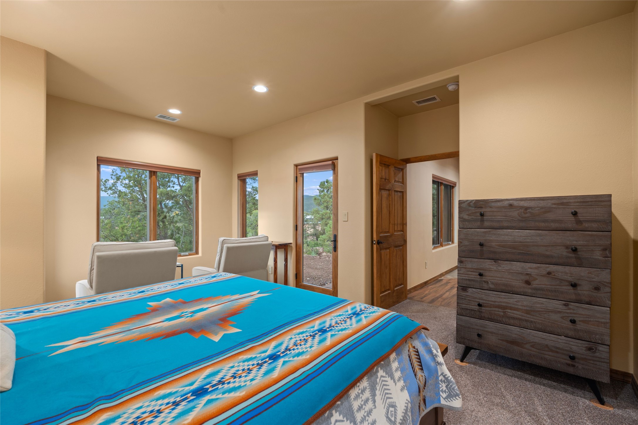 Peaceful Elegance, Effortless Access & Stunning Mountain Views. Built in 2021 and set on over an acre of tranquil land with sweeping mountain vistas, this gorgeous 3-bedroom, 2.5 bath home with a private office/study offers the perfect blend of peaceful country living and easy access to town. Located right off a county-maintained road, it's a dream for Santa Fe commuters--roads are plowed in winter, and you can simply drive straight out without worrying about maintenance or snow removal.Inside, Pella windows and doors frame breathtaking views and fill every room with natural light. Exceptional craftsmanship shines through the handsome custom front doors, pitched metal roof, and high-end finishes throughout. Designed for comfort and health, the home features scent-free, hypoallergenic interiors, dimmer lighting, and screened windows and doors for fresh mountain air year-round.The spacious primary suite offers two private toilet rooms, dual walk-in closets, a sitting area, and inspiring views. The kitchen is a culinary delight with a premium Elmira Stove Works gas + electric range, while the private office/study provides a quiet space for work or creativity.Outdoors, enjoy stargazing under Santa Fe's crystal-clear skies and the serenity of a great neighborhood. The garage includes upgraded overhead storage racks and a motorized lift platform, adding both convenience and efficiency.Gorgeous construction, modern comfort, and unbeatable accessibility--priced to sell, this is a rare find in today's market.