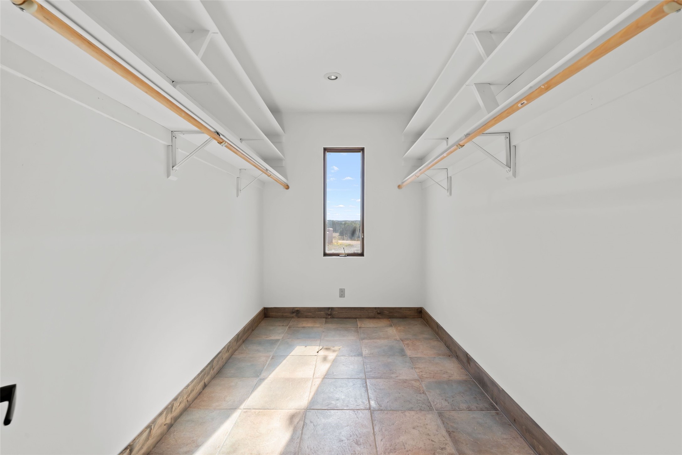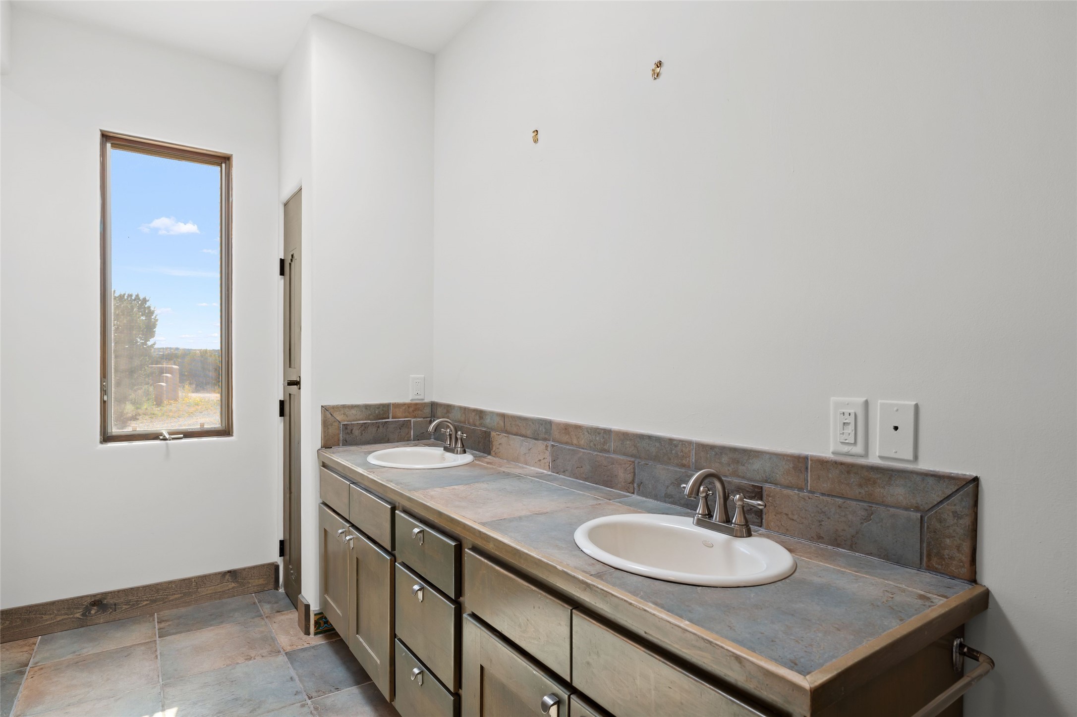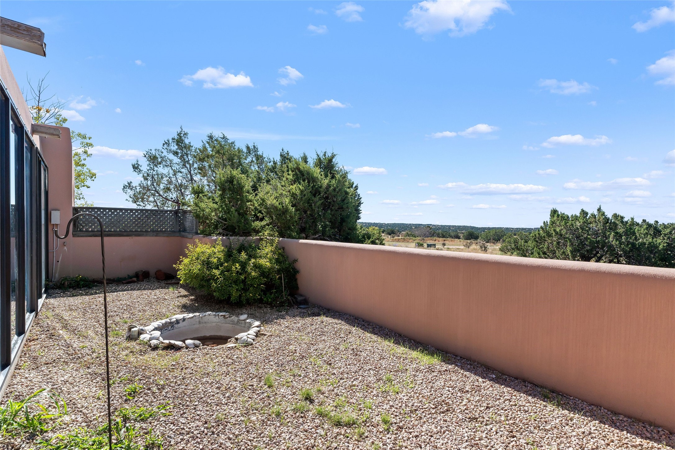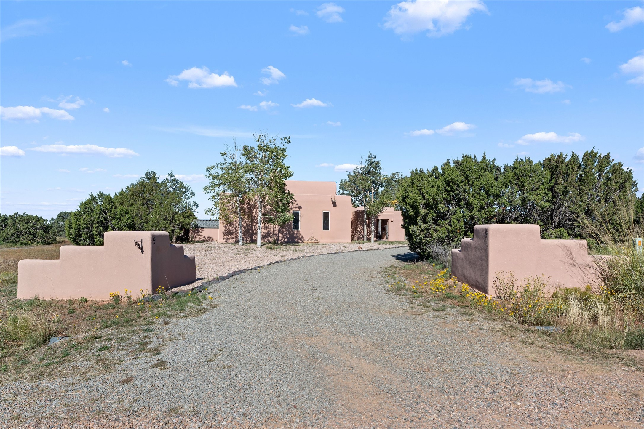 Nestled in the serene Eldorado/Lamy area, this home perfectly balances tranquility and convenience. Enjoy the peacefulness of the high desert while being just a short drive from Santa Fe's renowned dining, cultural attractions, and amenities. Embodying the timeless elegance of Southwestern architecture, this residence features classic vigas, rich wood accents, and authentic regional charm. Step through the foyer into an expansive living room, where soaring ceilings, clerestory windows, and a cozy fireplace create an inviting sense of space and light. The living and dining areas flow seamlessly into the adjacent kitchen, making it ideal for entertaining and everyday living. The well-designed layout includes a large walk-in pantry near the kitchen, as well as a laundry room with abundant storage and a utility sink. The split floor plan offers privacy, with the primary suite on the east side of the home and two generously sized secondary bedrooms with a nearby full bath on the west side. The spacious primary suite includes a dual-sink vanity, soaking tub, separate shower, large walk-in closet, and direct access to an expansive enclosed patio--perfect for enjoying quiet mornings or evening sunsets. A bonus room off the oversized two-car garage provides flexible space for an art studio, home gym, or private office/library. Recent upgrades include a new high-efficiency boiler and water heater and fresh interior paint. Outdoor spaces are equally impressive, featuring a gated courtyard with a covered portal and a walled backyard accessible from the patio or side gate. Set on approximately 4.66 acres, this property offers sweeping views of the Ortiz, Sandia, and Jemez Mountains. With its combination of comfort, character, and spectacular scenery, this home is a must-see Santa Fe retreat. PROPERTY IS BEING SOLD IN AS-IS CONDITION.
