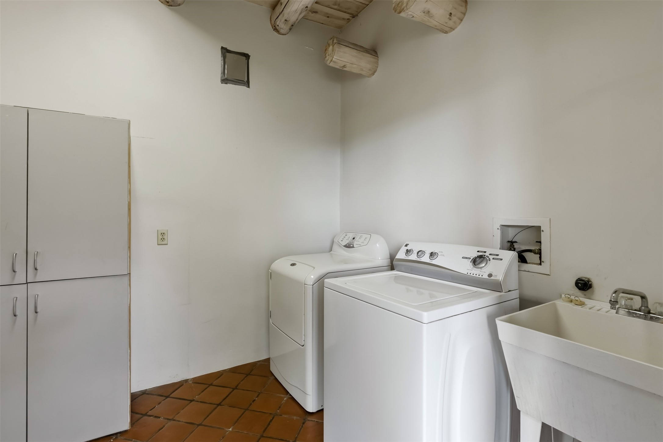 In the quaint village of Galisteo lies this gracious and majestic home with adjoining 5 acre lot, for a total of 10 acres, known as 'Hacienda del Sol." One hundred years ago was the site of the Old Galisteo School House. The original 1886 bell and corner stone 1938 were placed within the walls of this present day home. Built atop of a gentle hill with stunning views of the Galisteo Basin, Sangre de Cristos and Jemez Mountains along with huge white puffy cloud formations in a brilliant blue sky greet you everyday. Large rooms with cathedral ceilings flooded with light, sculptured fireplaces, oak and pine floors with 10 foot elegantly carved doors delight the eye upon entering. Screened in, is a lovely outdoor patio with vast, distant views. A gallery hallway runs the length of the house craving art, paintings, photographs, memorabilia. A chef's kitchen with a six burner stove, center islands, prep sinks has everything one would want. An elegant dining room with arched walls, subtle lighting, and carved cabinets allow for many guests or small intimate settings. Three Bedroom suites each with fireplaces and luscious bathrooms are perfectly placed for privacy. An attached "casita" with kitchen and bath is off one of the wings of the home. Outside, there is a circular, walled patio area for summer gatherings and moon lit nights. Included in this fabulous property is a blue gate opening up to an adjoining 5 acre parcel of vacant land accessed off of Camino San Cristobal used for pleasure or as additional acreage for another home, studio, horses, and imagination. Dream on...