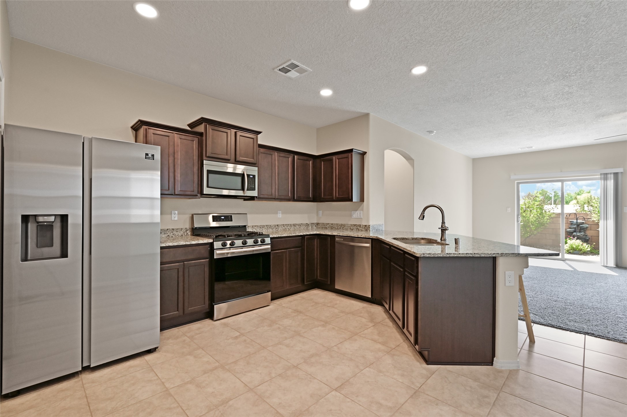 Built in 2020, this beautifully maintained single-level home blends modern design with everyday comfort. Offering 3 bedrooms, 2 bathrooms, and an open-concept layout, it's ideal for both relaxation and entertaining.The spacious kitchen features granite countertops, stainless steel appliances, and a generous pantry, opening seamlessly to the dining and living areas. A cozy gas fireplace and abundant natural light enhance the living room, while sliding glass doors lead to a private, fenced backyard with a soothing fountain and covered patio.The primary suite provides a peaceful retreat with a walk-in closet, dual sinks, and a walk-in shower. Two additional bedrooms and a full bath offer flexibility for guests, family, or a home office. Thoughtful touches include tile and carpet flooring, refrigerated air, forced-air heating, a tankless hot water system, and a two-car garage with custom epoxy-finished flooring.Located on Santa Fe's southwest side, this move-in-ready home is minutes from shopping, dining, schools, and Highway 599, with a neighborhood park just a short stroll away.