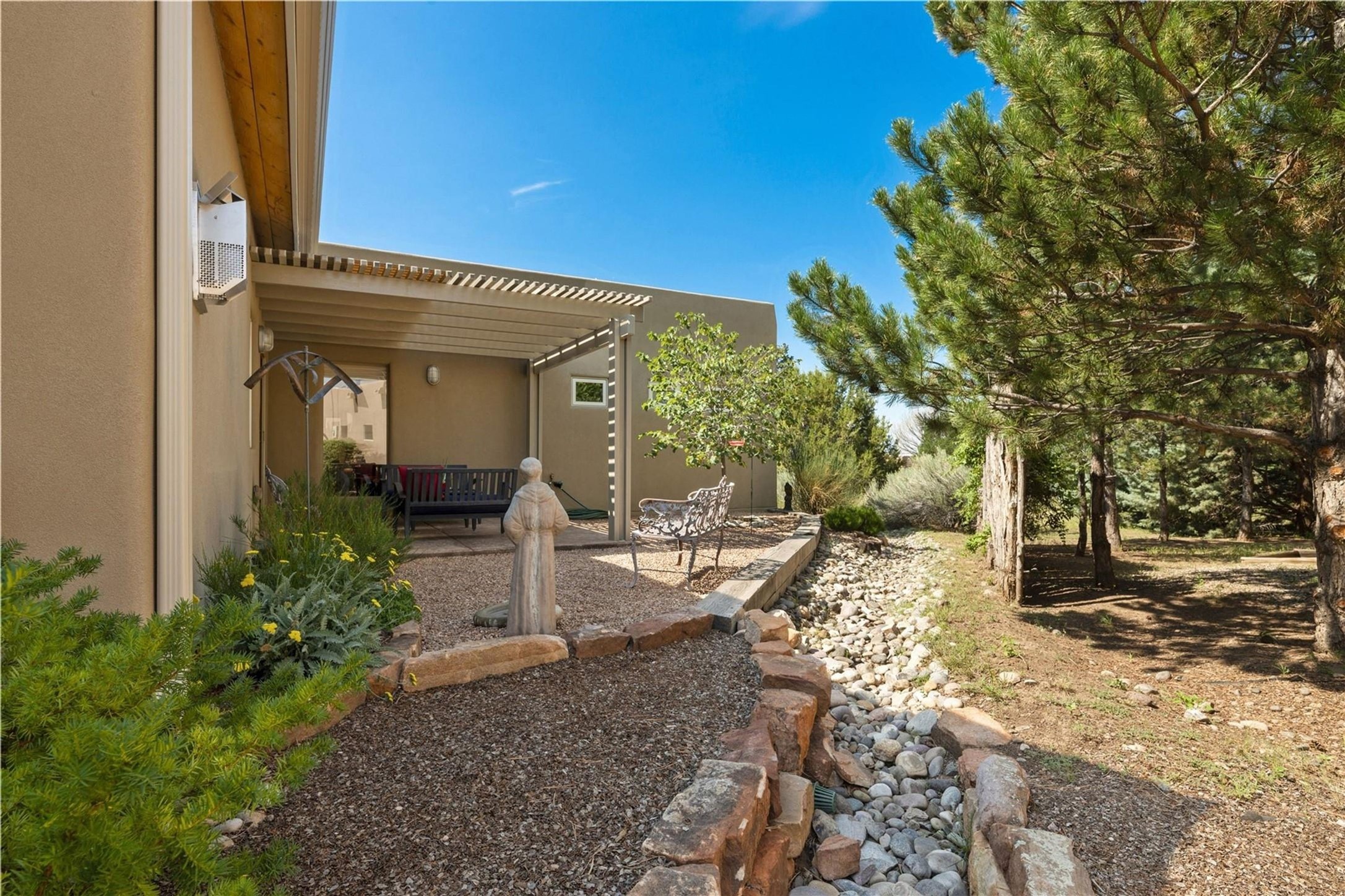The home and location you have been waiting for - MOVE IN READY! Pitched pro-panel roof, 2300 square feet of absolute luxury, 3 bedrooms, 2 baths all on one level. Large primary bedroom and guest room have Closet Systems. Engineered wooden flooring and tile. The Primary Suite is totally separated from the other two bedrooms. Third bedroom set up as an office has a built in desk and Closet Systems, all new solar shades and cellular shades throughout. Newer refrigerator and 4 mini-splits, plantation shutters, in-floor radiant heat. Laundry has closet Built-Ins, lighting with dimmers and on demand hot water. Living room boasts an elegant gas fireplace, open living room, kitchen and dining room with views to the landscaped back and side patio, coyote fencing, drip irrigation in all landscaped areas with native plants and trees. leading to a designated greens space. New gutters, 360 gallon catchment rain barrel; plus there are peak-boo views of the Sangre foothills from the living room. Large fenced in back yard perfect for dogs. This home is a rare sparkling jewel that will amaze you! No For Sale Sign.