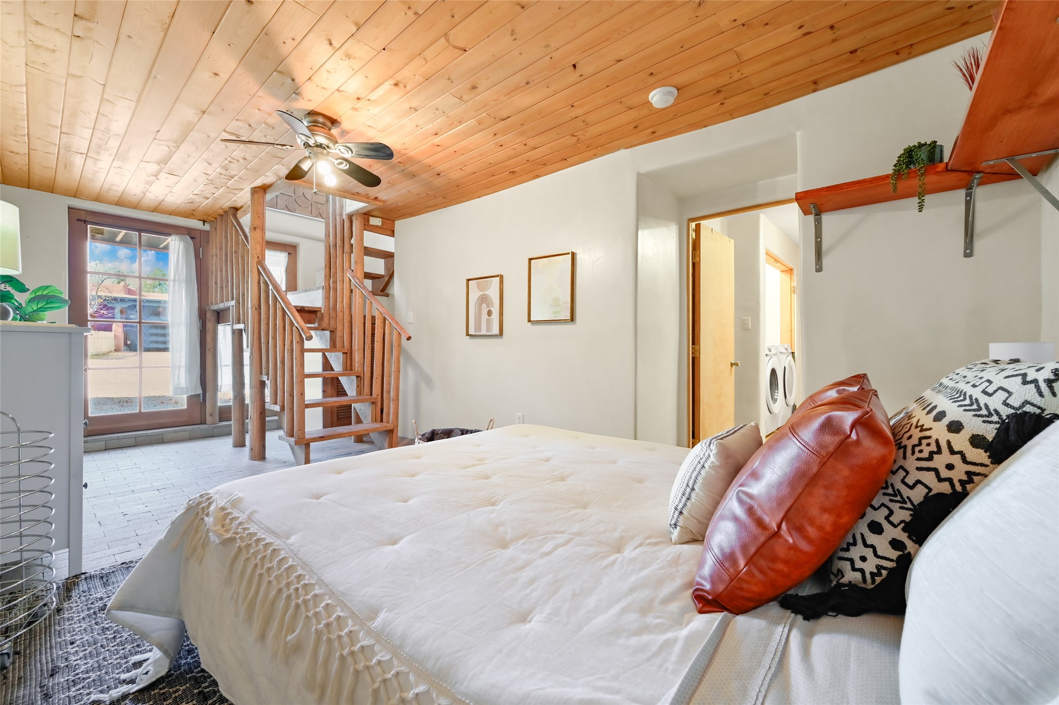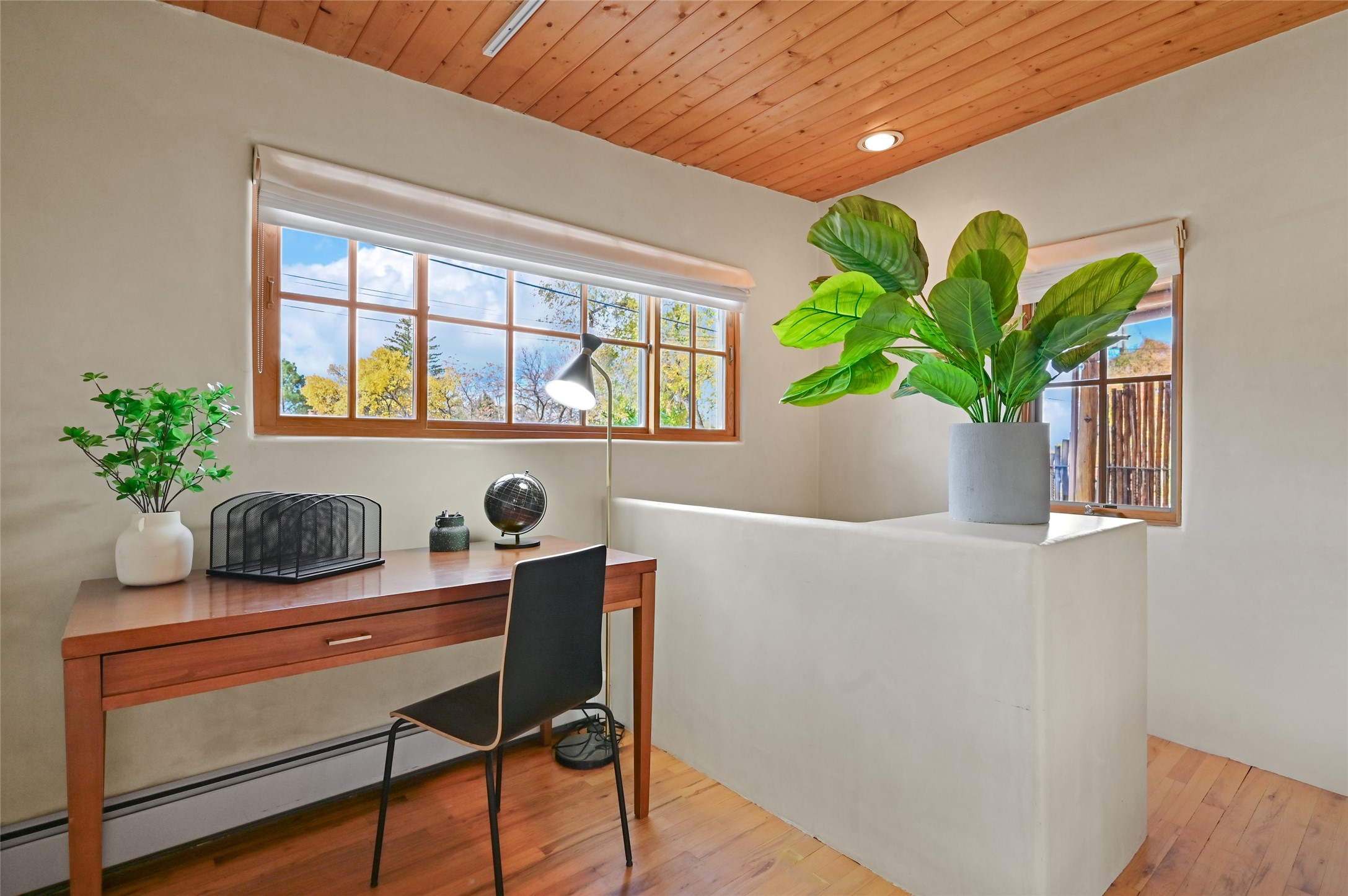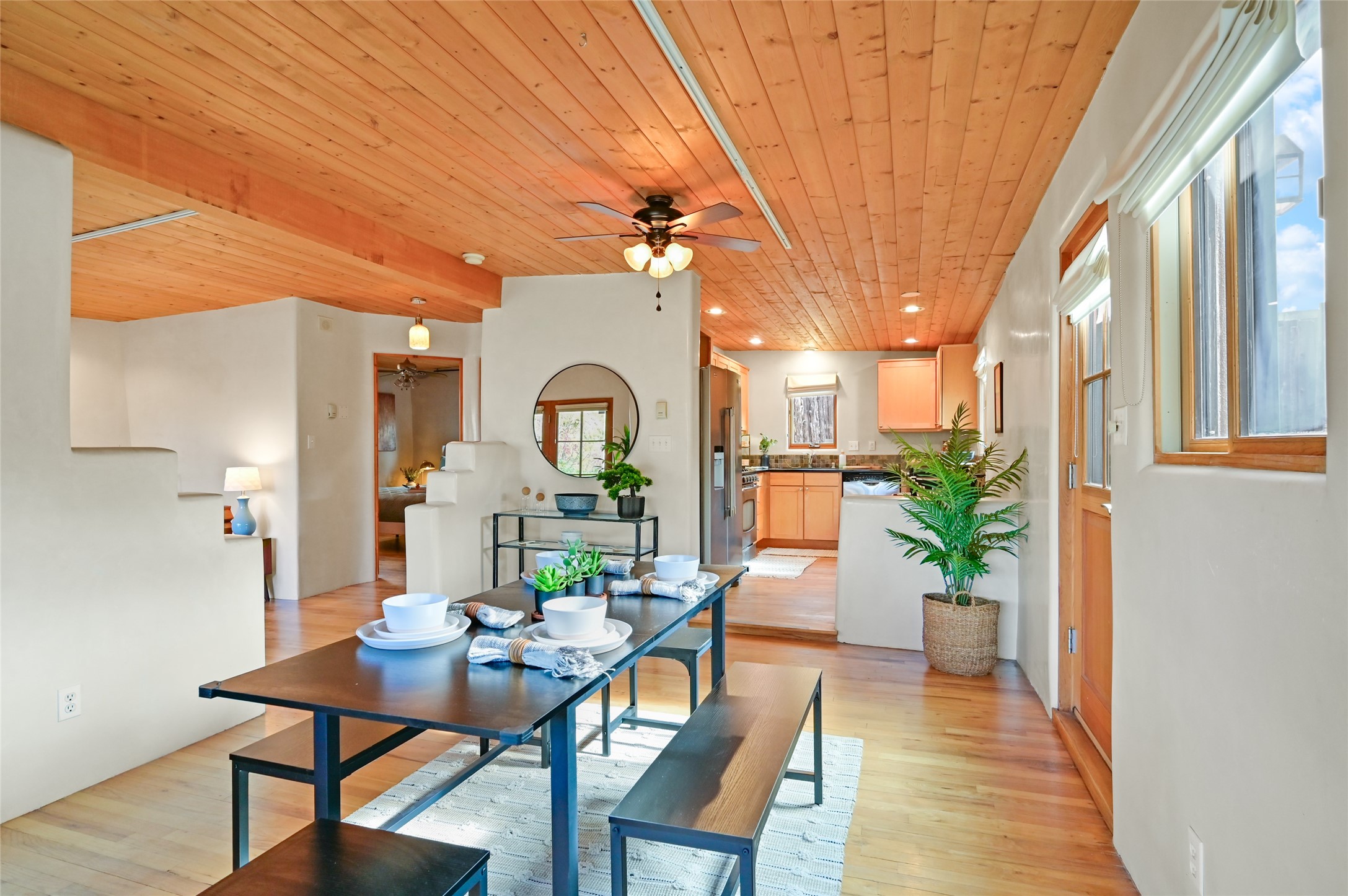 This eastside location cannot be better for quickly accessing Canyon Road and all that it has to offer. The upper level is the main living level consisting of the living room with kiva fireplace and a wall of windows facing towards the front deck. One bedroom and one full bath. A large well appointed kitchen that any chef would enjoy. A large dining area with even more room for an office, art space, yoga area, meditation space, library etc...Upper level is all wood flooring. The lower level can be a bedroom, flex space, office, studio and more. Brick floors on the ground level with one full bath, laundry, storage and mechanical room. The refrigerator, microwave, tankless water heater, washer and dryer are all less than 6 years old.