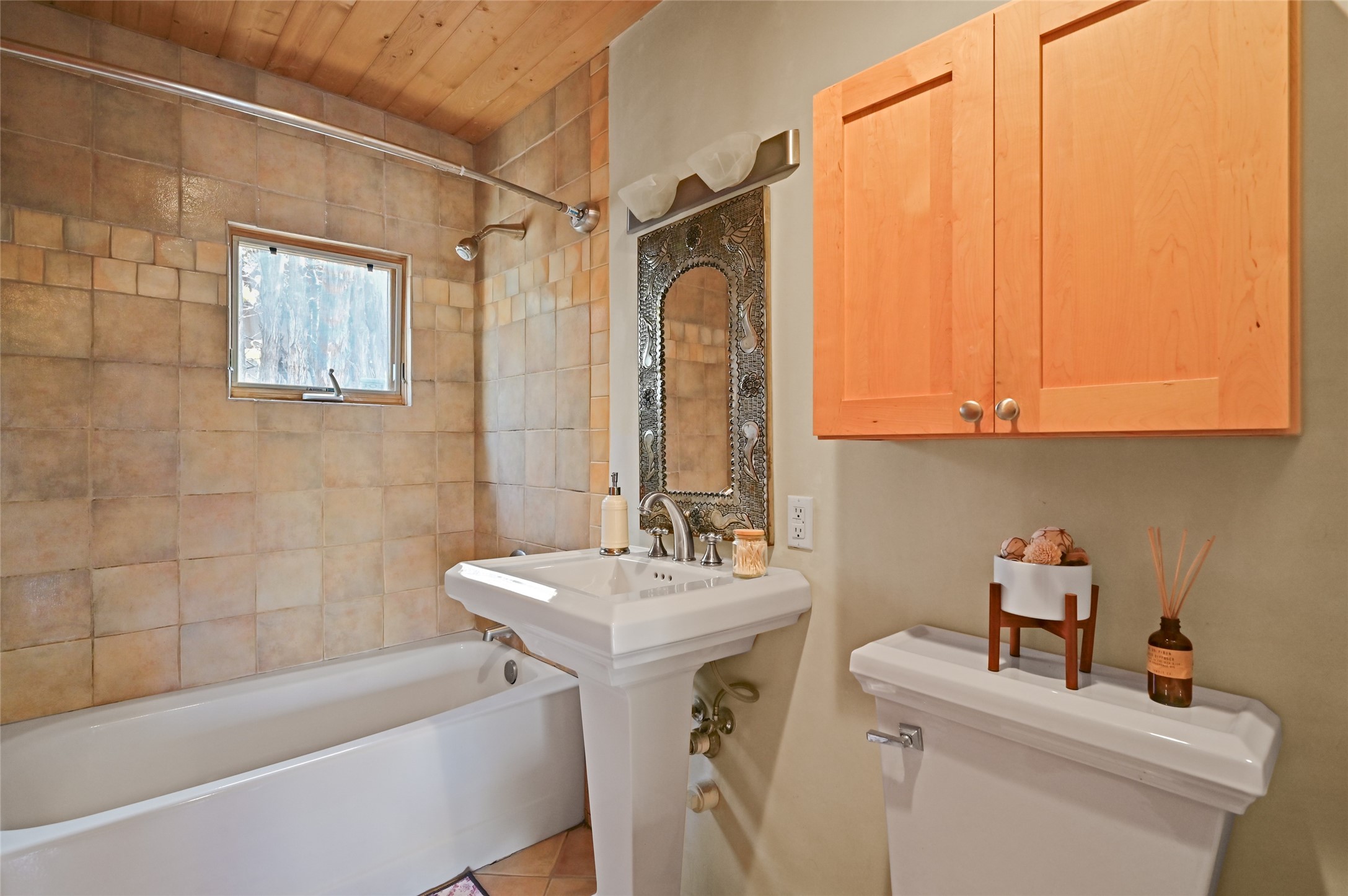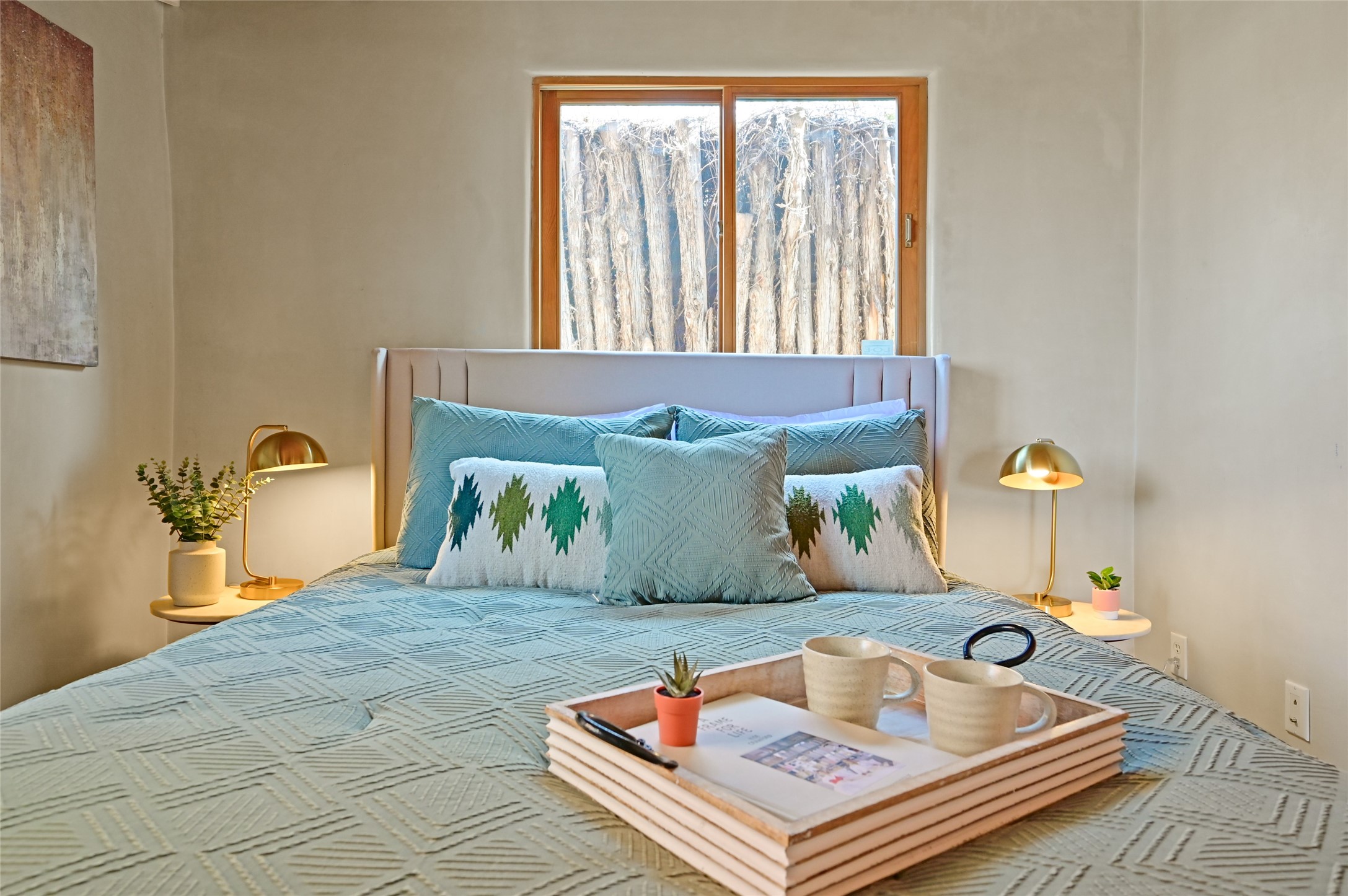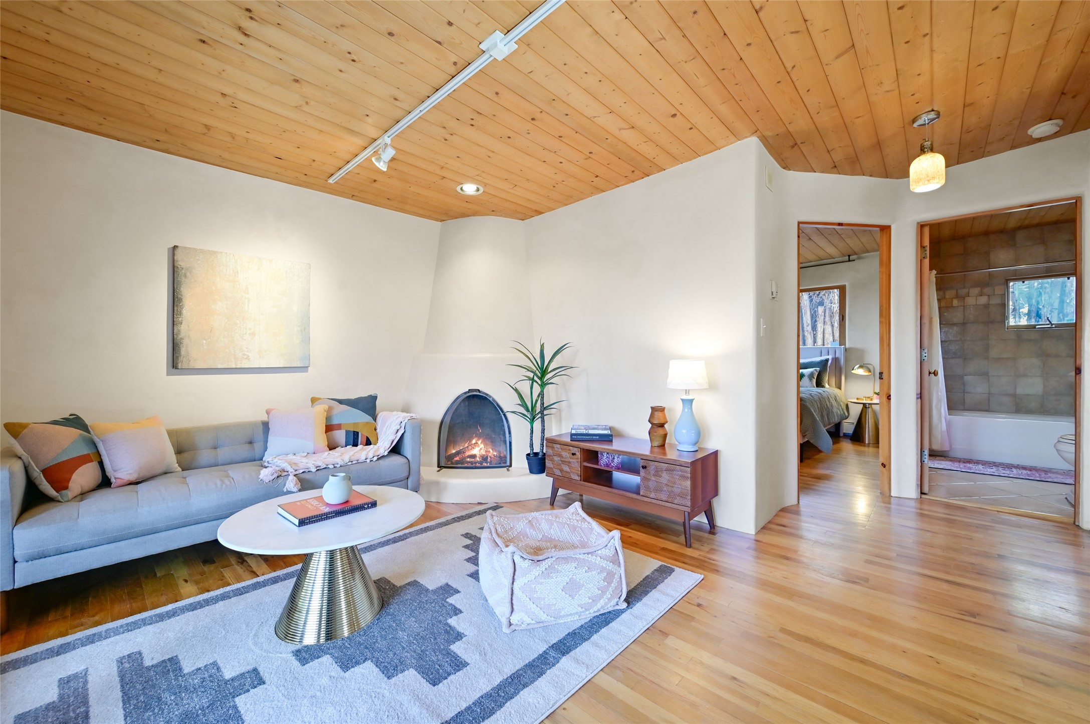 This eastside location cannot be better for quickly accessing Canyon Road and all that it has to offer. The upper level is the main living level consisting of the living room with kiva fireplace and a wall of windows facing towards the front deck. One bedroom and one full bath. A large well appointed kitchen that any chef would enjoy. A large dining area with even more room for an office, art space, yoga area, meditation space, library etc...Upper level is all wood flooring. The lower level can be a bedroom, flex space, office, studio and more. Brick floors on the ground level with one full bath, laundry, storage and mechanical room. The refrigerator, microwave, tankless water heater, washer and dryer are all less than 6 years old.