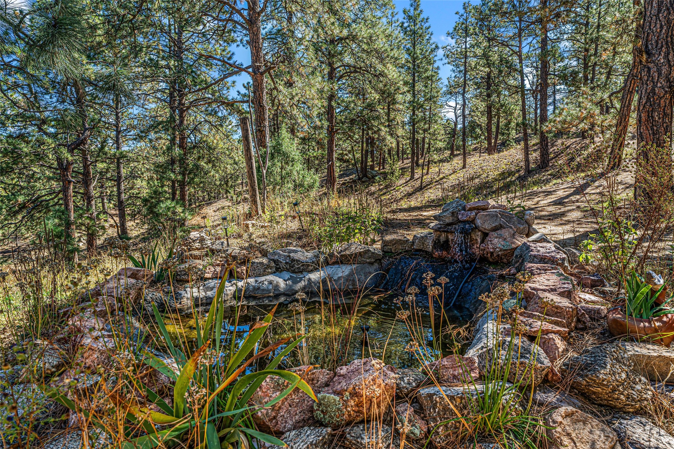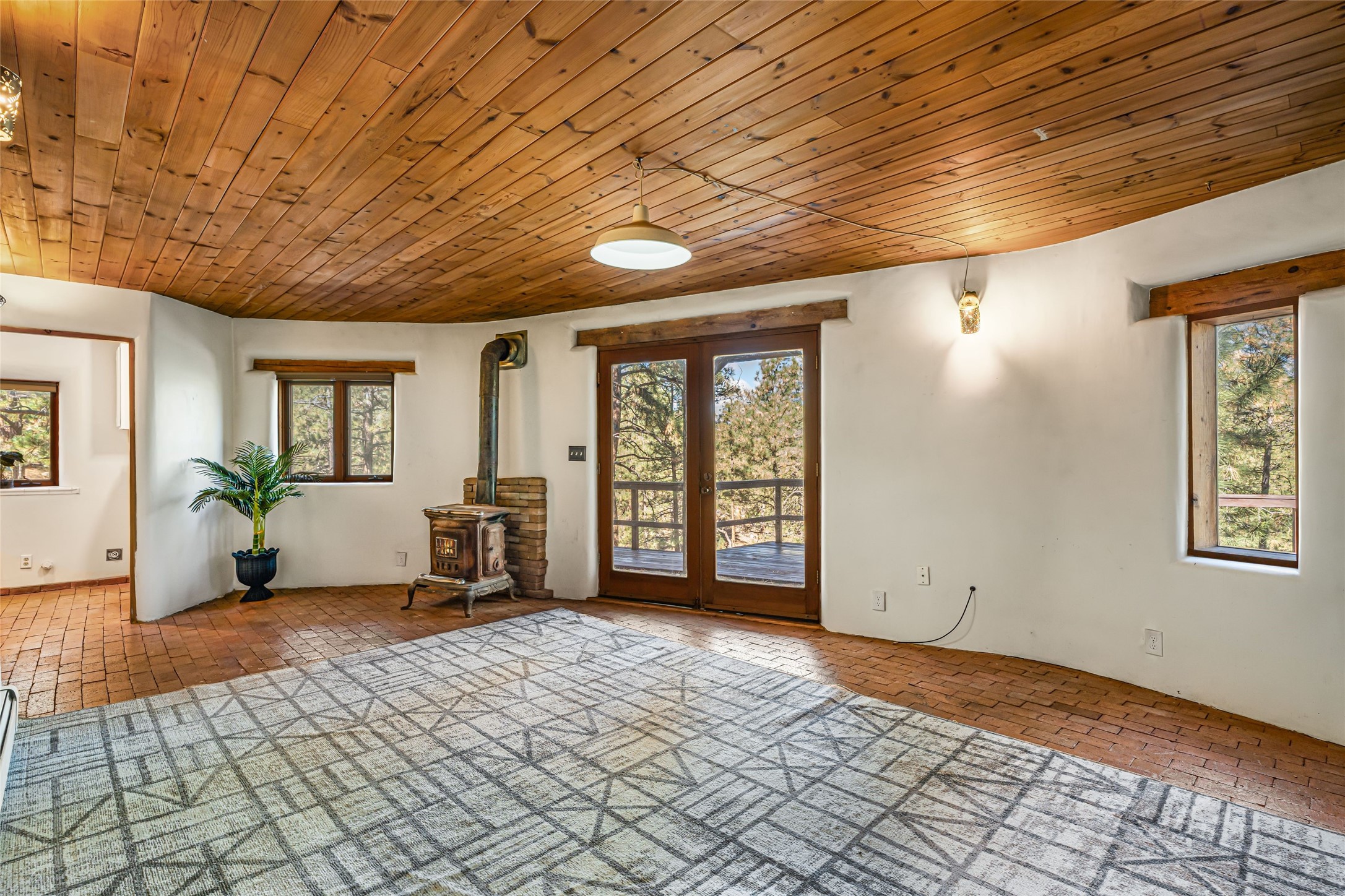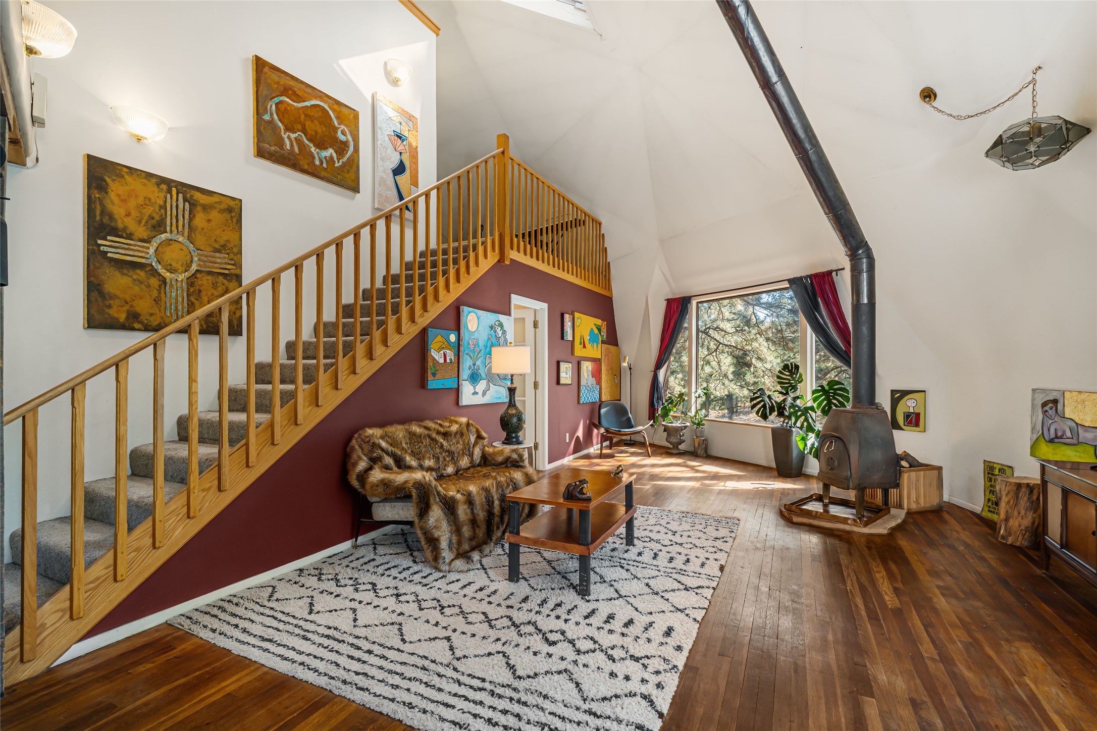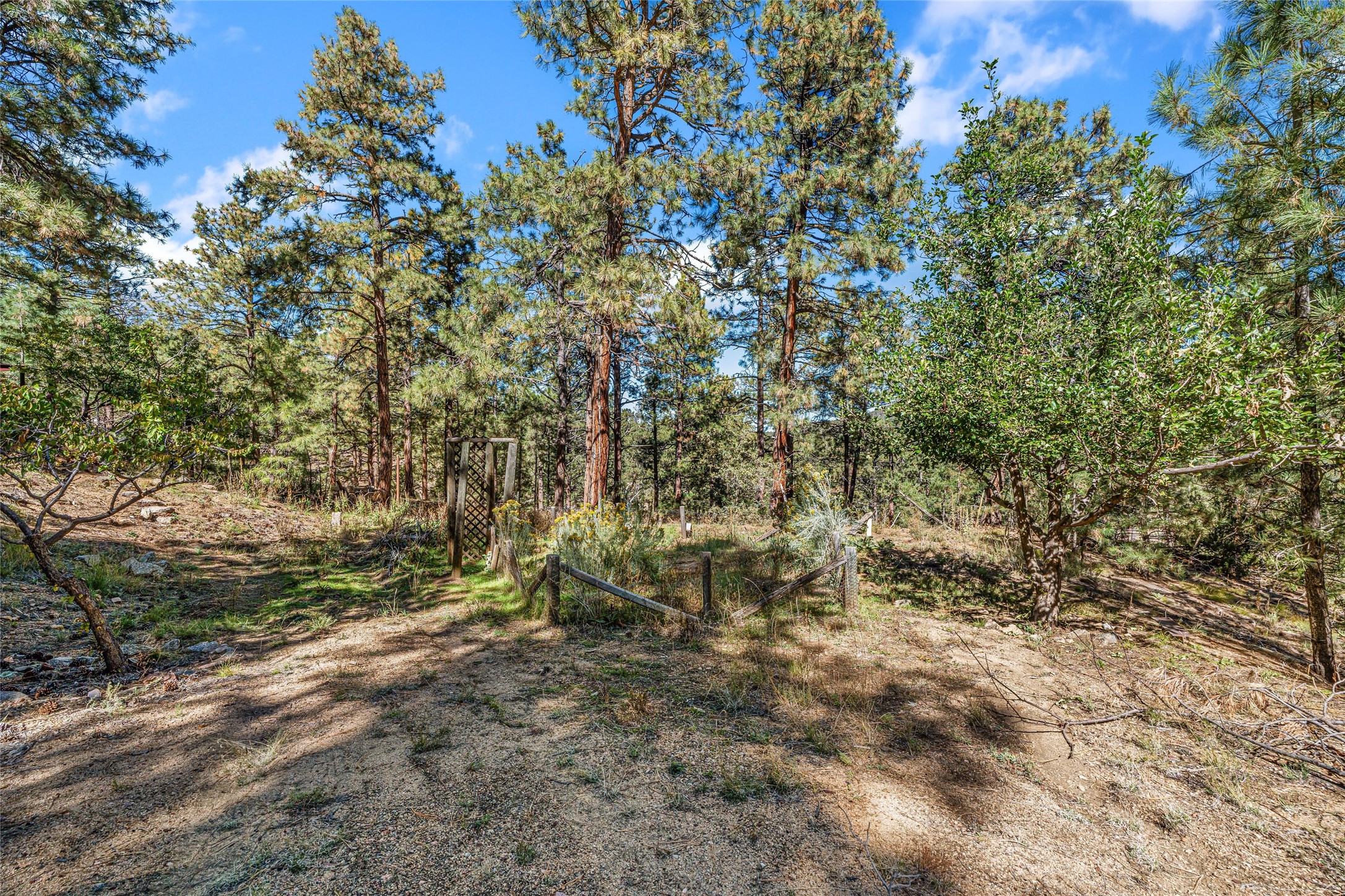 This mountain residence is located in a splendid setting on 2.7 forested acres in the tall pines off Old Santa Fe Trail. The three-level home offers a main house and guest house under the same roof and connected by a stairway internally, so it can be used as a single home or house and guest house. The main level consists of the living, kitchen, and dining rooms, primary bedroom, and bathroom. There are two enjoyable decks - a very large deck off the living room and another off the dining room. The upper level has two bedrooms, a sitting area, and bathroom. The lower lever is the two-bedroom, two-bath guest house with an open-concept living/kitchen/dining area, and which also has another wonderful large deck. The outdoor living is delightful! The topography is gentle, affording a great deal of usable land. Experience a beautiful mountain lifestyle only minutes from the Plaza.